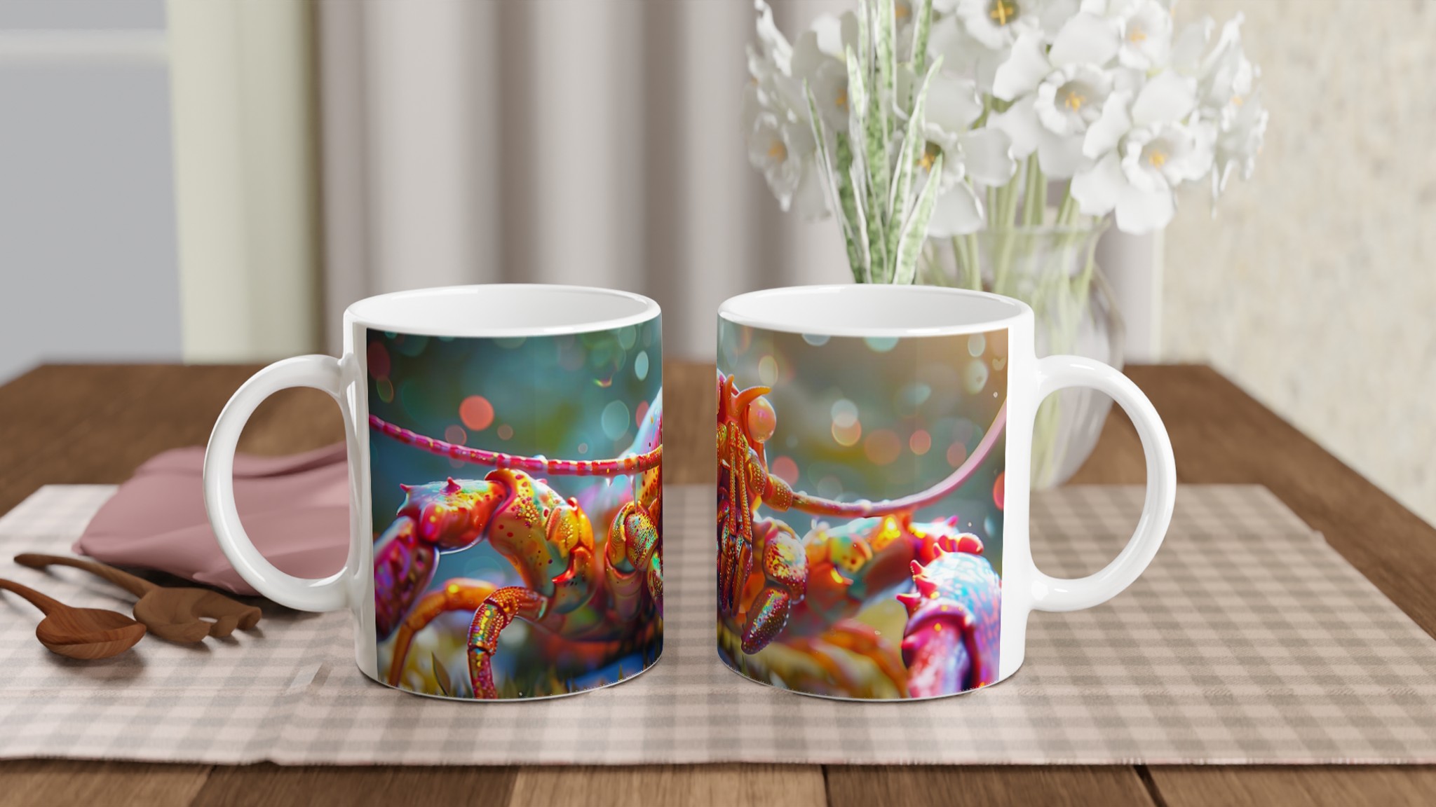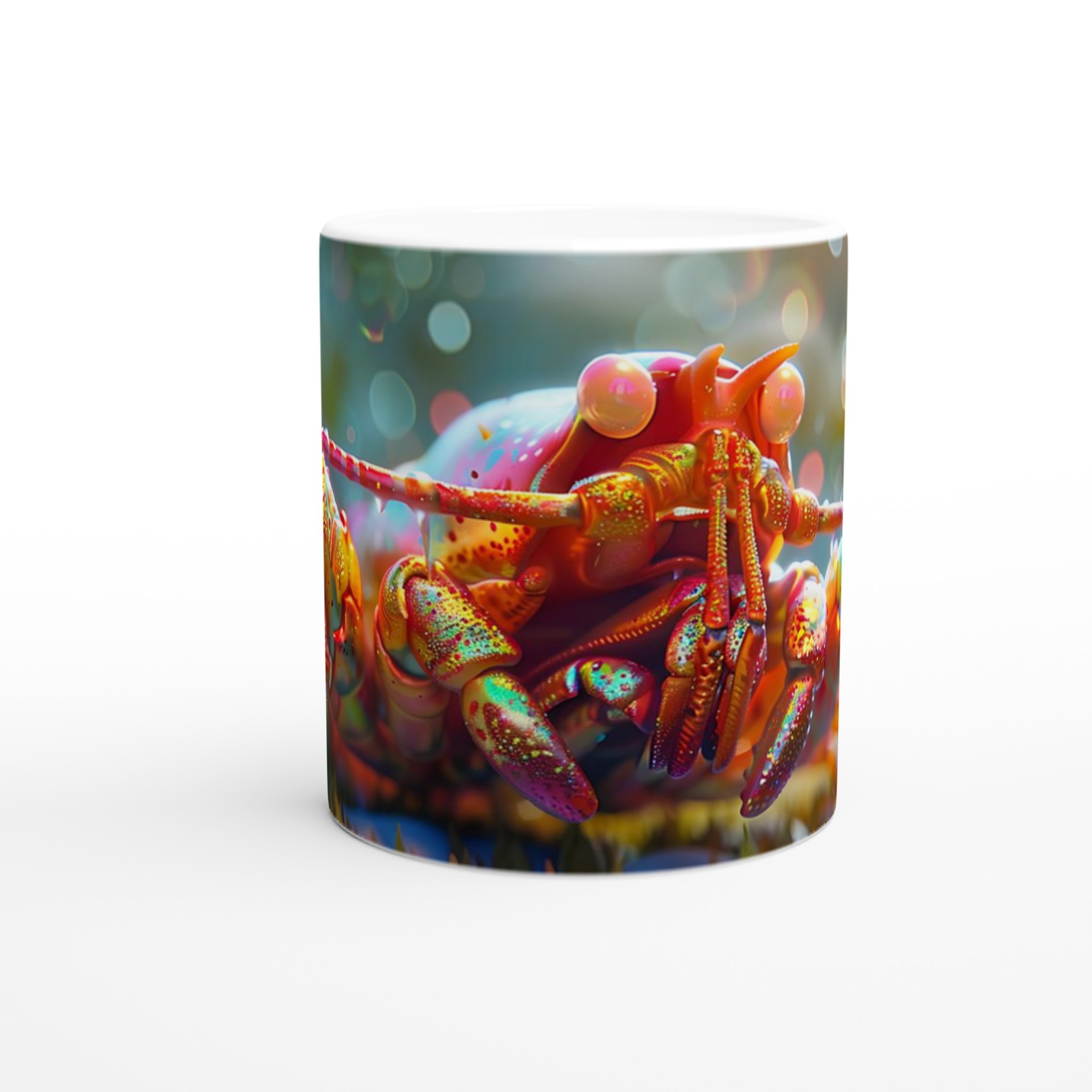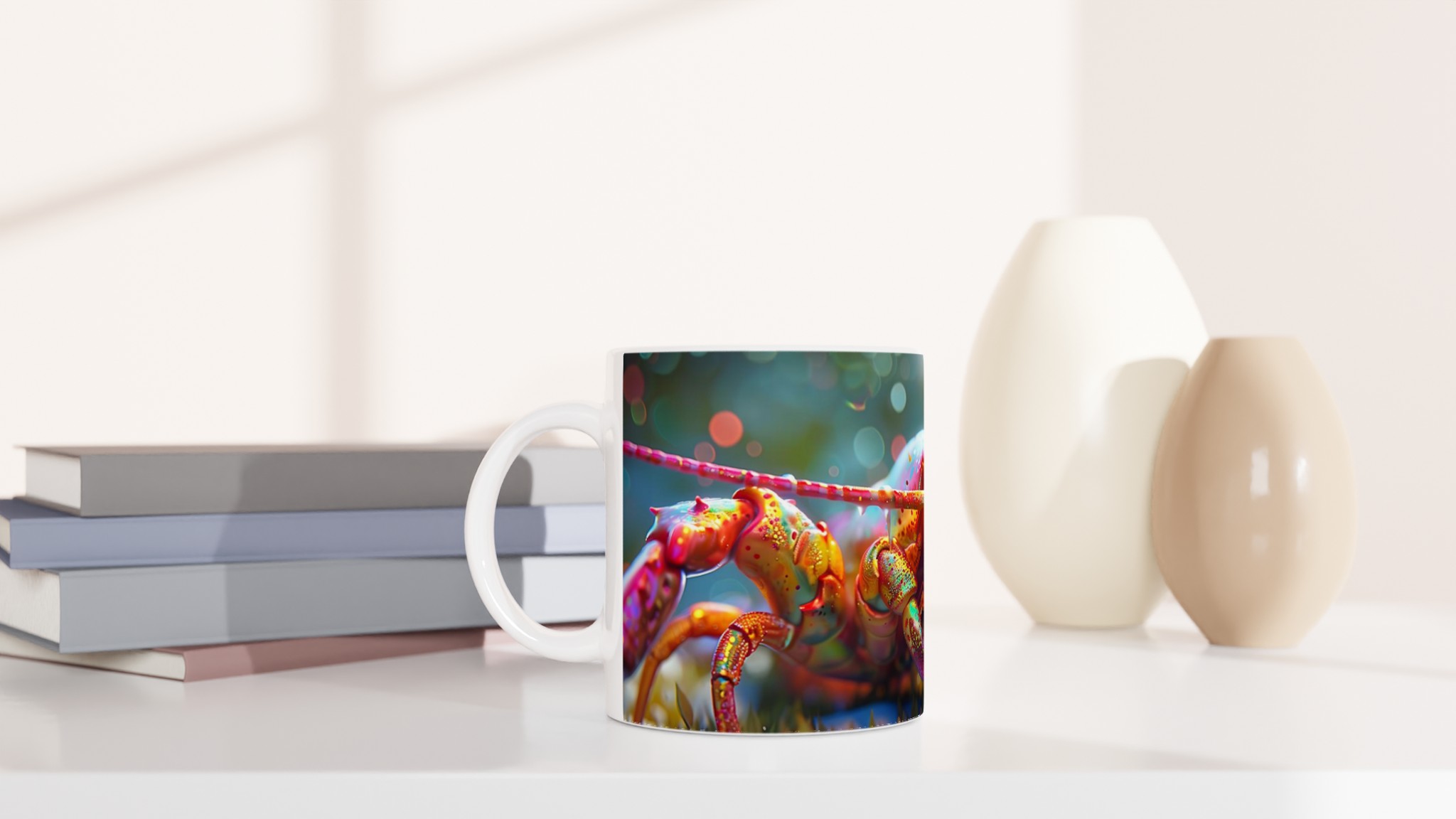Lyft din fikapaus med denna iögonfallande keramiska mugg, som fångar den livfulla energin från en färgsprakande krabba. Med en palett av intensivt rosa, gult och orange mot en drömsk bokehbakgrund, är denna mugg mer än bara en kopp – den är ett konstverk. Den blanka vita ytan ser till att trycken framhävs med klara och levande färger, som håller sig fina även efter många turer i mikron och diskmaskinen, vilket gör den perfekt för morgonkaffet, kvällens varma choklad eller när du bara vill njuta av en kopp te.