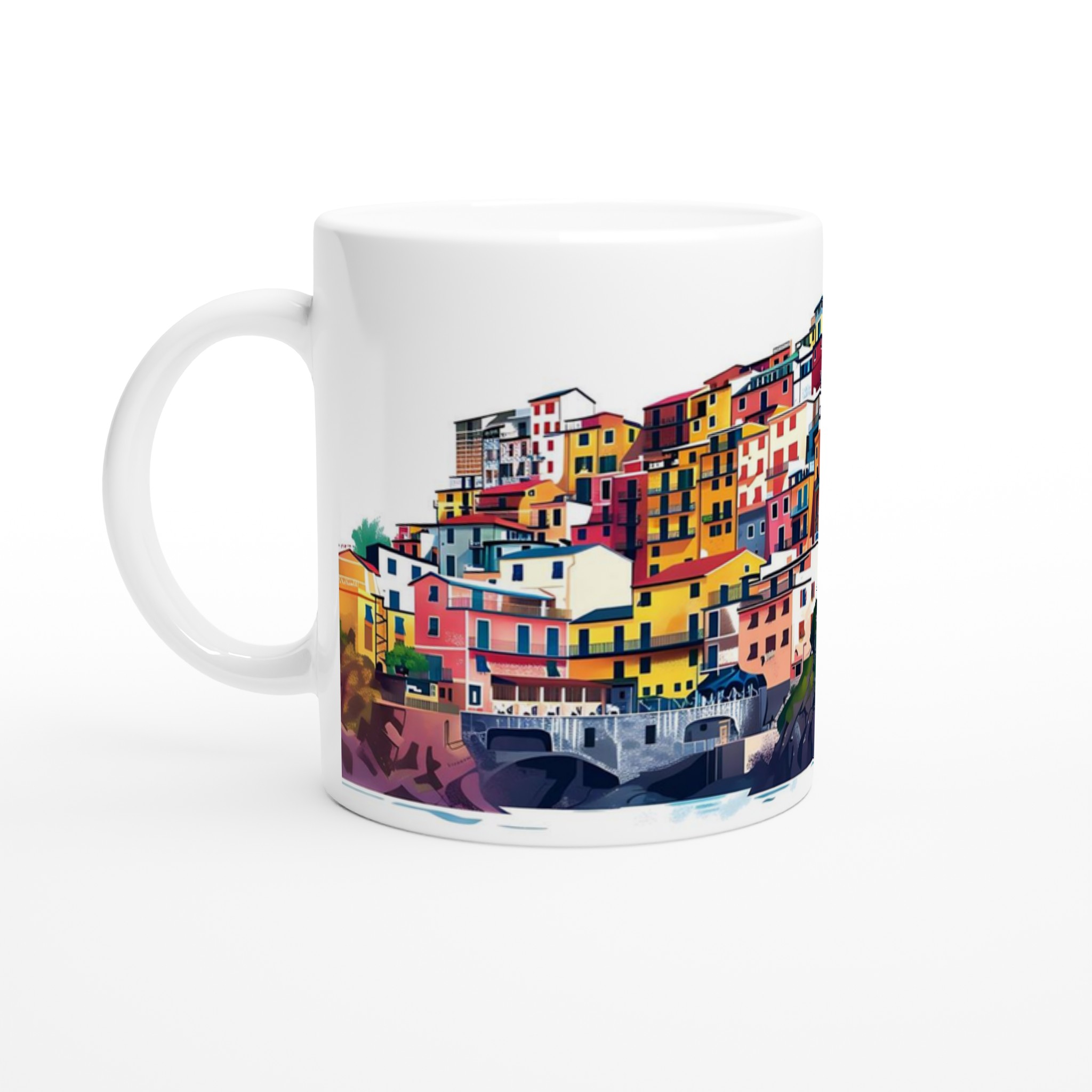 Lyft varje kaffestund med vår premium keramikmugg – stilren, hållbar och skapad för att låta ditt motiv glänsa. Denna mugg fångar den livliga charmen av en färgsprakande medelhavsstad, perfekt för att addera en dos glädje och inspiration till din dag. Med sina klara färger och konstnärliga uttryck är den idealisk för dig som älskar att omge dig med vackra ting, eller som en uppskattad present till en vän.