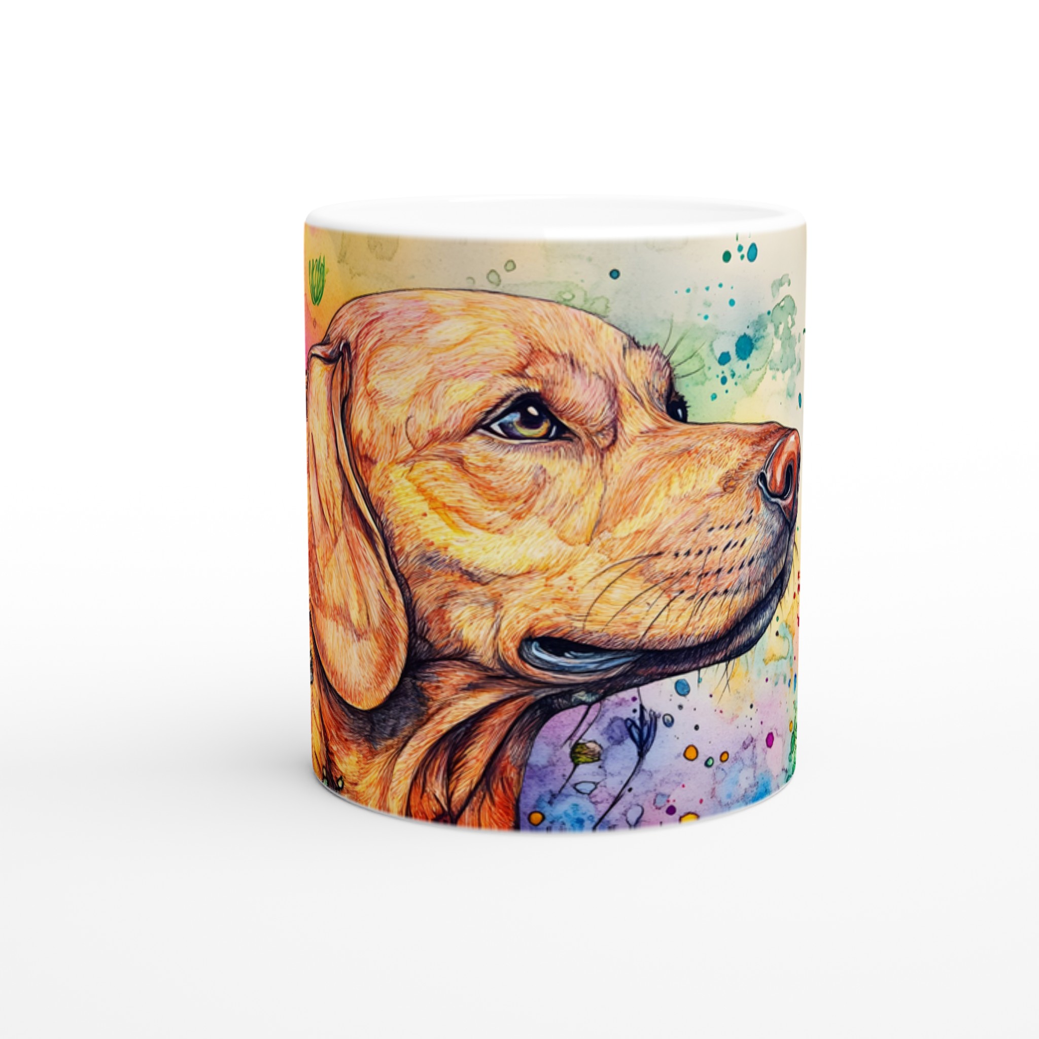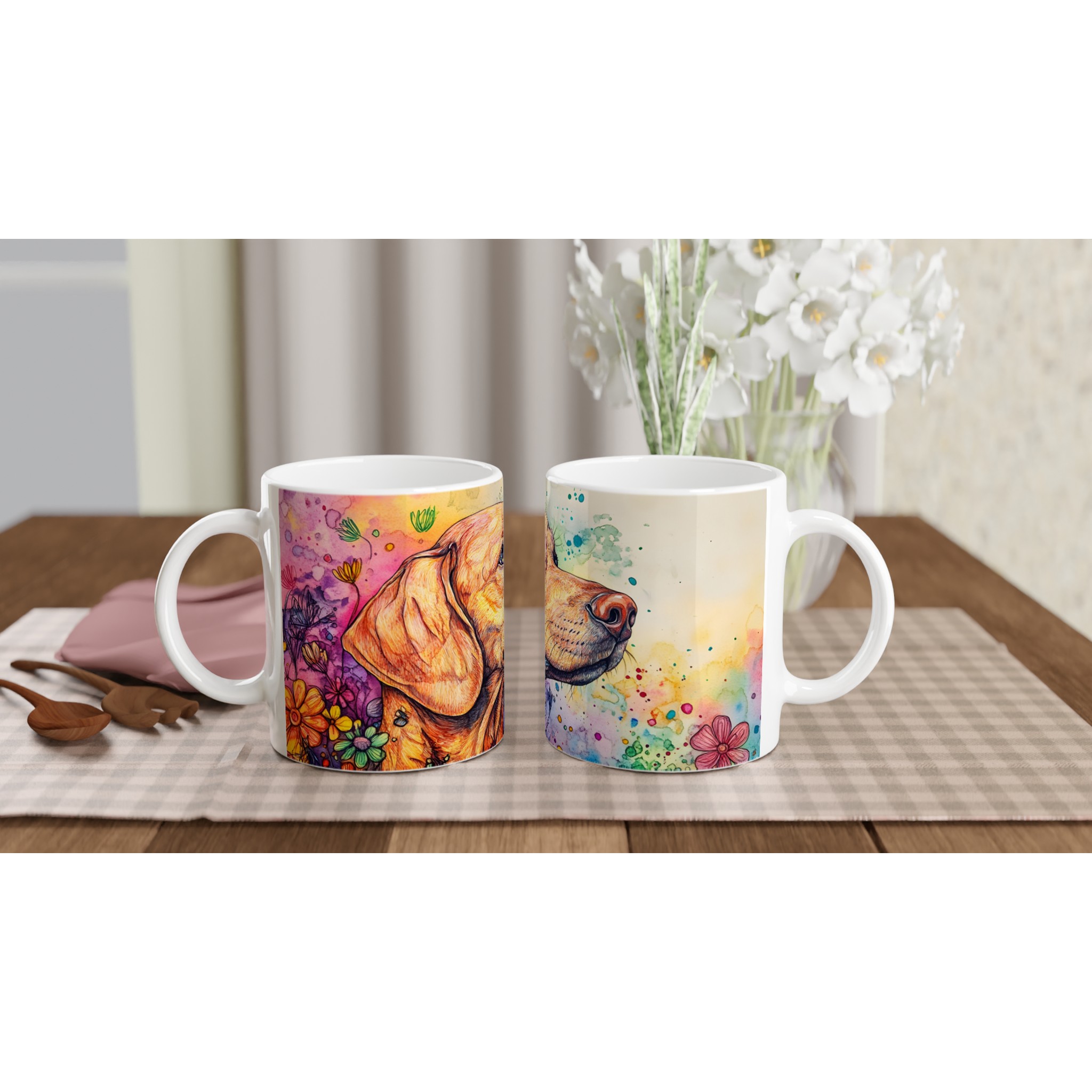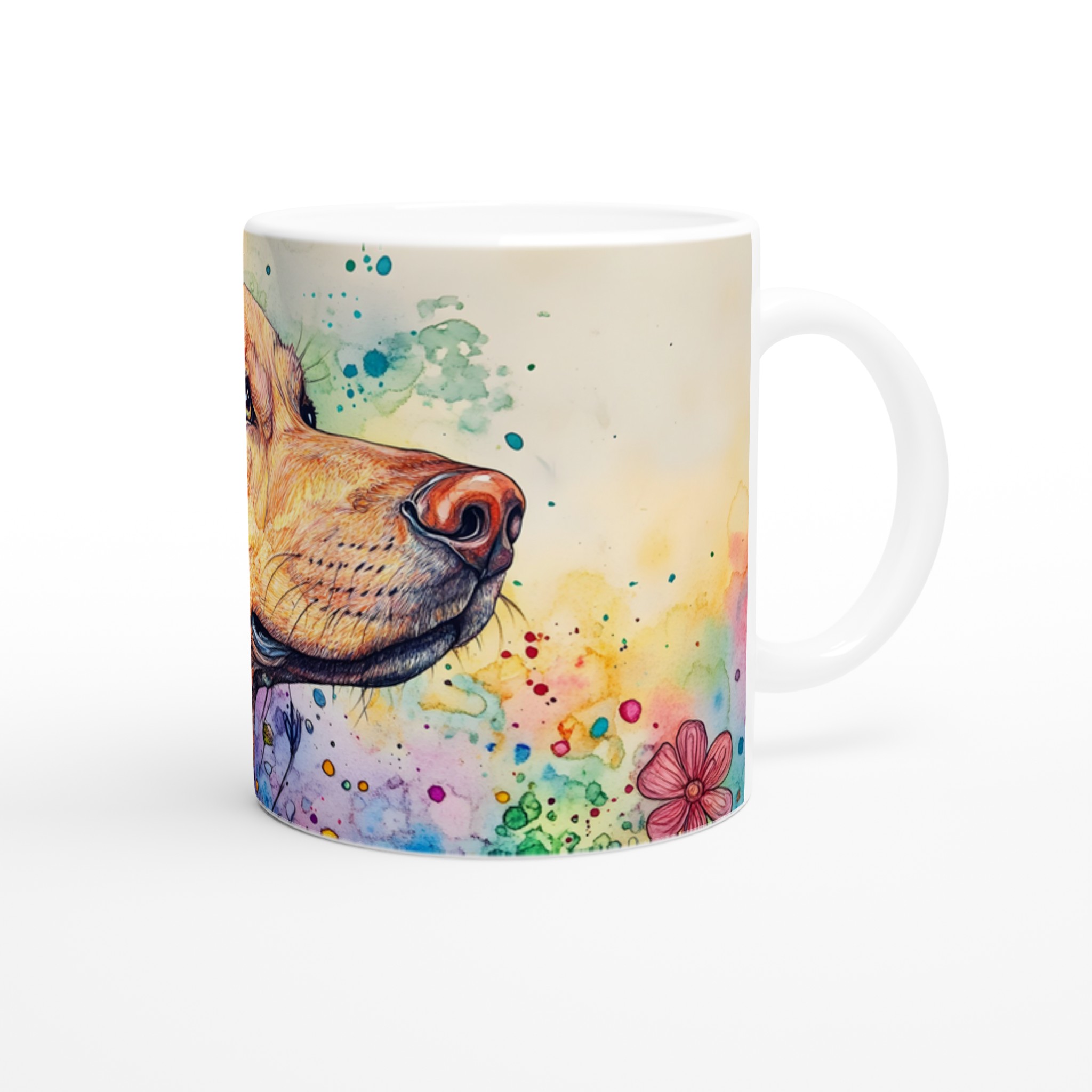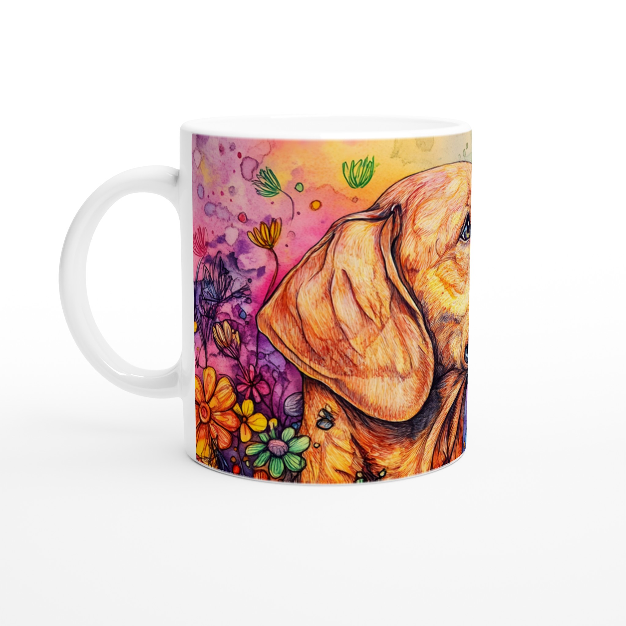 Den blanka vita ytan framhäver tryckets livfulla färger och intrikata detaljer, vilket gör labradoren och de akvarellmålade blommorna till ett riktigt blickfång. Trycket är av högsta kvalitet och bibehåller sin lyster även efter otaliga diskningar och mikrovågsugnsanvändningar, vilket garanterar att din mugg förblir lika strålande som den dag du fick den.