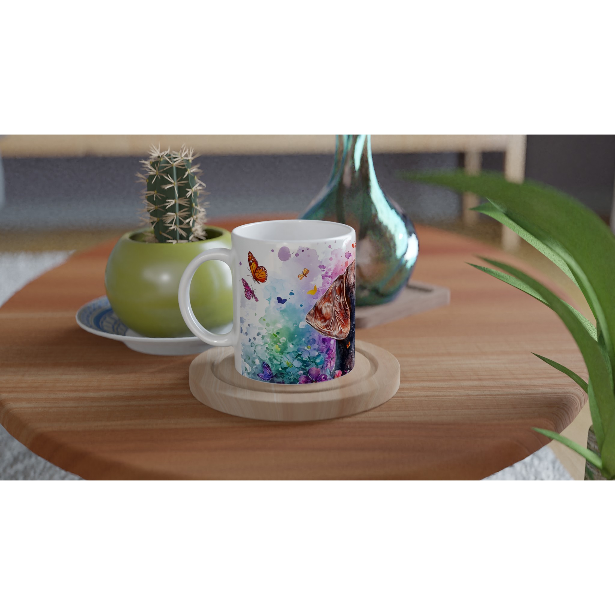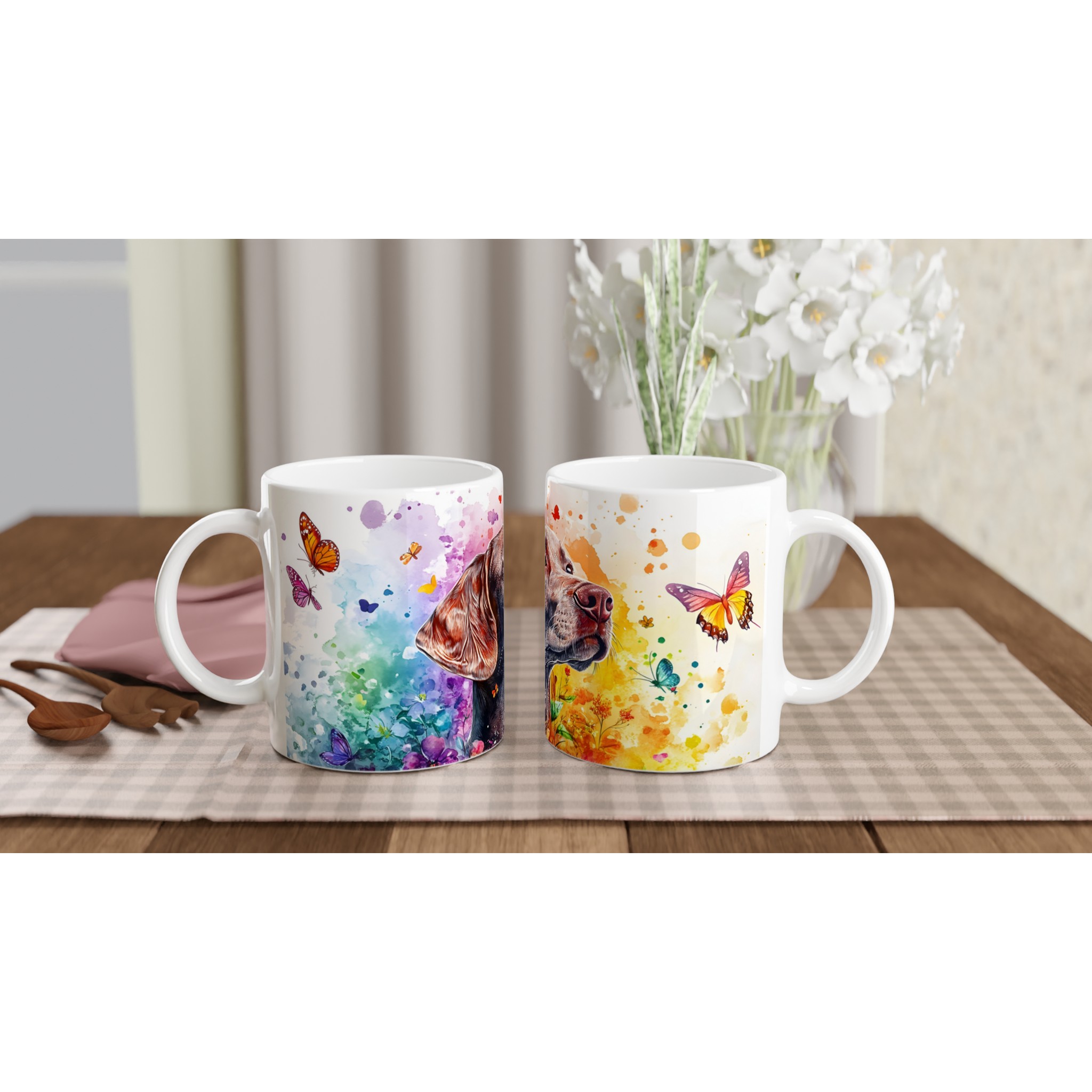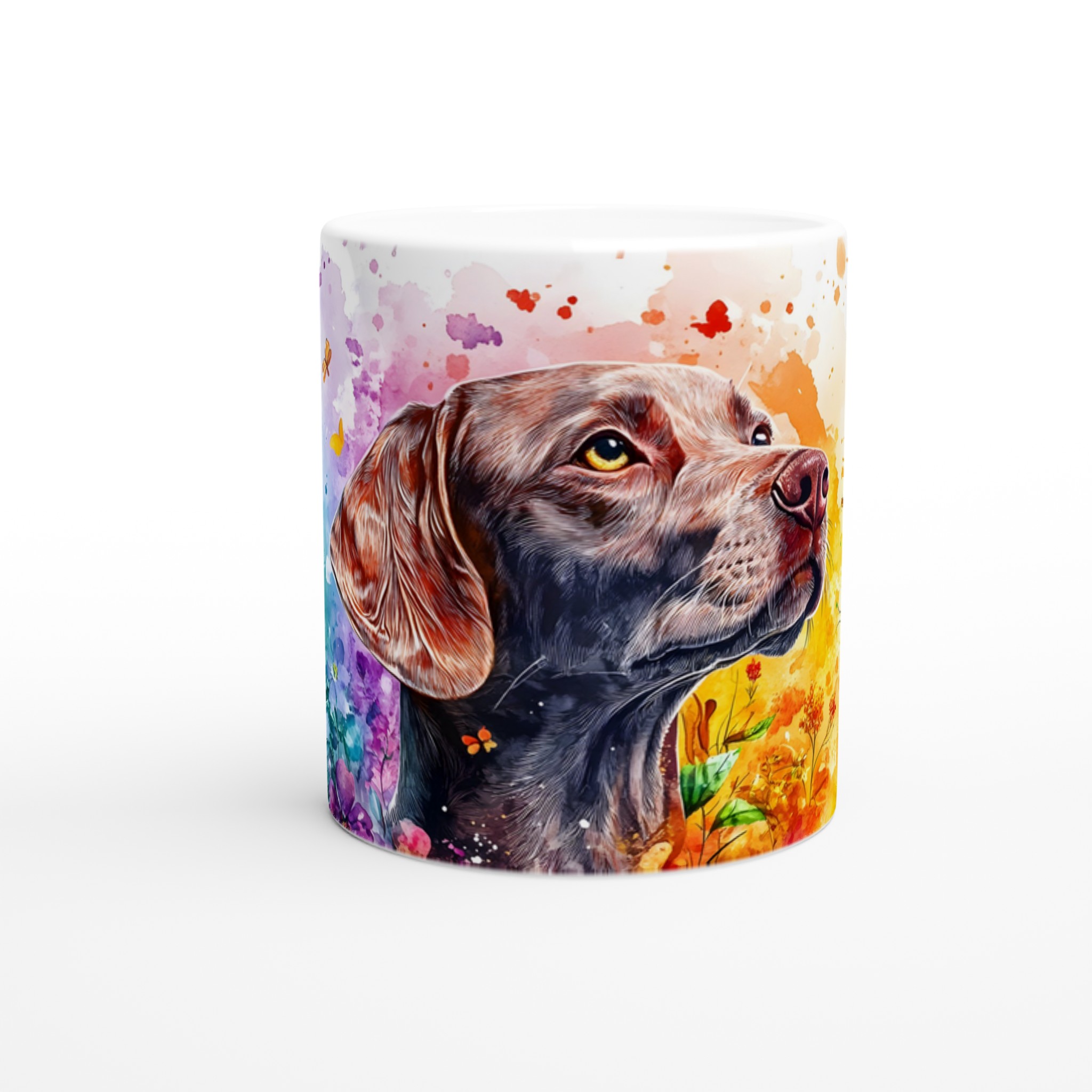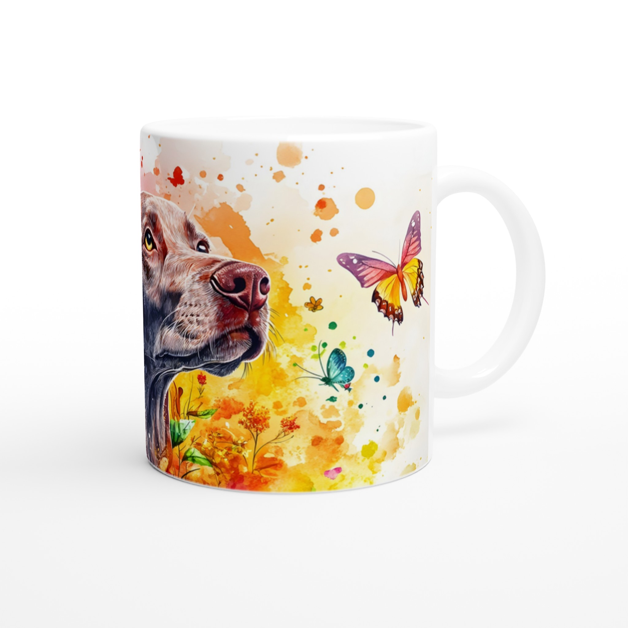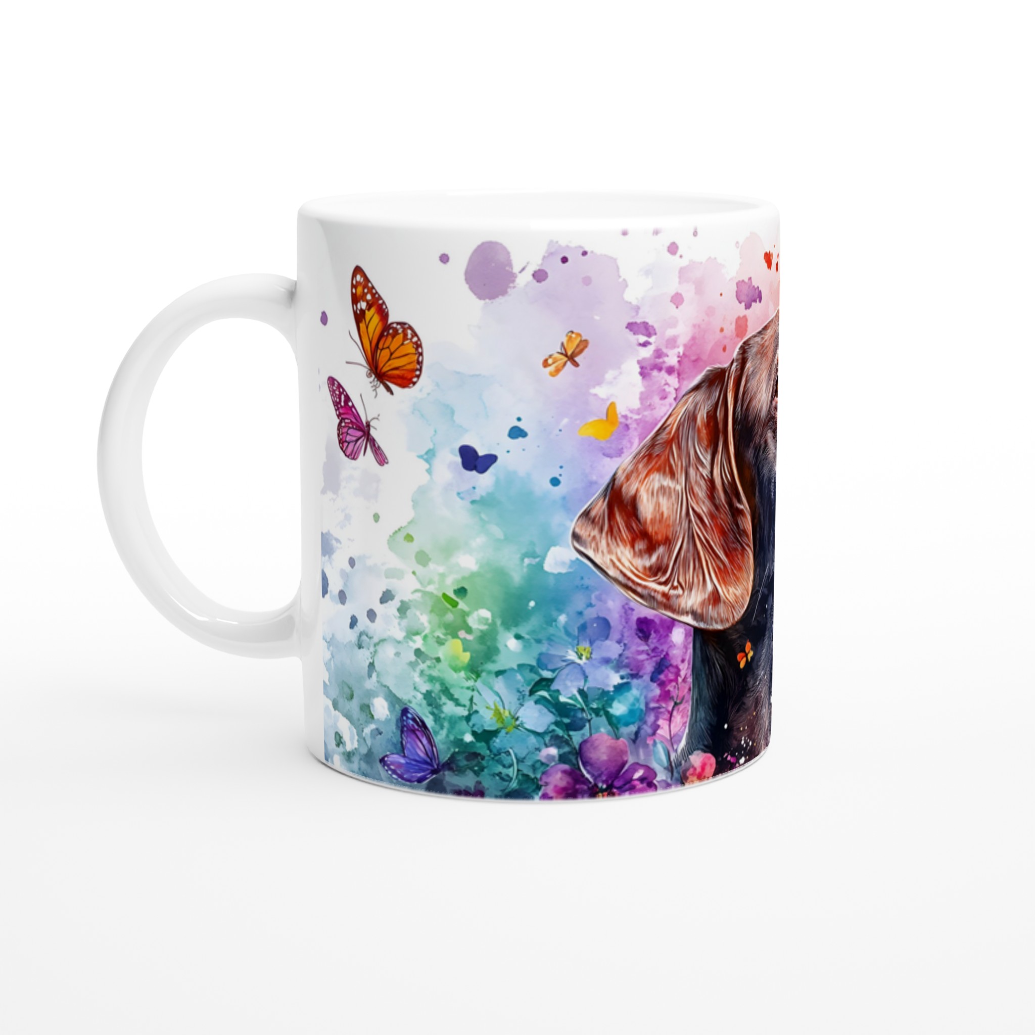 Väck dina sinnen varje morgon med denna färgsprakande keramikmugg, prydd med en majestätisk labradors siluett omgiven av en explosion av akvarellfärger och lekfulla fjärilar. Denna mugg är inte bara en dryckesbehållare, utan ett konstverk som lyfter stämningen och påminner om naturens skönhet och den glädje våra fyrbenta vänner sprider. Perfekt för morgonkaffet, en värmande kopp te eller en härlig varm choklad.
