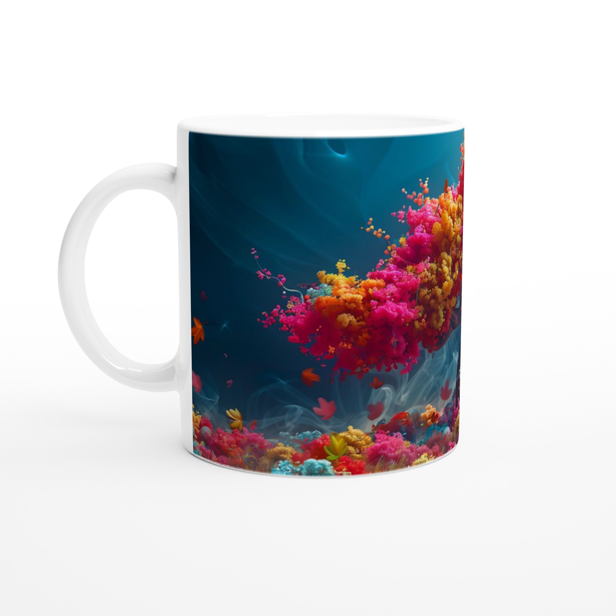 Denna mugg fångar den livfulla energin från ett abstrakt livsträd, sprudlande av rosa, orange och gula nyanser mot en drömsk blå bakgrund. Den blanka vita ytan ger ett skarpt och levande tryck som verkligen sticker ut, oavsett om det är en personlig design, ett roligt citat eller en present till någon du tycker om. Välj mellan en regnbåge av sju keramiska färger för att perfekt matcha din personlighet eller inredning.