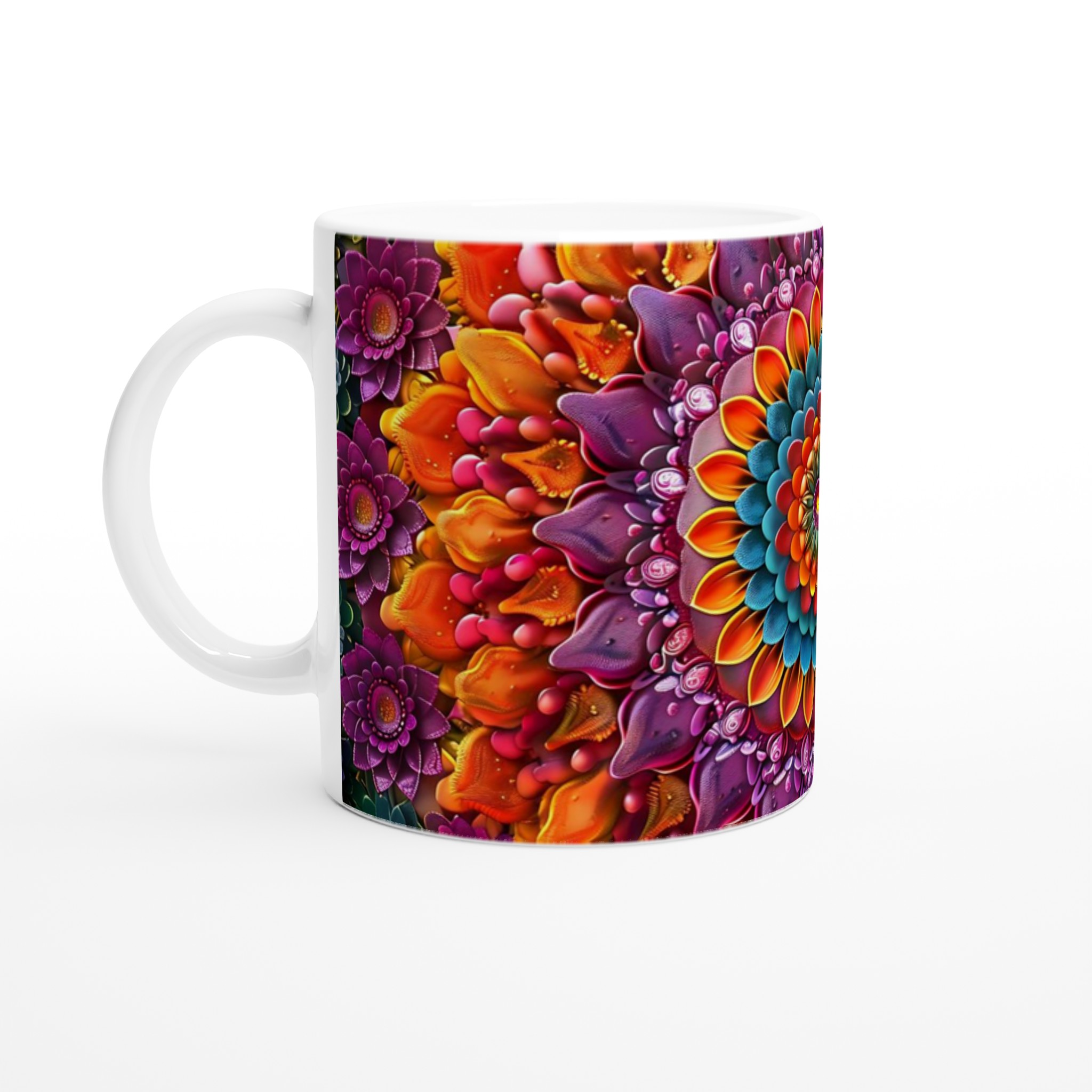 Färgsprakande Mandala Keramikmugg – 11oz Vit Mugg med Levande 3D Blomsterdesign