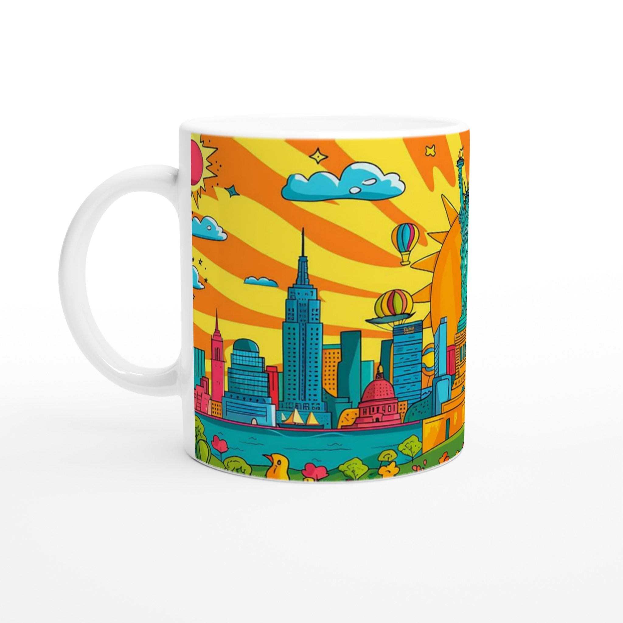 Denna lekfulla mugg fångar New Yorks pulserande energi med en färgstark illustration av ikoniska landmärken som Frihetsgudinnan och stadens skyline, allt under en strålande solnedgång. Den blanka vita ytan ger ett skarpt och levande tryck som verkligen sticker ut, oavsett om det är en personlig design, ett roligt citat eller en present till någon du tycker om.