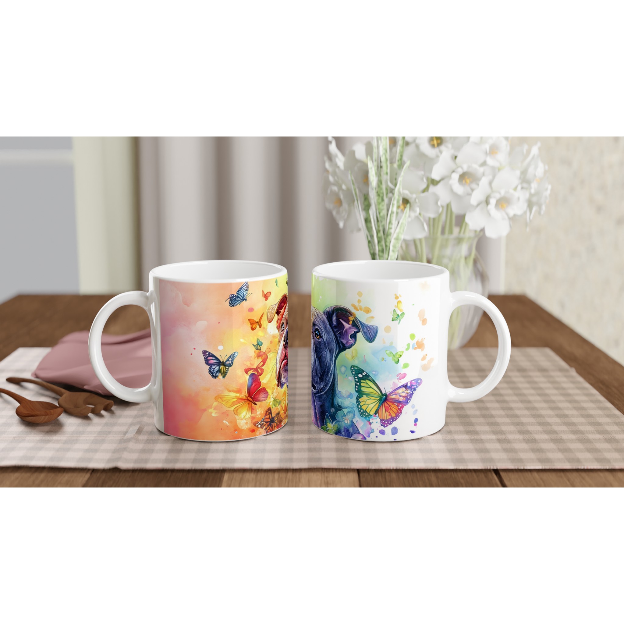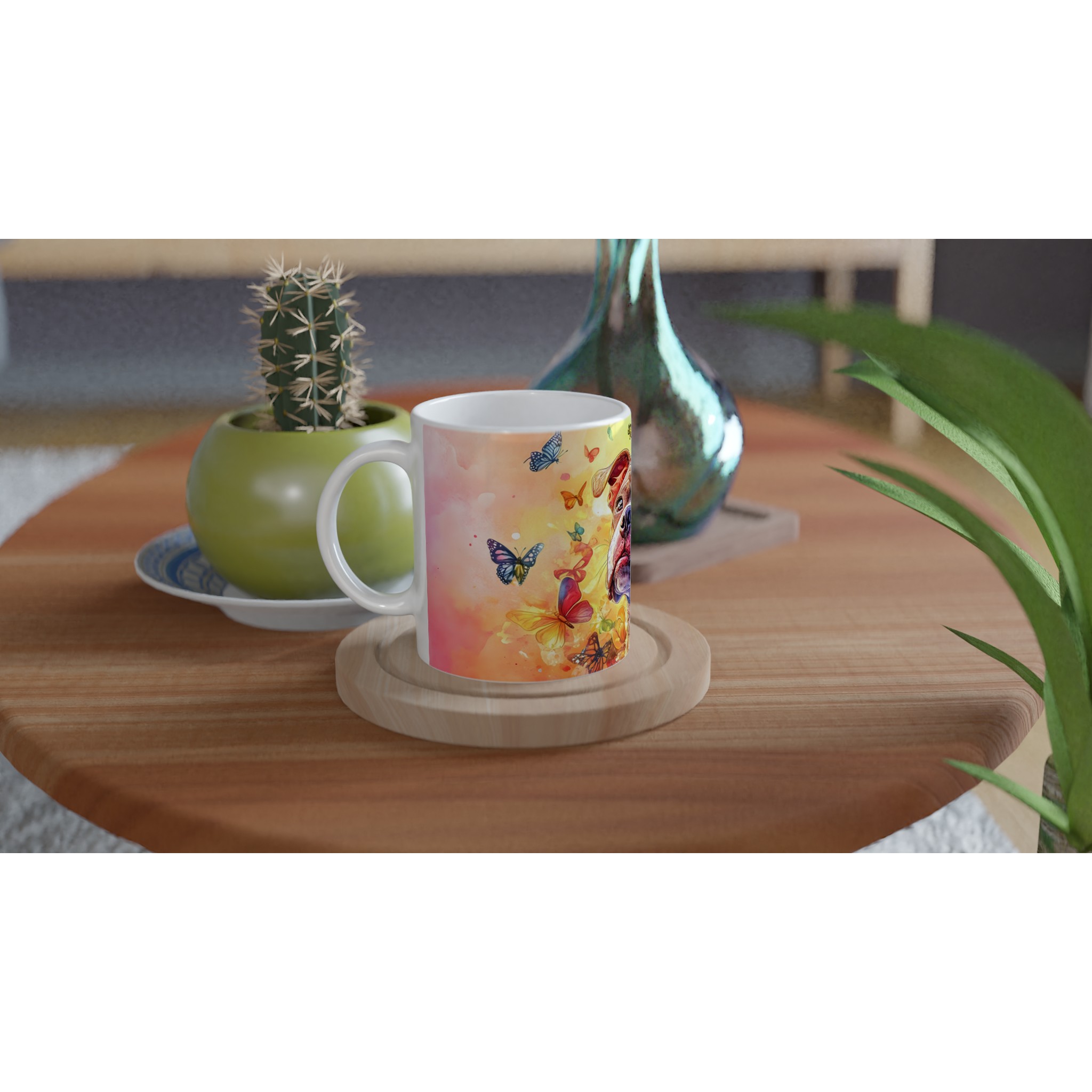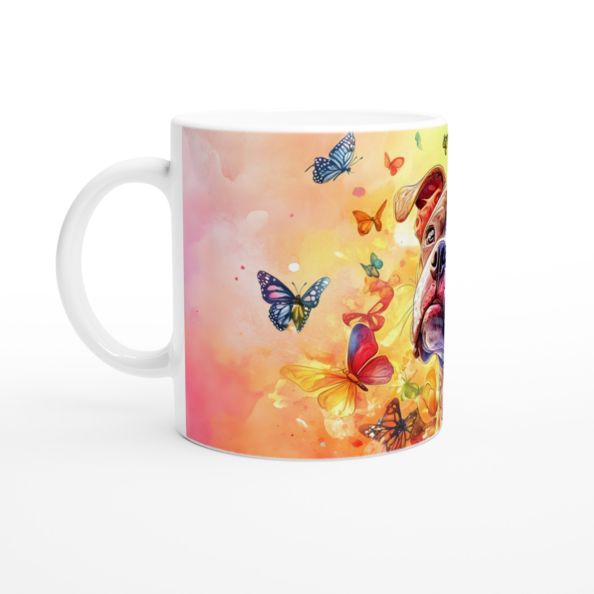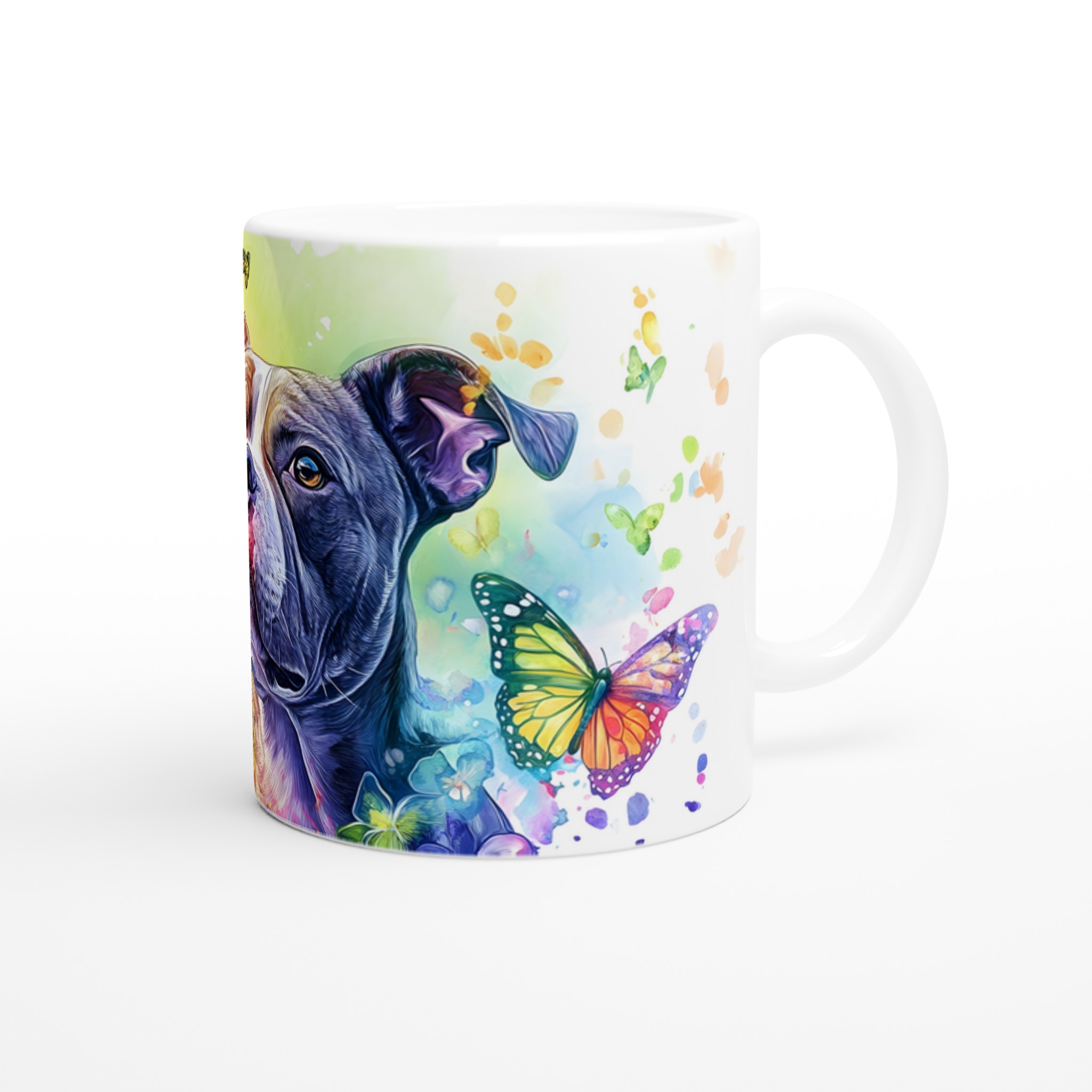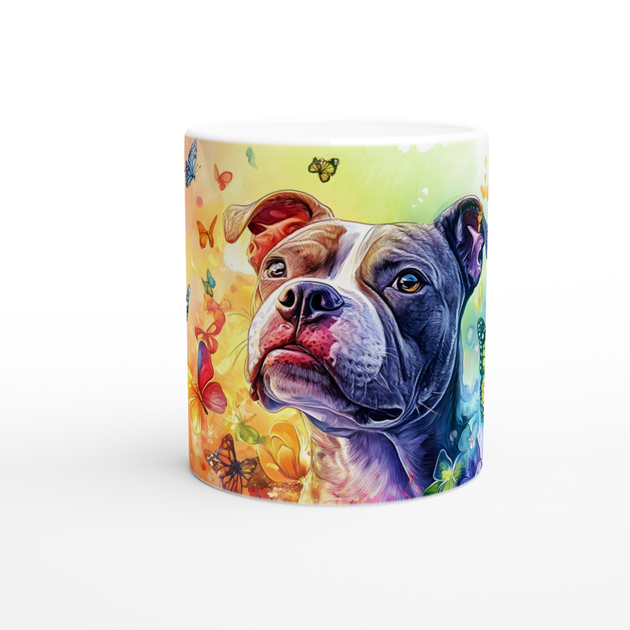Låt varje klunk bli en explosion av färg och glädje med vår unika keramikmugg! Denna mugg är prydd med en livfull och konstnärlig illustration av en pitbull omgiven av dansande, färgsprakande fjärilar – en sann hyllning till både styrka och skönhet. Den drömska akvarellstilen, med sin rika palett av rosa, orange, lila och blå nyanser, skapar en magisk känsla som förgyller varje fikastund.