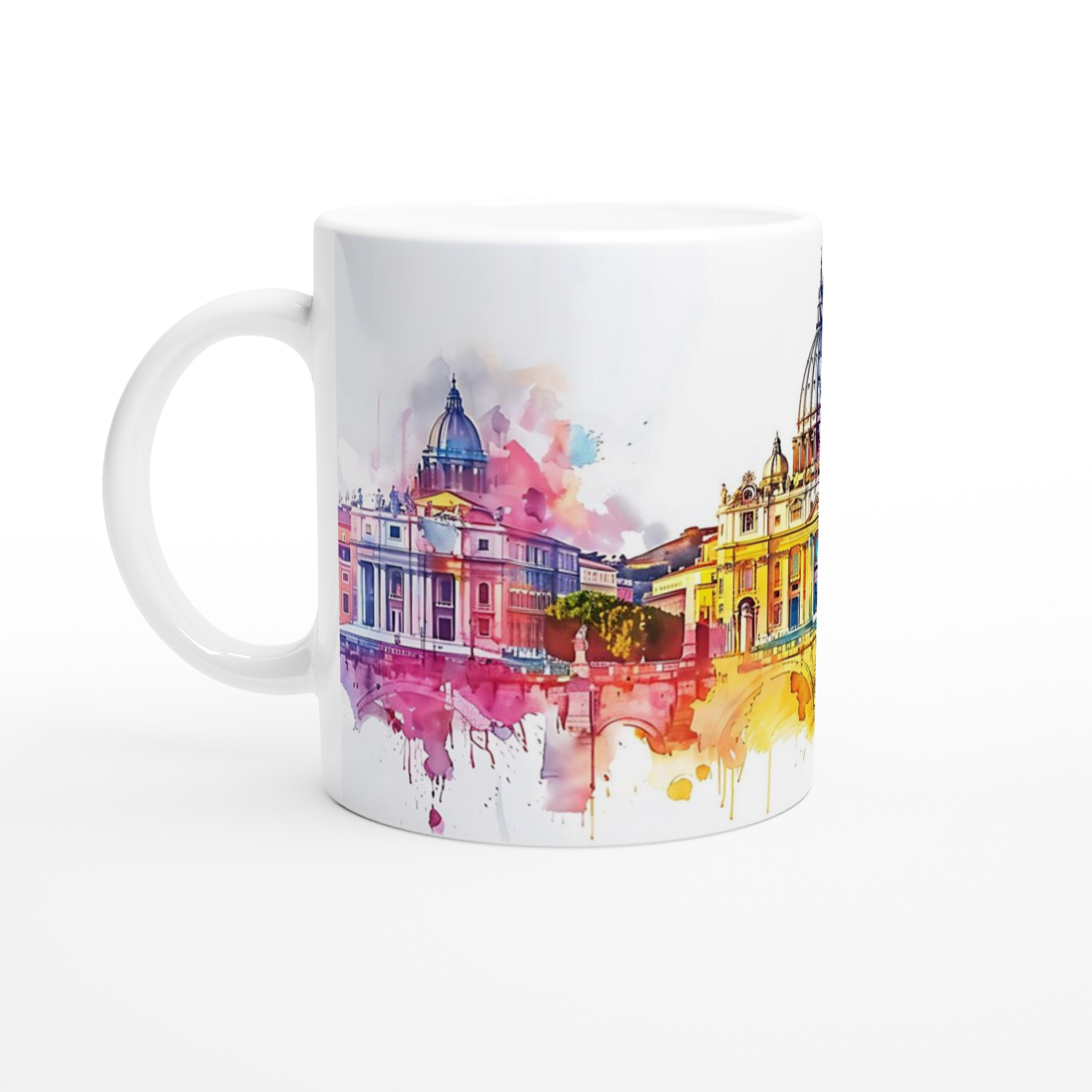 Föreställ dig Roms majestätiska arkitektur, badad i en explosion av akvarellfärger som fångar stadens liv och själ. Denna mugg förvandlar varje sipp till en konstupplevelse. Den blanka vita ytan ger ett skarpt och levande tryck som verkligen sticker ut, oavsett om det är en personlig design, ett roligt citat eller en present till någon du tycker om.