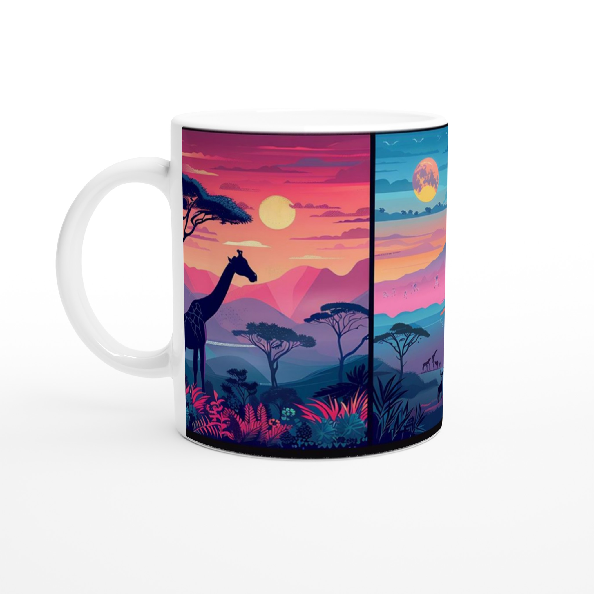 Inspirerad av savannens magiska solnedgångar och vilda djurliv, bjuder denna mugg in till en färgsprakande flykt från vardagen. Den blanka ytan ger ett skarpt och levande tryck som verkligen sticker ut, oavsett om det är en personlig design, ett roligt citat eller en present till någon du tycker om.