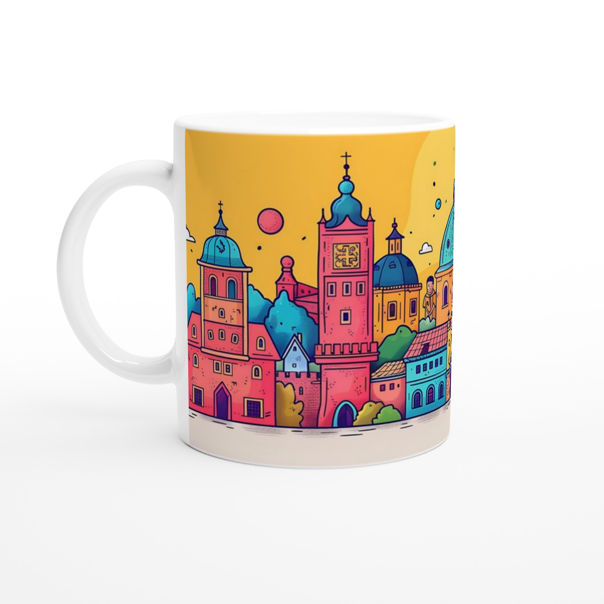 Inspirerad av fantasifulla sagostäder, bjuder denna mugg in till en värld av glädje och färg med varje klunk. Den blanka vita ytan ger ett skarpt och levande tryck som verkligen sticker ut, oavsett om det är en personlig design, ett roligt citat eller en present till någon du tycker om.