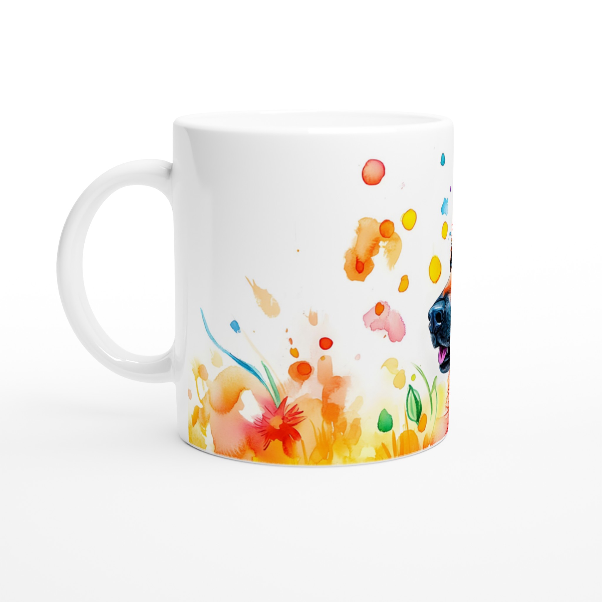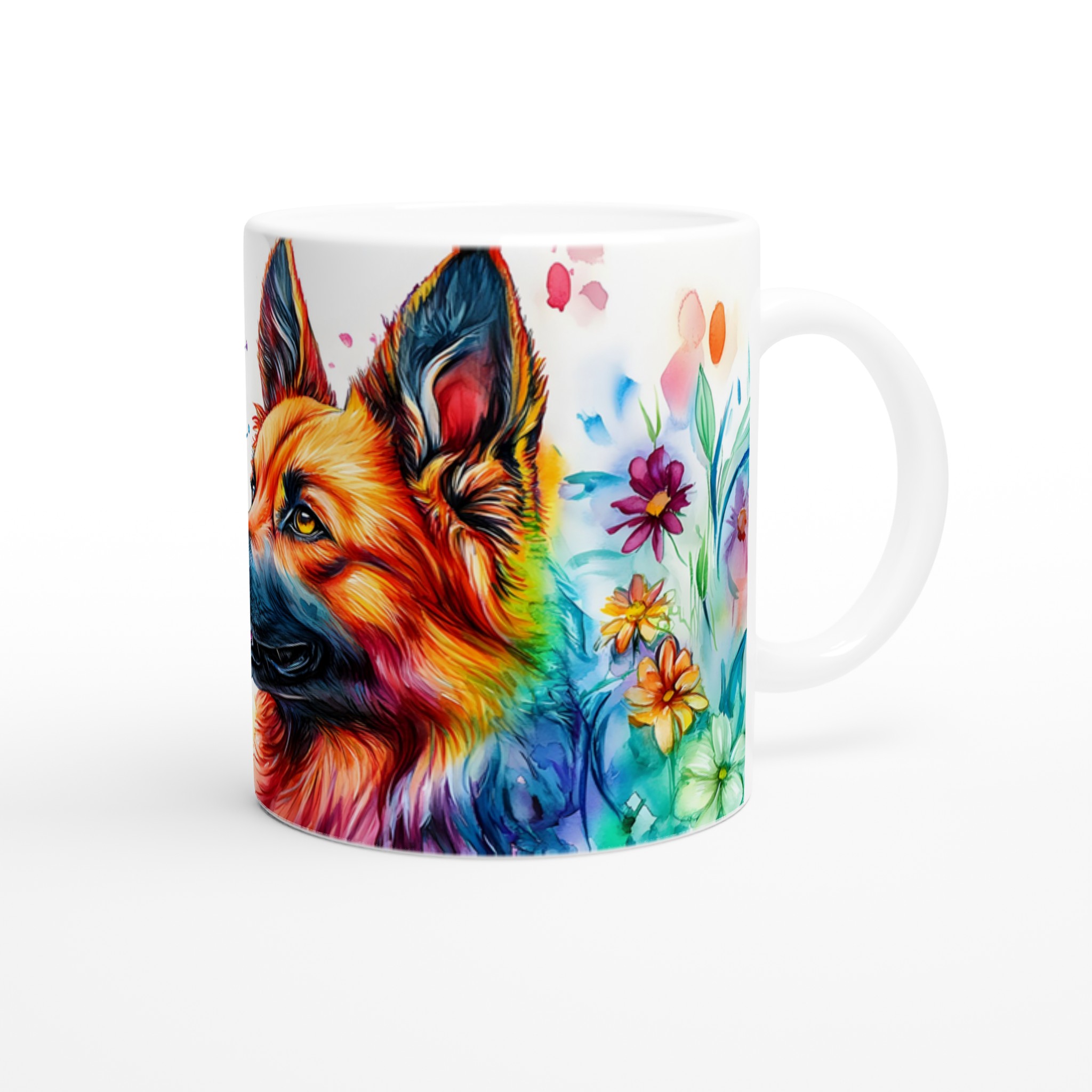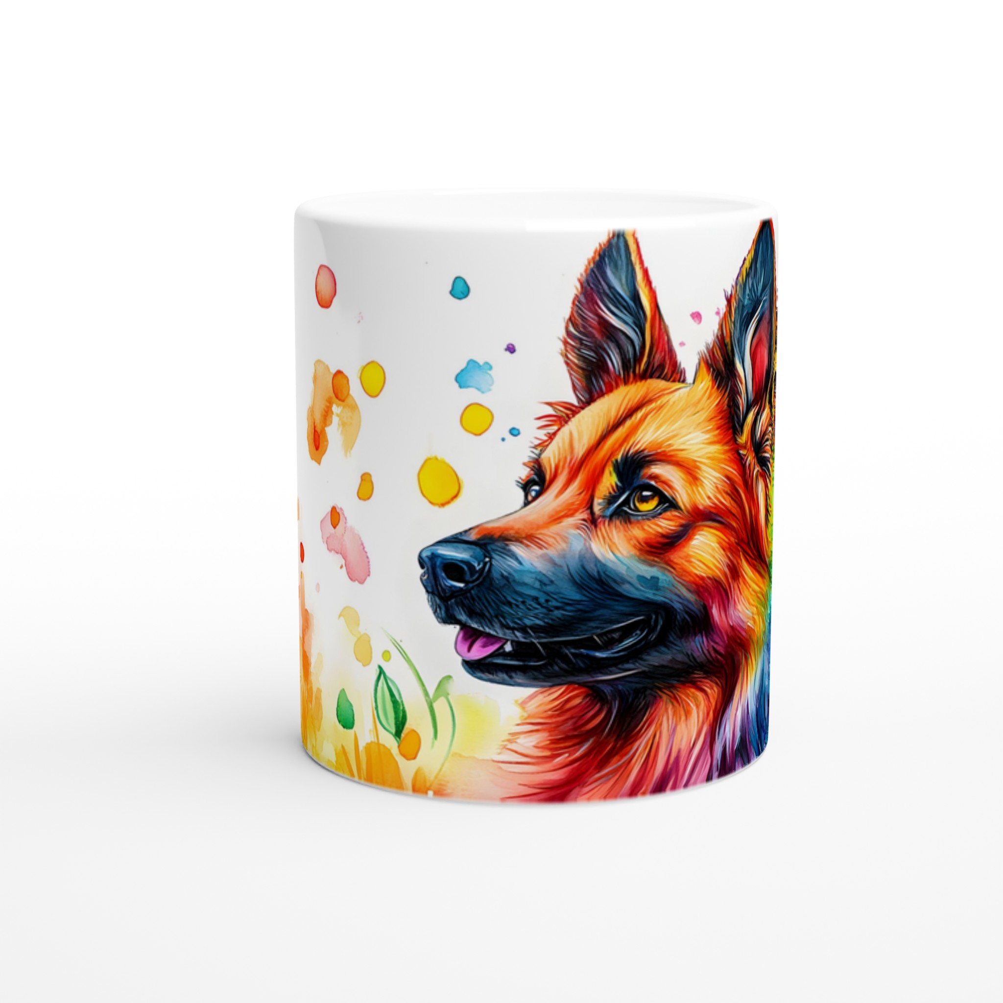 Väck dina sinnen med denna färgsprakande keramikmugg, prydd med en majestätisk schäfer i en livfull akvarellstil. Varje klunk blir en upplevelse med detta konstverk som fångar hundens lojala anda och omges av en explosion av färger som påminner om en blomstrande trädgård. Denna mugg är inte bara en behållare för din favoritdryck, utan en hyllning till glädje och naturens skönhet, perfekt för hundälskaren eller den som uppskattar unika, konstnärliga föremål.