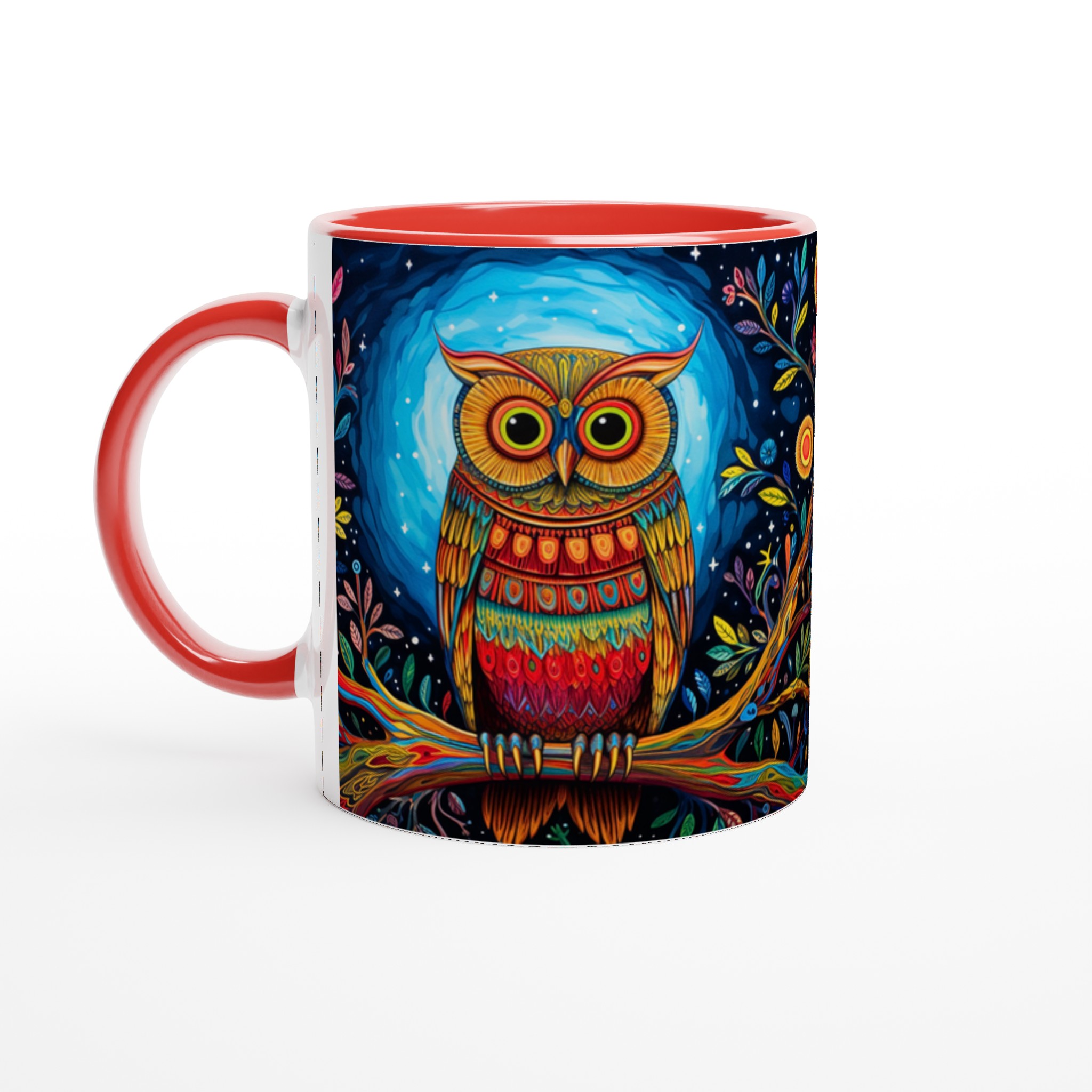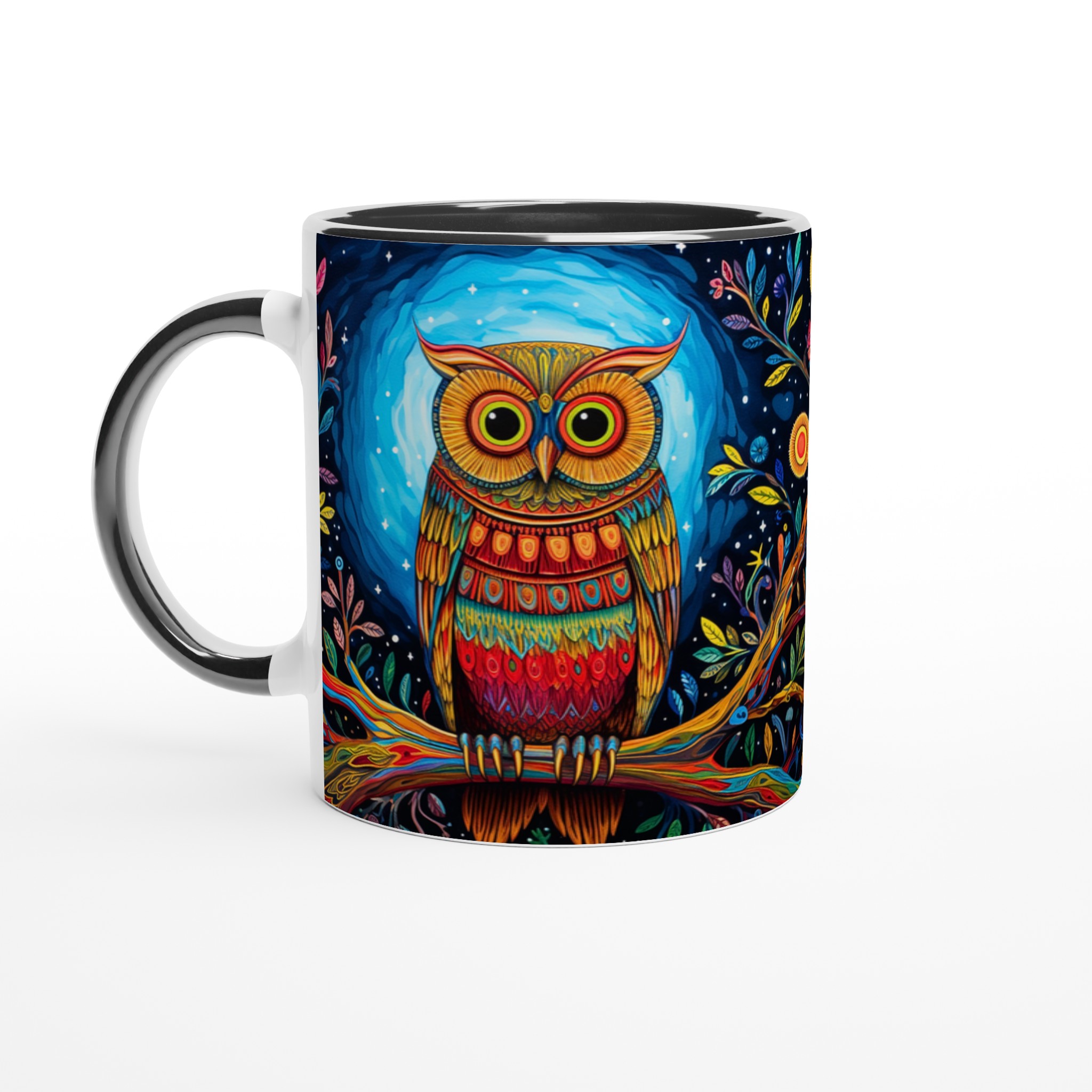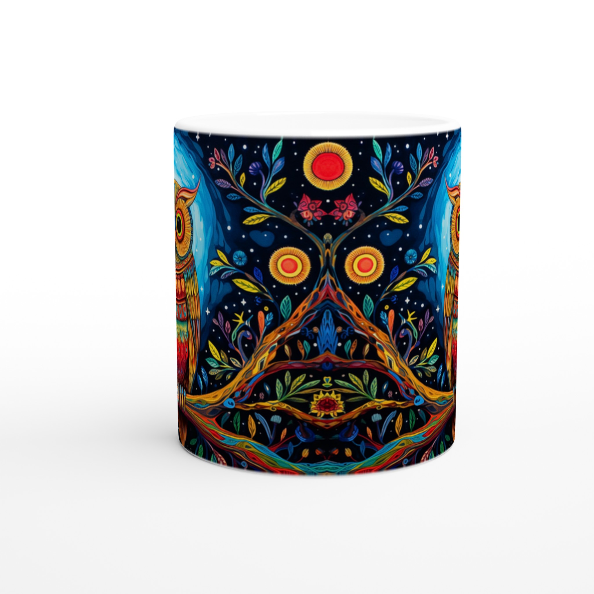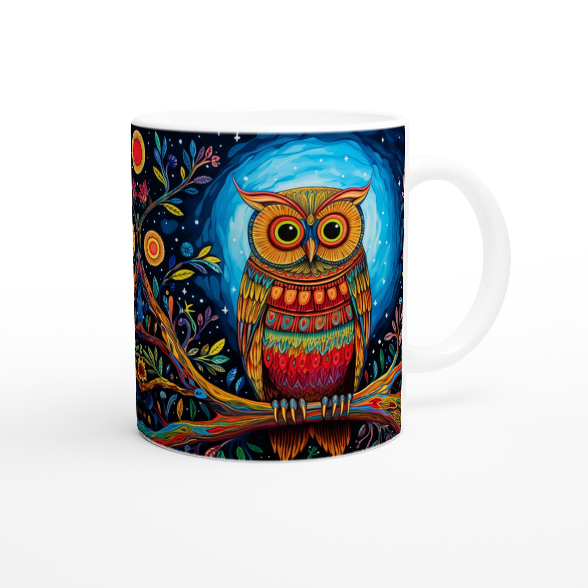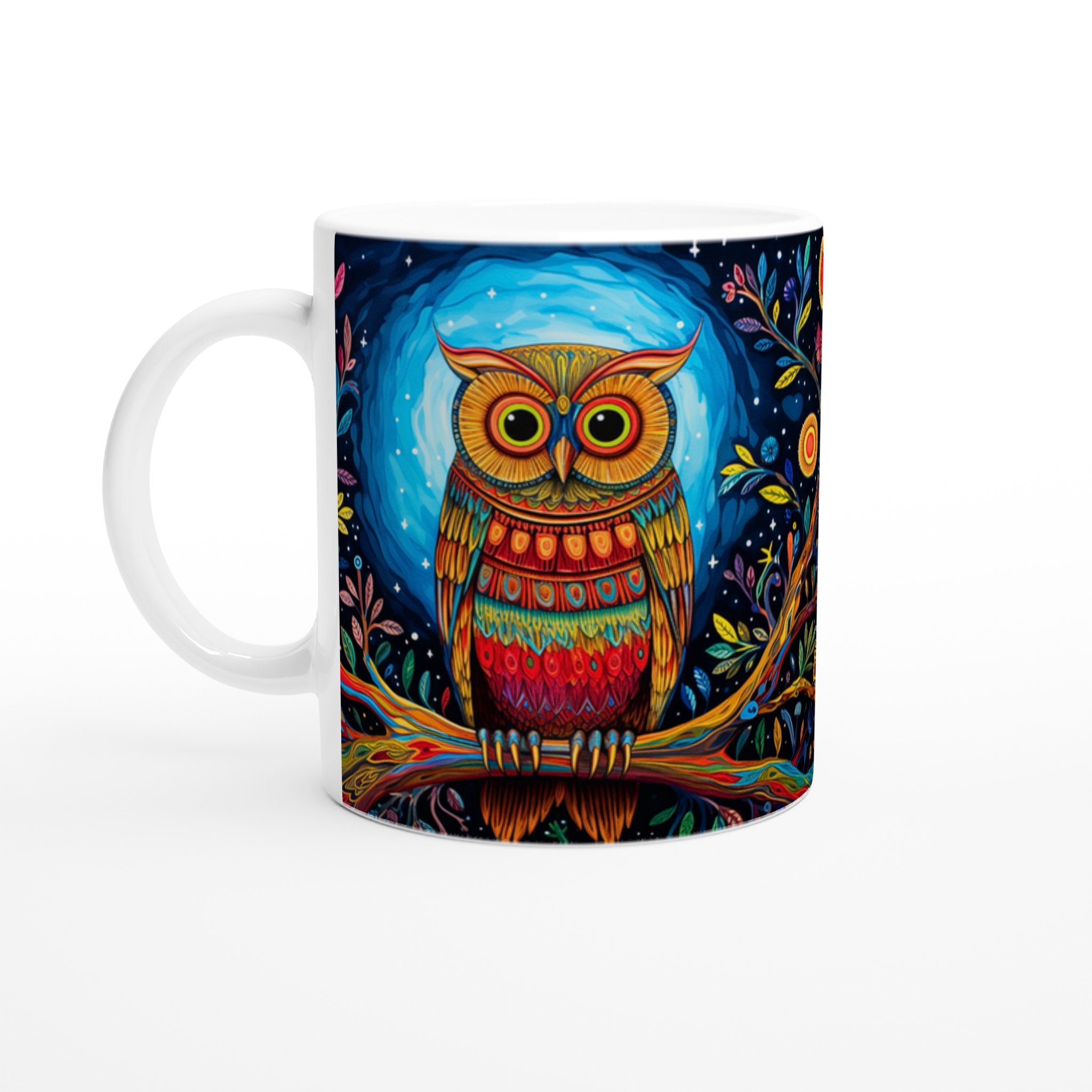 Fånga magin varje morgon med denna förtrollande keramiska mugg, prydd med en levande, psykedelisk uggla i ett fantasifullt nattskogslandskap. De rika färgerna och intrikata detaljerna kommer att förvandla din fikastund till en konstupplevelse. Denna stilrena keramiska mugg blir snabbt en vardagsfavorit, perfekt för morgonkaffet, kvällens varma choklad eller när du bara vill njuta av en kopp te. Den blanka vita ytan gör att trycken framhävs med klara och levande färger, som håller sig fina även efter många turer i mikron och diskmaskinen.