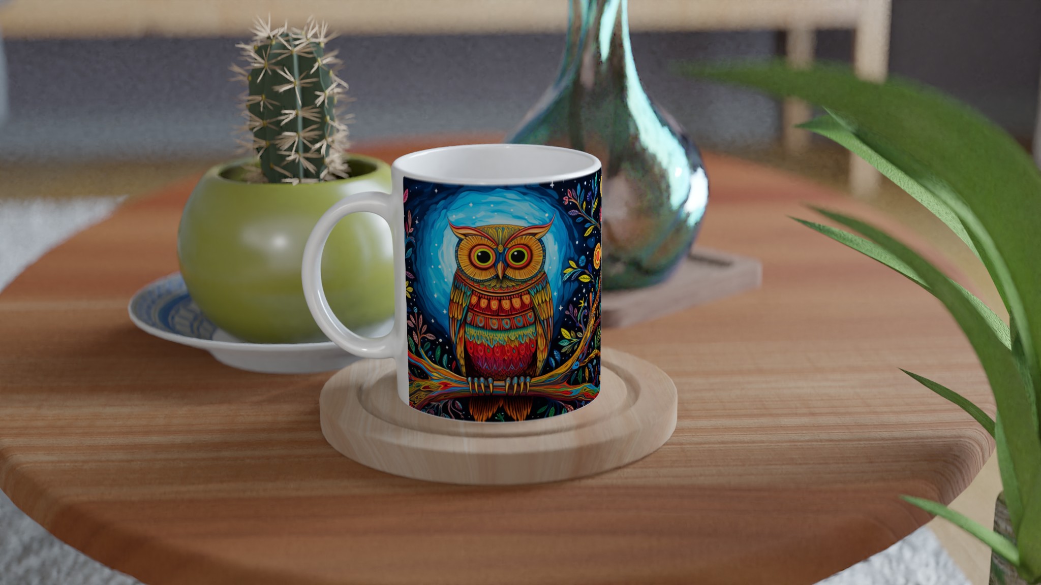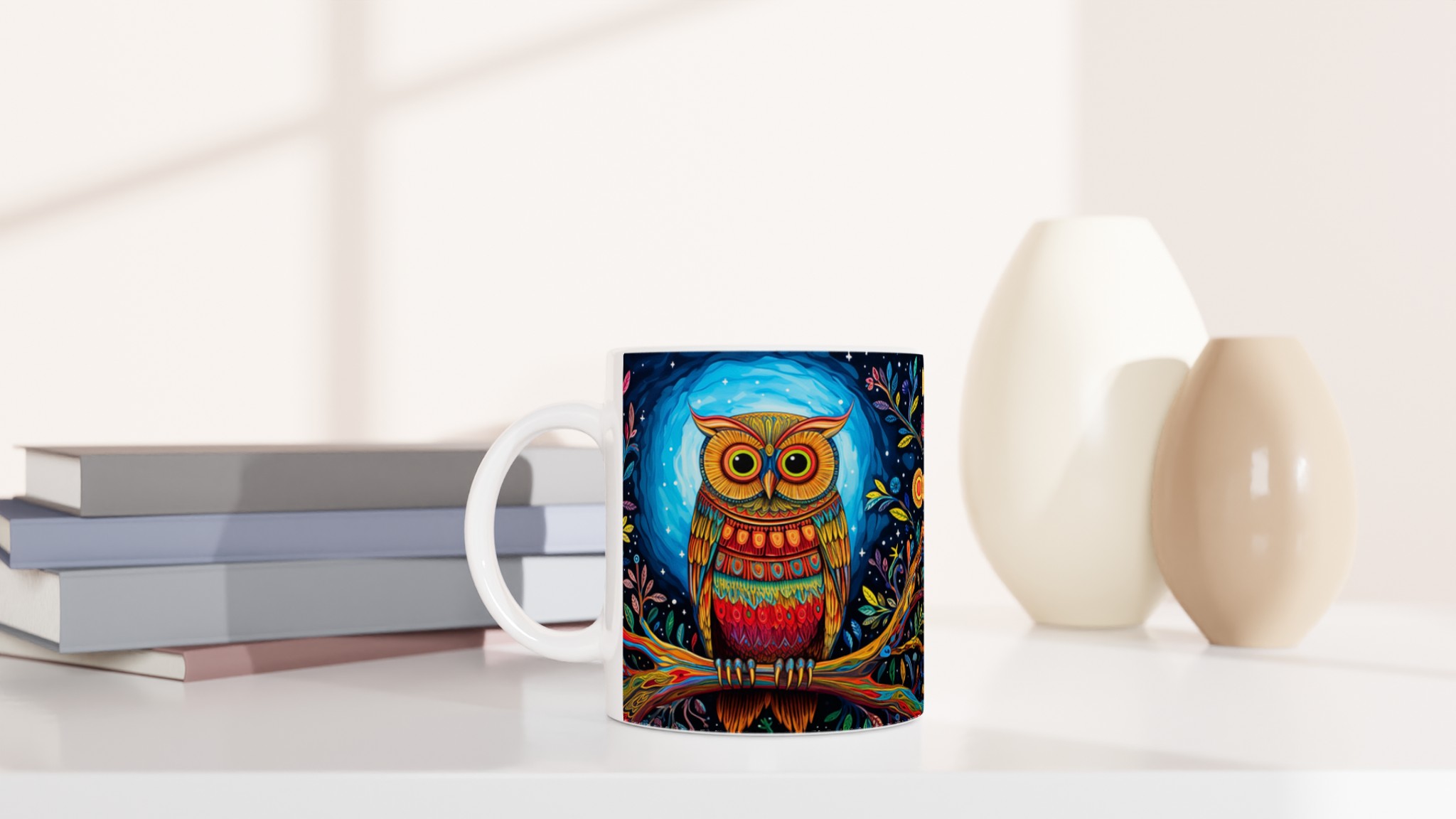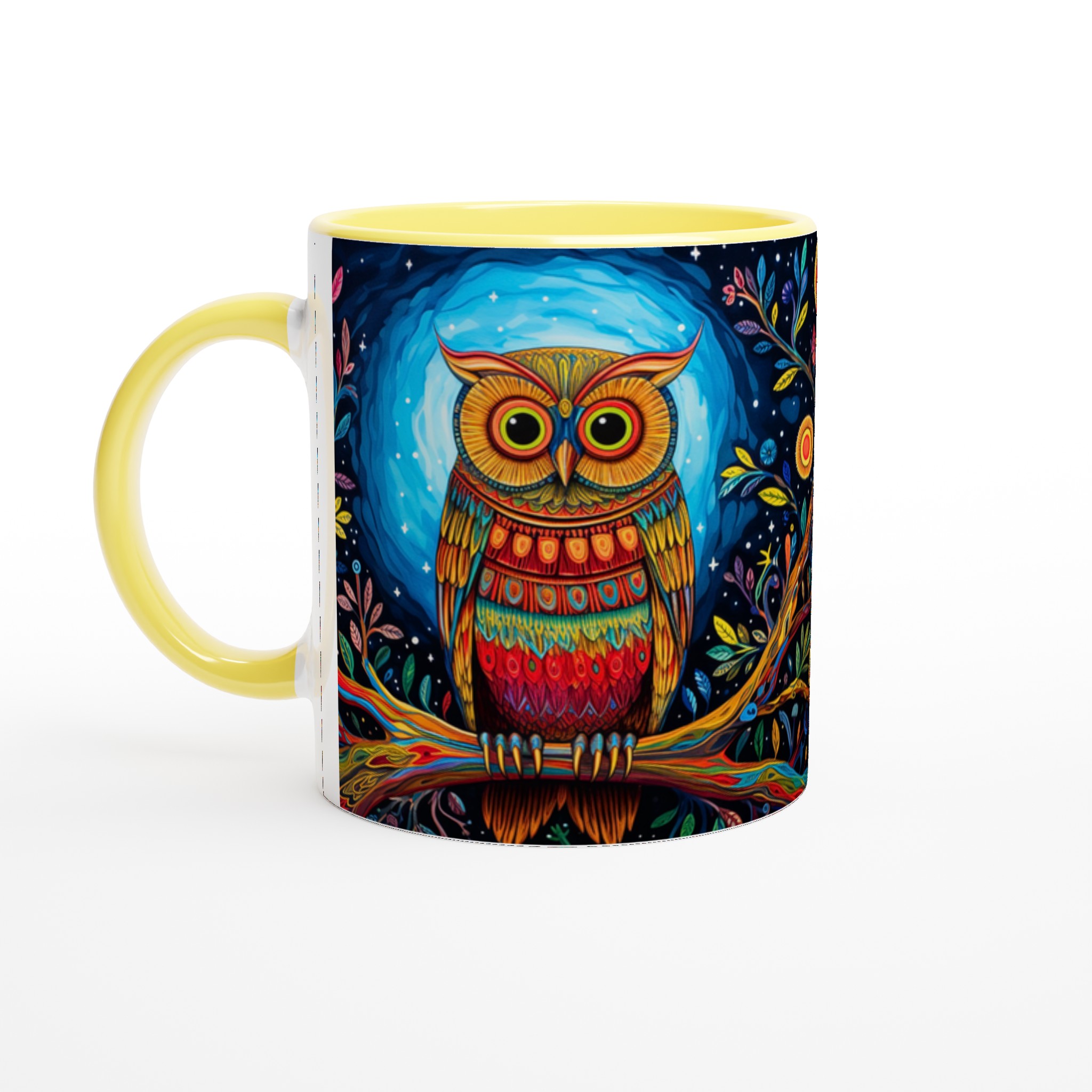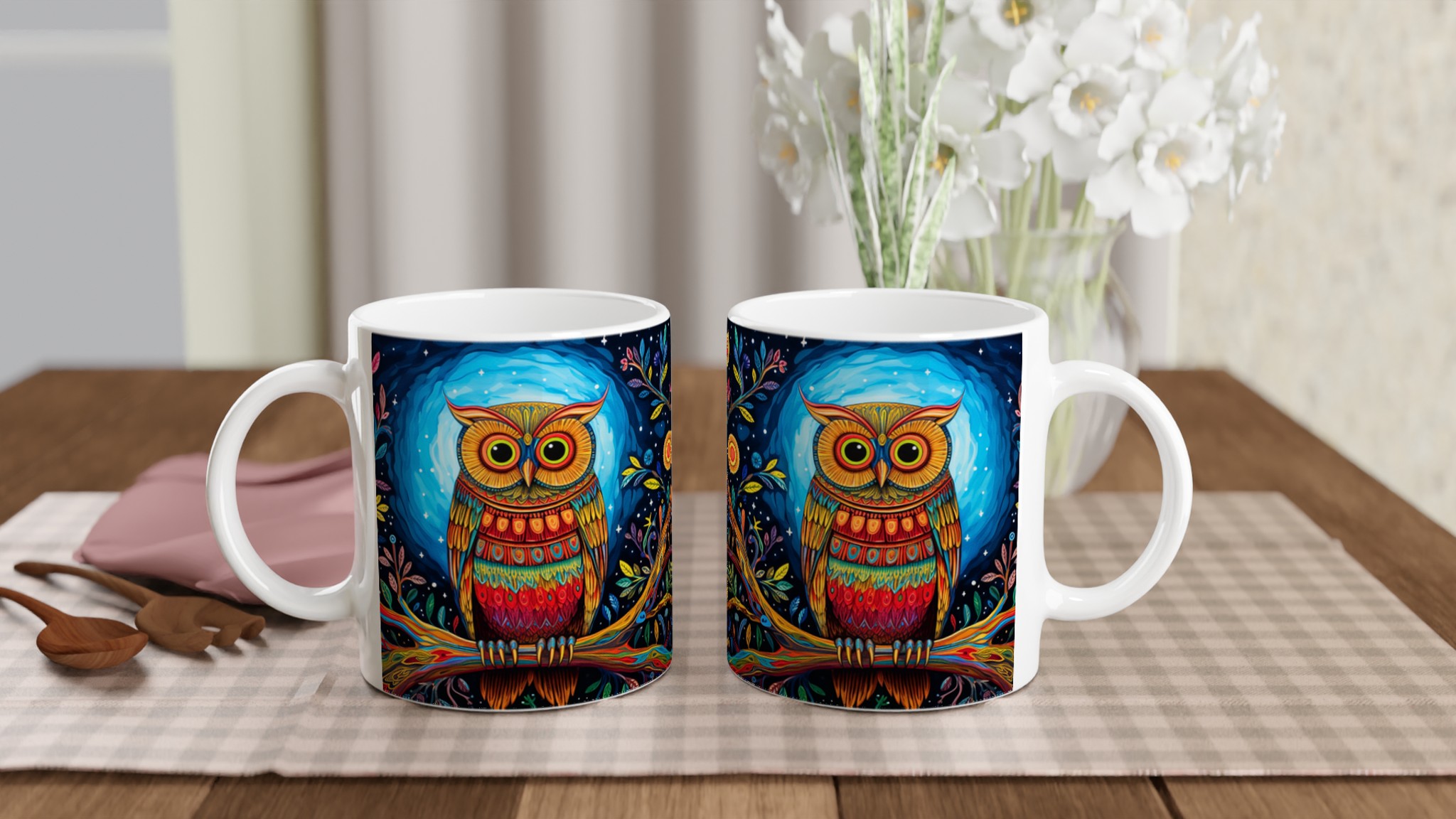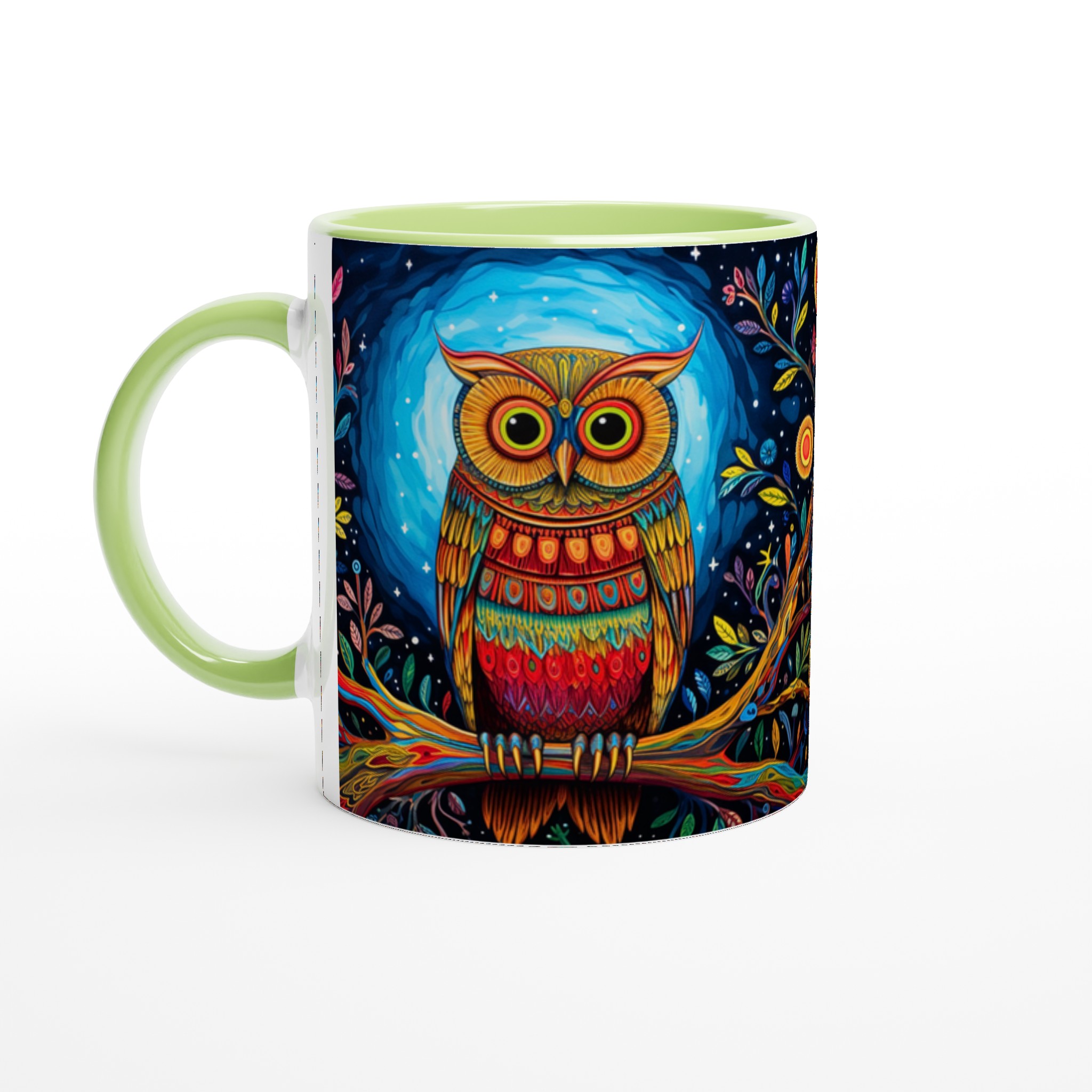 Fånga magin varje morgon med denna förtrollande keramiska mugg, prydd med en levande, psykedelisk uggla i ett fantasifullt nattskogslandskap. De rika färgerna och intrikata detaljerna kommer att förvandla din fikastund till en konstupplevelse. Denna stilrena keramiska mugg blir snabbt en vardagsfavorit, perfekt för morgonkaffet, kvällens varma choklad eller när du bara vill njuta av en kopp te. Den blanka vita ytan gör att trycken framhävs med klara och levande färger, som håller sig fina även efter många turer i mikron och diskmaskinen.