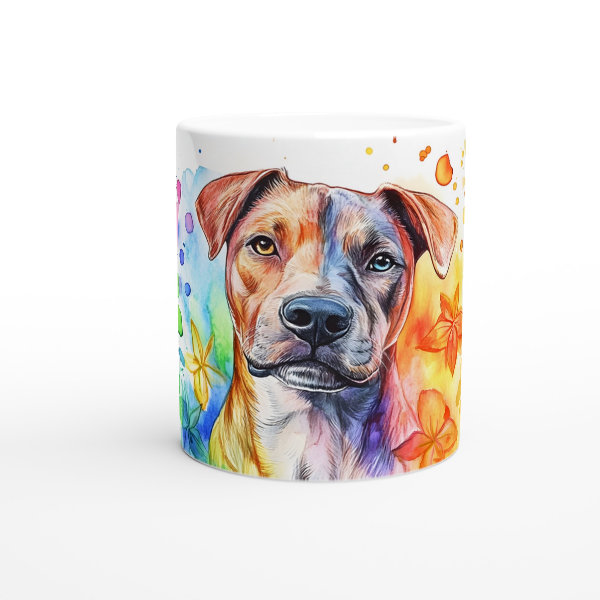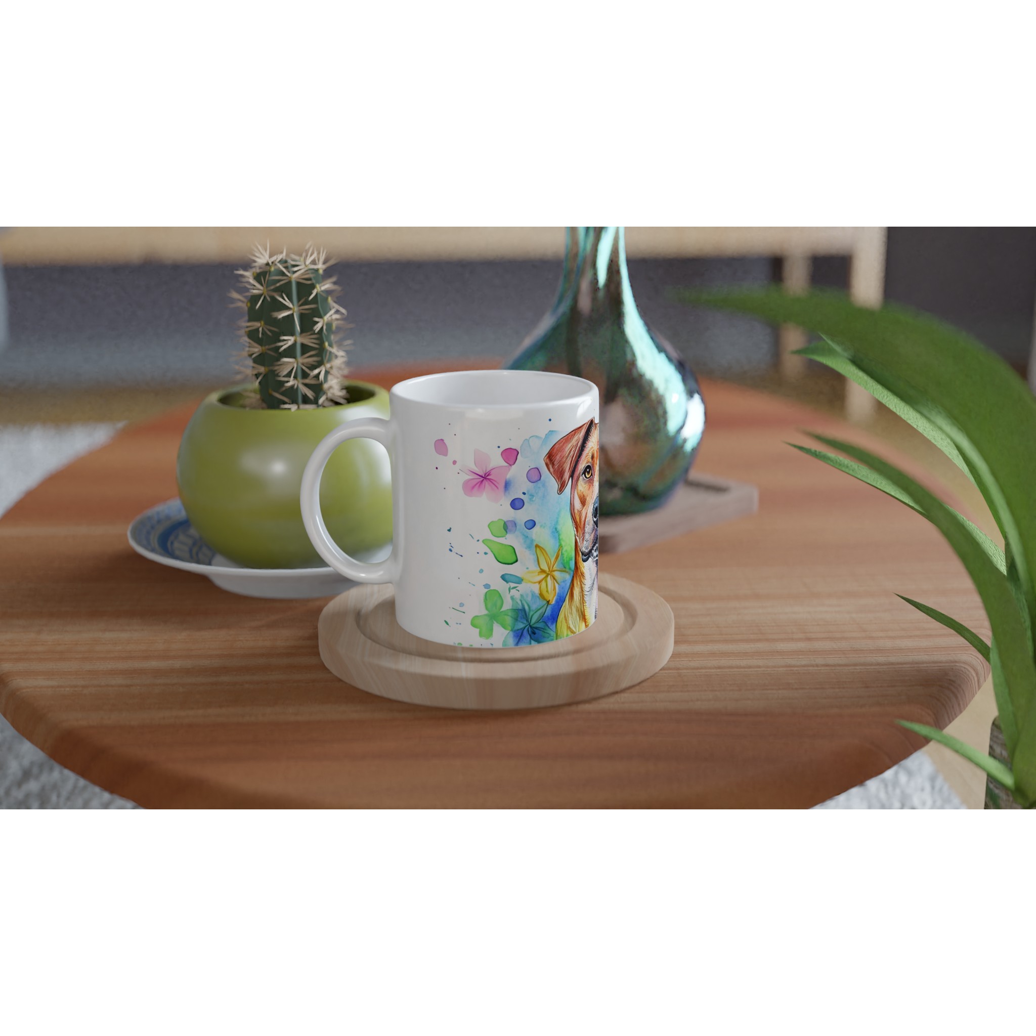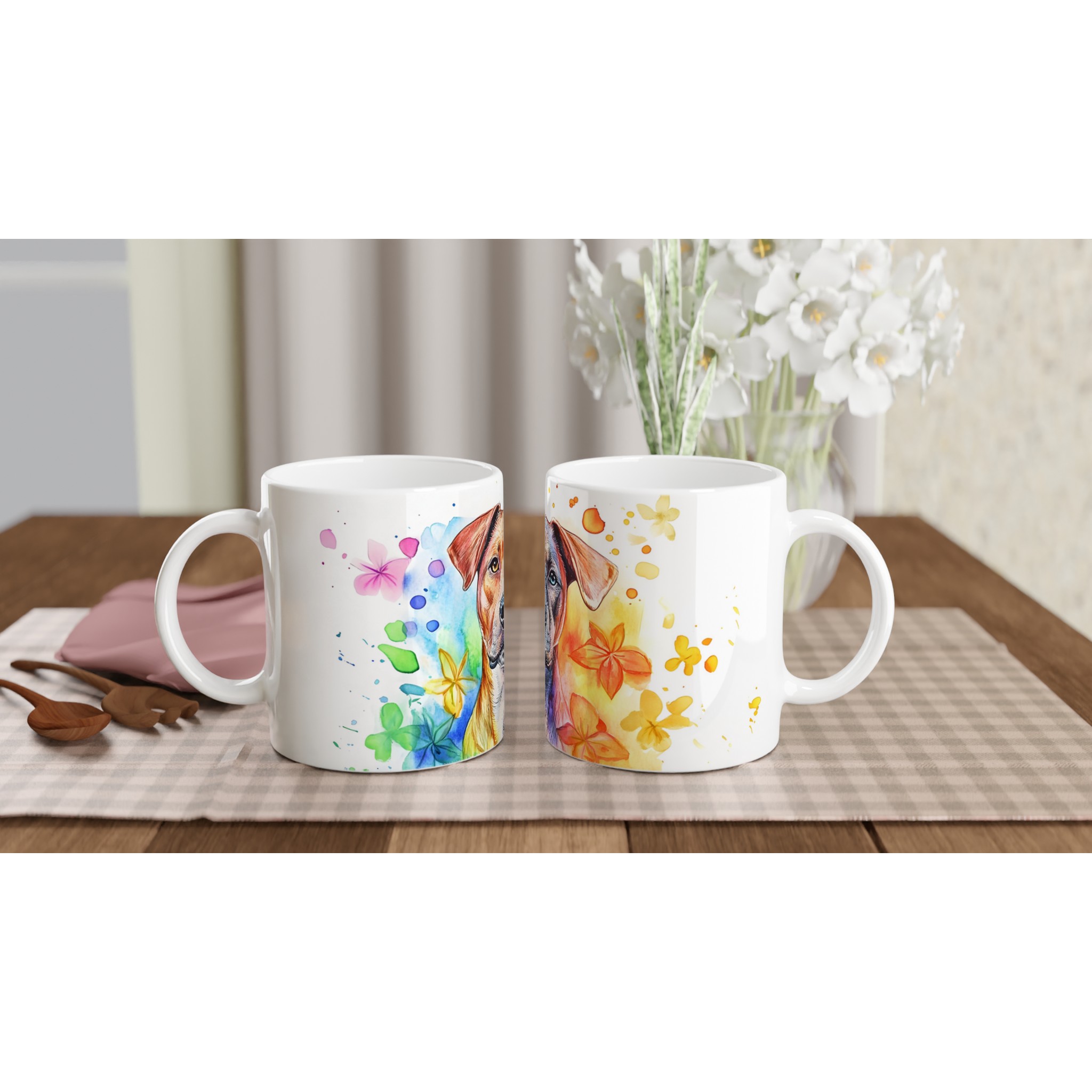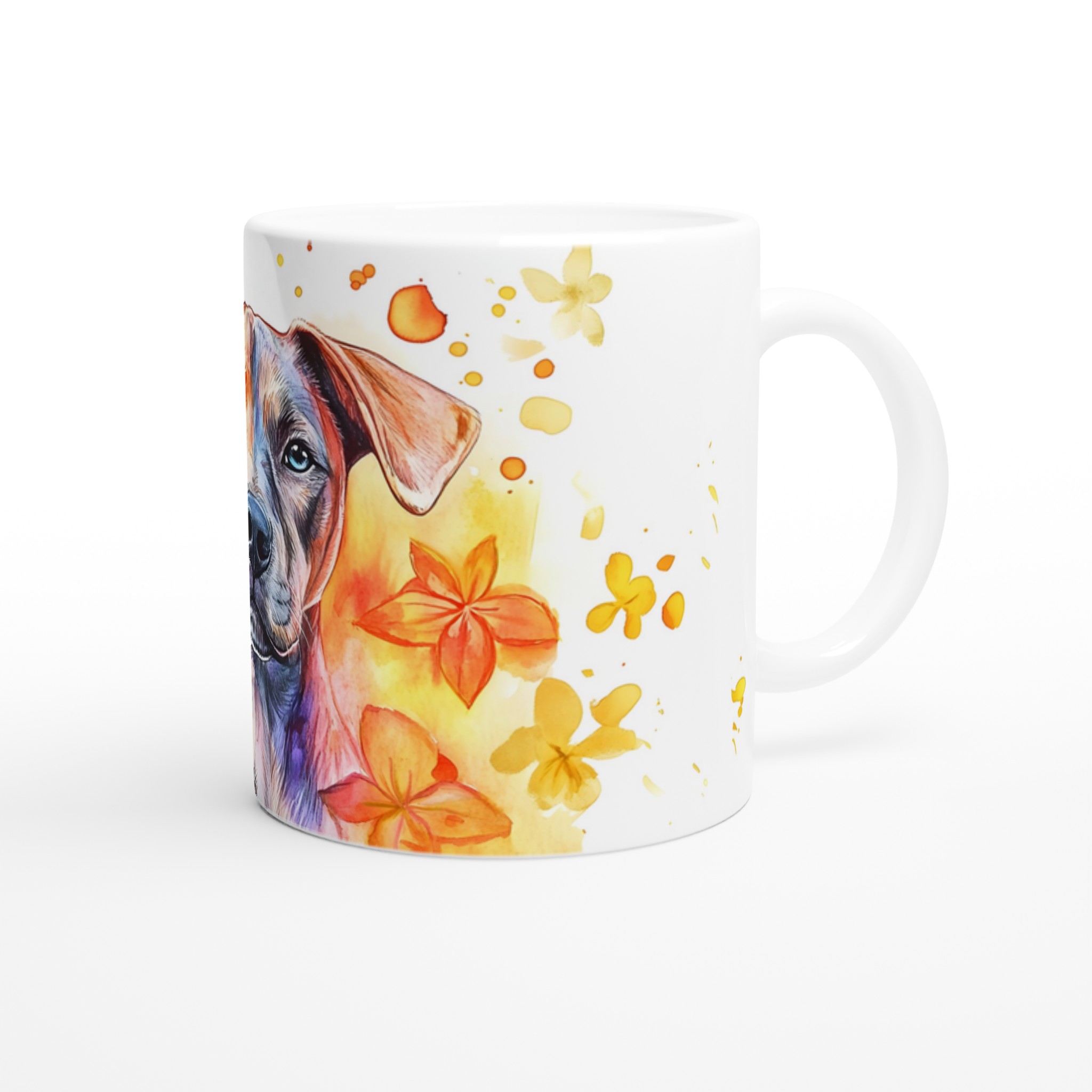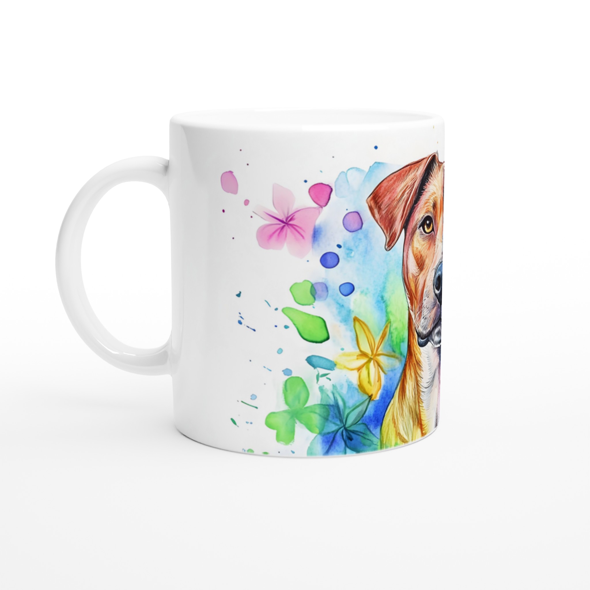 Väck dina sinnen med varje klunk från denna färgsprakande keramikmugg, prydd med en levande vattenfärgsillustration av en hund omgiven av blommande inslag. Denna mugg är inte bara ett kärl för din favoritdryck, utan ett konstverk som lyfter din dag med sin glada och drömska estetik. Perfekt för morgonkaffet, en värmande kopp te eller en härlig varm choklad, den blir snabbt din nya favorit i vardagen.