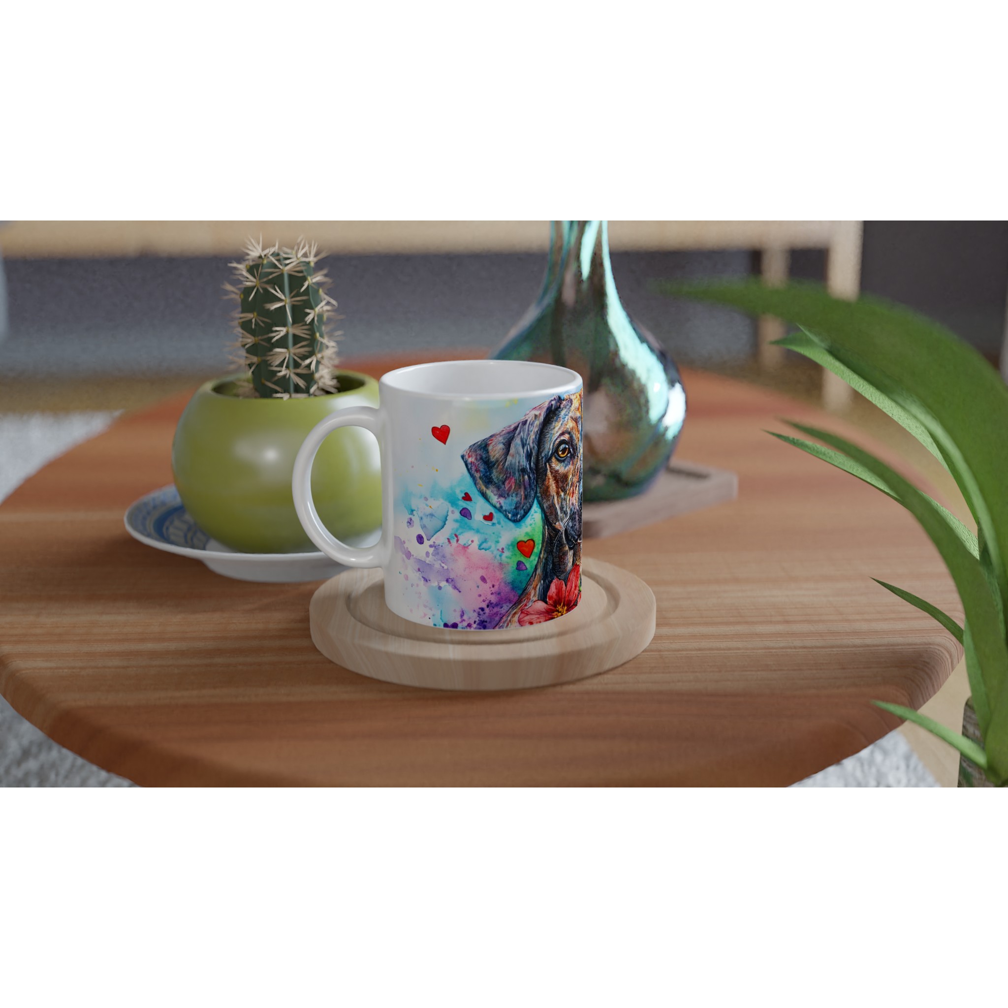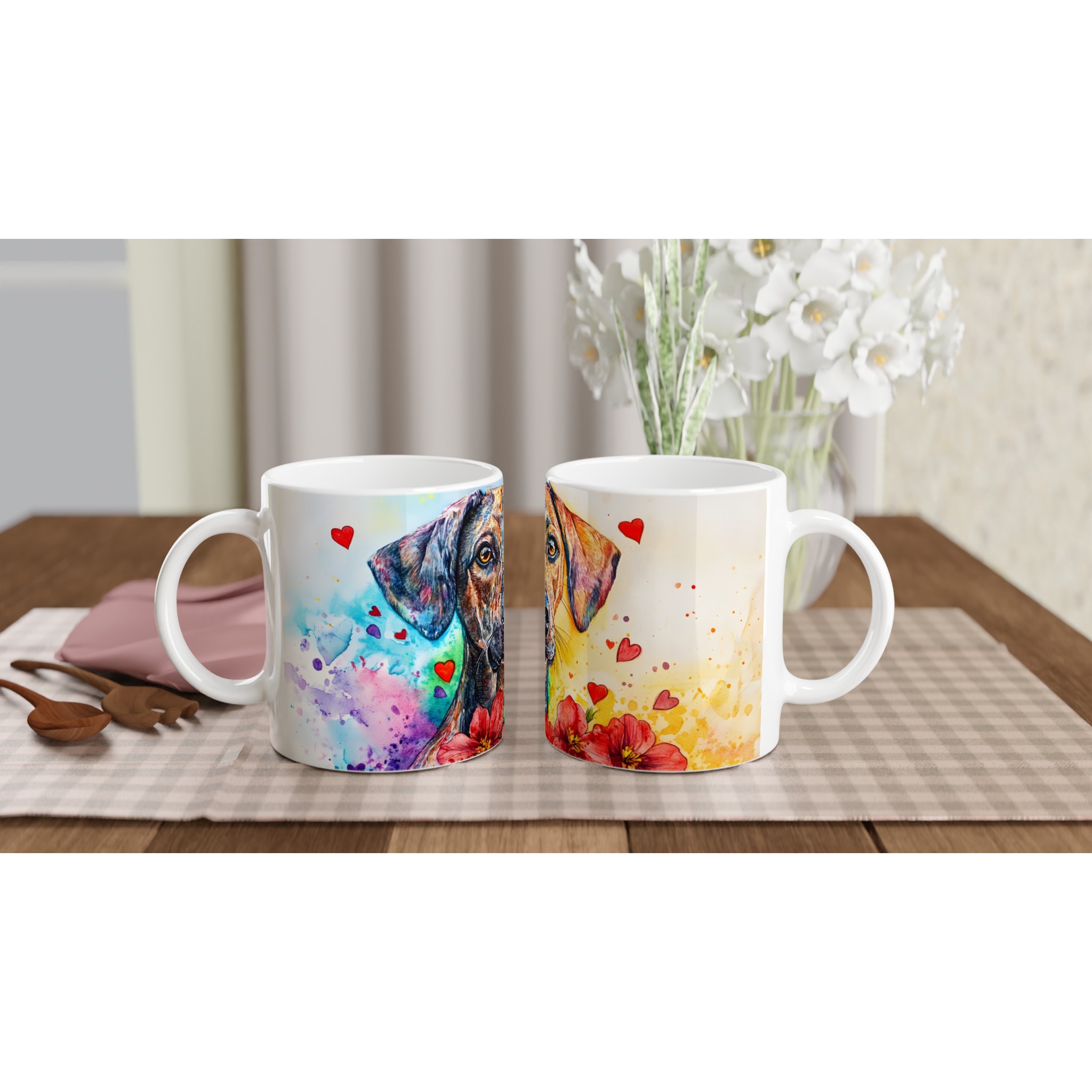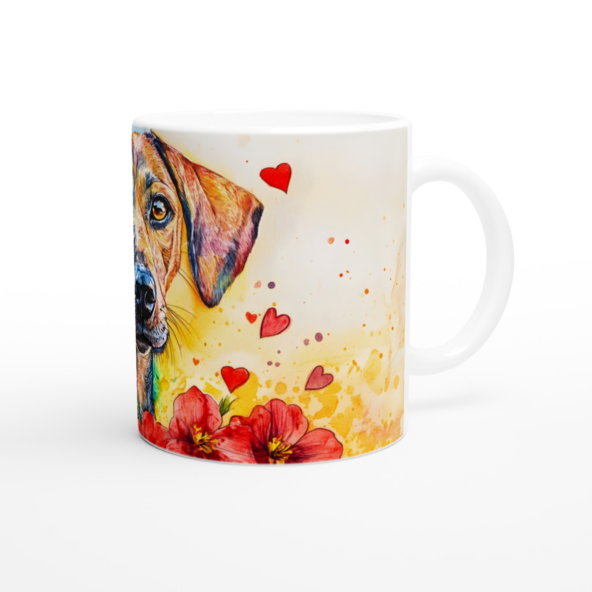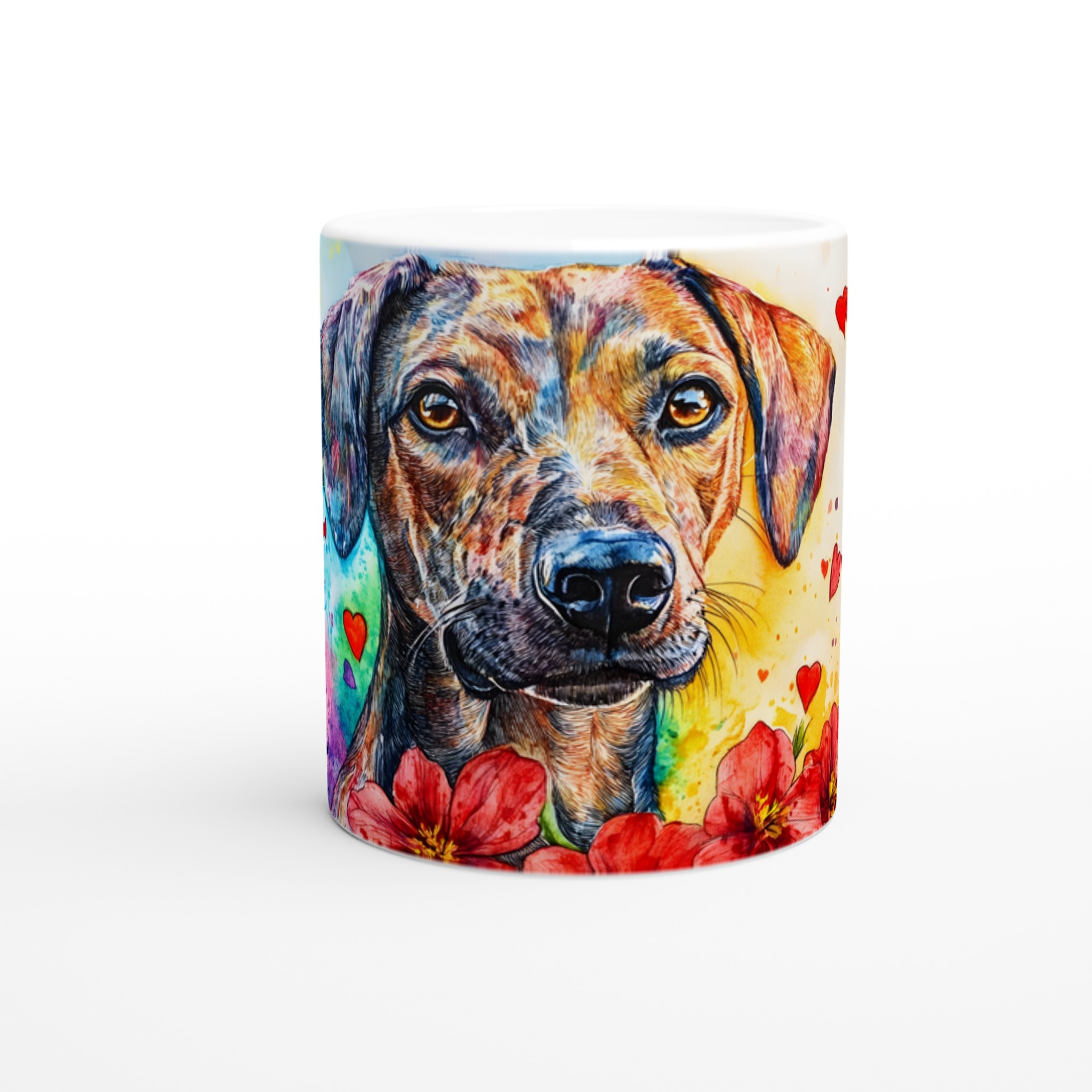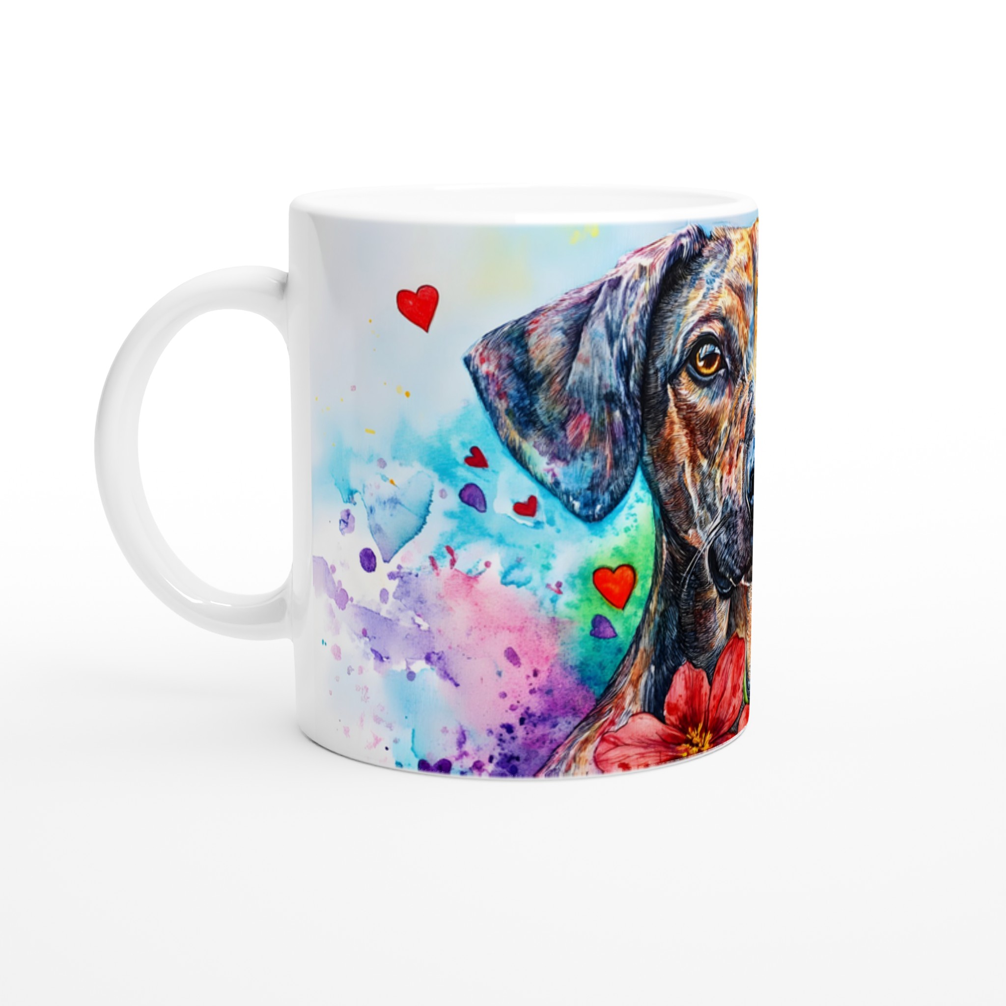 Lyft din fikastund med denna hjärtevärmande keramikmugg, prydd med en färgsprakande vattenfärgshund! Varje detalj, från hundens uttrycksfulla ögon till de levande färgerna och lekfulla hjärtana, fångar glädjen och kärleken till våra fyrbenta vänner. Denna konstnärliga mugg är perfekt för alla dagens stunder – morgonkaffet, en värmande kopp te eller en härlig varm choklad. Den blanka vita ytan gör att trycken framträder klart och färgstarkt, vilket gör muggen till en riktig favorit i vardagen.