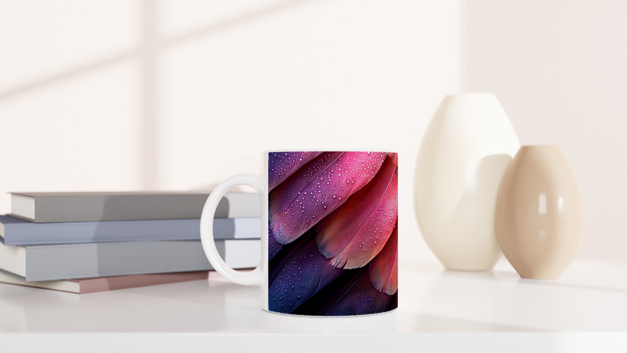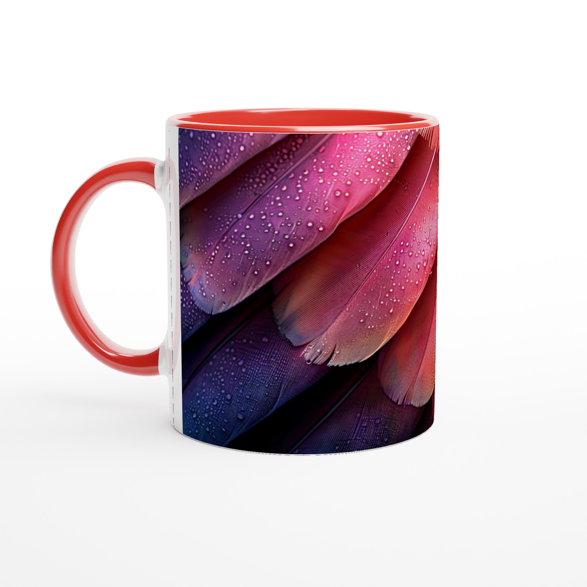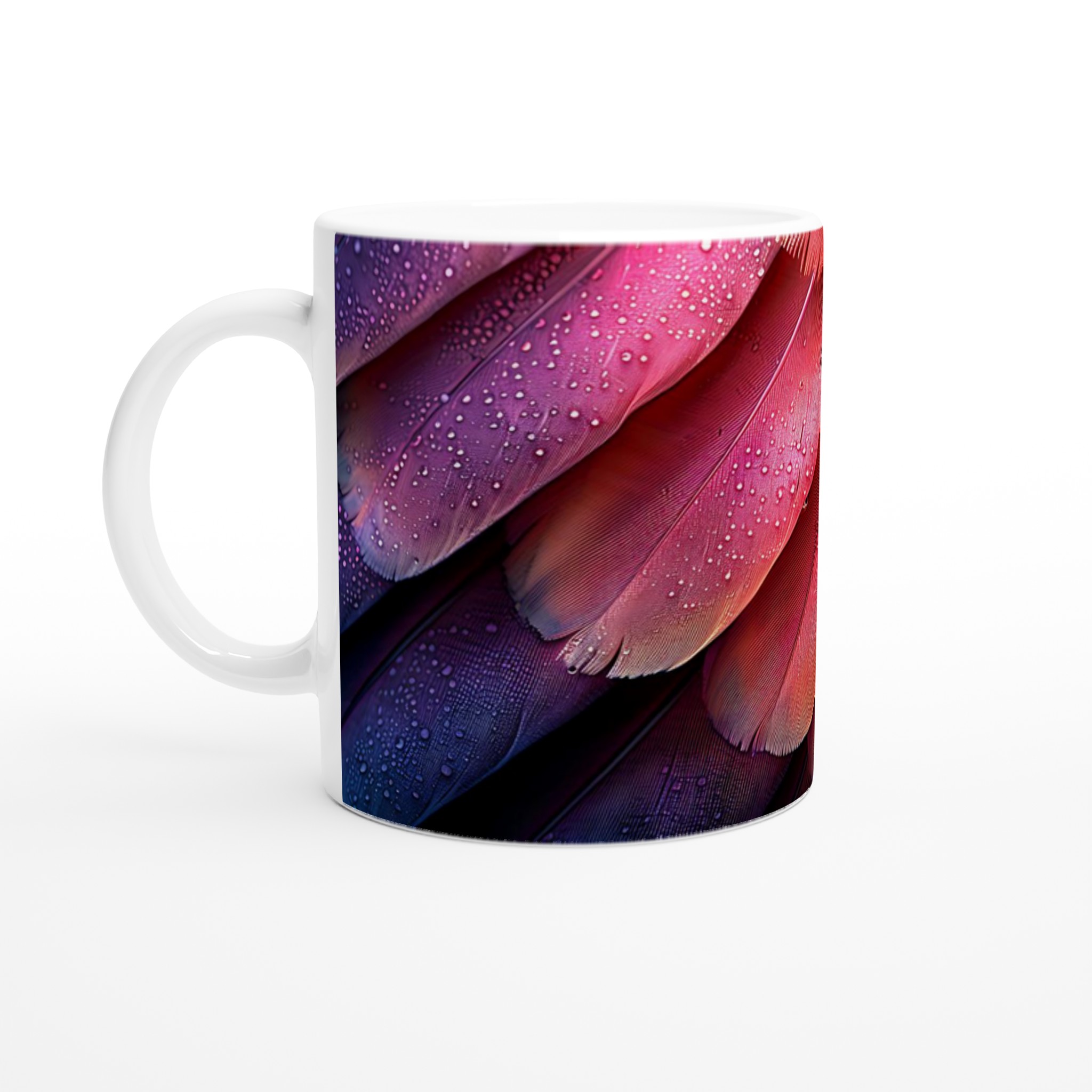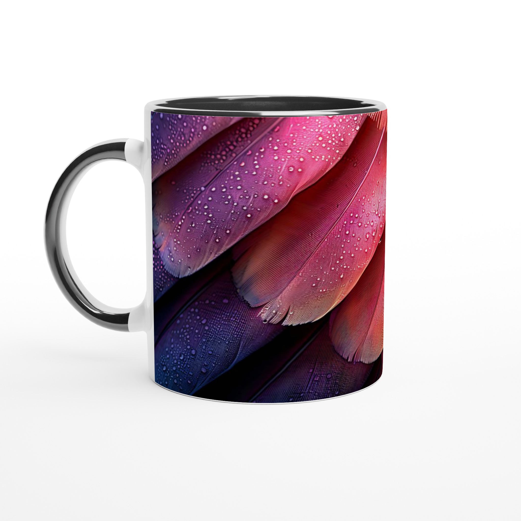 Låt dig förtrollas av denna keramikmugg, inspirerad av fjäderns eteriska skönhet och en drömsk färgpalett som sträcker sig från djupt lila till glödande orange-rött. Den här stilrena muggen blir snabbt en vardagsfavorit, perfekt för morgonkaffet, kvällens varma choklad eller när du bara vill njuta av en kopp te. Den blanka ytan gör att trycken framhävs med klara och levande färger, som håller sig fina även efter många turer i mikron och diskmaskinen.