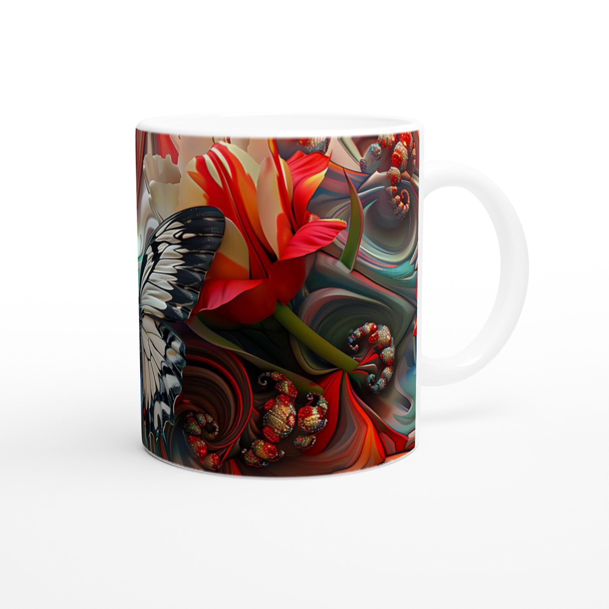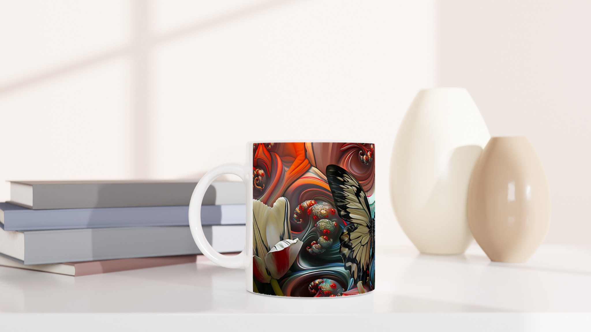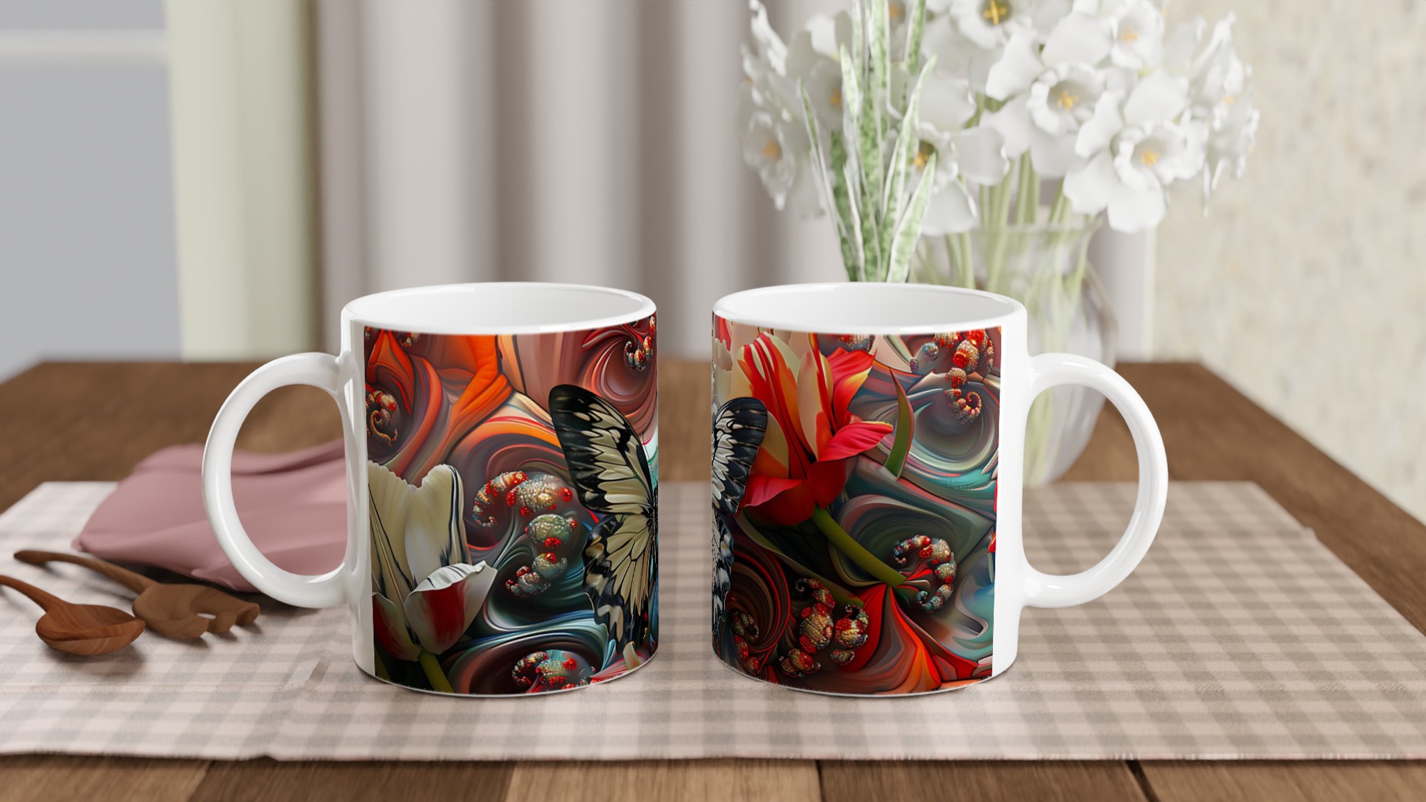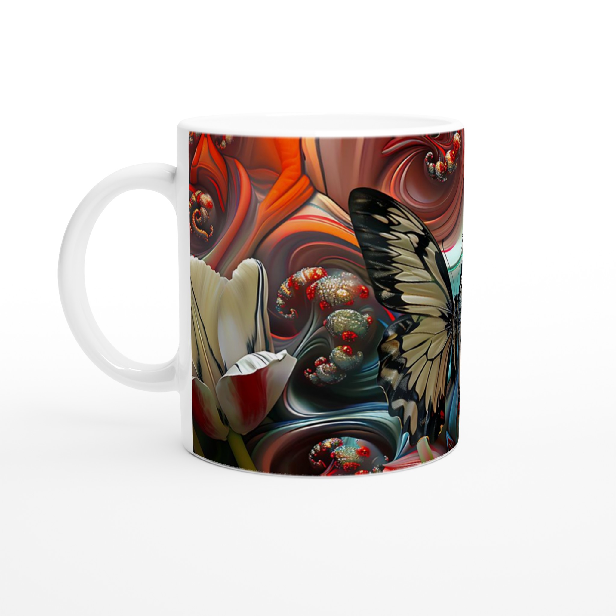 Låt din vardag blomstra med denna fantastiska keramiska mugg, som fångar den livfulla energin av en fjäril mitt i ett abstrakt vårblomster. Den rika färgpaletten och de flytande formerna skapar en känsla av rörelse och glädje, perfekt för att starta dagen med en explosion av kreativitet. Det är den ultimata vardagsfavoriten, perfekt för morgonkaffet, kvällens varma choklad eller när du bara vill njuta av en kopp te. Den blanka ytan lyfter fram det konstnärliga trycket med otroligt klara och levande färger, som håller sig fina även efter många turer i mikron och diskmaskinen.