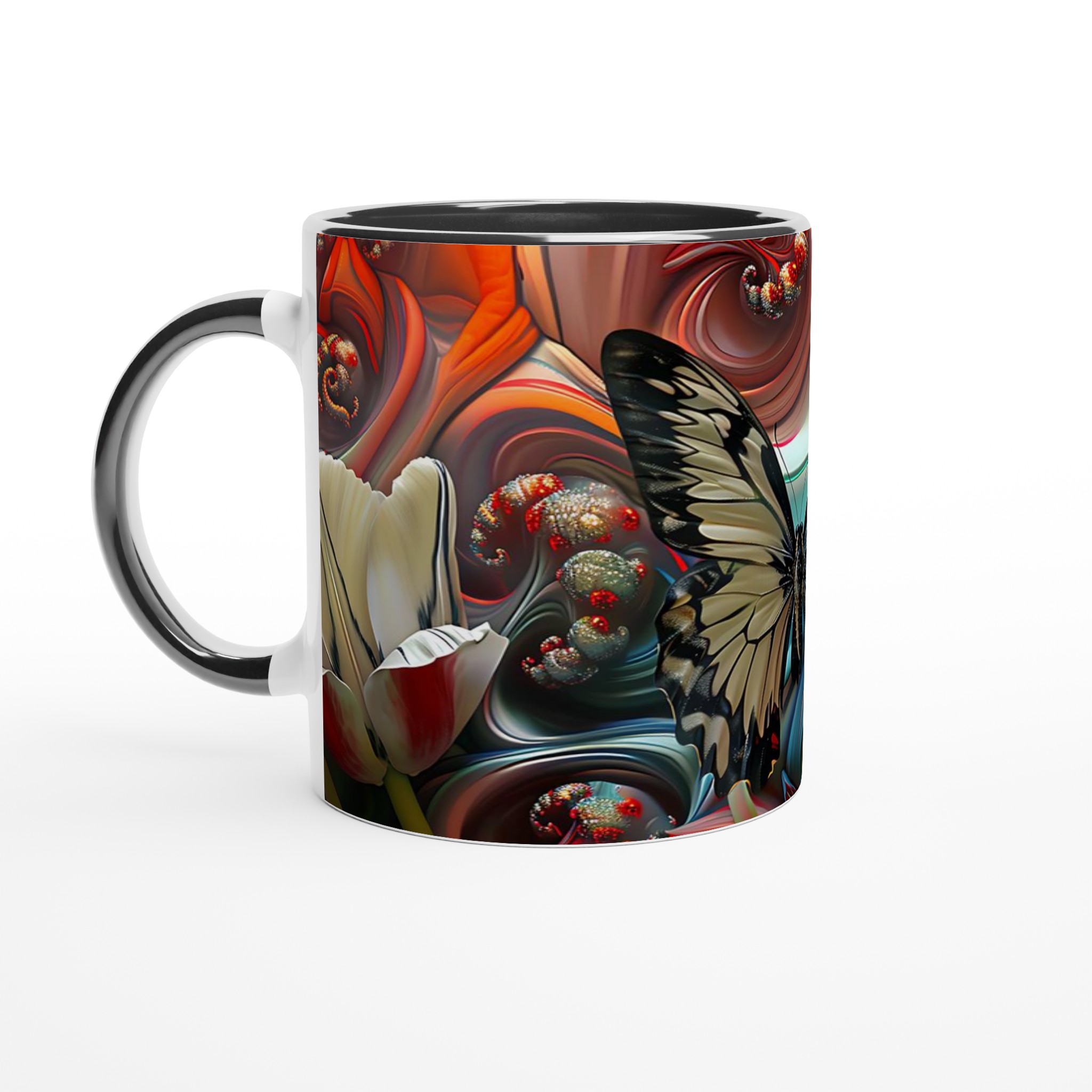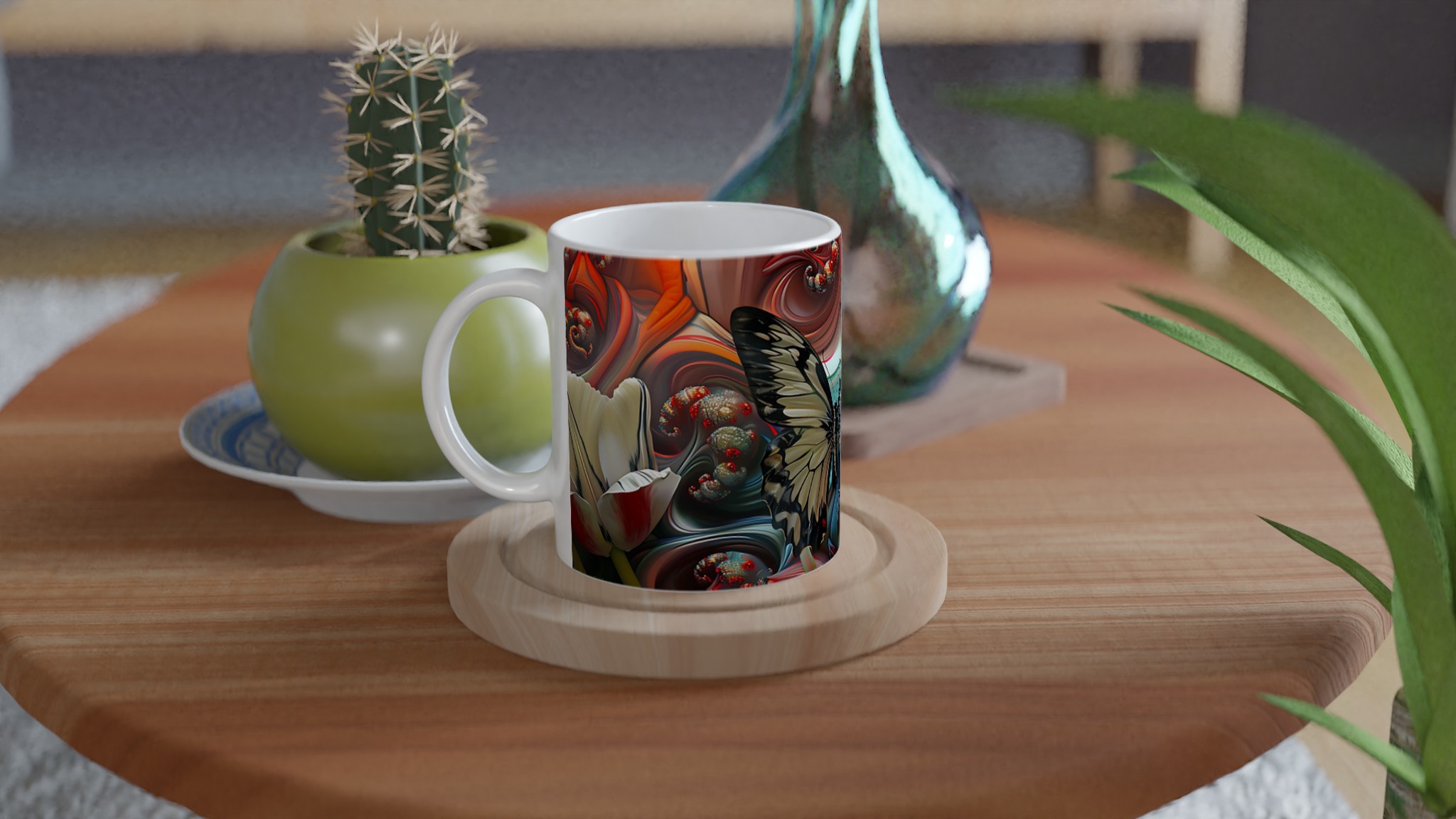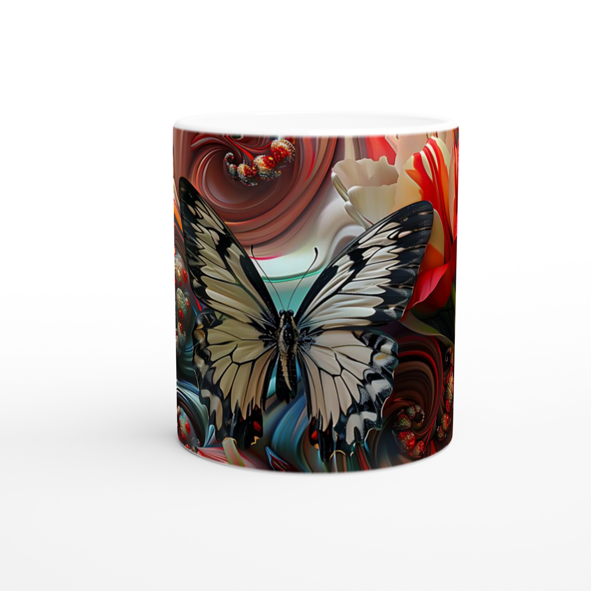 Låt din vardag blomstra med denna fantastiska keramiska mugg, som fångar den livfulla energin av en fjäril mitt i ett abstrakt vårblomster. Den rika färgpaletten och de flytande formerna skapar en känsla av rörelse och glädje, perfekt för att starta dagen med en explosion av kreativitet. Det är den ultimata vardagsfavoriten, perfekt för morgonkaffet, kvällens varma choklad eller när du bara vill njuta av en kopp te. Den blanka ytan lyfter fram det konstnärliga trycket med otroligt klara och levande färger, som håller sig fina även efter många turer i mikron och diskmaskinen.