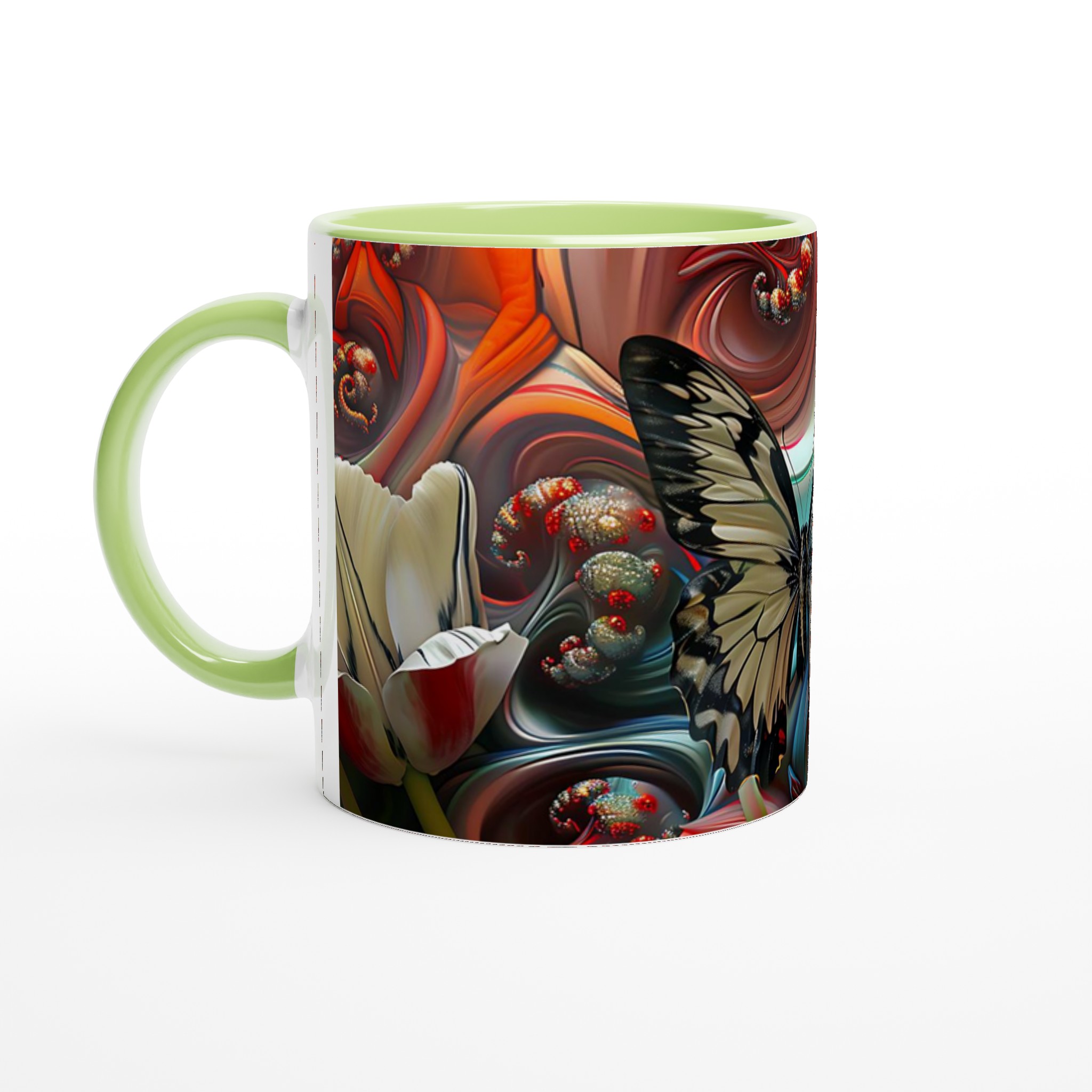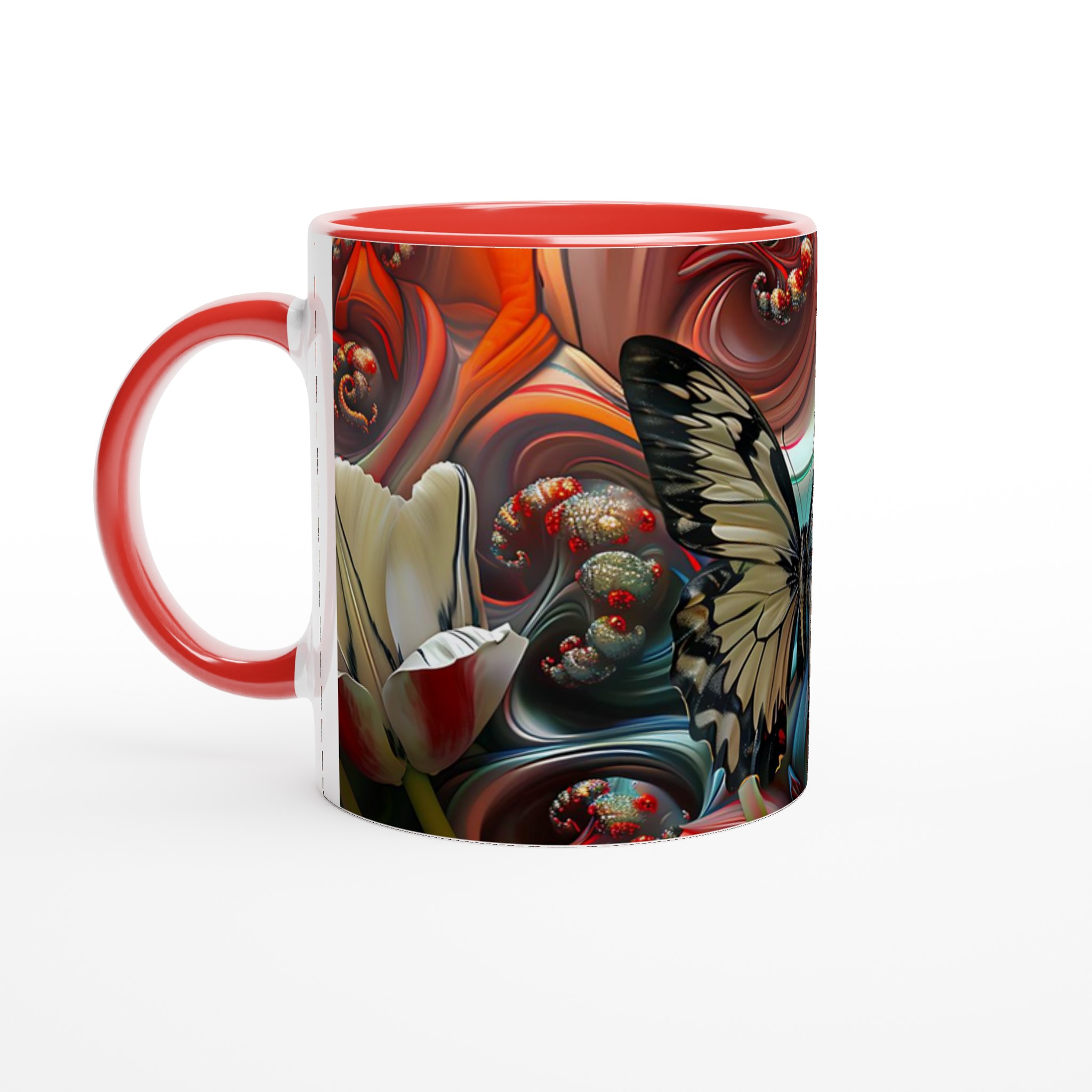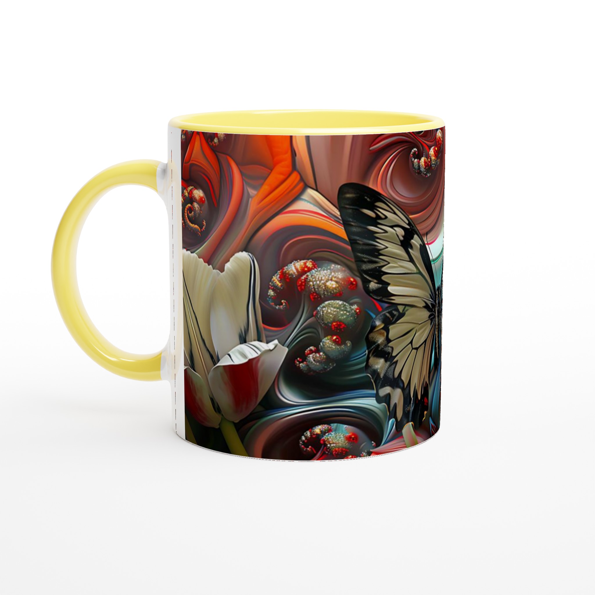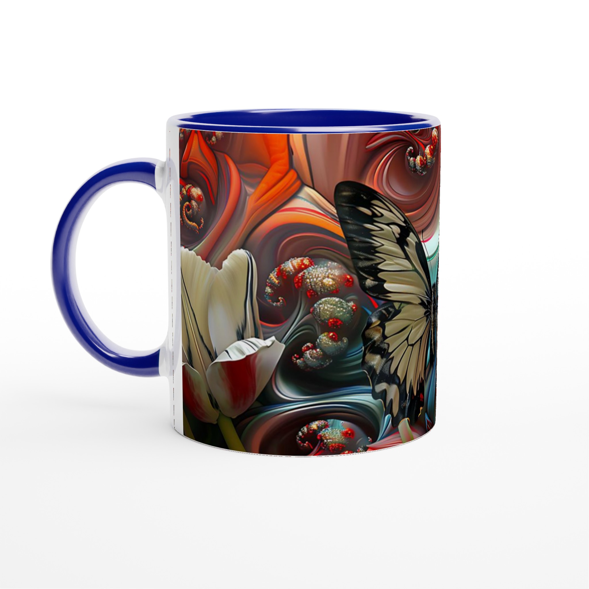 Låt din vardag blomstra med denna fantastiska keramiska mugg, som fångar den livfulla energin av en fjäril mitt i ett abstrakt vårblomster. Den rika färgpaletten och de flytande formerna skapar en känsla av rörelse och glädje, perfekt för att starta dagen med en explosion av kreativitet. Det är den ultimata vardagsfavoriten, perfekt för morgonkaffet, kvällens varma choklad eller när du bara vill njuta av en kopp te. Den blanka ytan lyfter fram det konstnärliga trycket med otroligt klara och levande färger, som håller sig fina även efter många turer i mikron och diskmaskinen.