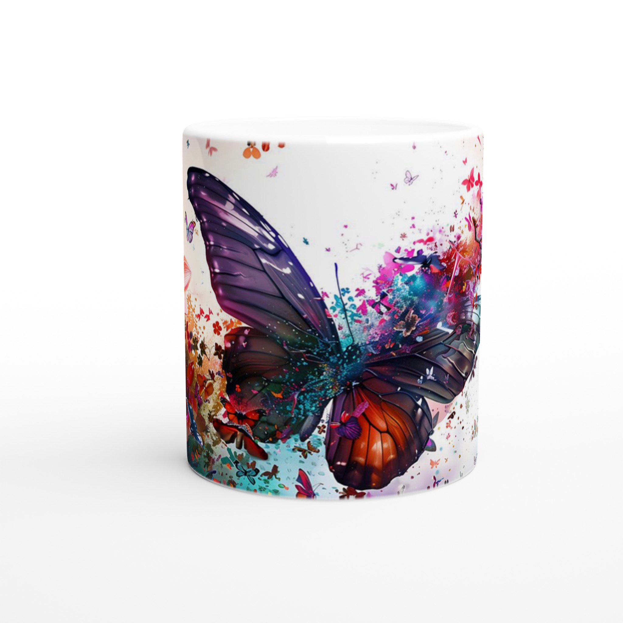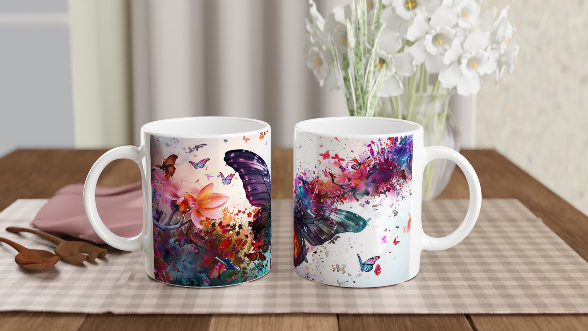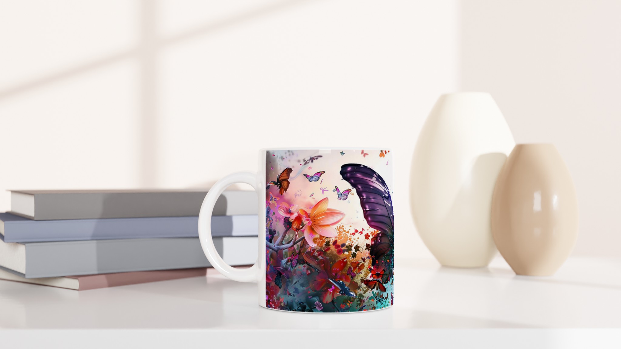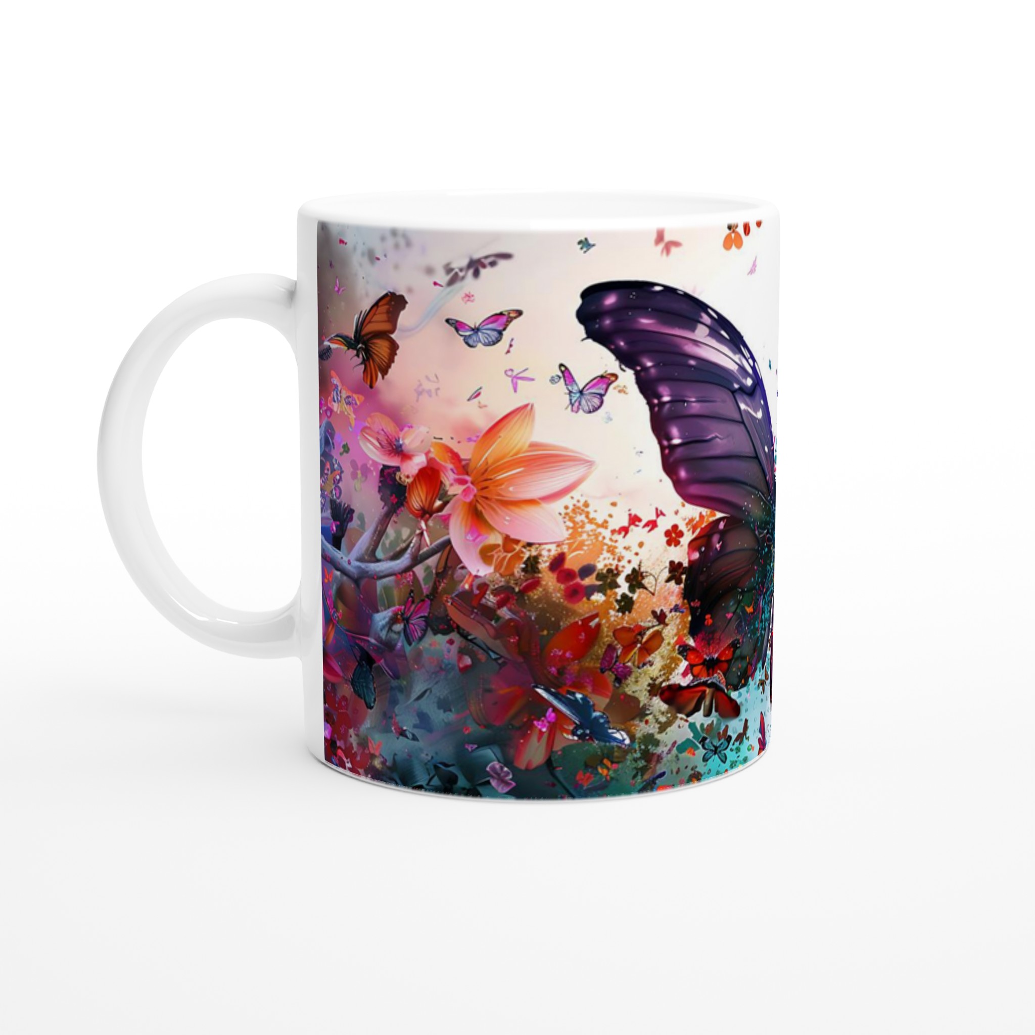 Låt din kaffestund blomstra med denna fantastiska keramiska mugg, prydd med ett explosion av färgglada fjärilar och abstrakta blommor. Varje klunk blir en resa in i en drömlik värld av lila, turkosa och orangea nyanser som dansar på en ljus bakgrund. Det detaljerade konstverket ger en känsla av rörelse och liv, vilket gör denna mugg till mer än bara ett kärl – den är en konstnärlig upplevelse.