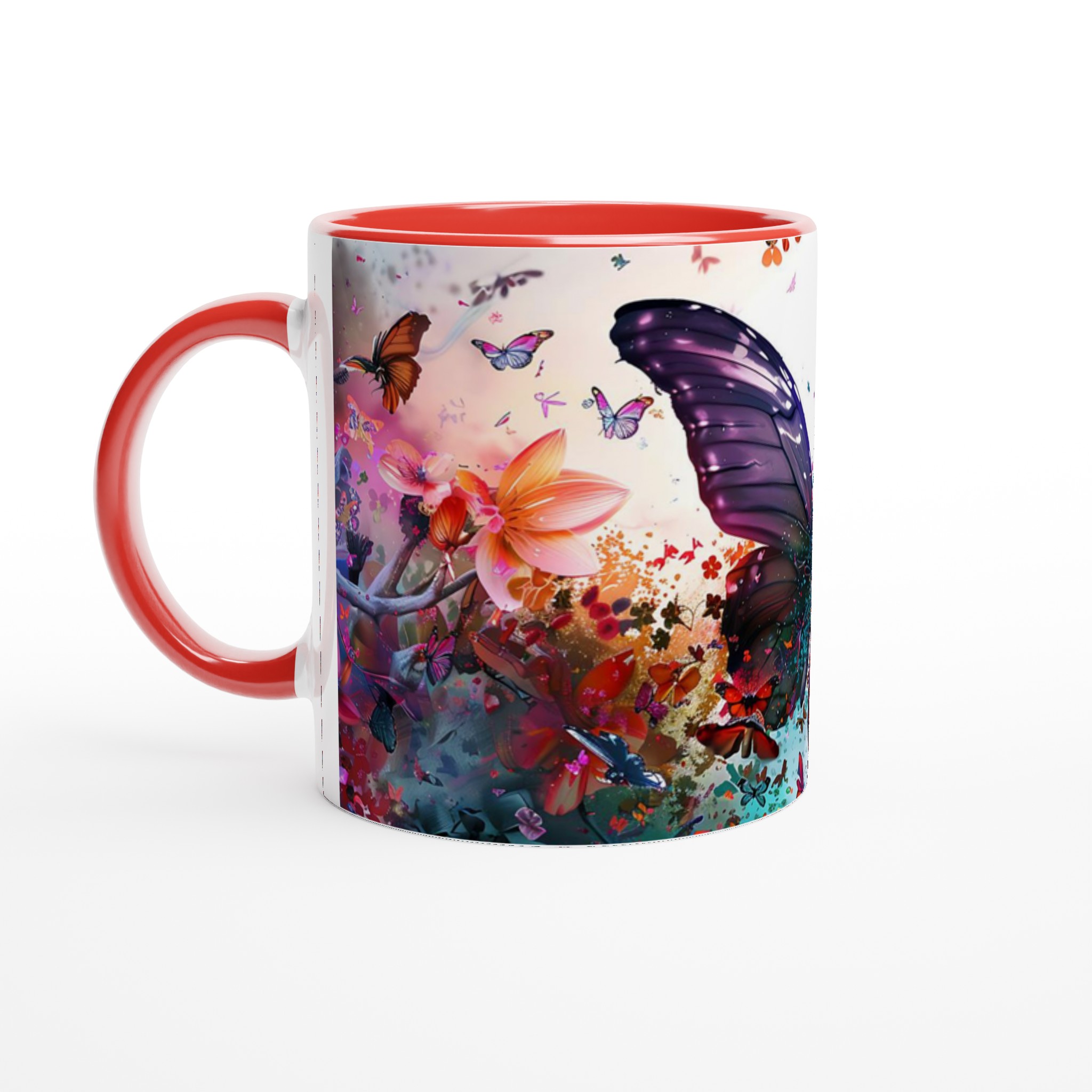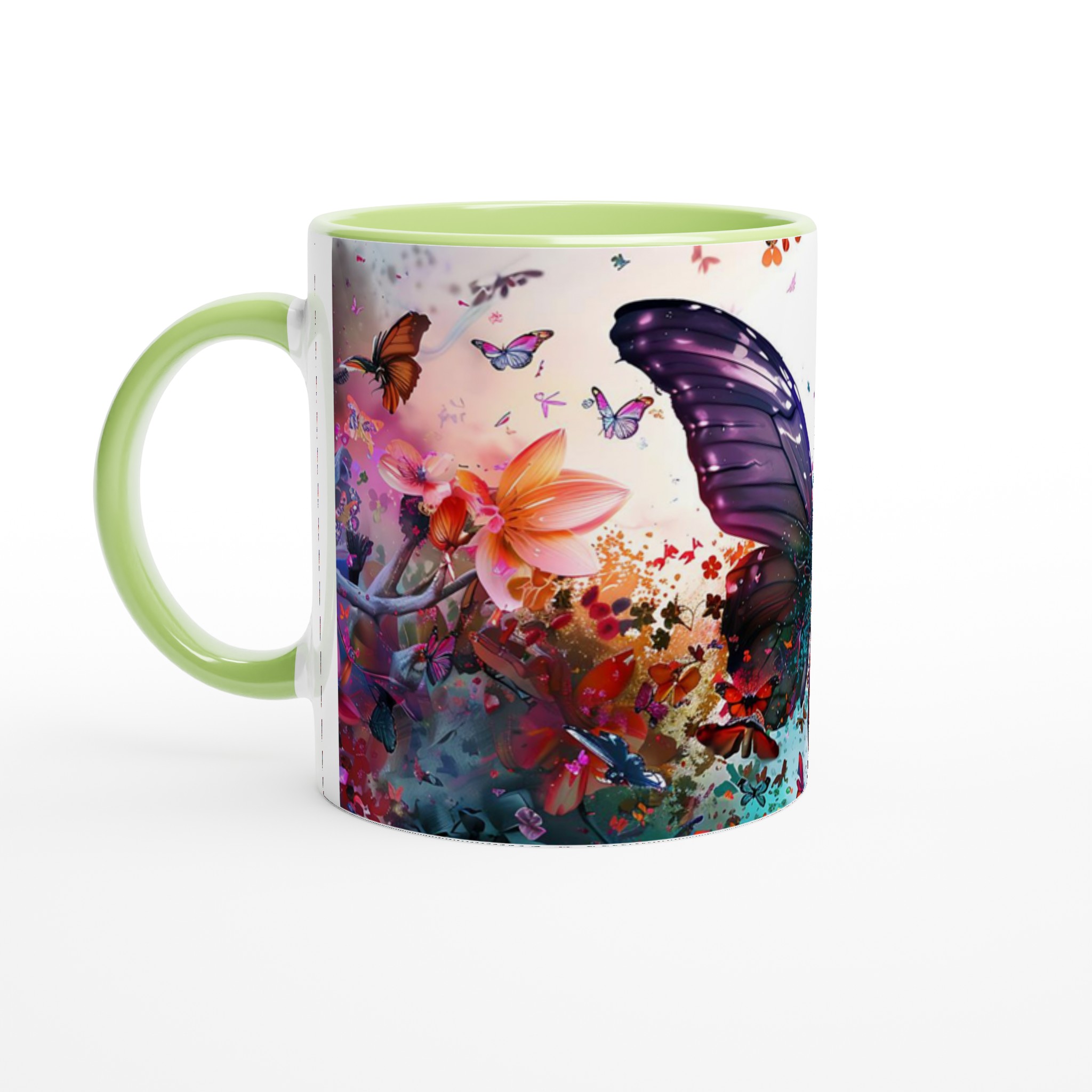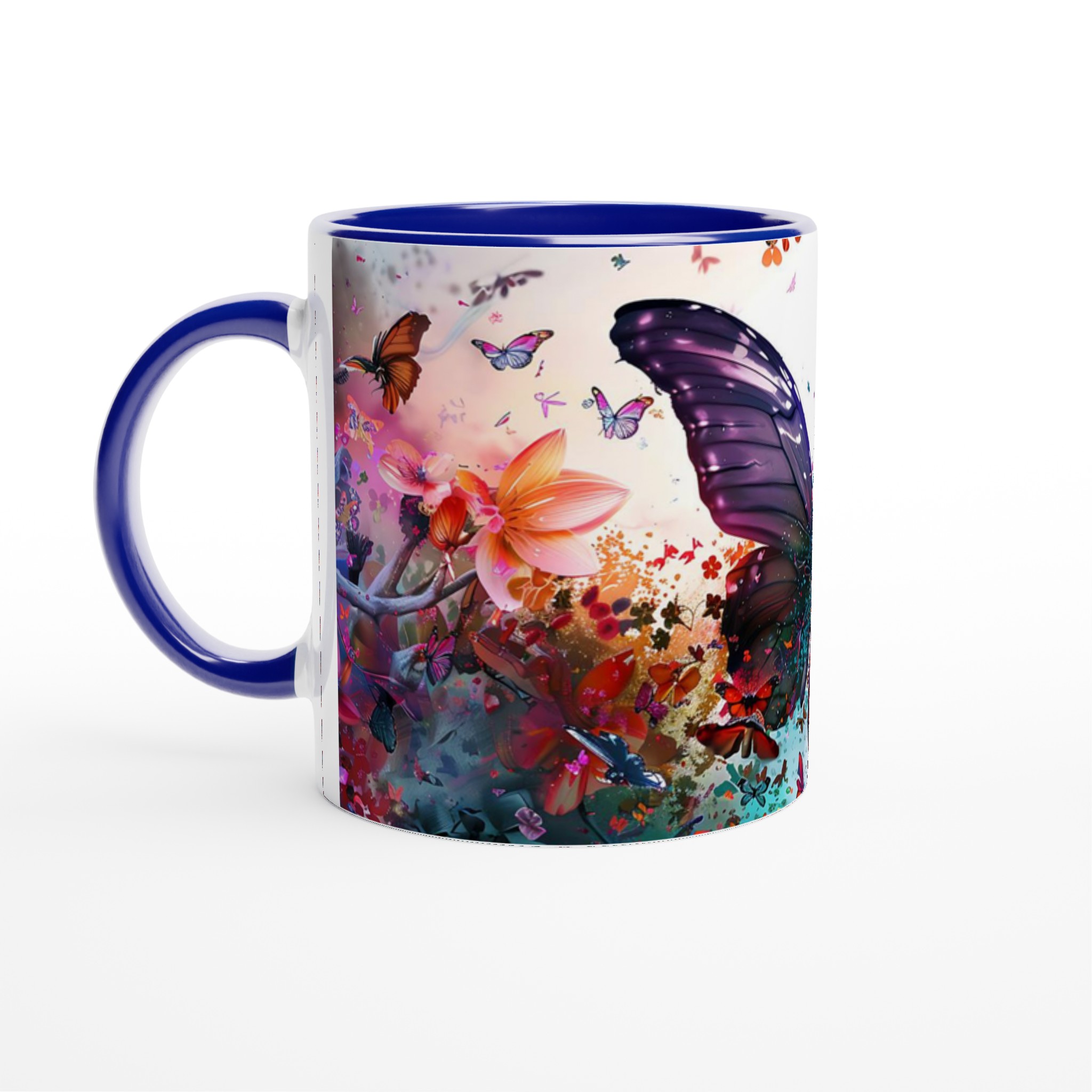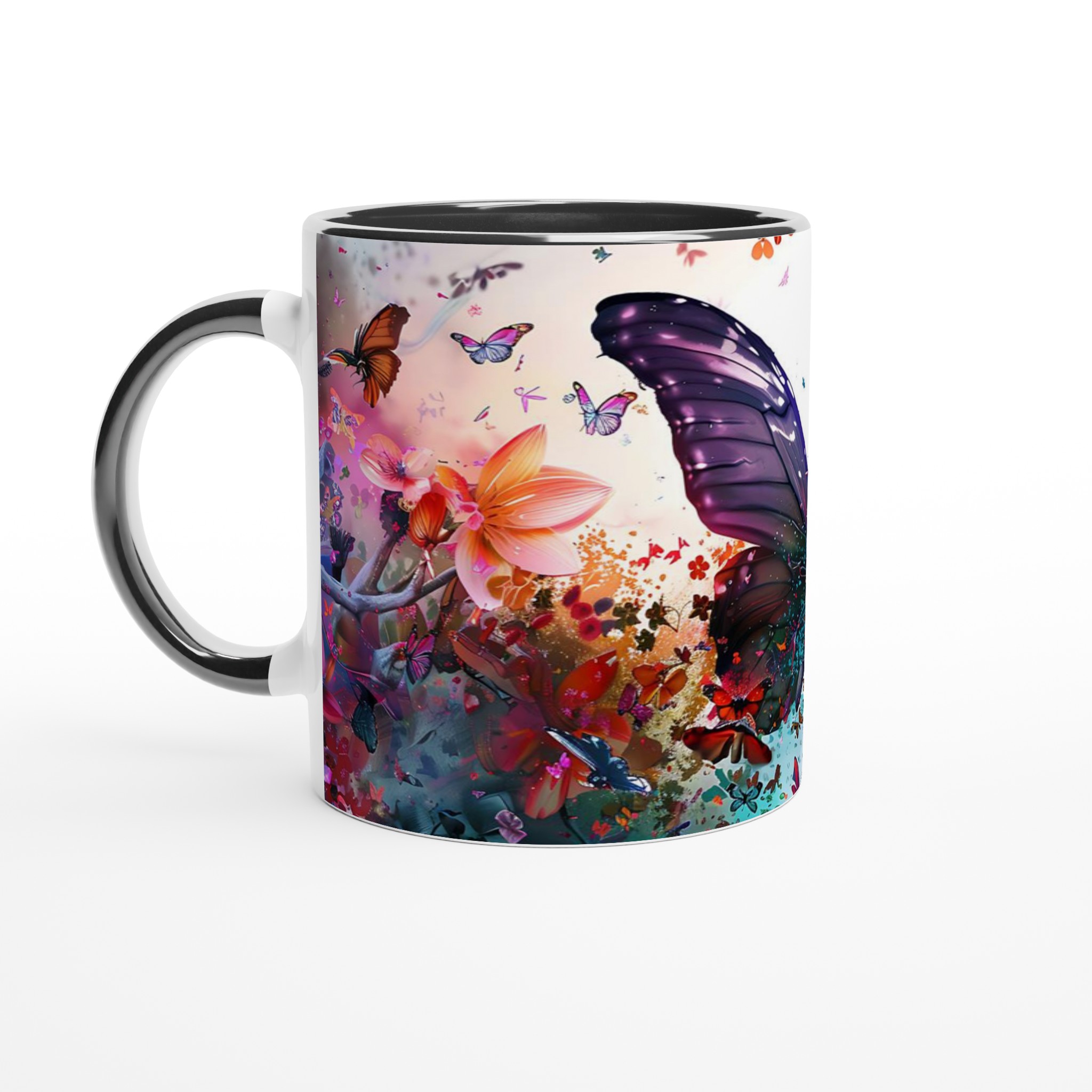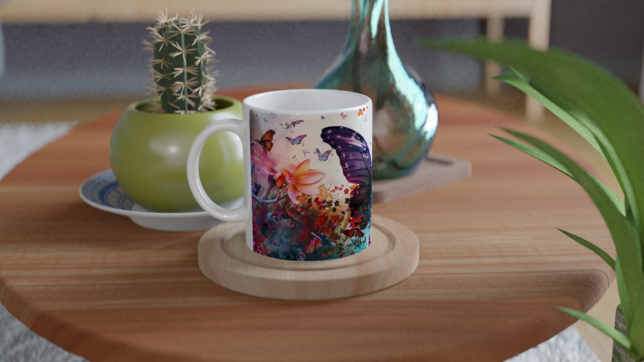 Låt din kaffestund blomstra med denna fantastiska keramiska mugg, prydd med ett explosion av färgglada fjärilar och abstrakta blommor. Varje klunk blir en resa in i en drömlik värld av lila, turkosa och orangea nyanser som dansar på en ljus bakgrund. Det detaljerade konstverket ger en känsla av rörelse och liv, vilket gör denna mugg till mer än bara ett kärl – den är en konstnärlig upplevelse.