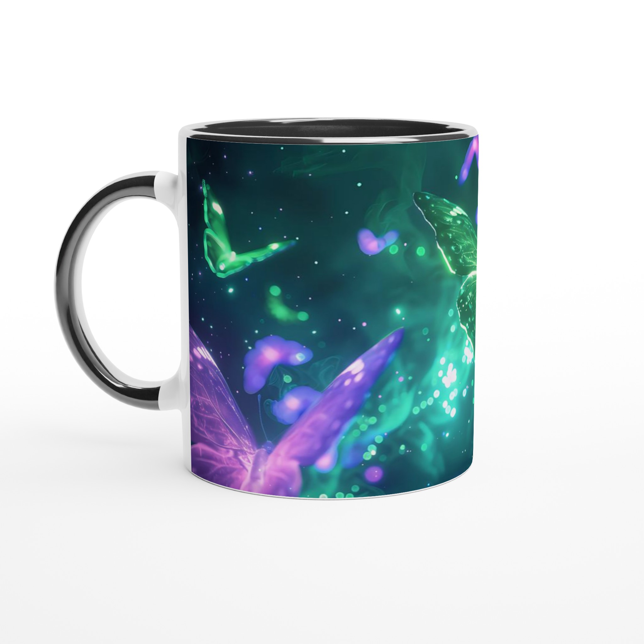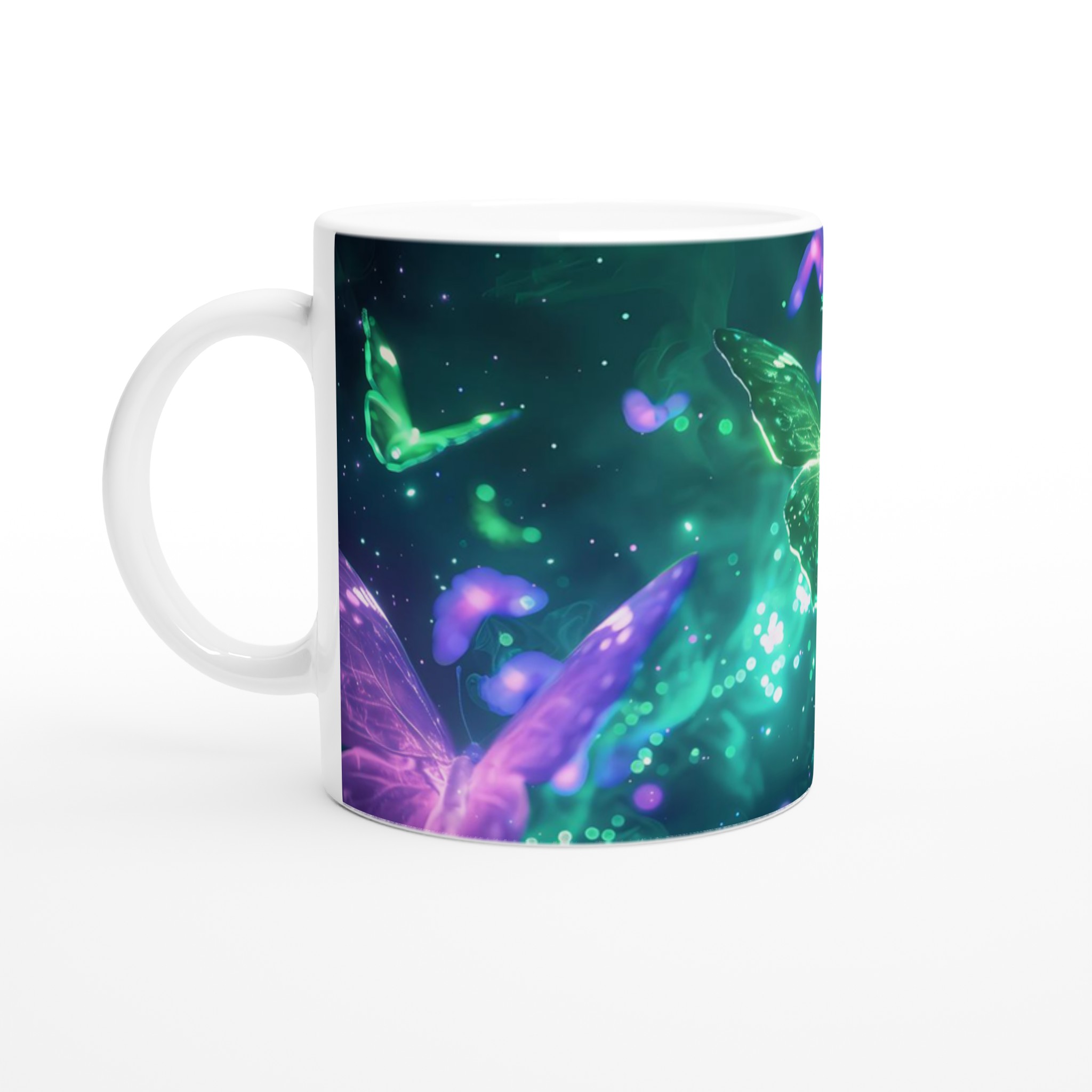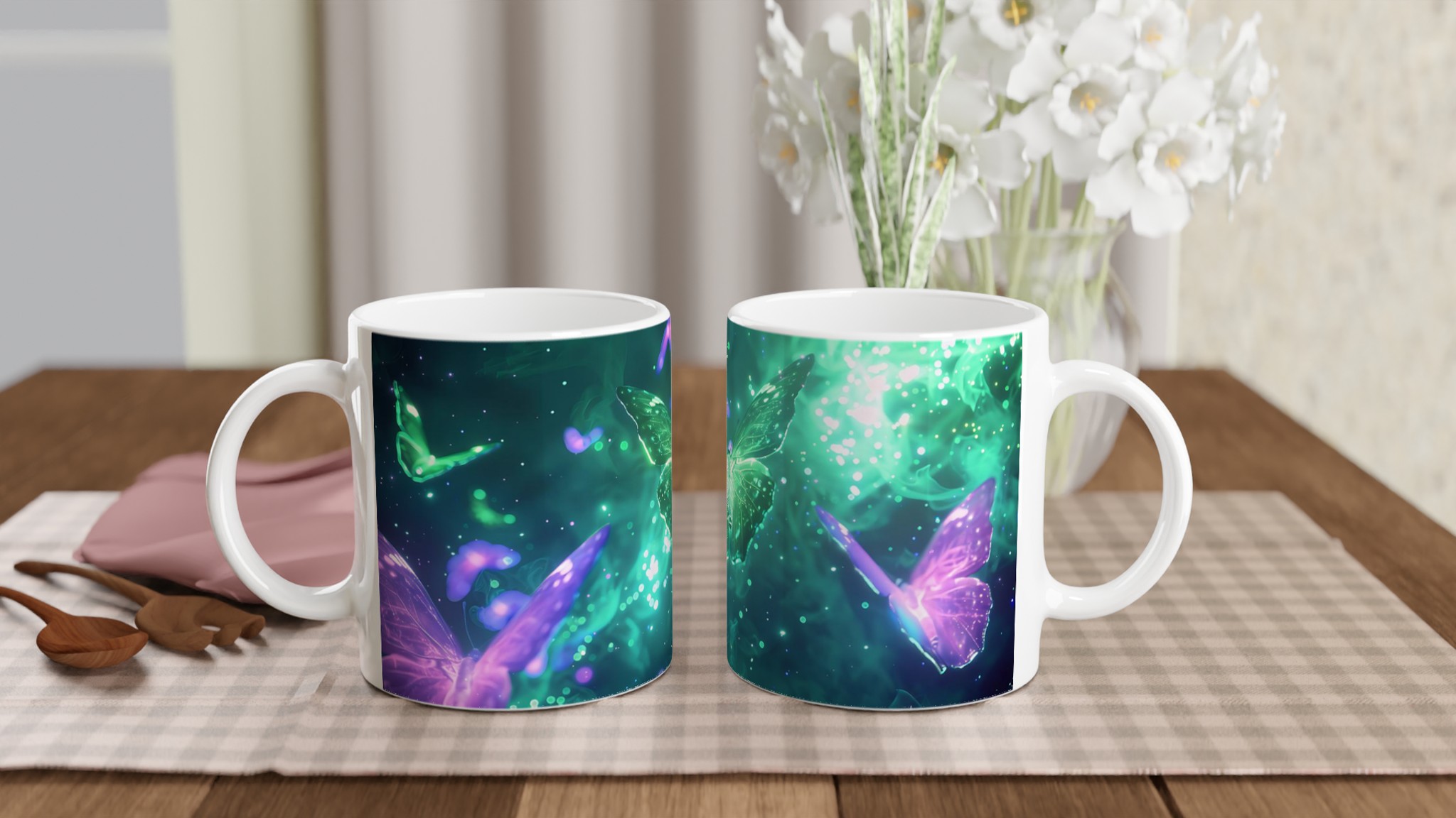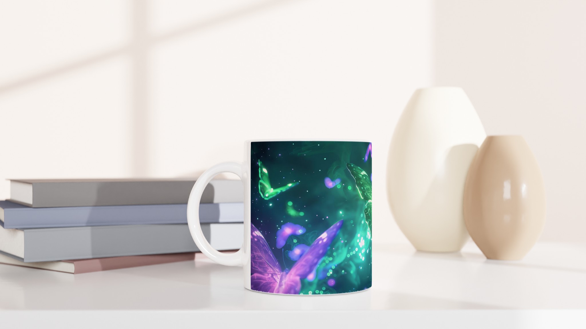 Stig in i en drömlik värld varje gång du tar en klunk med vår Keramiska Mugg – Fjärilarnas Magiska Värld. Med ett motiv som fångar den eteriska skönheten hos lysande fjärilar i en glödande fantasimiljö, förvandlar denna mugg varje fikastund till en magisk upplevelse. De vibrerande nyanserna av turkos och lila, förstärkta av skimrande ljuspunkter, ger en känsla av lugn och förundran. Den här stilrena keramiska muggen blir snabbt en vardagsfavorit. Perfekt för morgonkaffet, kvällens varma choklad eller när du bara vill njuta av en kopp te.