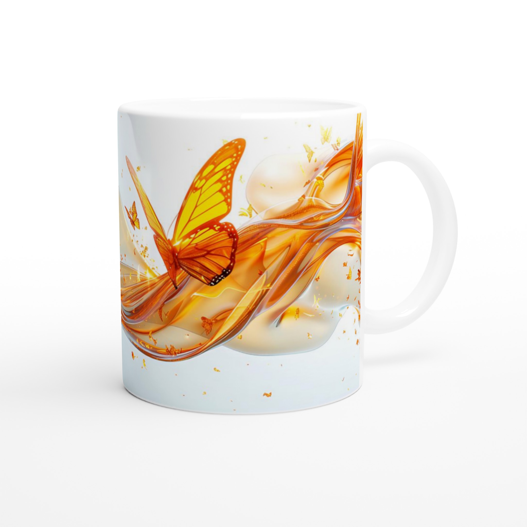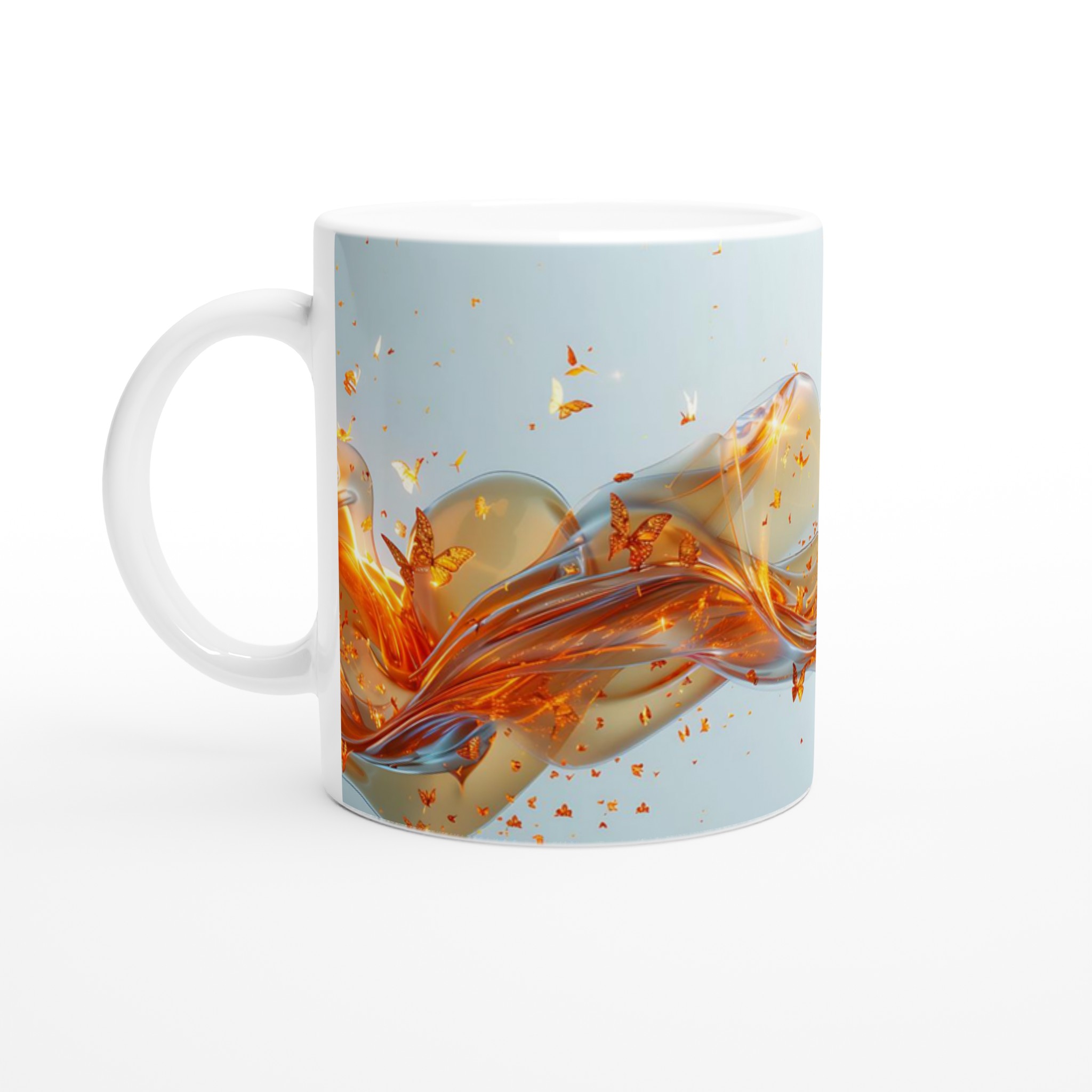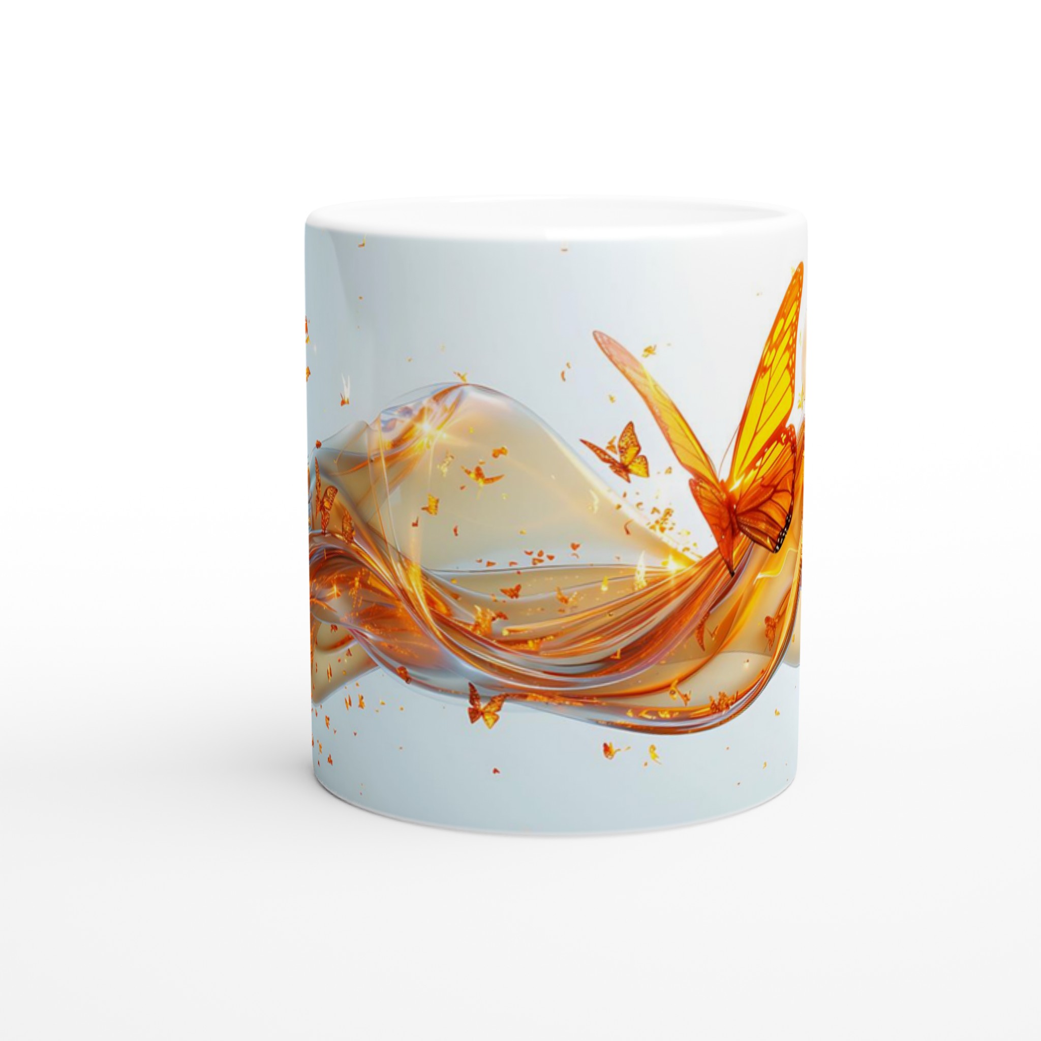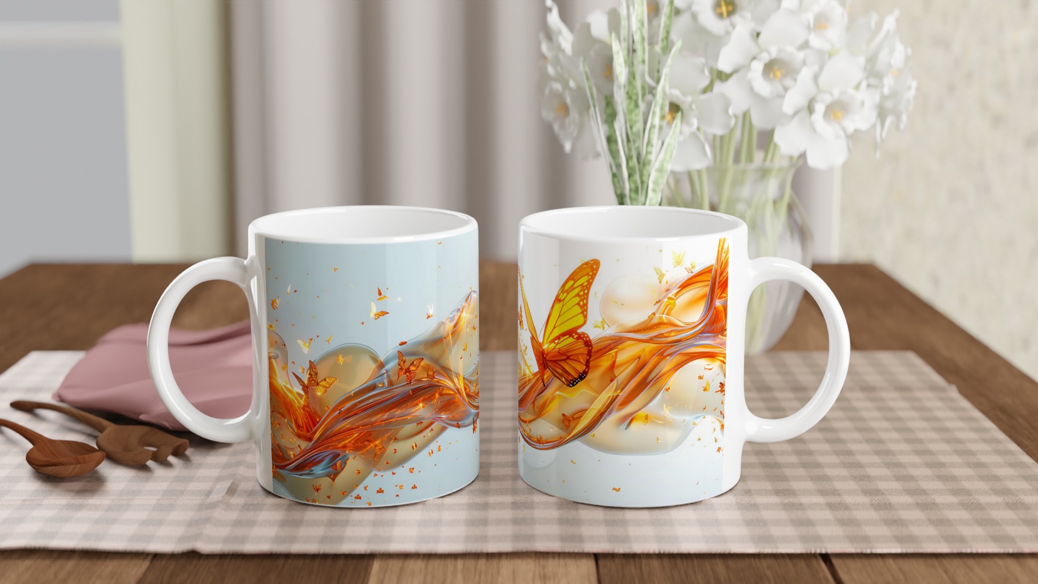Låt dig svepas med av livfullheten från det ögonblick då gyllene fjärilar dansar bland böljande, eteriska band av orange och guld. Den här stilrena keramiska muggen blir snabbt en vardagsfavorit, som för tankarna till soliga dagar och lätthet. Perfekt för morgonkaffet, kvällens varma choklad eller när du bara vill njuta av en kopp te. Den blanka vita ytan gör att trycken framhävs med klara och levande färger, som håller sig fina även efter många turer i mikron och diskmaskinen.