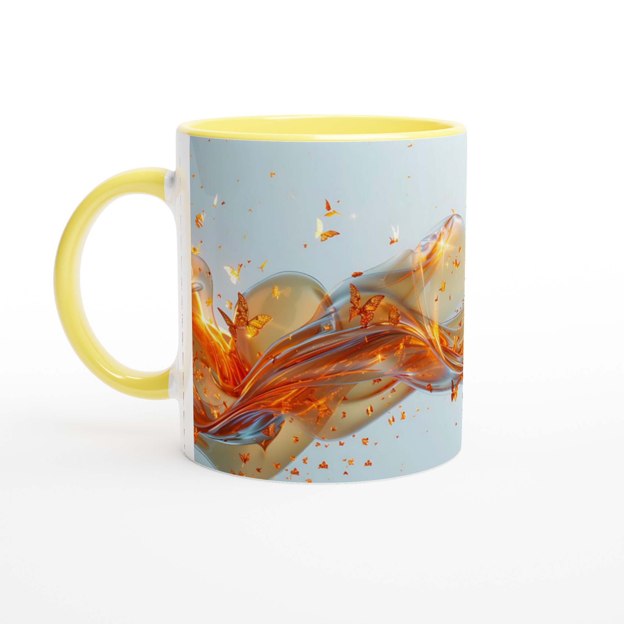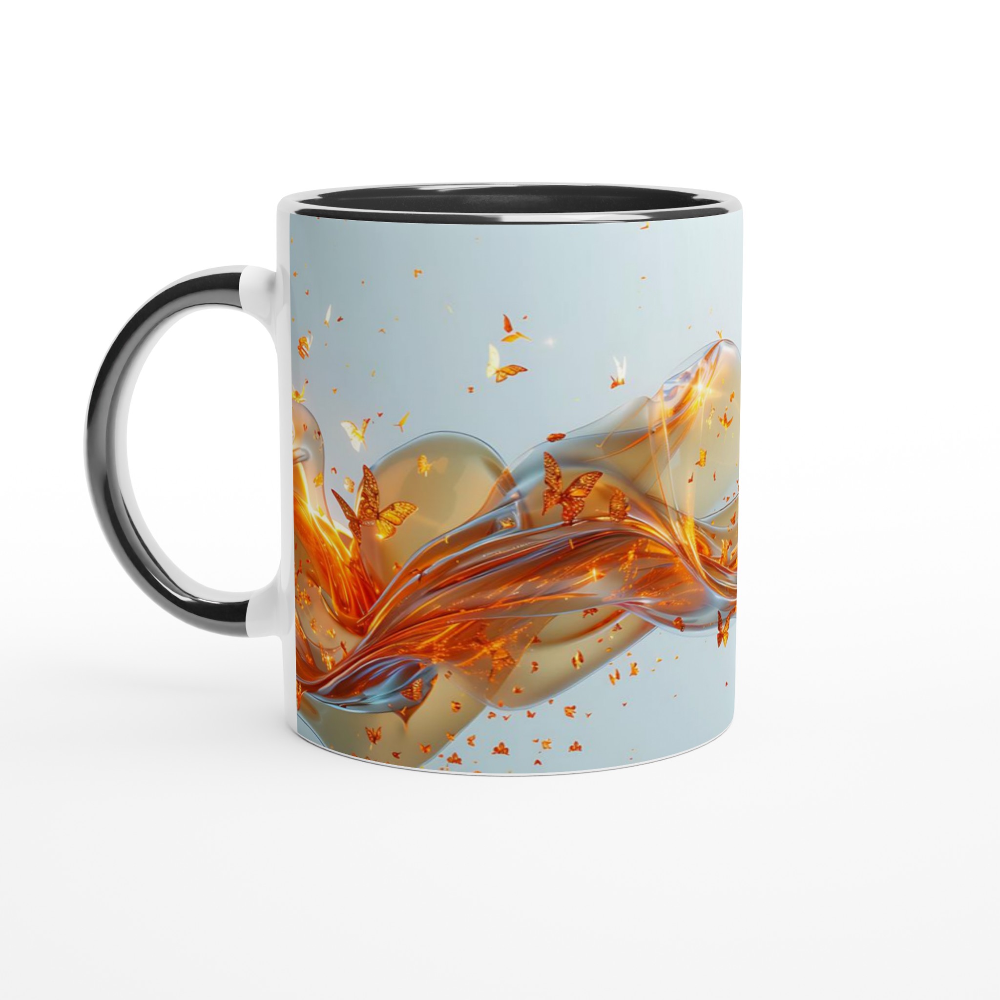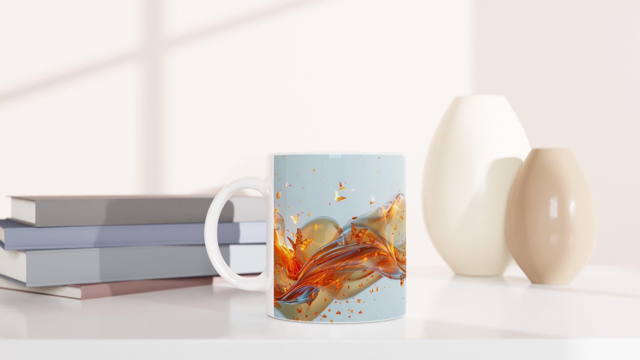 Låt dig svepas med av livfullheten från det ögonblick då gyllene fjärilar dansar bland böljande, eteriska band av orange och guld. Den här stilrena keramiska muggen blir snabbt en vardagsfavorit, som för tankarna till soliga dagar och lätthet. Perfekt för morgonkaffet, kvällens varma choklad eller när du bara vill njuta av en kopp te. Den blanka vita ytan gör att trycken framhävs med klara och levande färger, som håller sig fina även efter många turer i mikron och diskmaskinen.