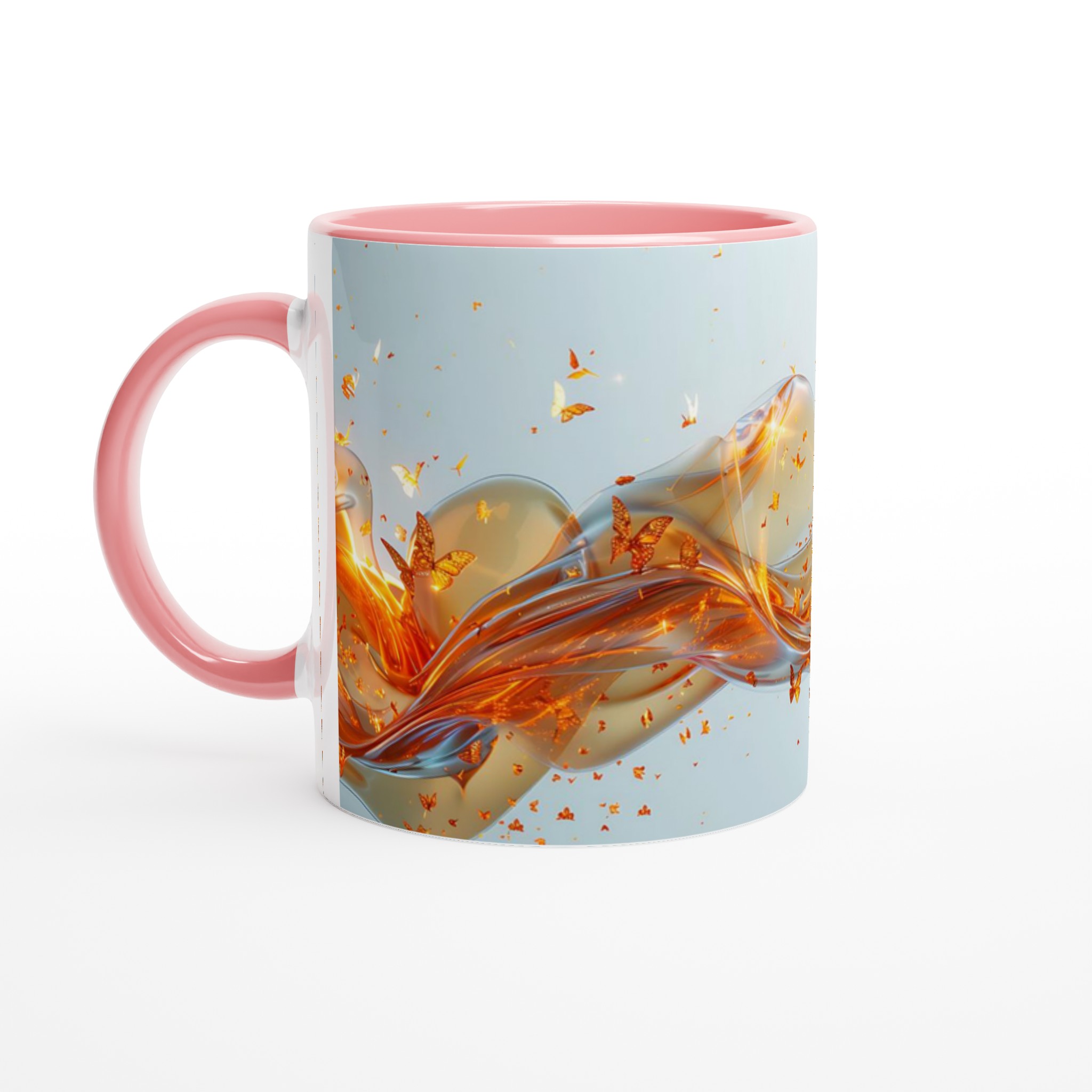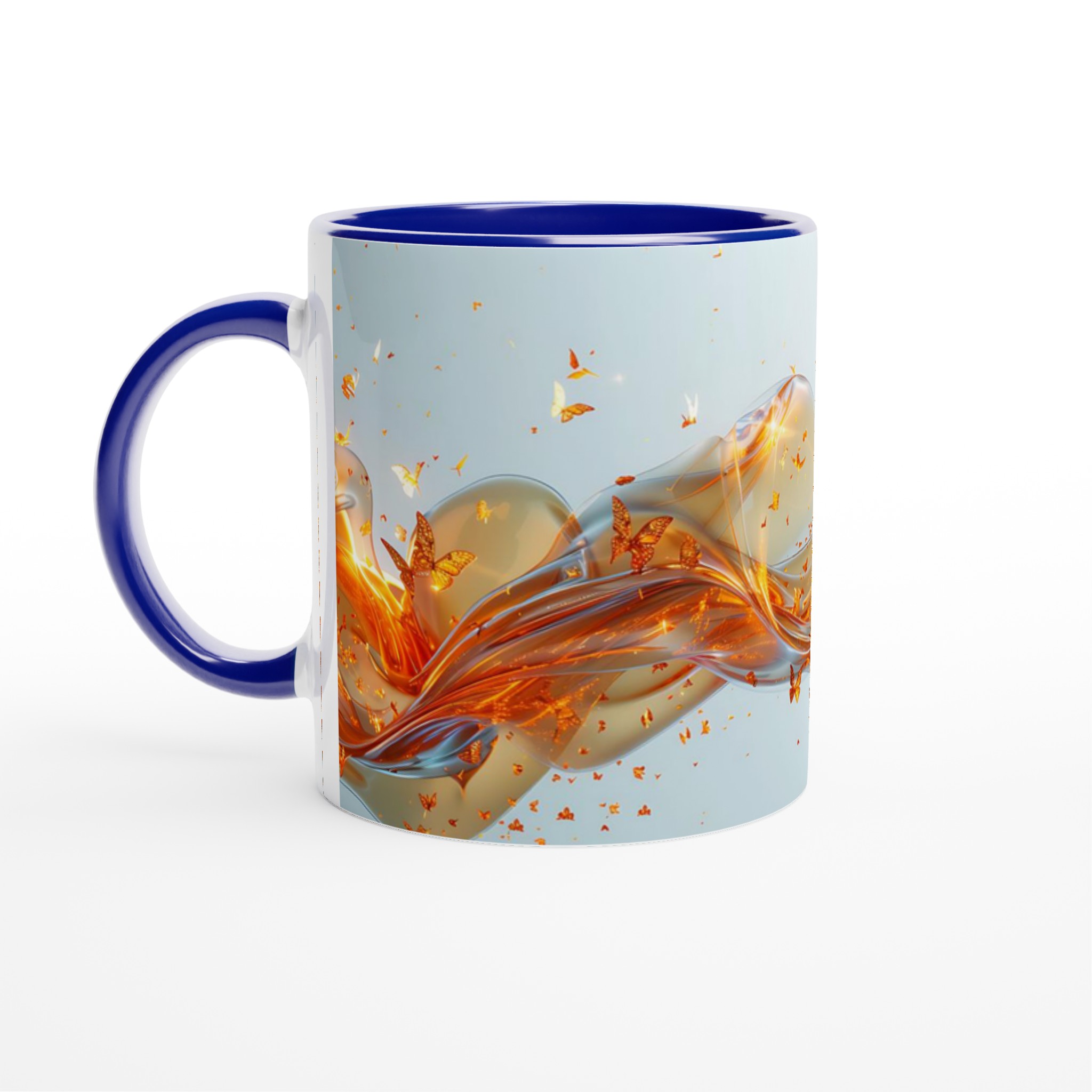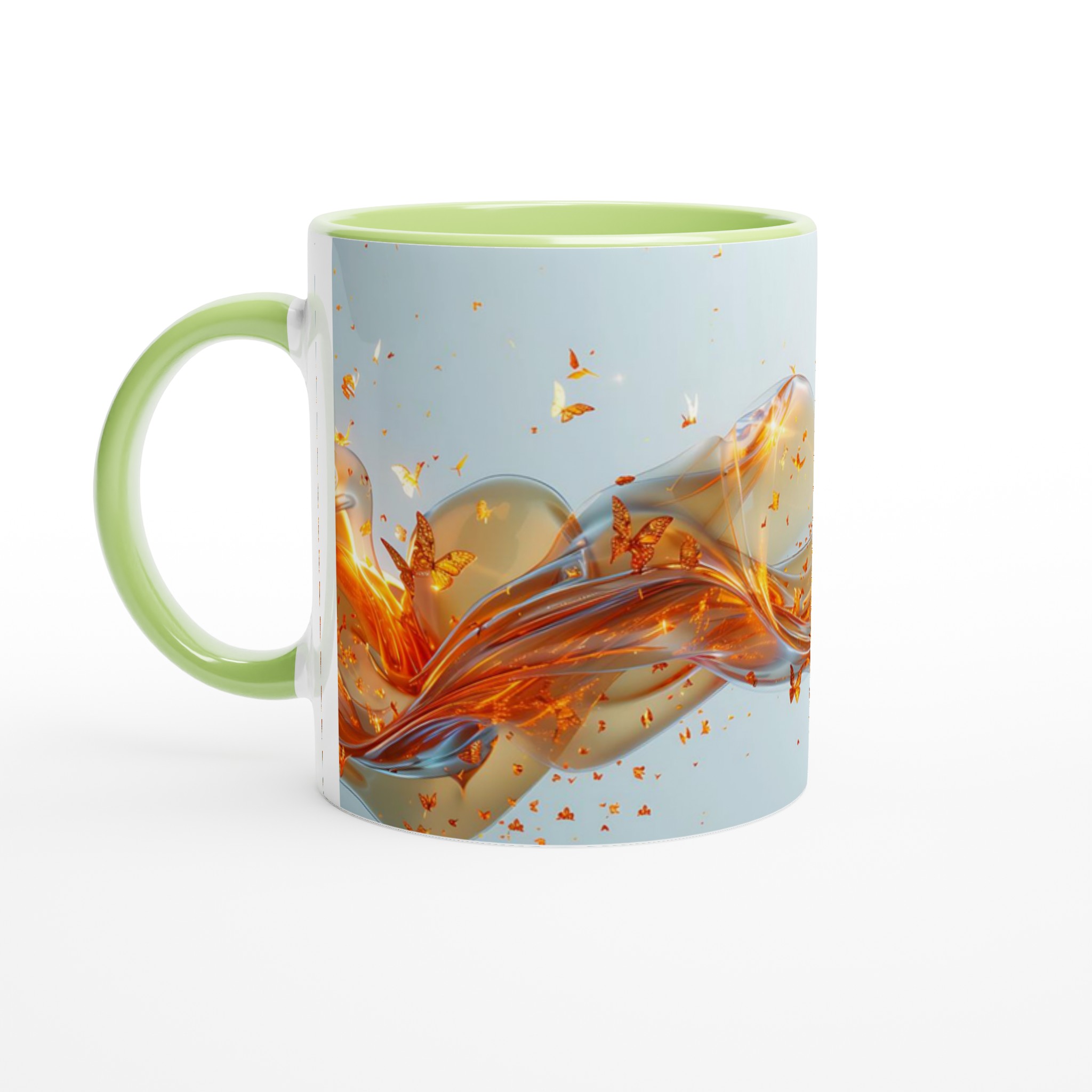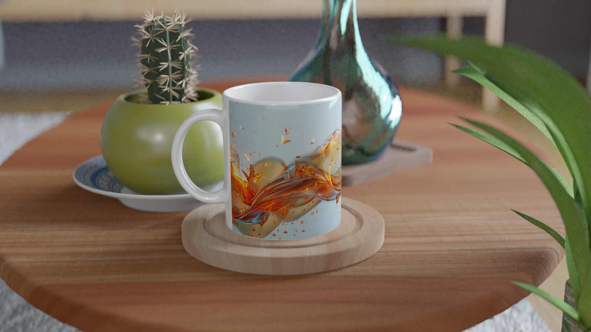 Låt dig svepas med av livfullheten från det ögonblick då gyllene fjärilar dansar bland böljande, eteriska band av orange och guld. Den här stilrena keramiska muggen blir snabbt en vardagsfavorit, som för tankarna till soliga dagar och lätthet. Perfekt för morgonkaffet, kvällens varma choklad eller när du bara vill njuta av en kopp te. Den blanka vita ytan gör att trycken framhävs med klara och levande färger, som håller sig fina även efter många turer i mikron och diskmaskinen.