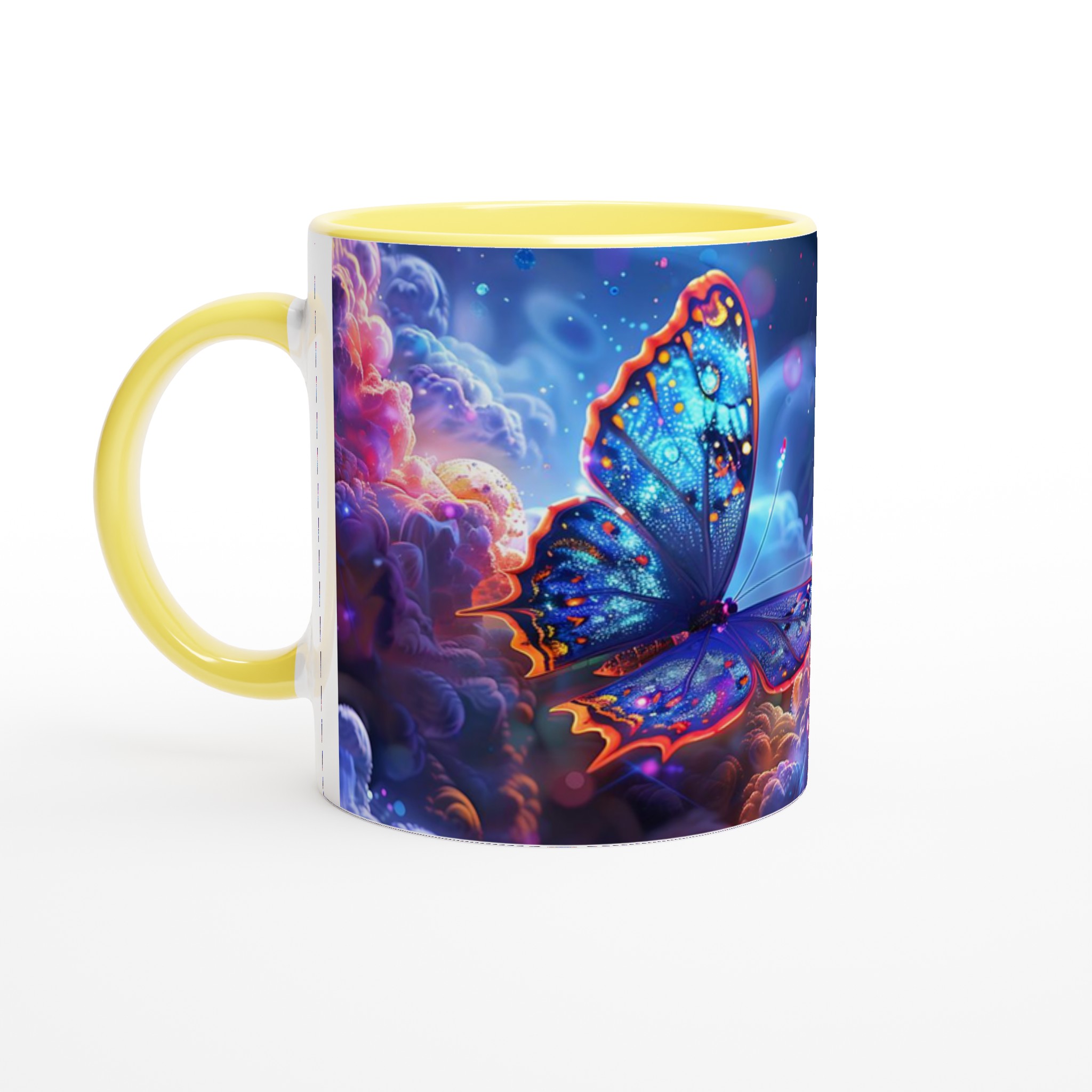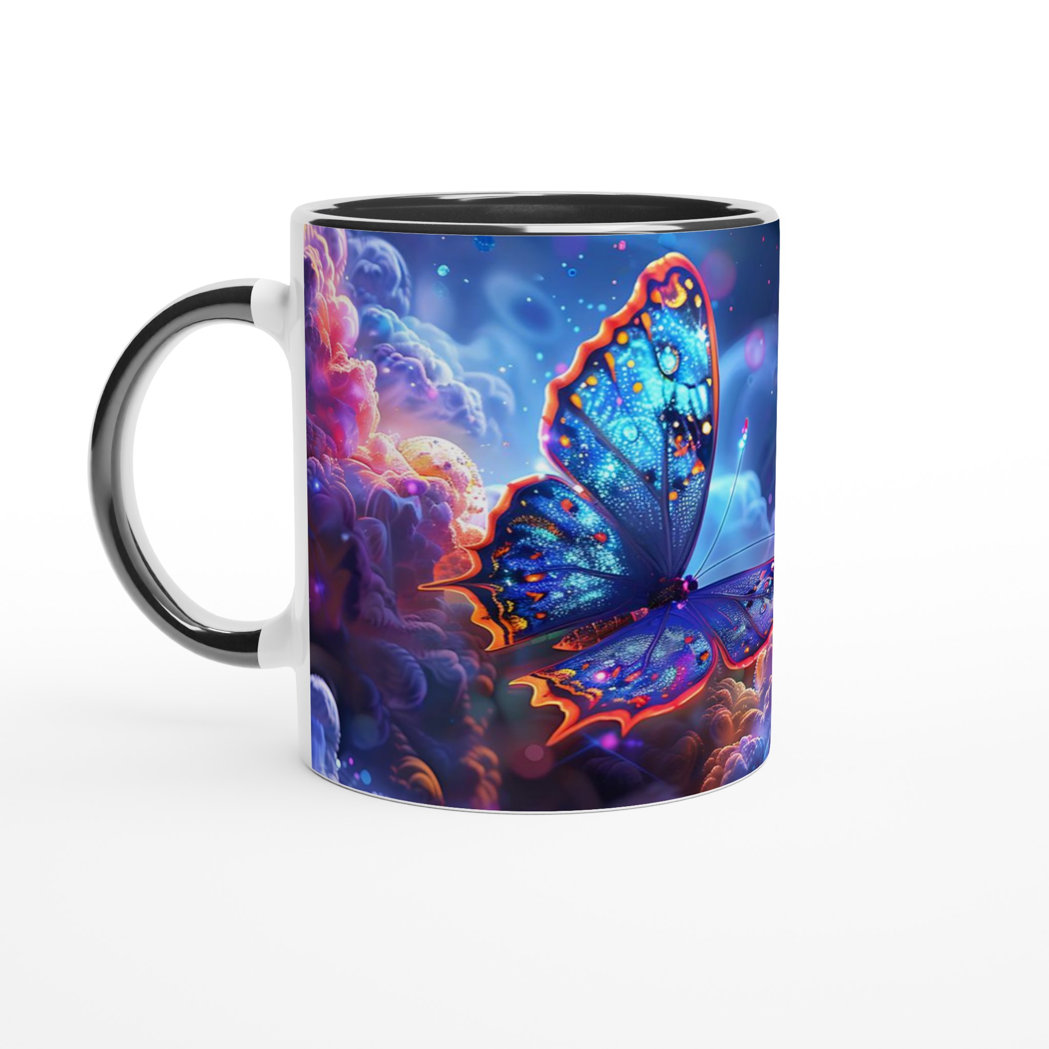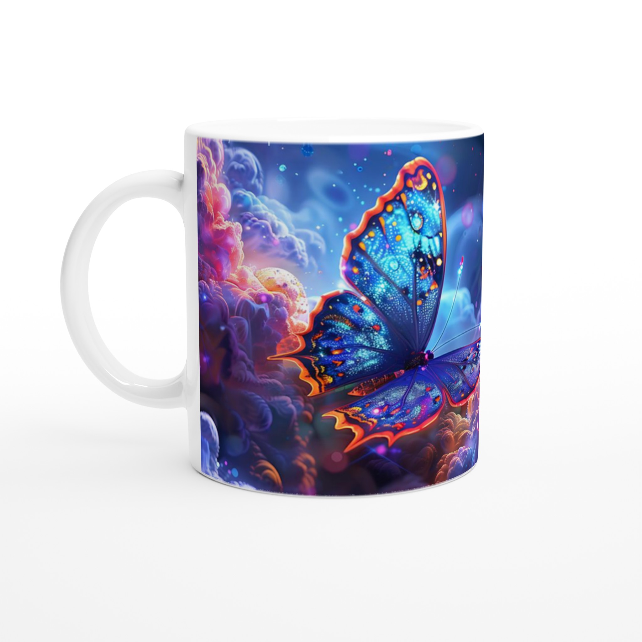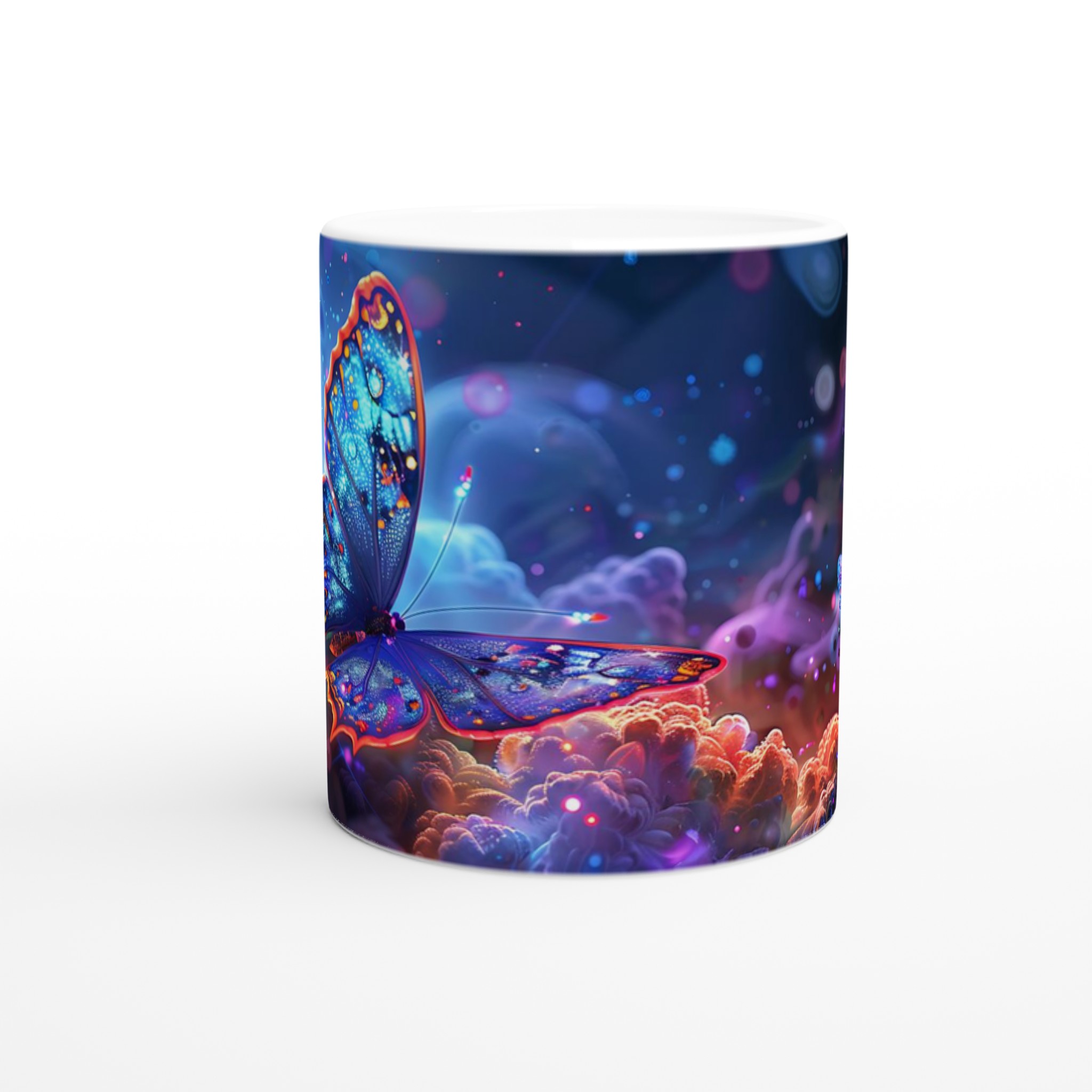 Låt dig svepas med av en drömsk värld varje gång du tar en klunk. Denna förtrollande keramiska mugg fångar den eteriska skönheten av glödande fjärilar som svävar genom ett kosmiskt landskap av djupt lila och pulserande orange. Med sin blanka vita yta framhävs det hypnotiska trycket med otroligt klara och levande färger, vilket förvandlar din dagliga kaffestund till en konstnärlig upplevelse.