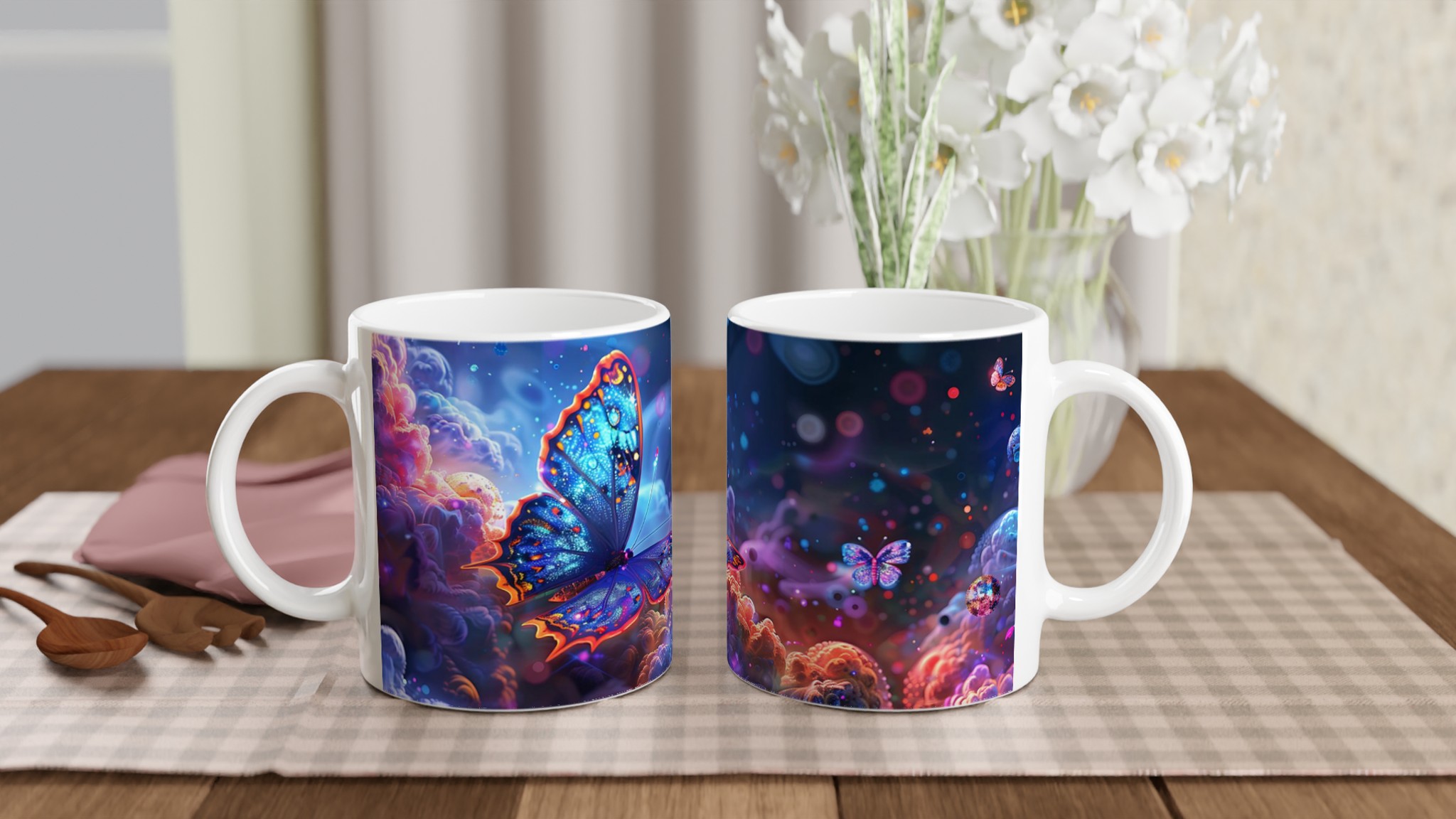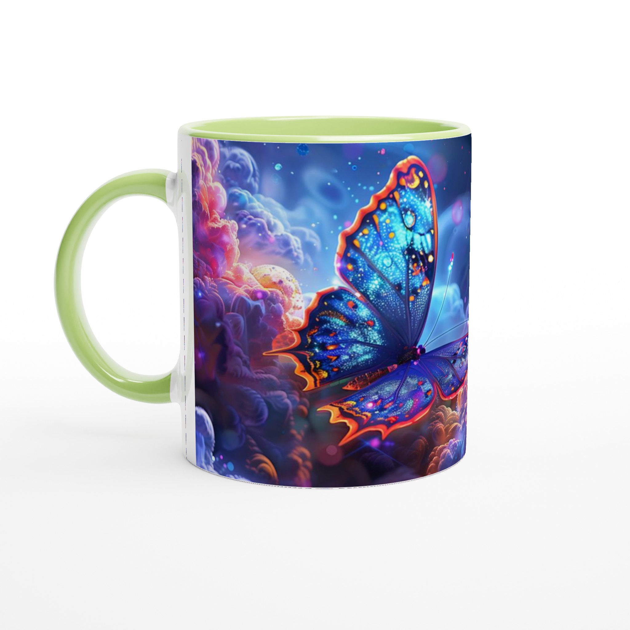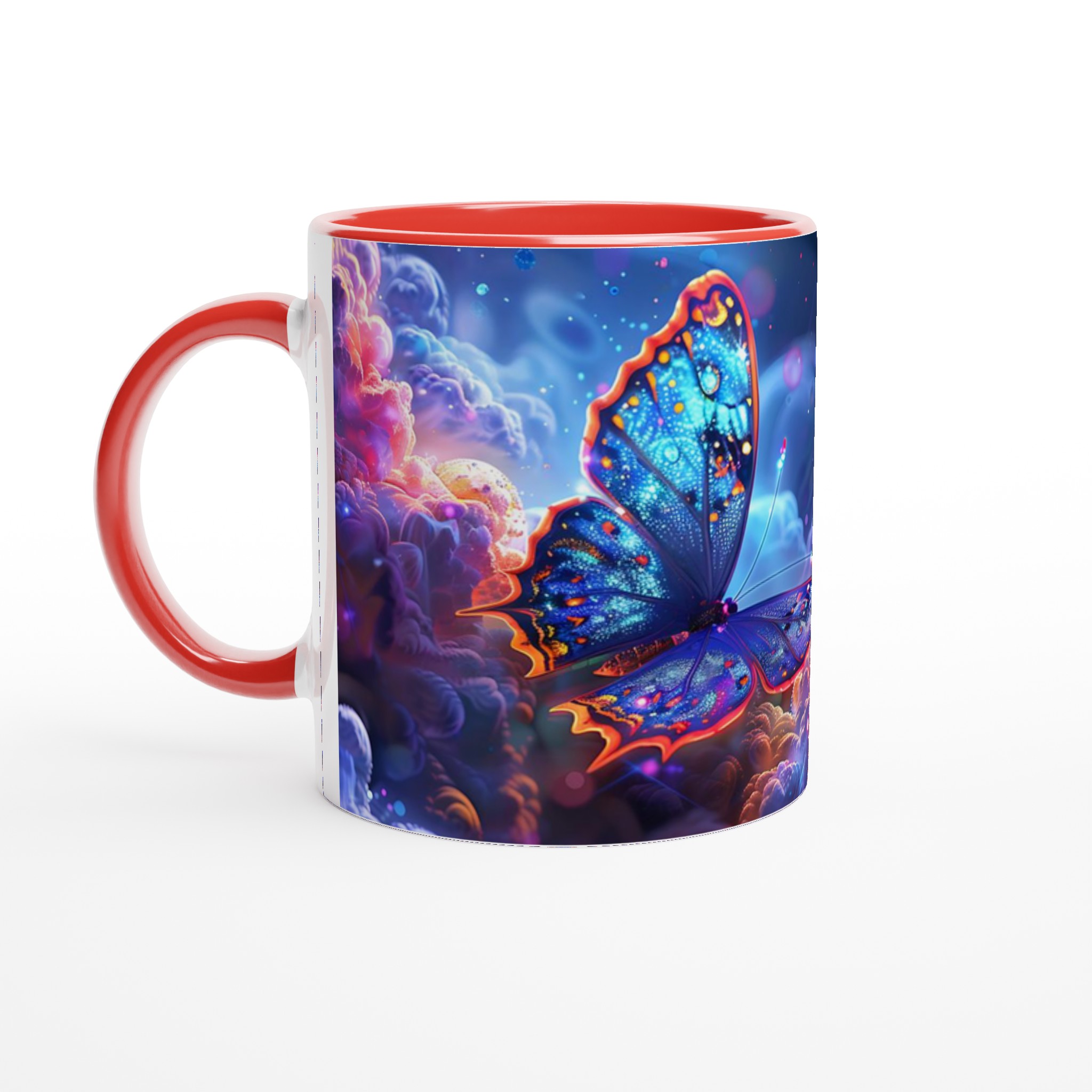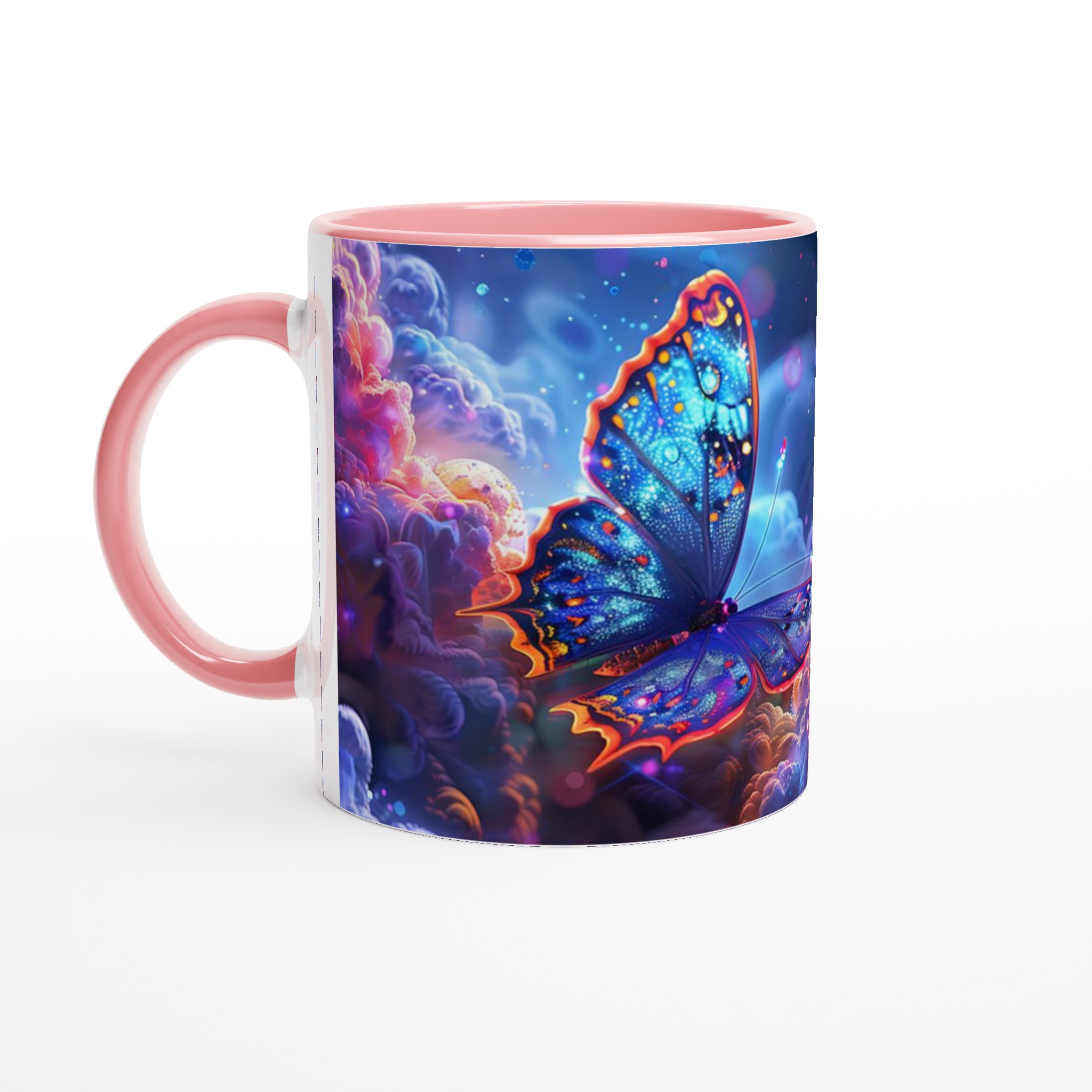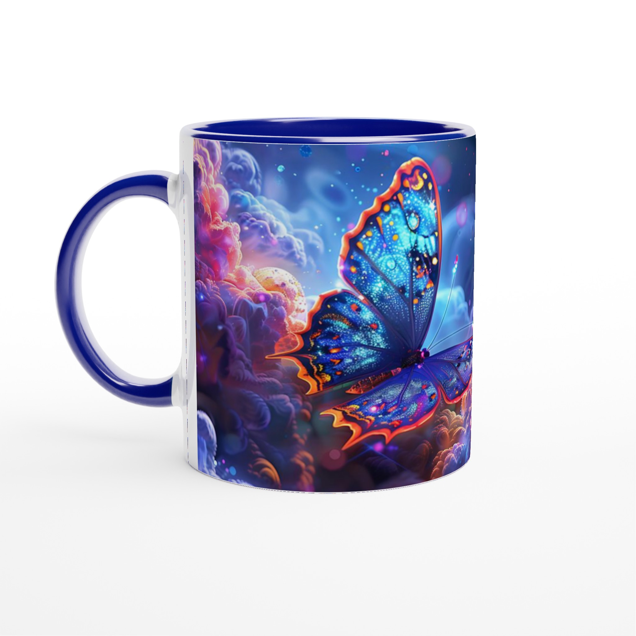 Låt dig svepas med av en drömsk värld varje gång du tar en klunk. Denna förtrollande keramiska mugg fångar den eteriska skönheten av glödande fjärilar som svävar genom ett kosmiskt landskap av djupt lila och pulserande orange. Med sin blanka vita yta framhävs det hypnotiska trycket med otroligt klara och levande färger, vilket förvandlar din dagliga kaffestund till en konstnärlig upplevelse.