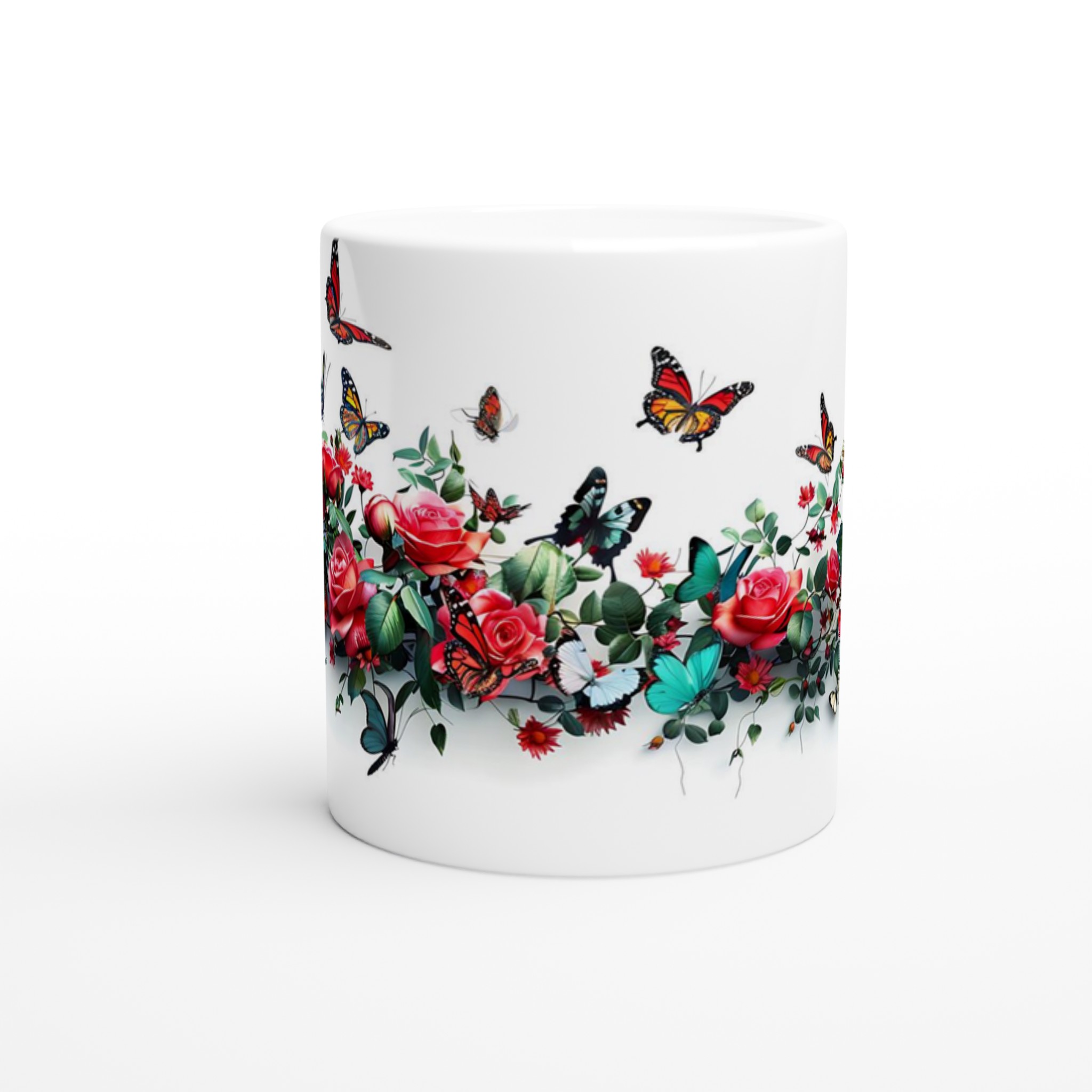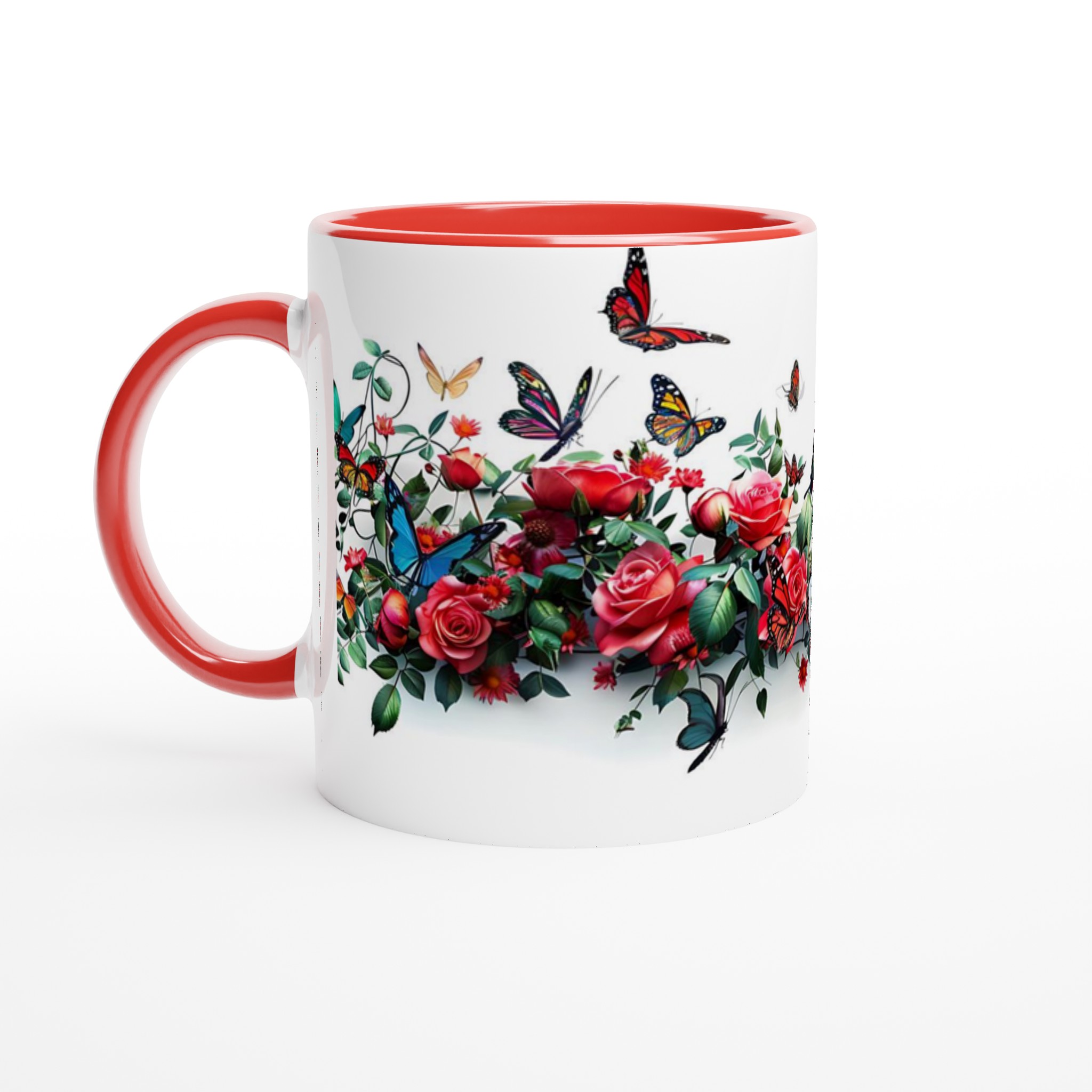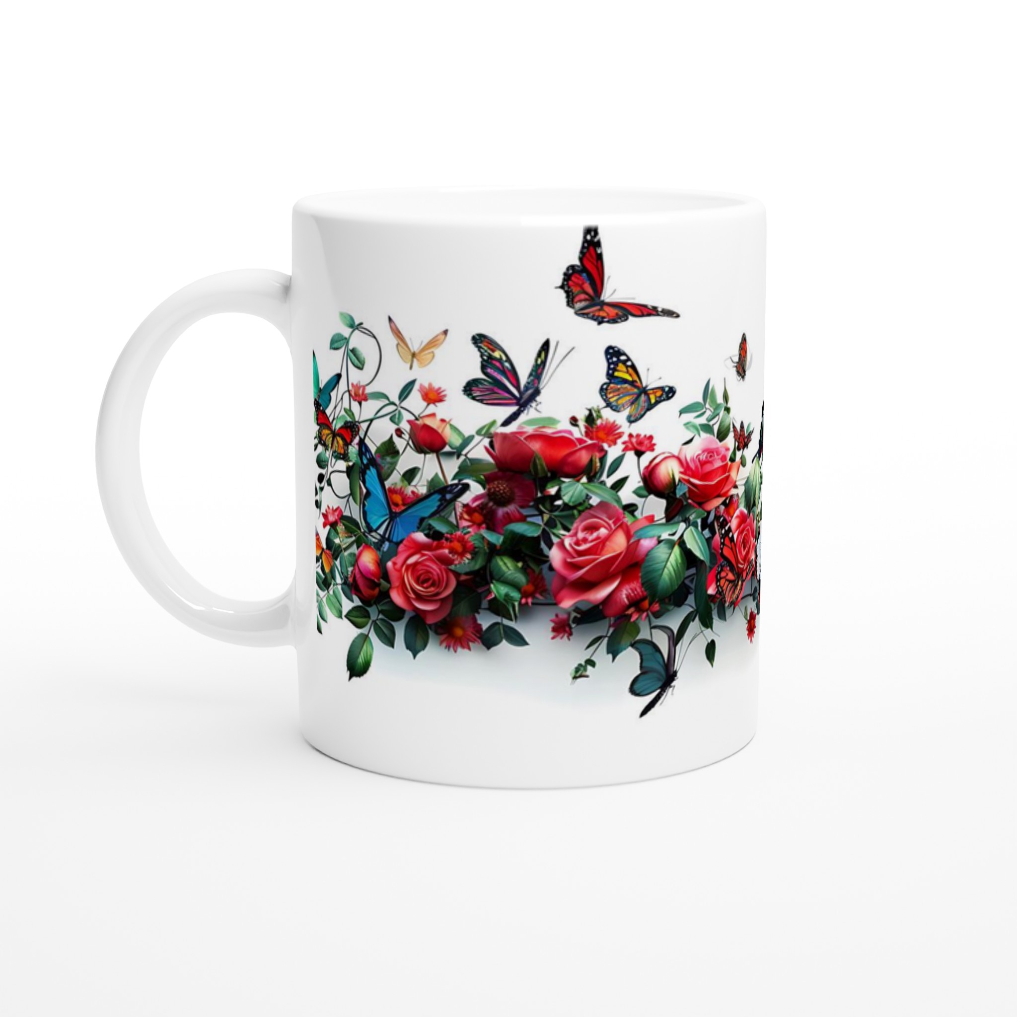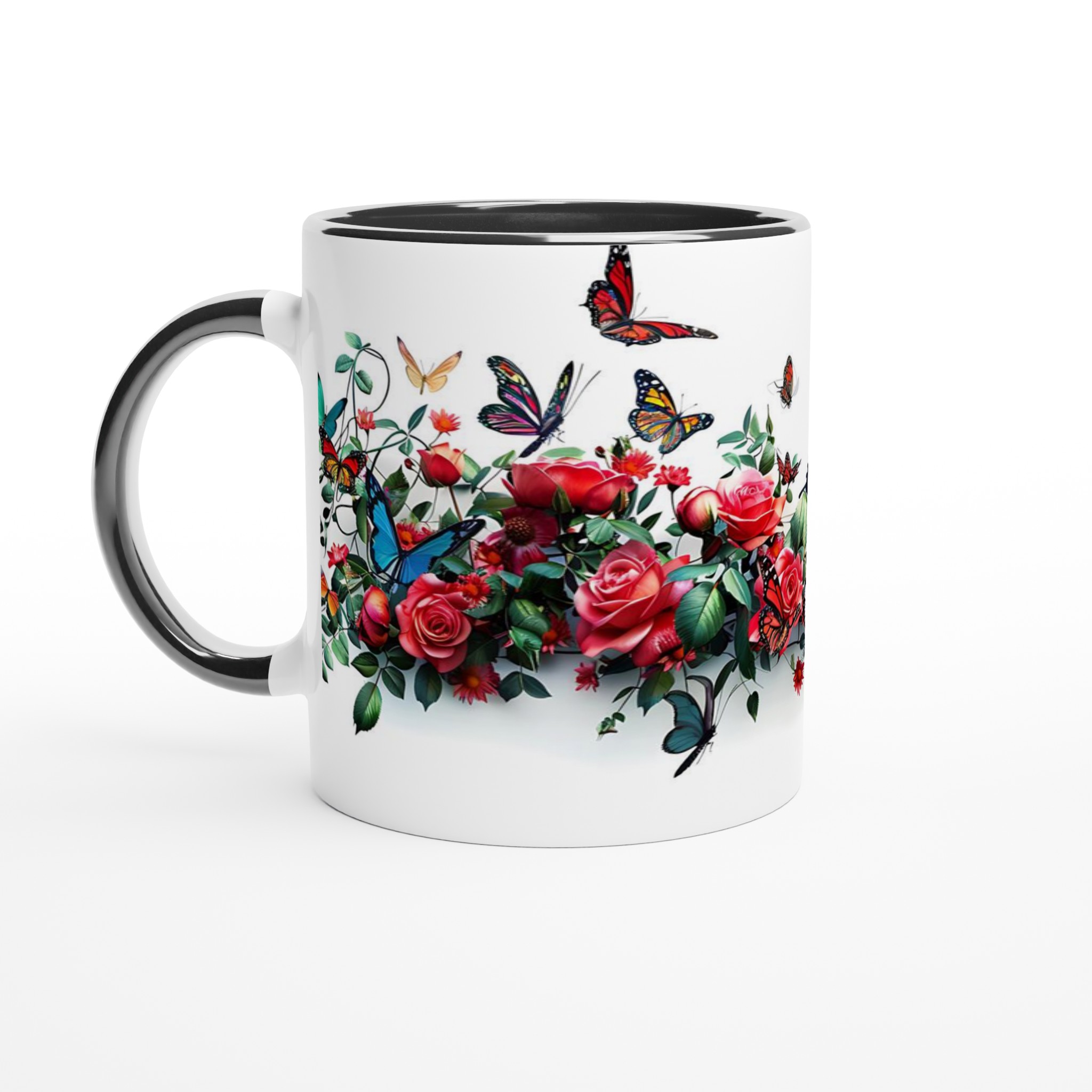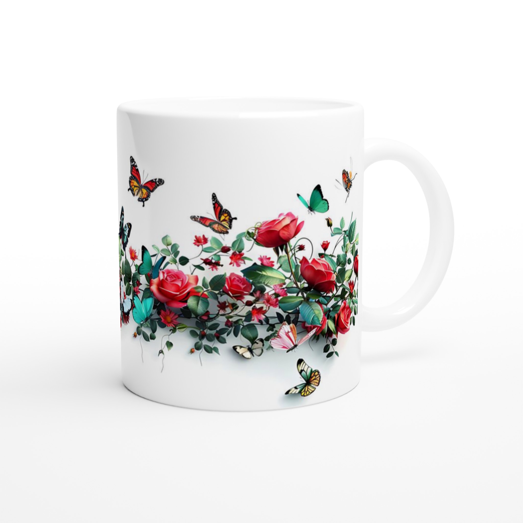 Den högkvalitativa tryckprocessen säkerställer att de klara och levande färgerna – från rosens djupröda nyanser till fjärilarnas skira vingar – håller sig vackra, även efter otaliga turer i mikrovågsugnen och diskmaskinen. Välj den keramiska muggen i din favoritfärg för att komplettera den utsökta designen: Ceramic White, Ceramic Yellow, Ceramic Pink, Ceramic Green, Ceramic Red, Ceramic Black eller Ceramic Blue. Varje färgval förvandlar muggen till ett personligt konstverk som passar just din stil.
