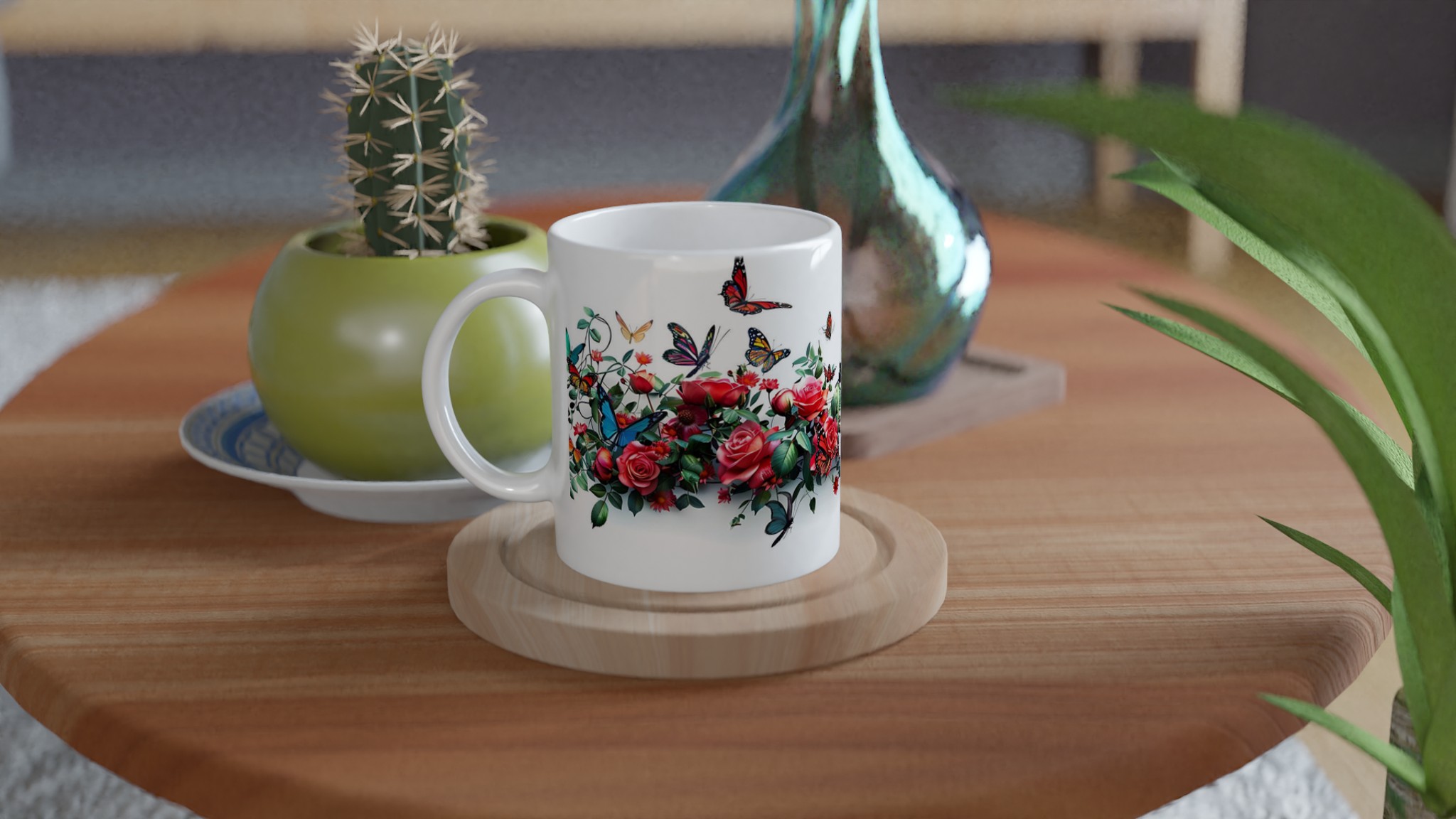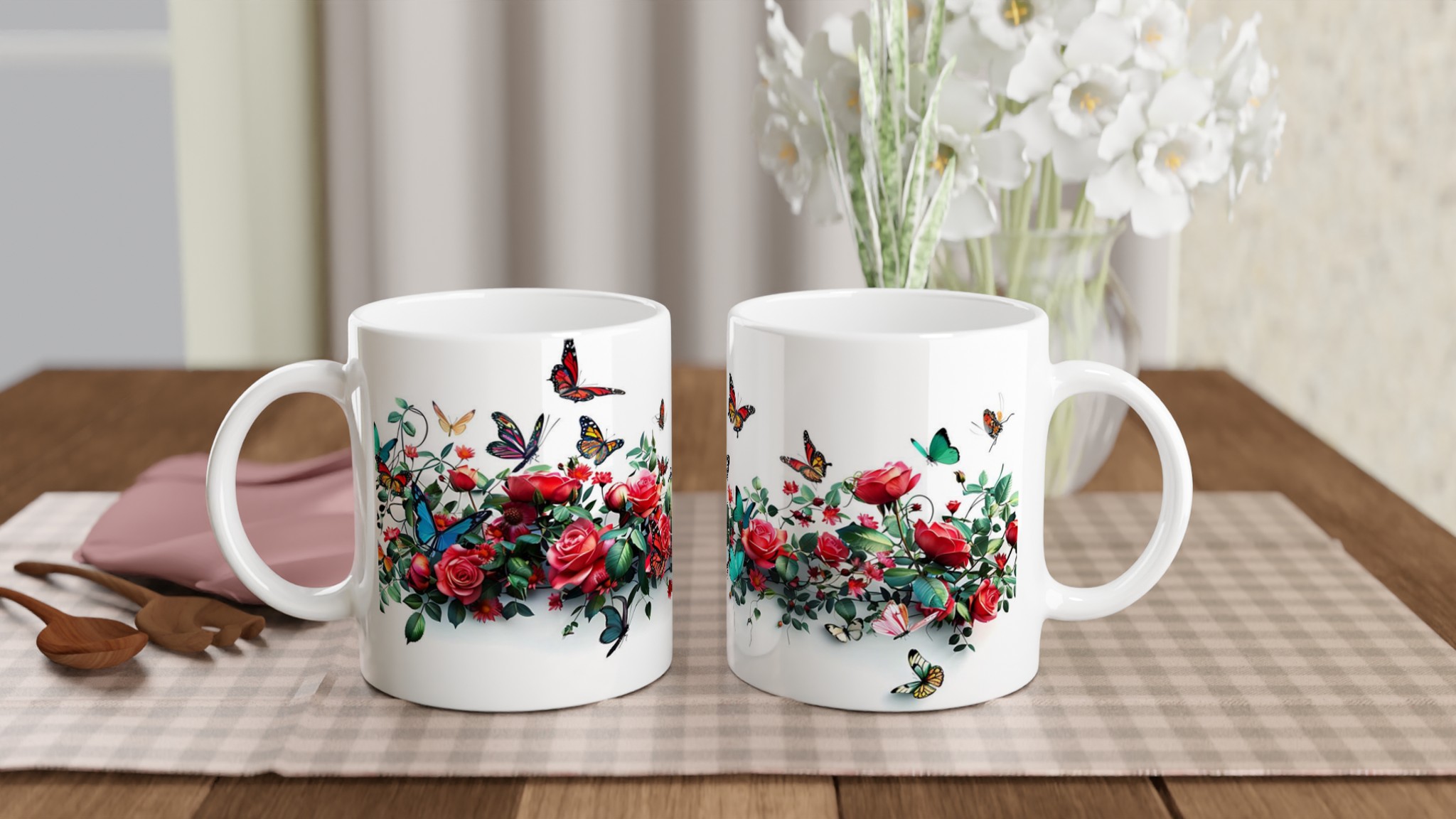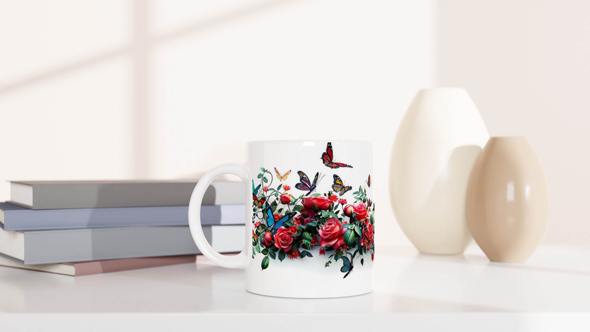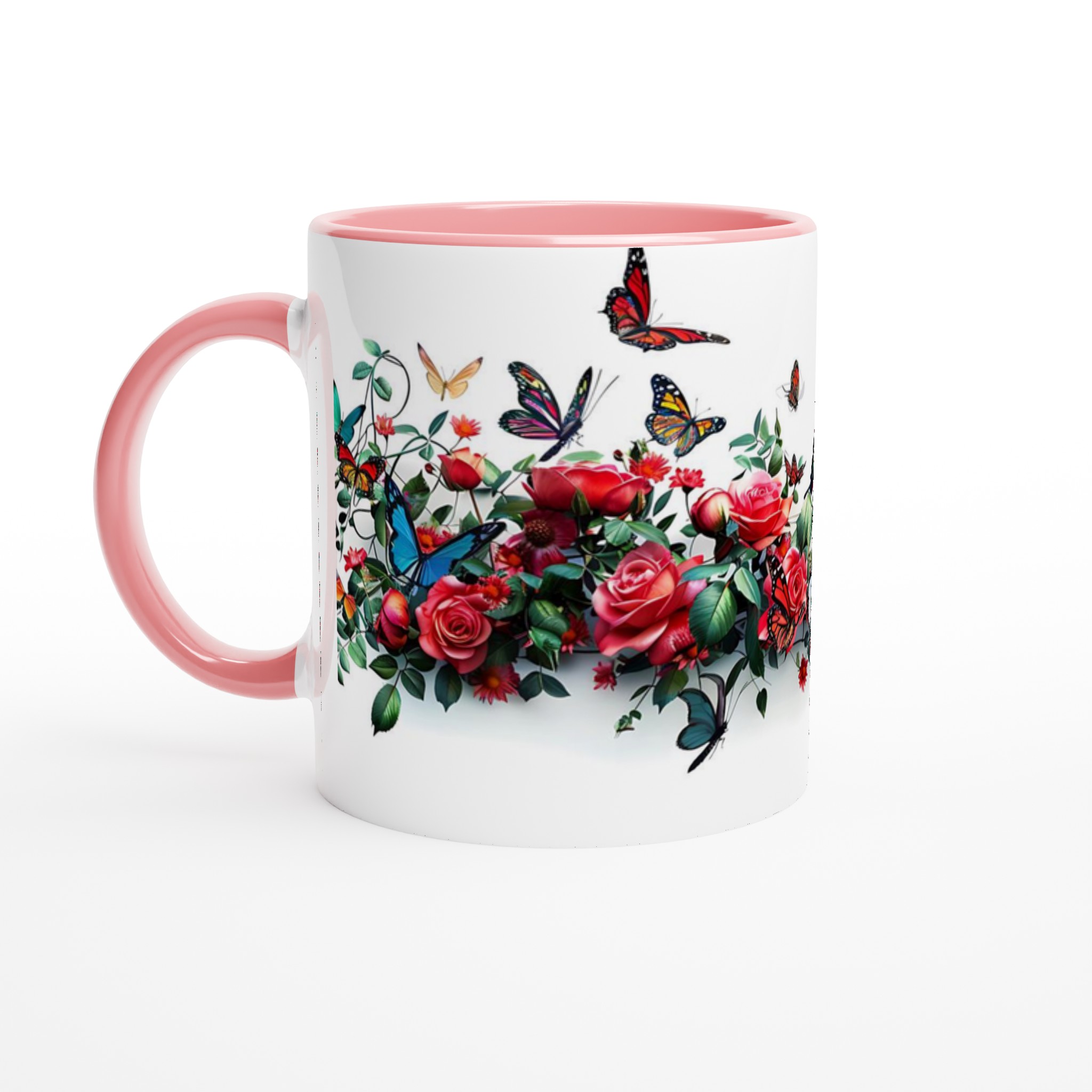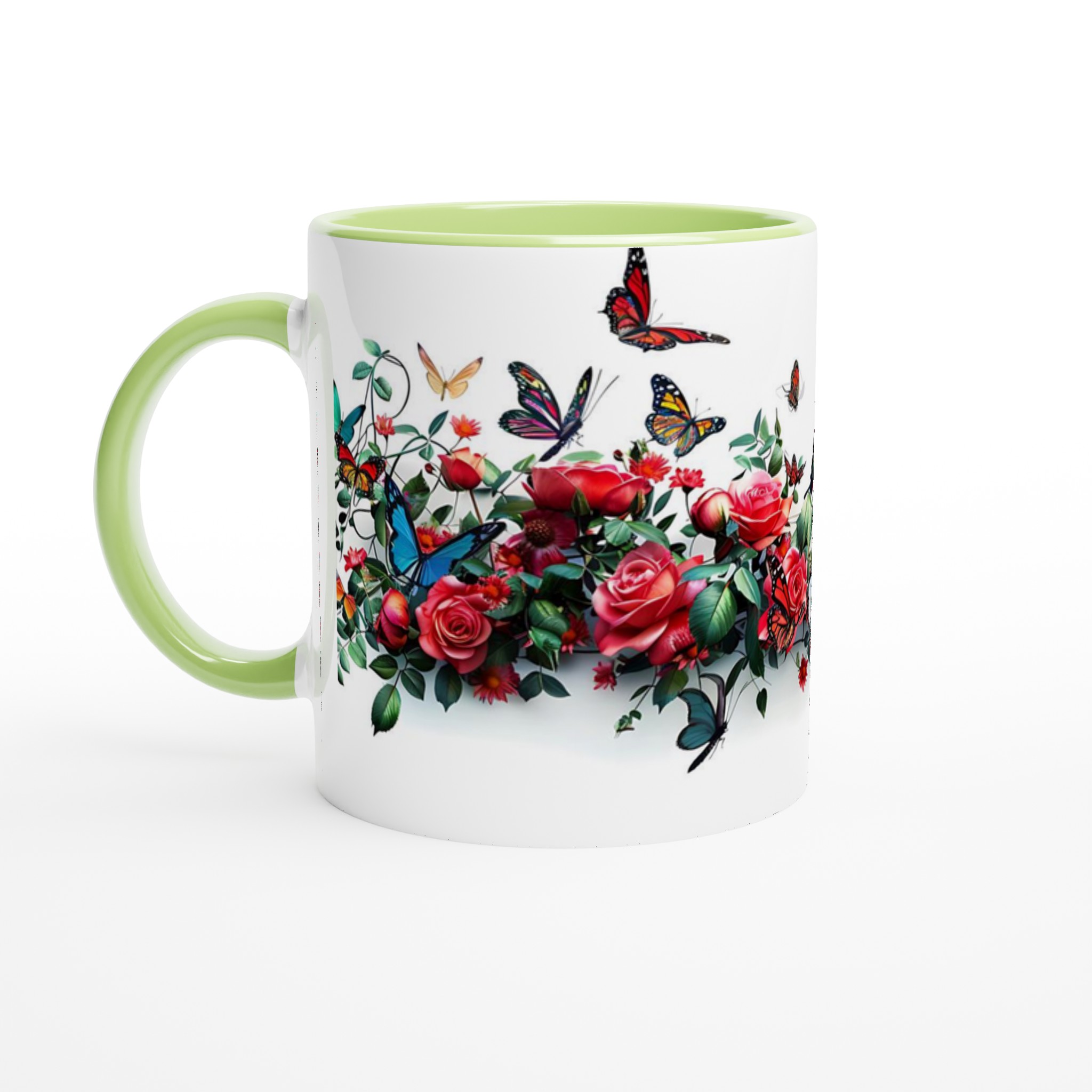 Den högkvalitativa tryckprocessen säkerställer att de klara och levande färgerna – från rosens djupröda nyanser till fjärilarnas skira vingar – håller sig vackra, även efter otaliga turer i mikrovågsugnen och diskmaskinen. Välj den keramiska muggen i din favoritfärg för att komplettera den utsökta designen: Ceramic White, Ceramic Yellow, Ceramic Pink, Ceramic Green, Ceramic Red, Ceramic Black eller Ceramic Blue. Varje färgval förvandlar muggen till ett personligt konstverk som passar just din stil.