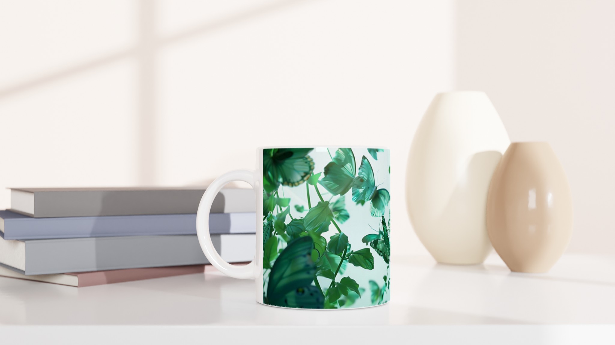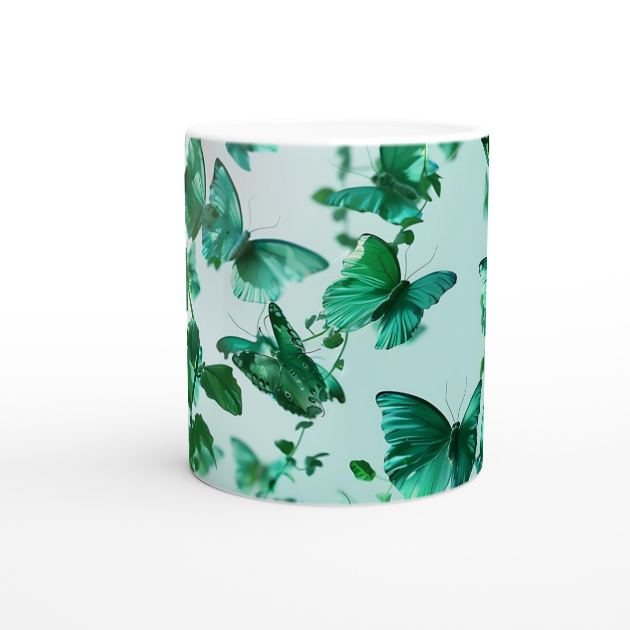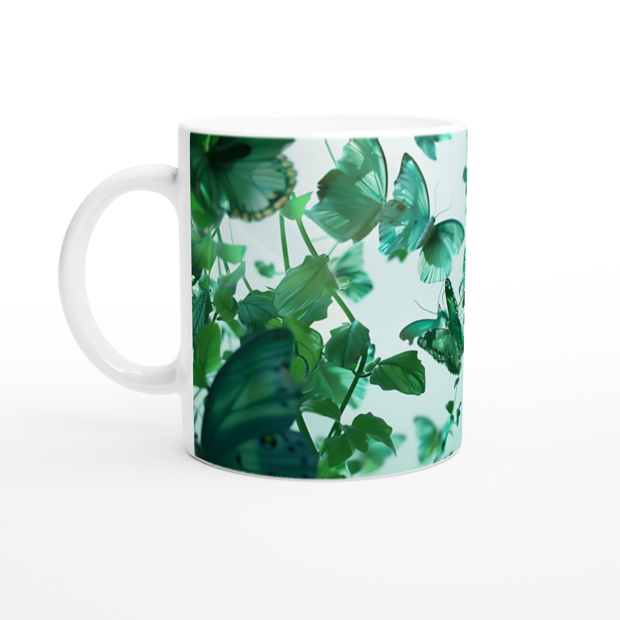 Fånga naturens elegans med vår Keramiska Mugg ”Fjärilsdans”. Denna stilrena mugg, prydd med en förtrollande illustration av grönskimrande fjärilar som svävar bland lummiga blad, blir snabbt en vardagsfavorit. Perfekt för morgonkaffet, kvällens varma choklad eller när du bara vill njuta av en kopp te och drömma dig bort till en lugn trädgård.