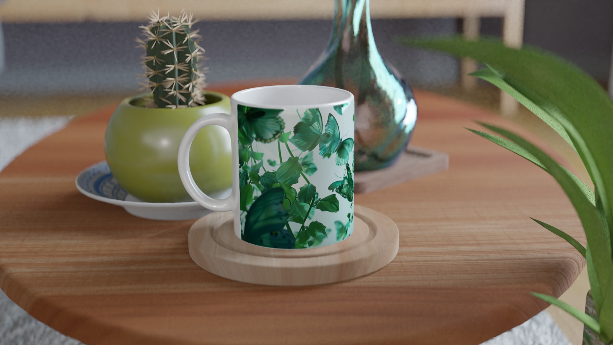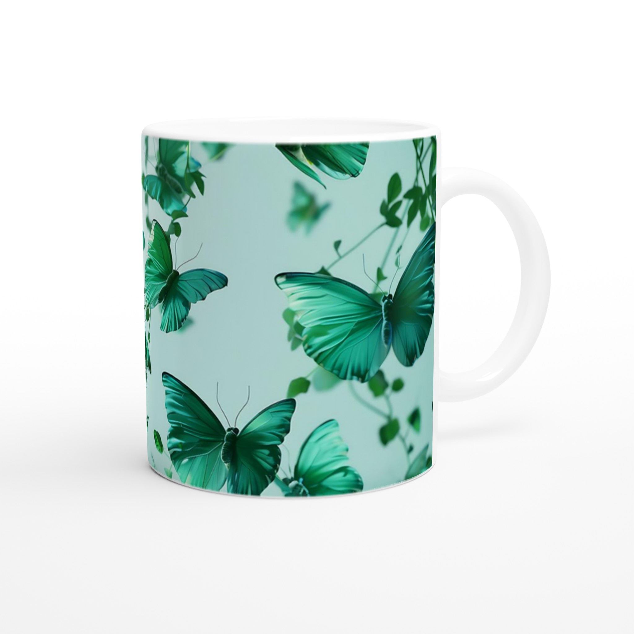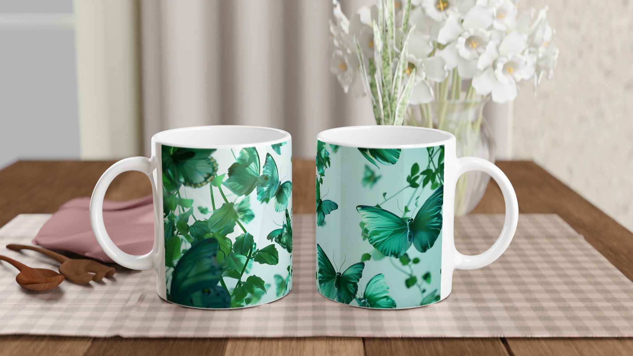 Fånga naturens elegans med vår Keramiska Mugg ”Fjärilsdans”. Denna stilrena mugg, prydd med en förtrollande illustration av grönskimrande fjärilar som svävar bland lummiga blad, blir snabbt en vardagsfavorit. Perfekt för morgonkaffet, kvällens varma choklad eller när du bara vill njuta av en kopp te och drömma dig bort till en lugn trädgård.