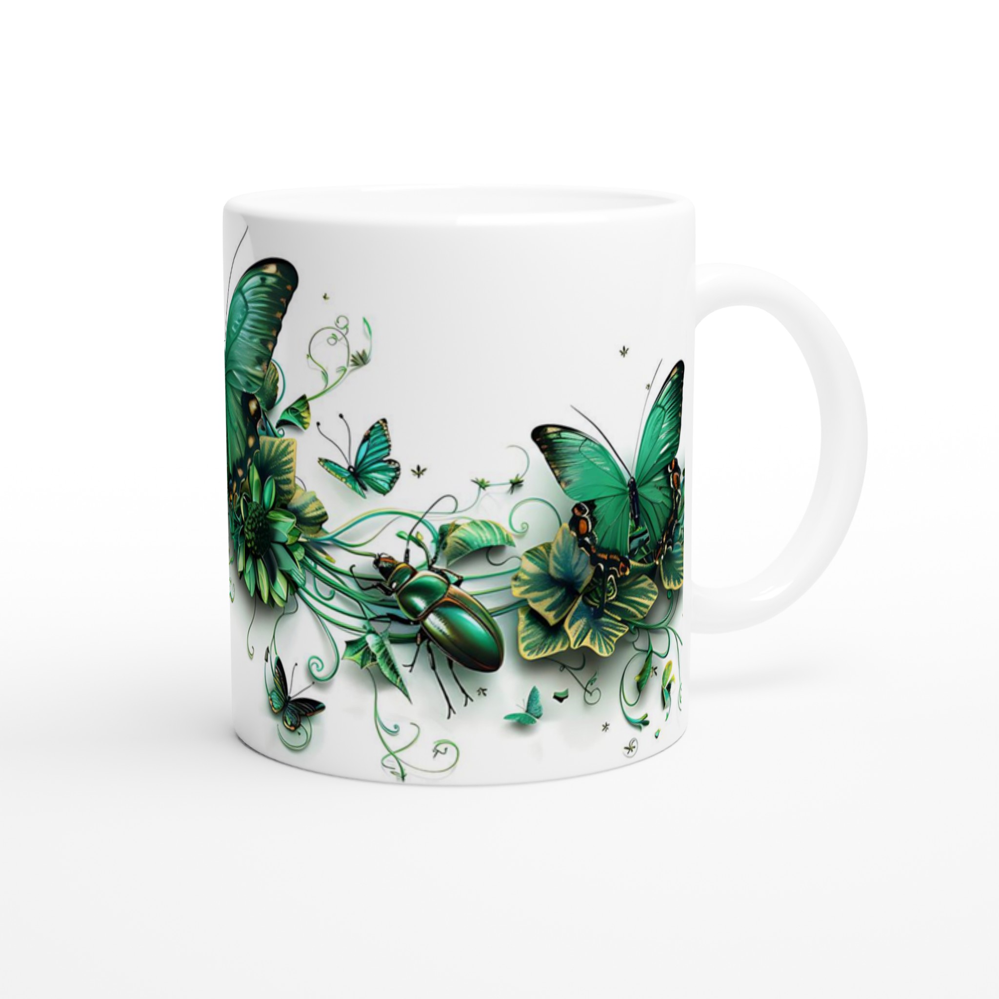 Låt dig förtrollas av naturens skönhet varje dag med denna Keramisk Mugg som pryds av en livfull illustration av grönskimrande fjärilar och frodiga lövverk. Denna mugg är inte bara en behållare för din favoritdryck, utan en konstnärlig hyllning till den lugnande grönskan och fjärilarnas fria flykt. Föreställ dig hur ditt morgonkaffe eller kvällste blir en stund av fridfull reflektion, omgiven av en design som inspirerar till lugn och naturkänsla.