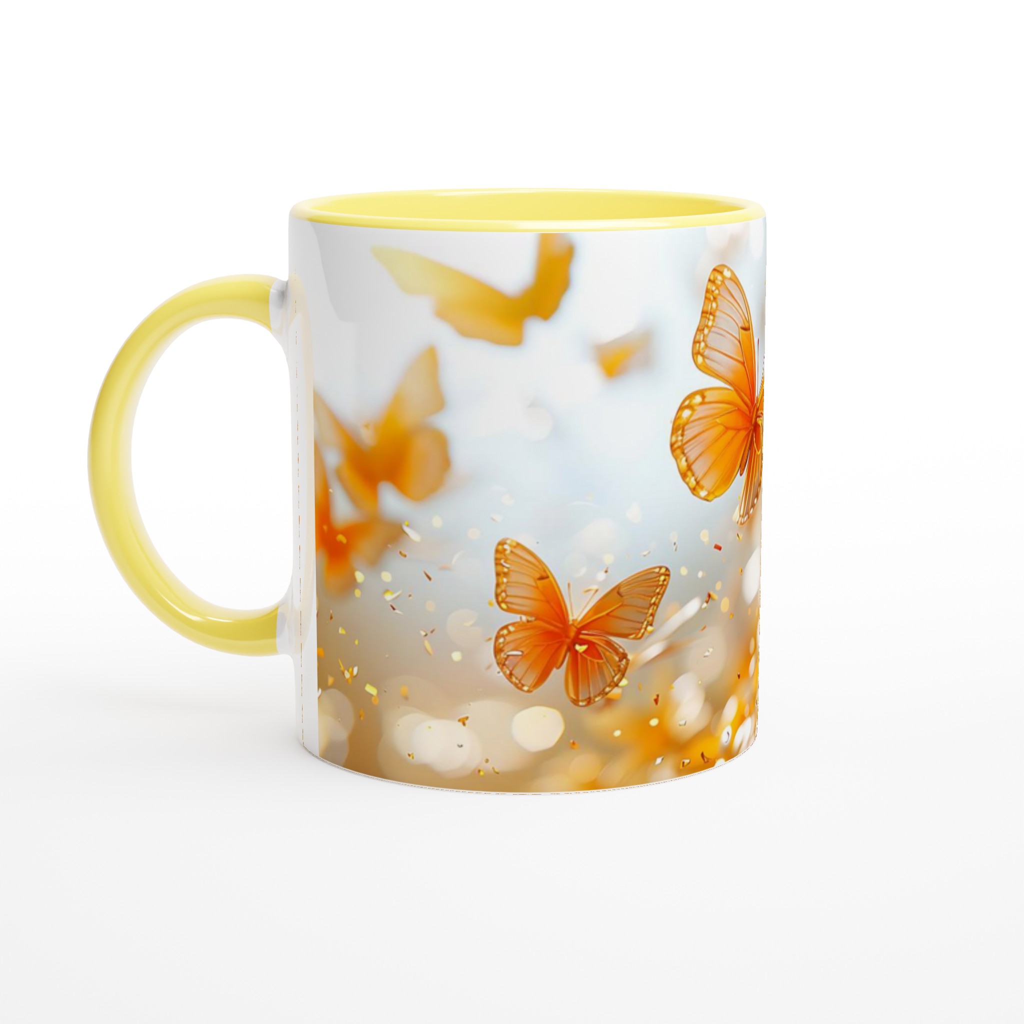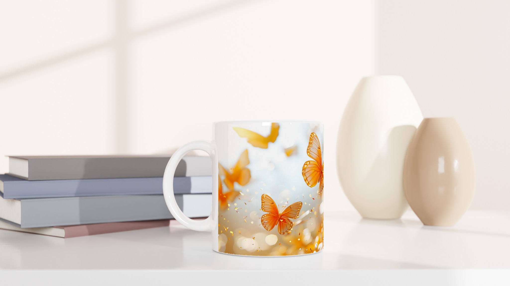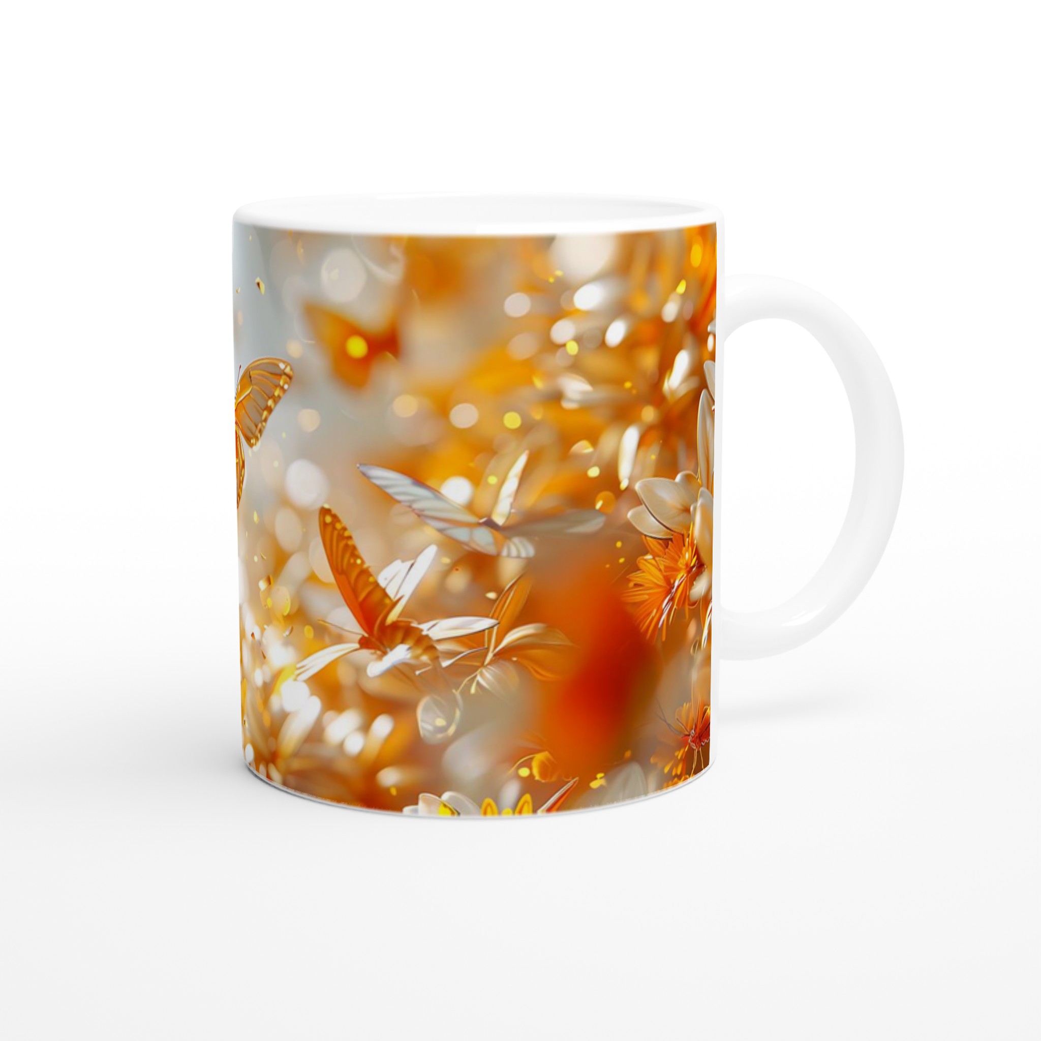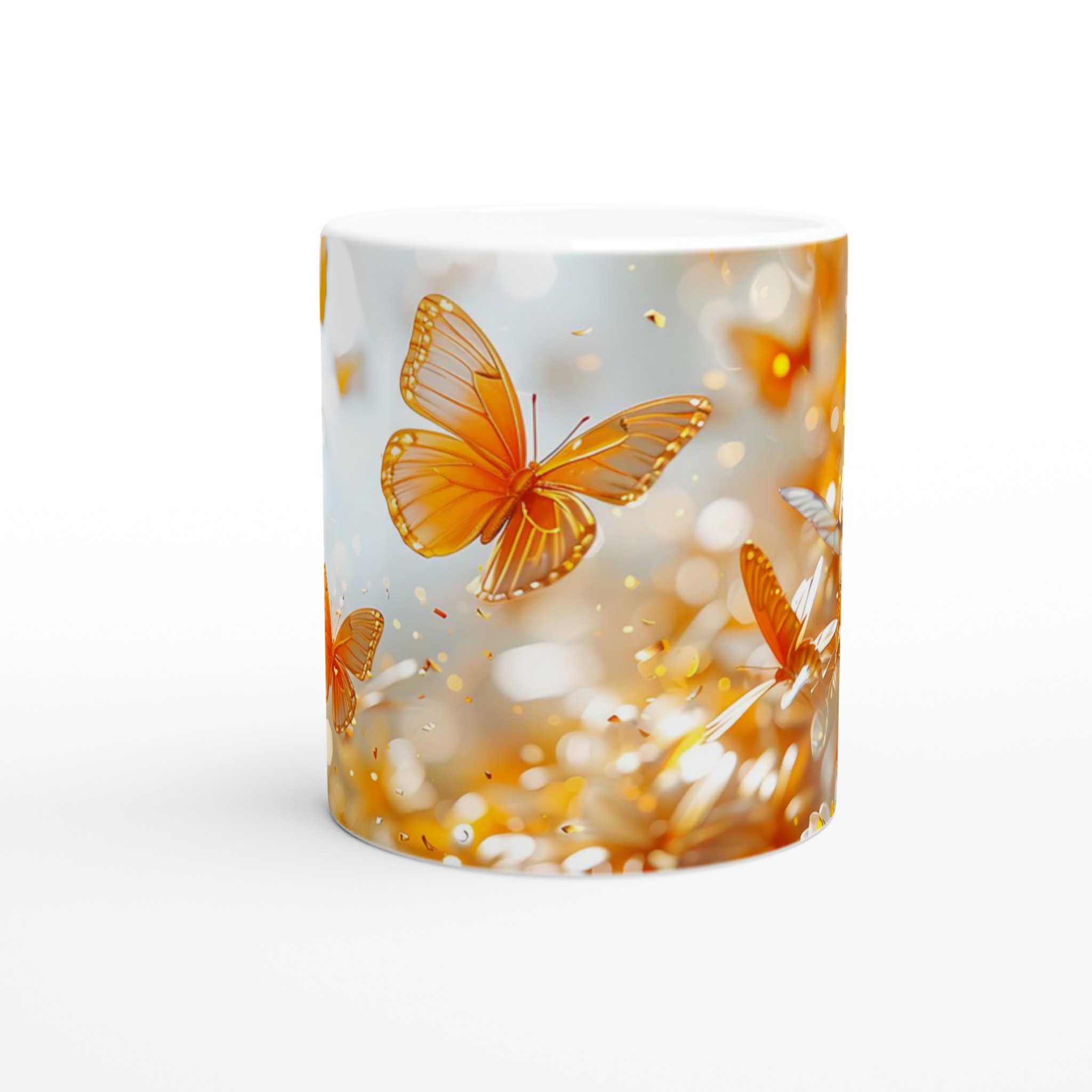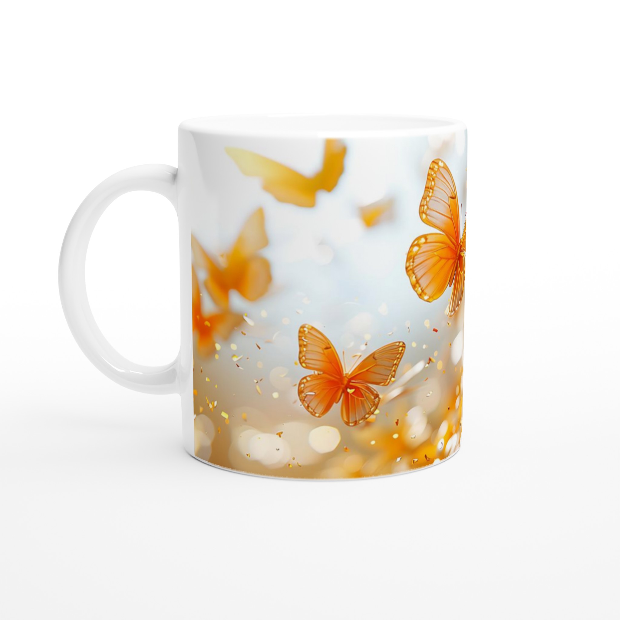 Fånga den glittrande magin och den varma glöden från en svärm av guldiga fjärilar med vår Keramisk Mugg – en äkta vardagsfavorit! Den här stilrena muggen blir snabbt din följeslagare för morgonkaffet, kvällens varma choklad eller när du bara vill njuta av en kopp te. Den skimrande vita ytan får trycken att framhävas med klara och levande färger, som håller sig fina även efter många turer i mikron och diskmaskinen, precis som fjärilarnas tidlösa skönhet.