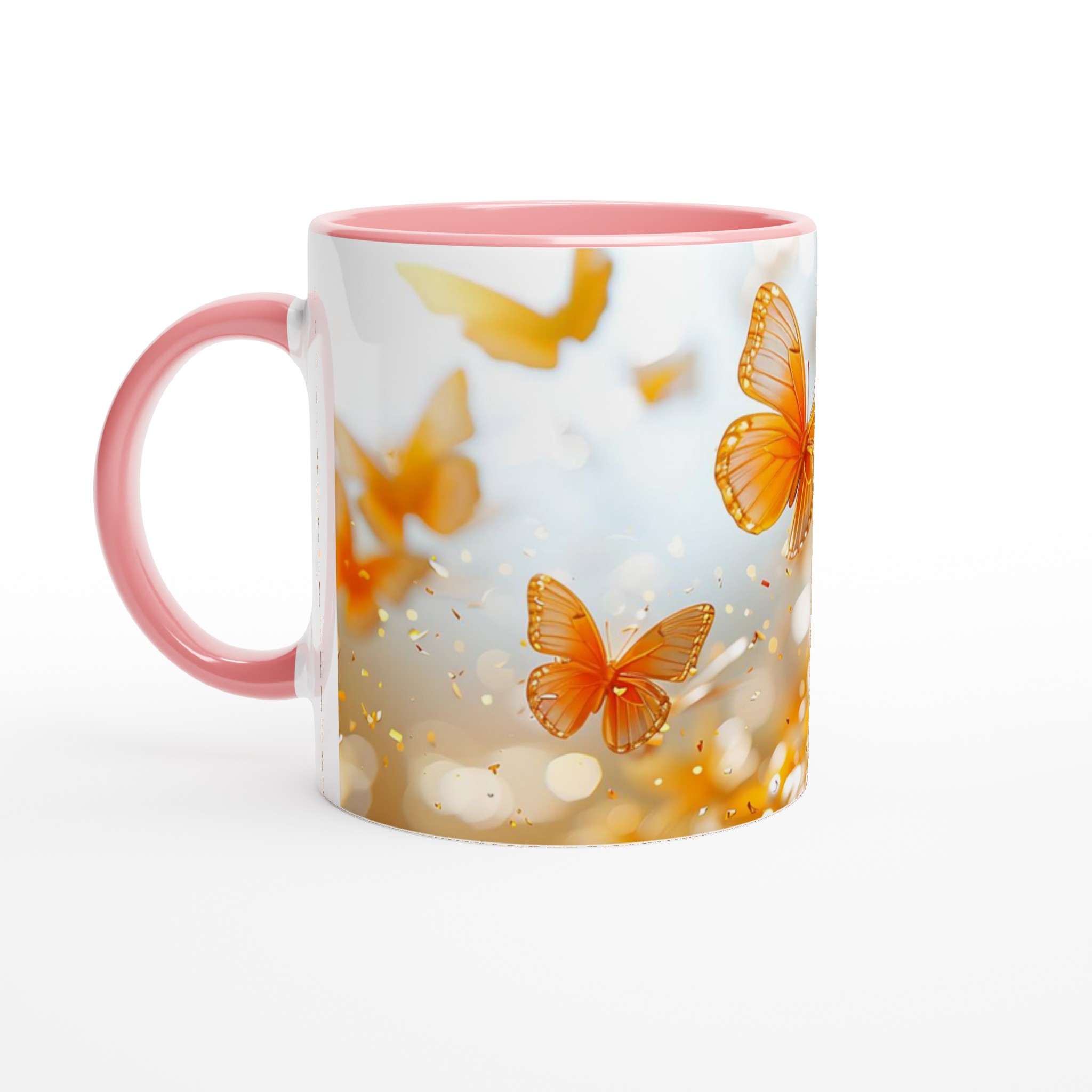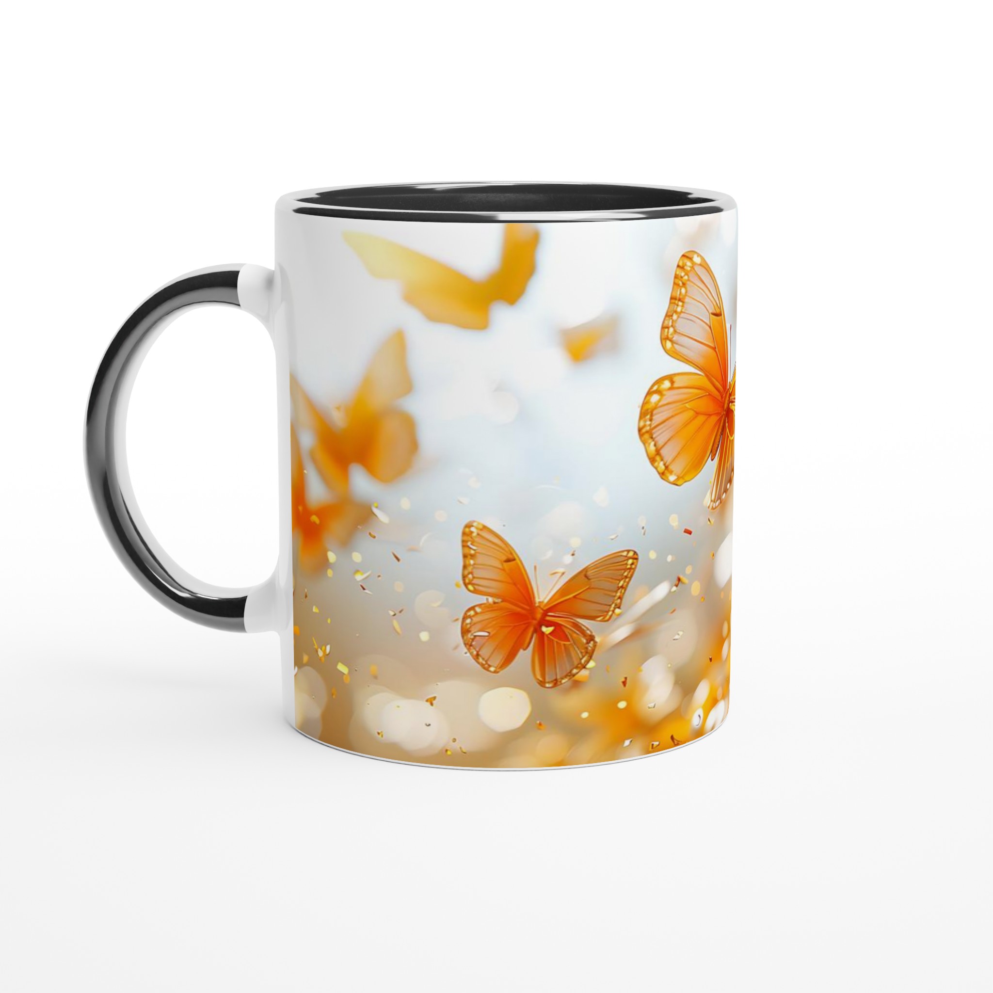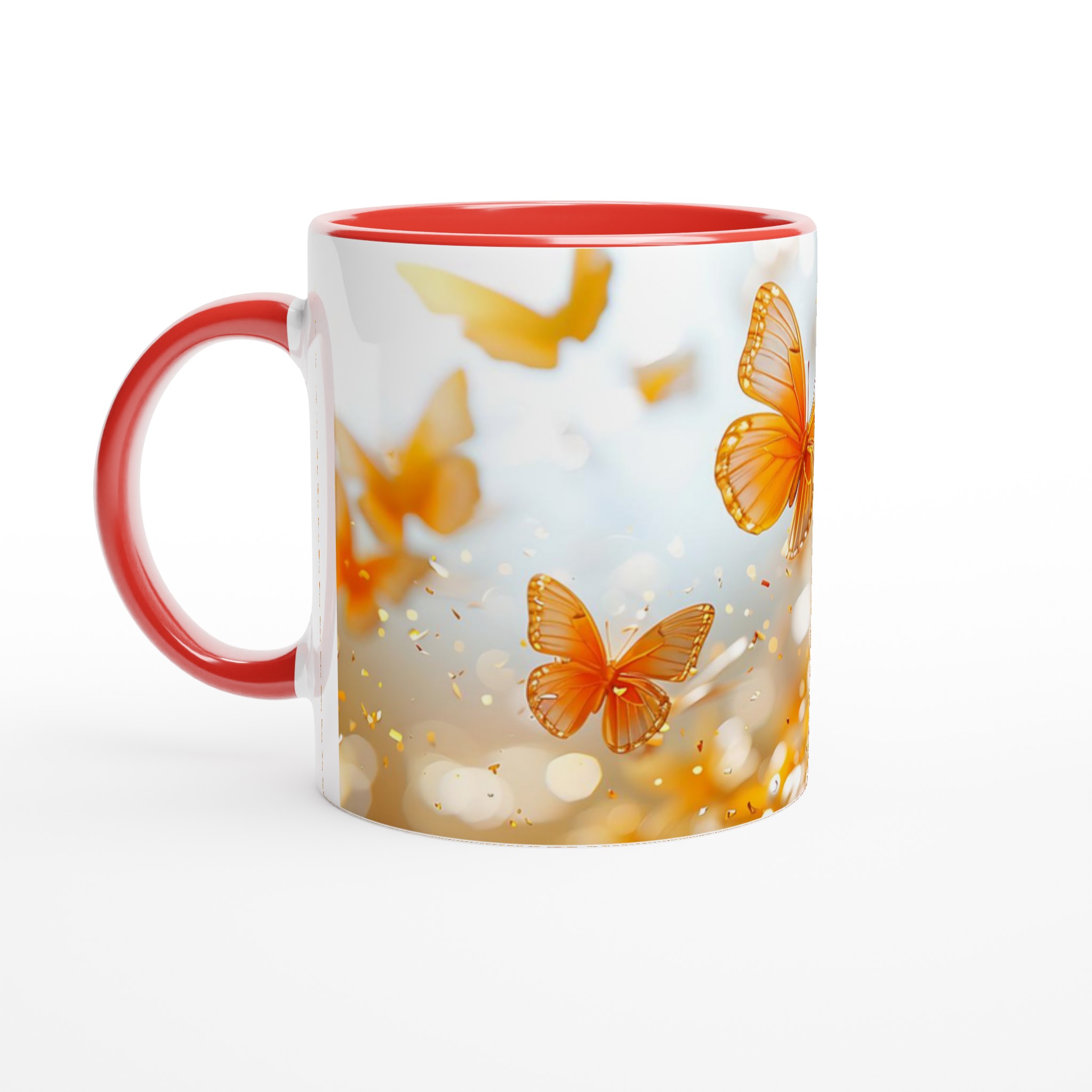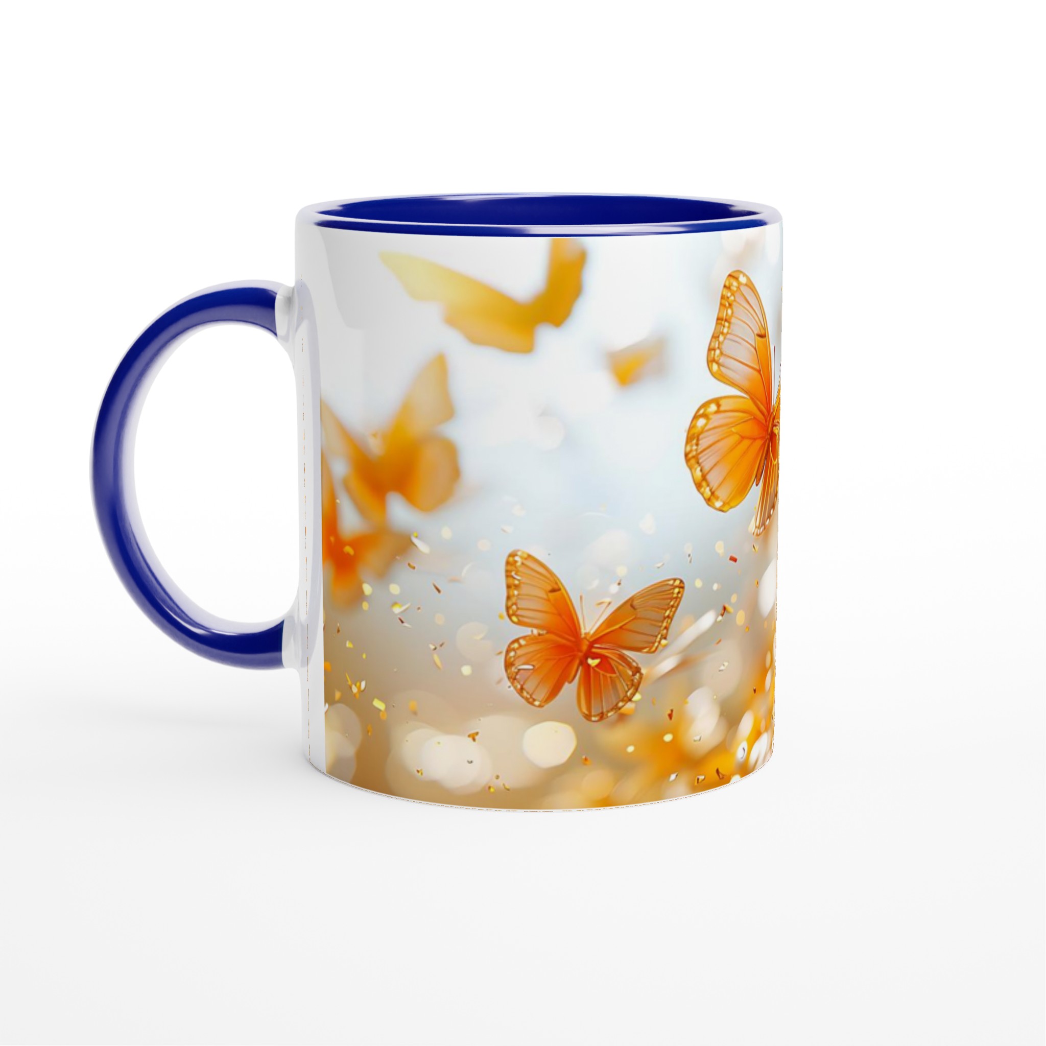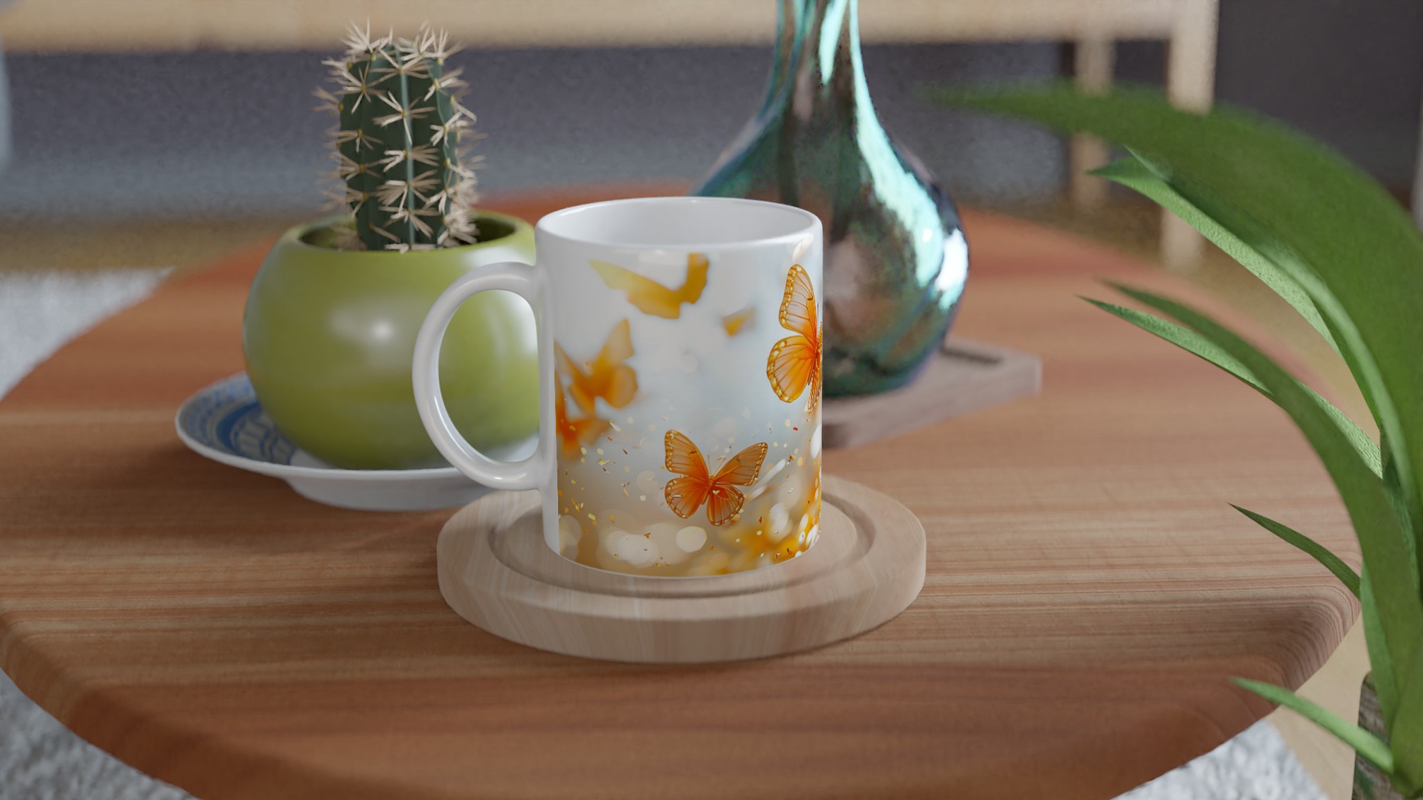 Fånga den glittrande magin och den varma glöden från en svärm av guldiga fjärilar med vår Keramisk Mugg – en äkta vardagsfavorit! Den här stilrena muggen blir snabbt din följeslagare för morgonkaffet, kvällens varma choklad eller när du bara vill njuta av en kopp te. Den skimrande vita ytan får trycken att framhävas med klara och levande färger, som håller sig fina även efter många turer i mikron och diskmaskinen, precis som fjärilarnas tidlösa skönhet.