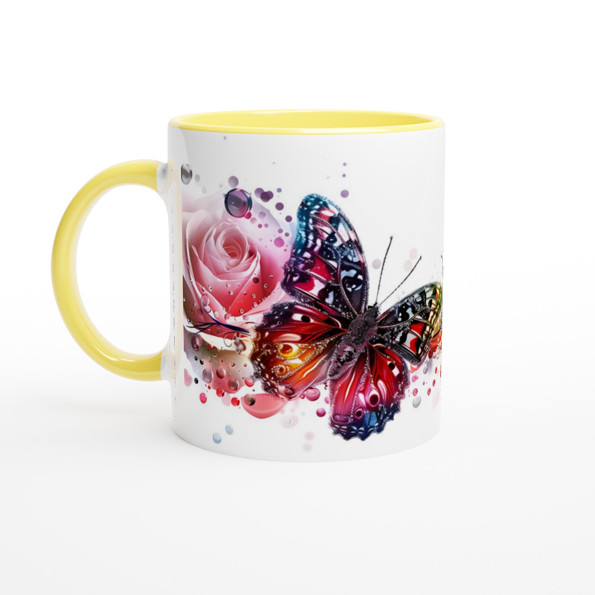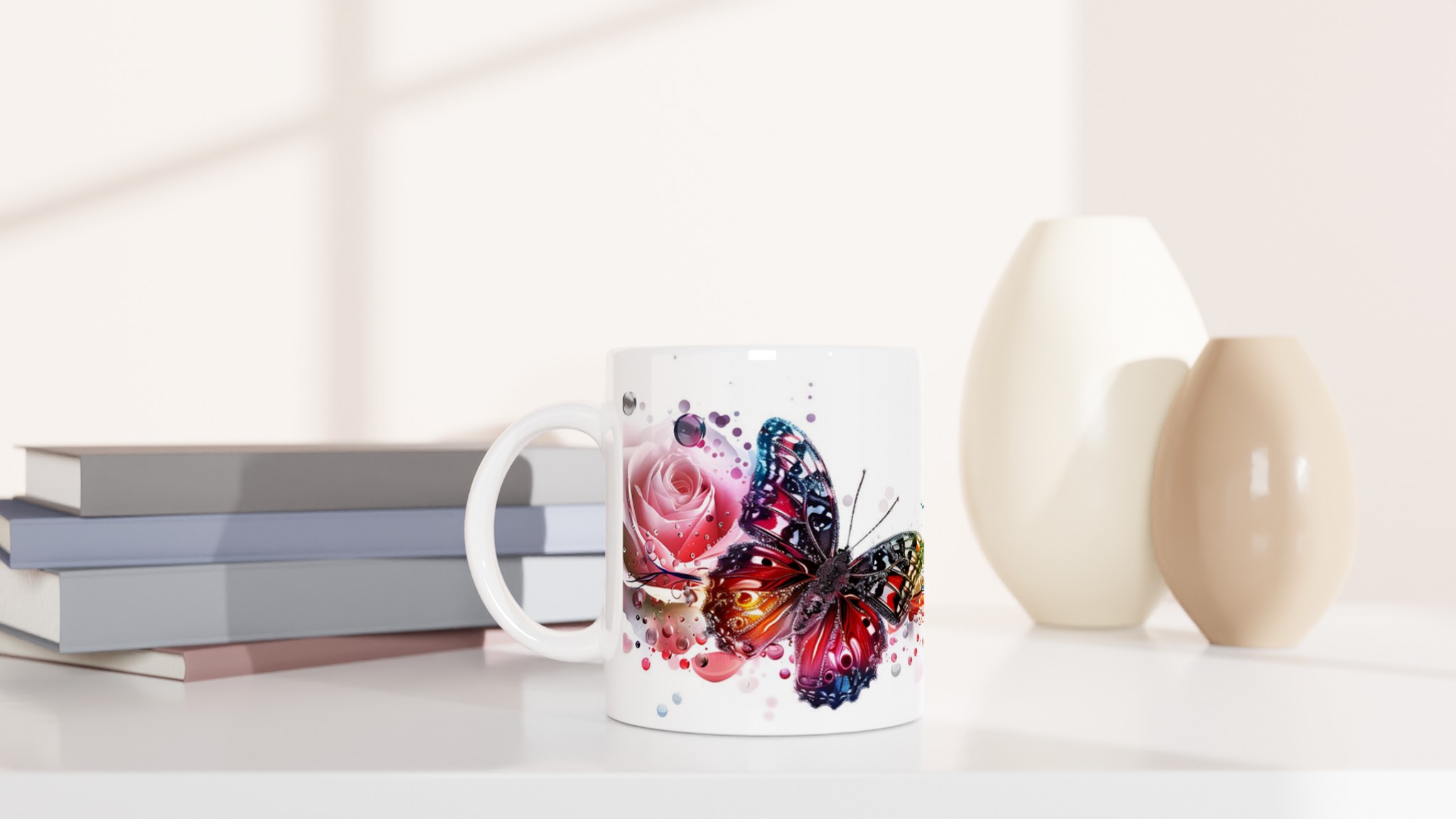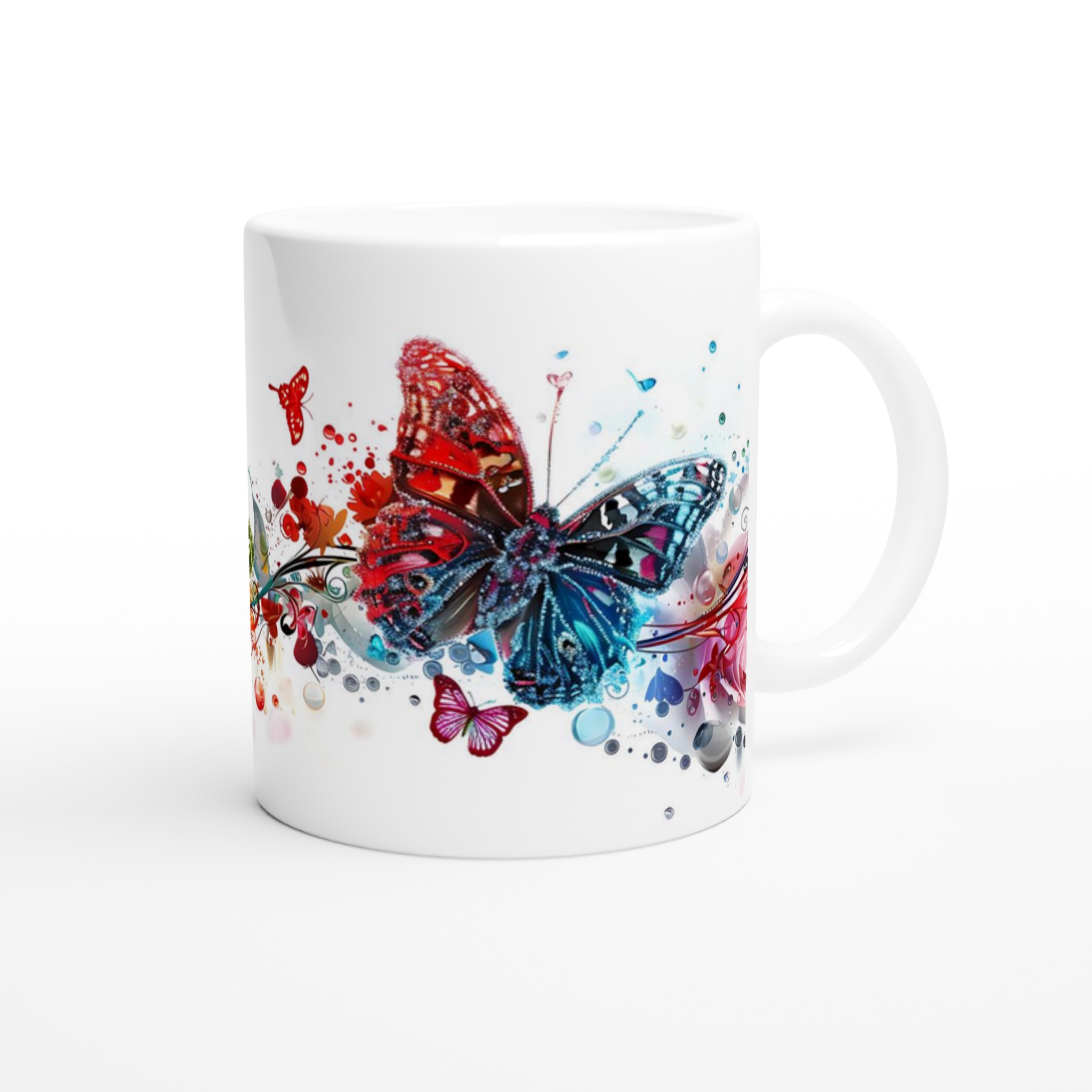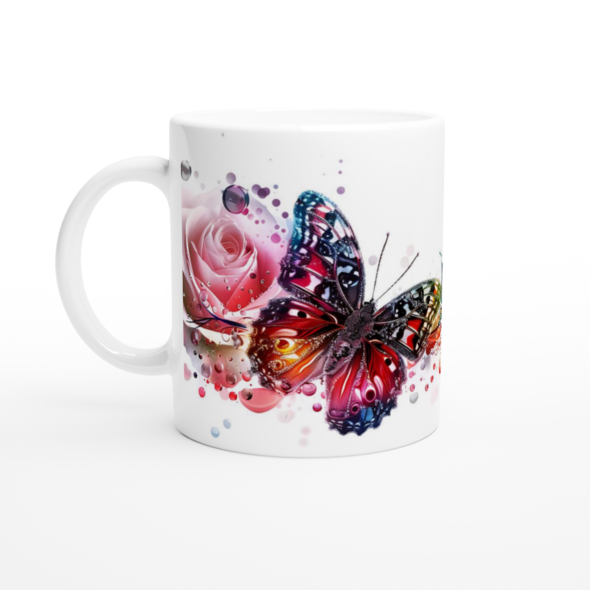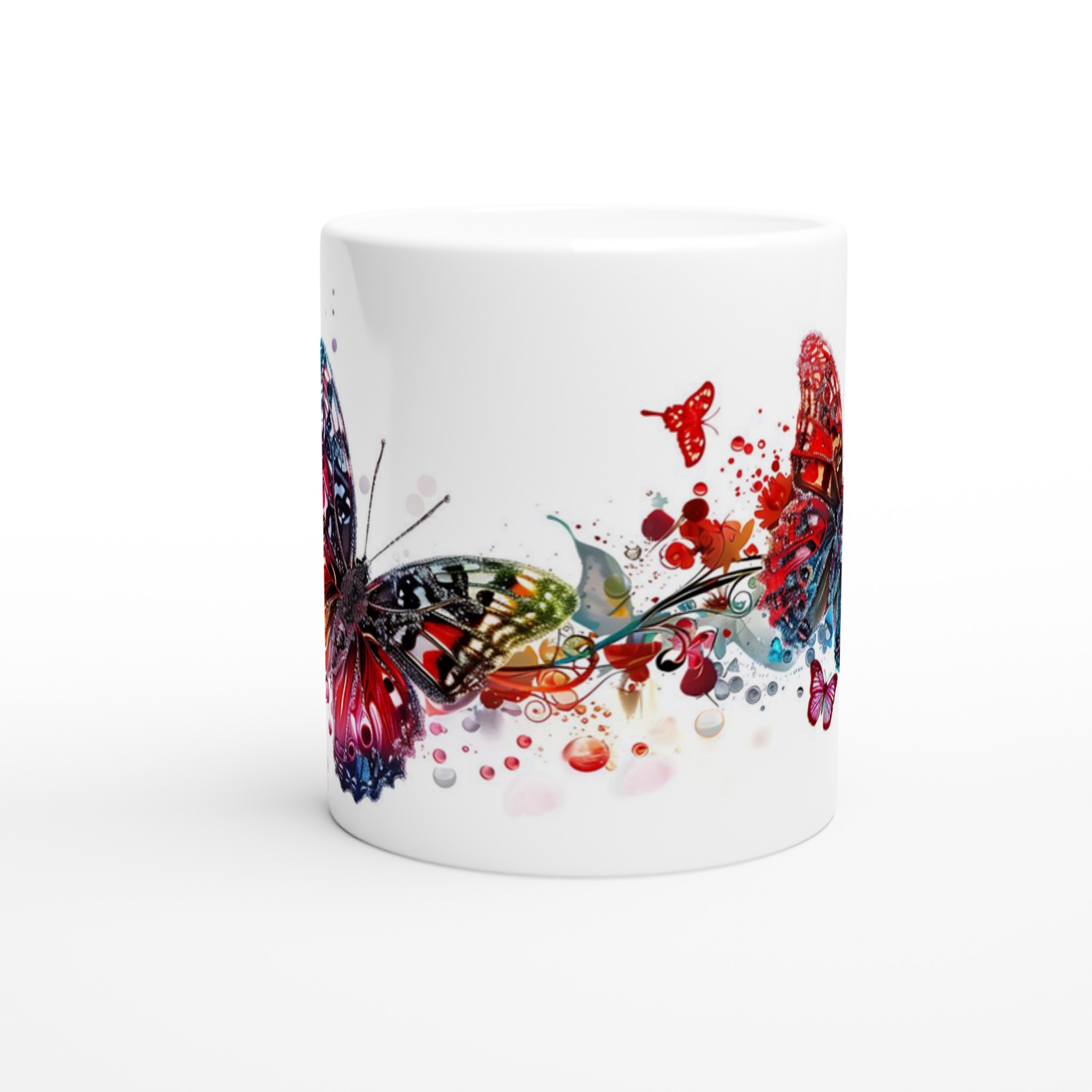 Låt varje klunk bli en konstupplevelse med denna förtrollande keramikmugg. Inspirerad av bilden av svävande fjärilar och drömska färgkaskader, är den designad för att lyfta fram skönhet i din vardag. Perfekt för morgonkaffet, kvällens varma choklad eller när du bara vill njuta av en kopp te. Den blanka vita ytan gör att trycken framhävs med klara och levande färger, som håller sig fina även efter många turer i mikron och diskmaskinen.