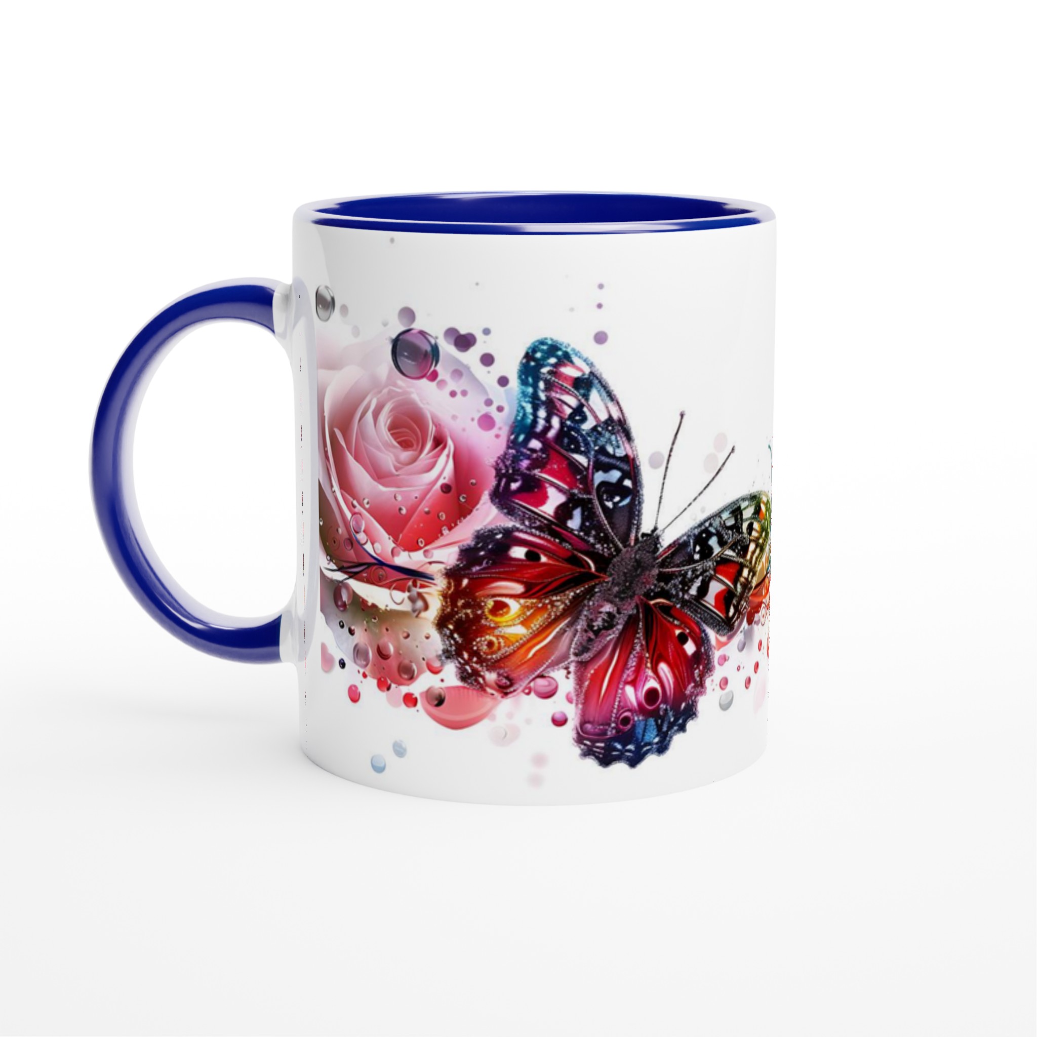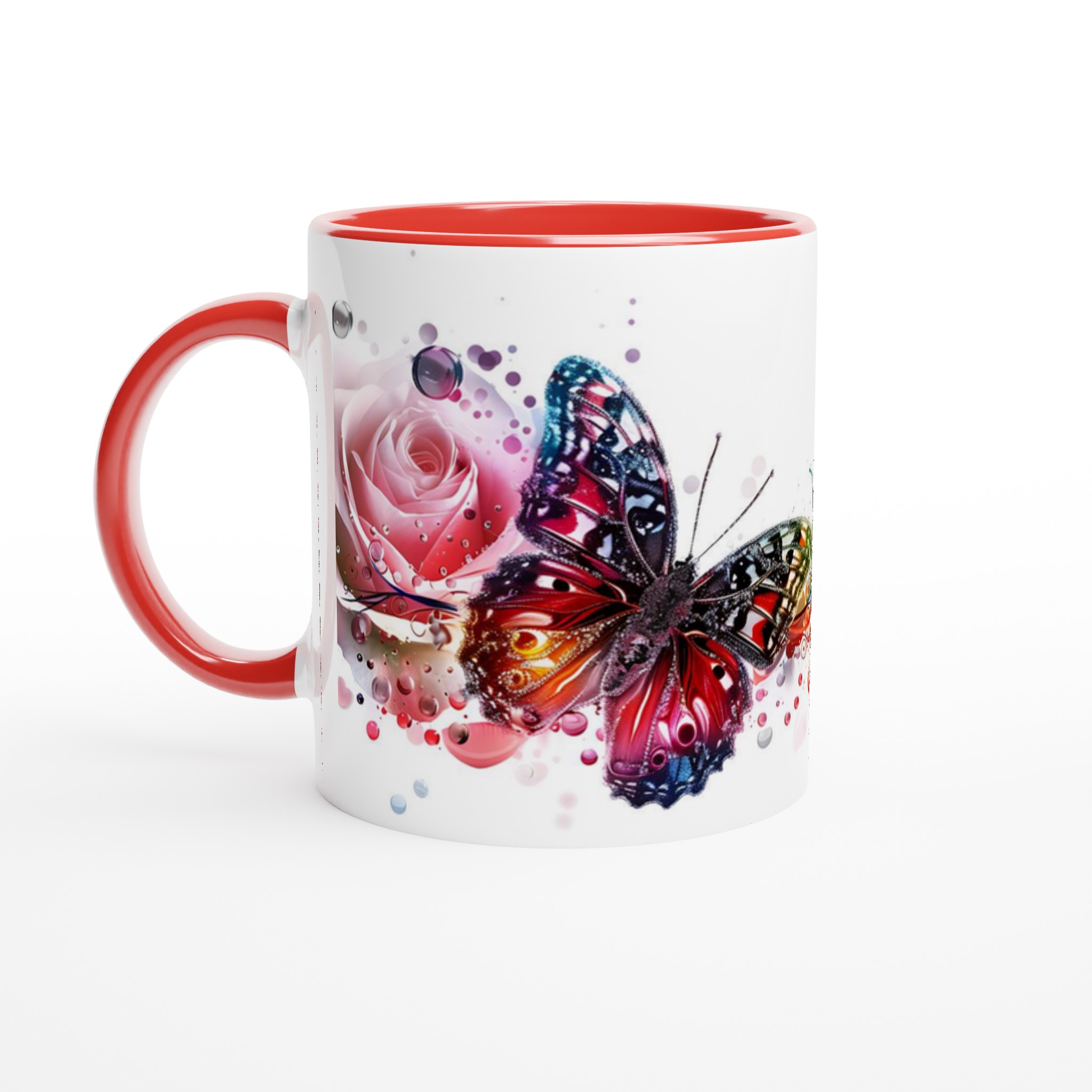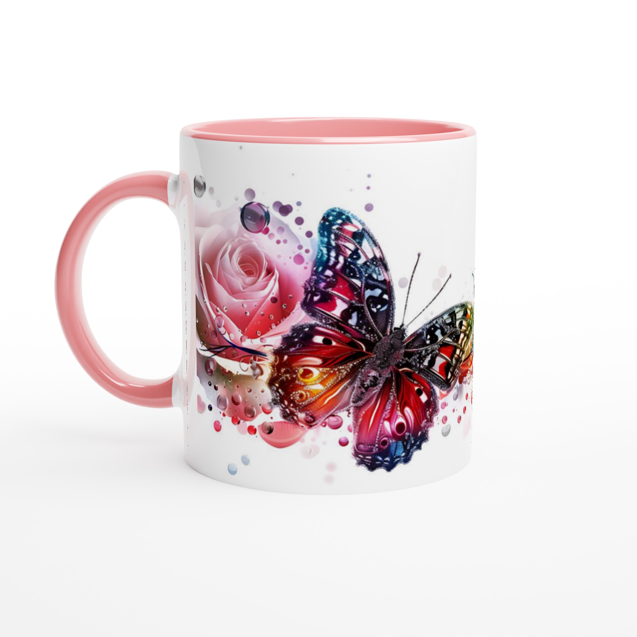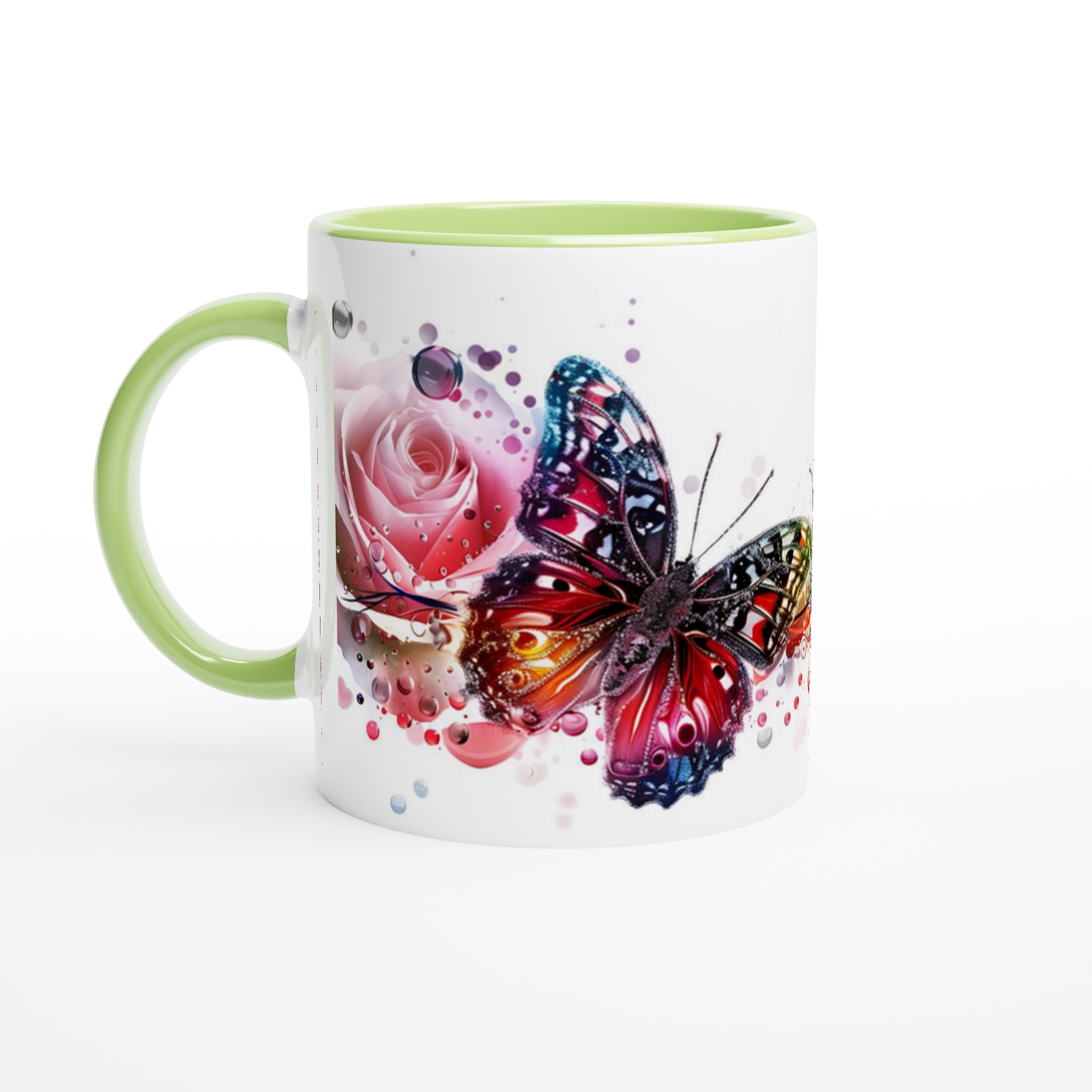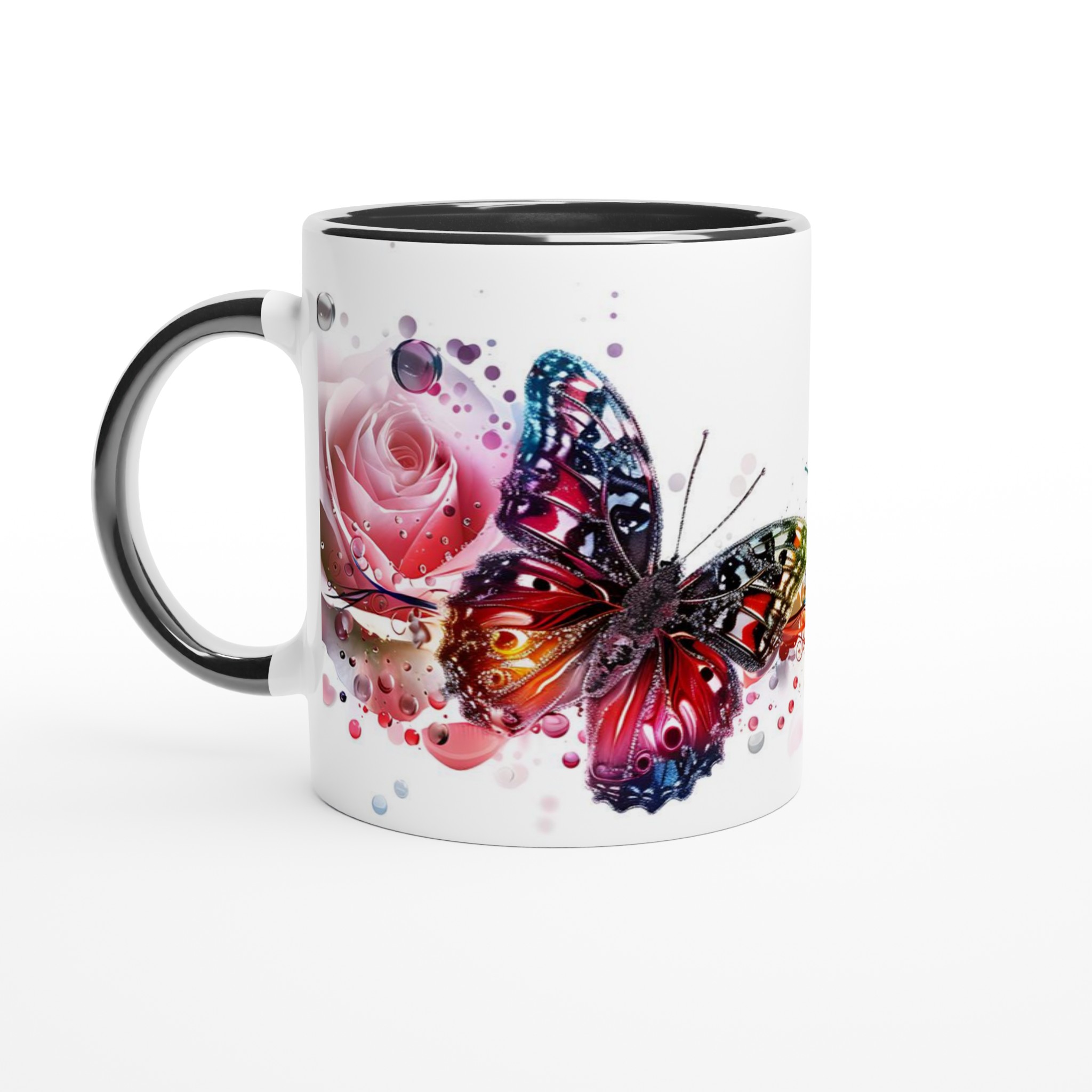Låt varje klunk bli en konstupplevelse med denna förtrollande keramikmugg. Inspirerad av bilden av svävande fjärilar och drömska färgkaskader, är den designad för att lyfta fram skönhet i din vardag. Perfekt för morgonkaffet, kvällens varma choklad eller när du bara vill njuta av en kopp te. Den blanka vita ytan gör att trycken framhävs med klara och levande färger, som håller sig fina även efter många turer i mikron och diskmaskinen.