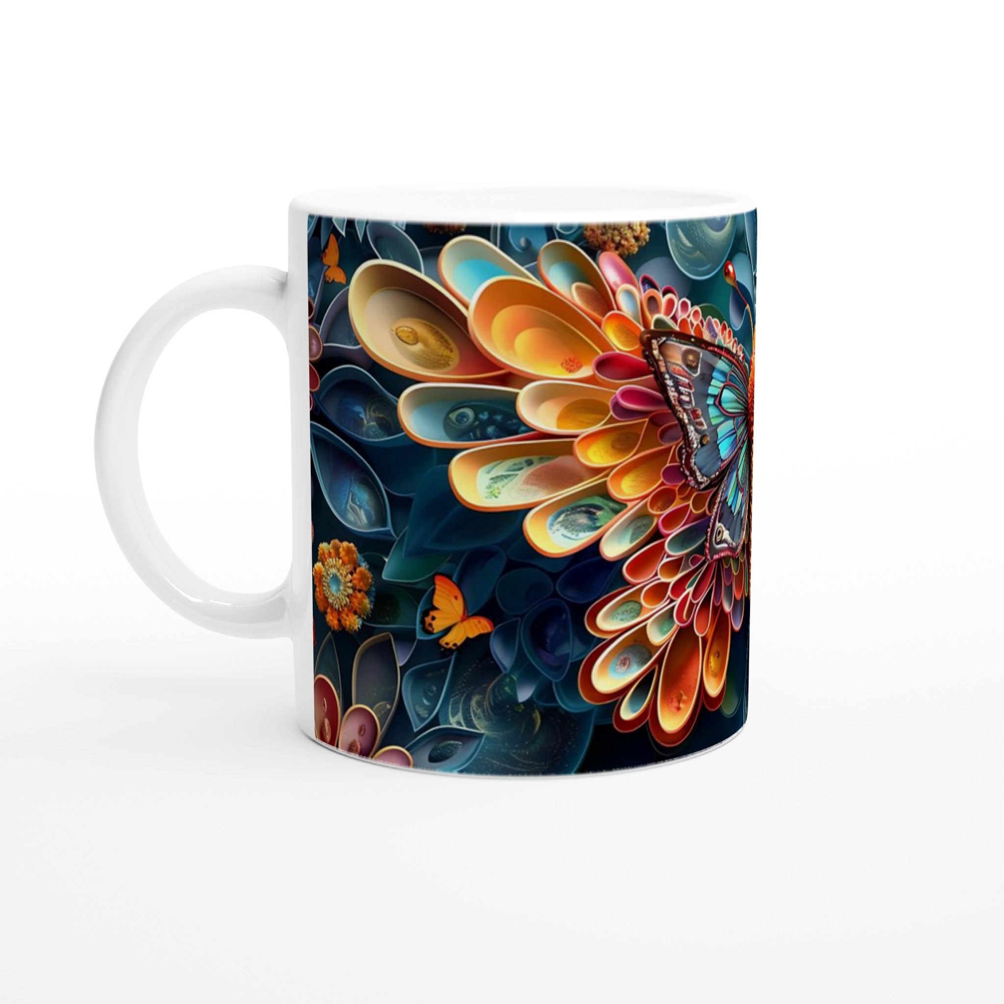 Låt dina sinnen flyga iväg med denna förtrollande keramiska mugg, prydd med en levande, konstnärlig fjärilsdesign. Färgexplosionen av djupblått, vibrerande orange och turkos skapar en känsla av mystik och skönhet, perfekt för dig som älskar att omge dig med unika och inspirerande föremål. Varje sipp blir en stund av eftertanke och skönhet, oavsett om det är morgonkaffet, en värmande kopp te eller en härlig varm choklad.