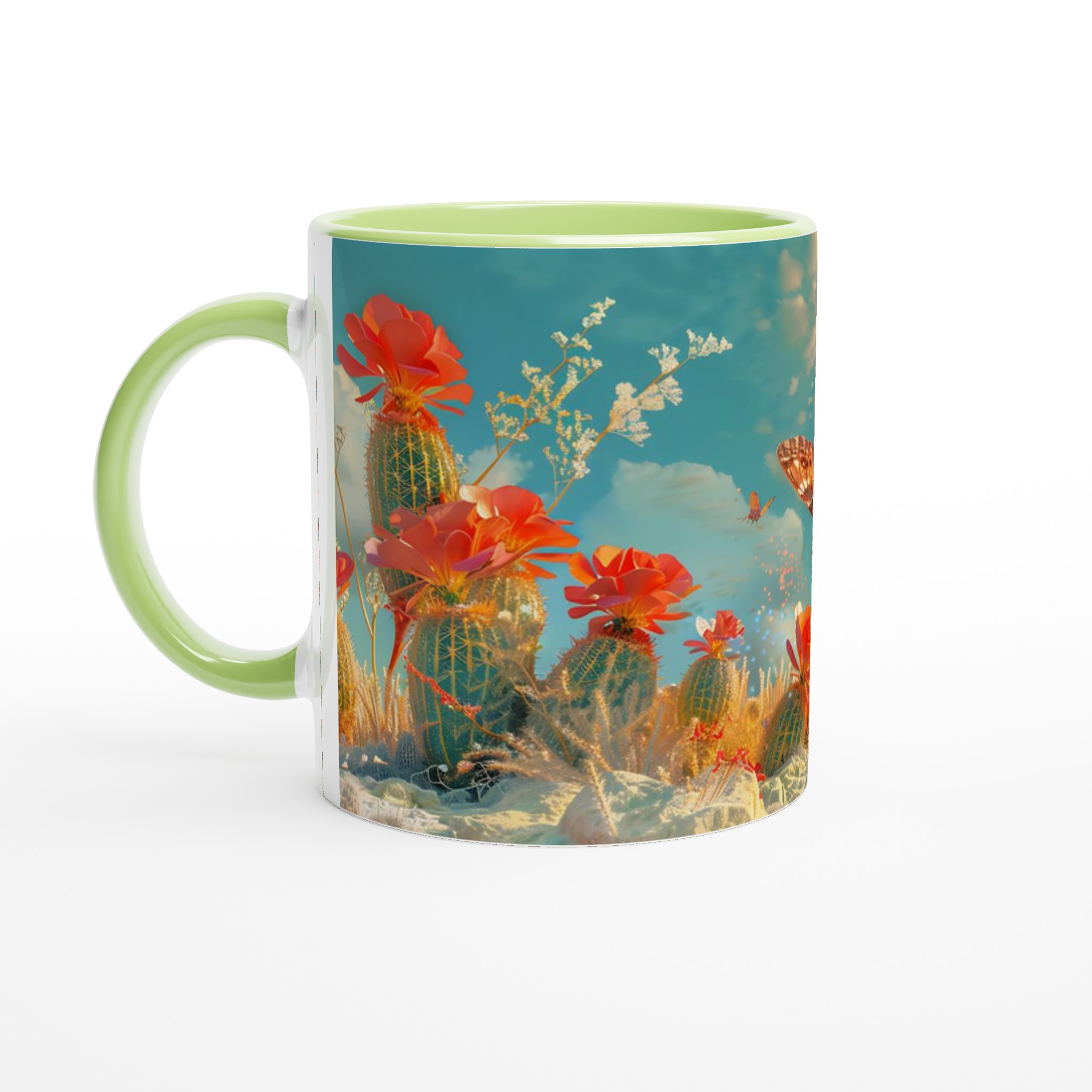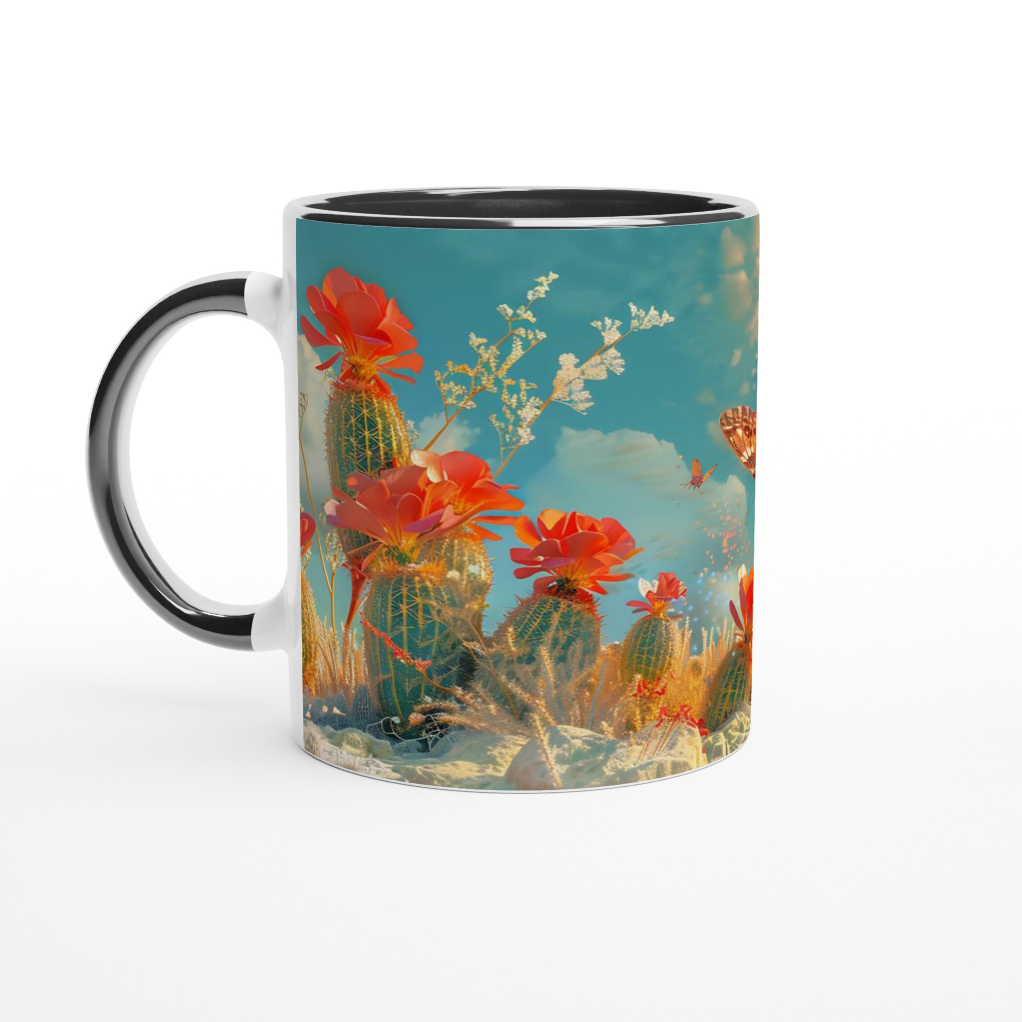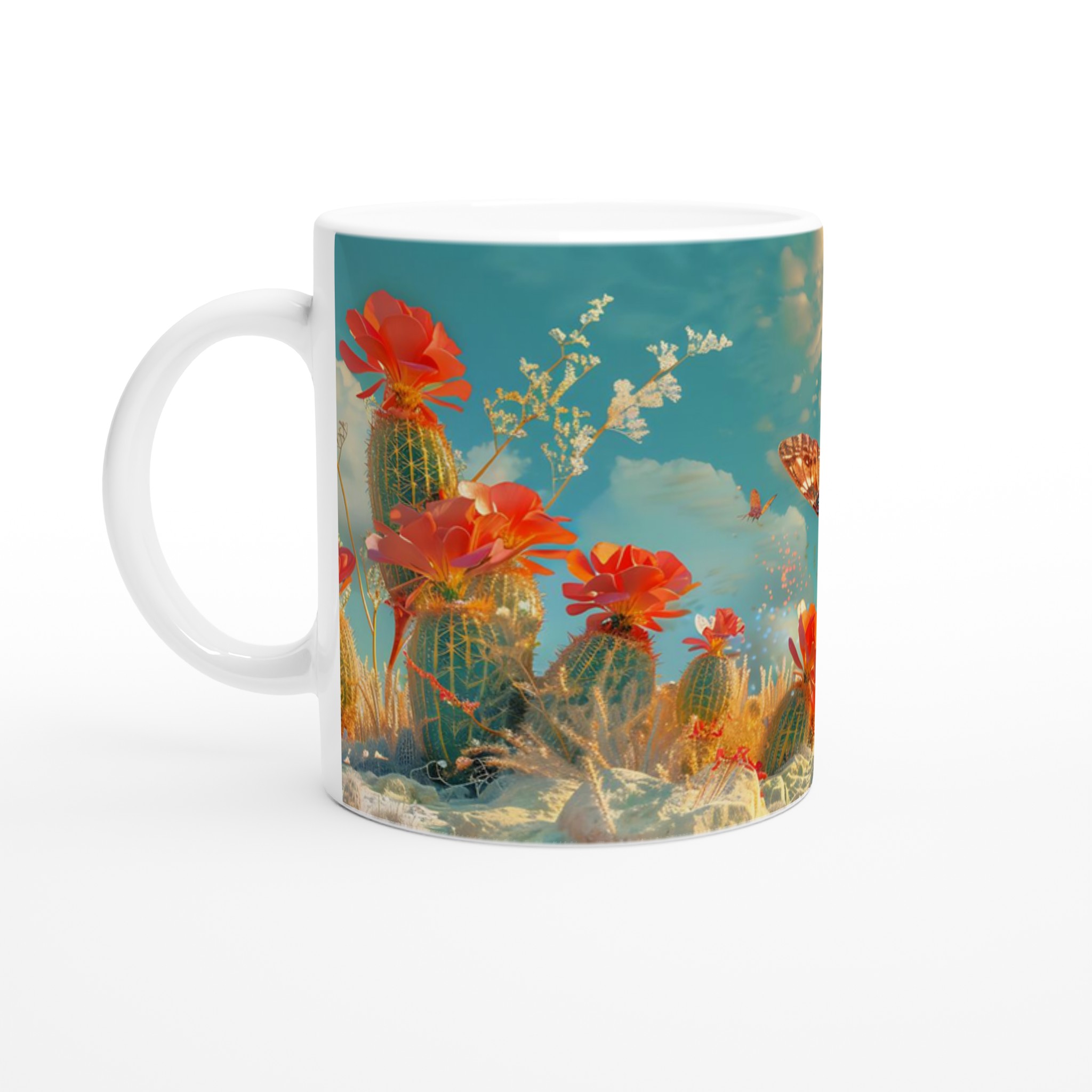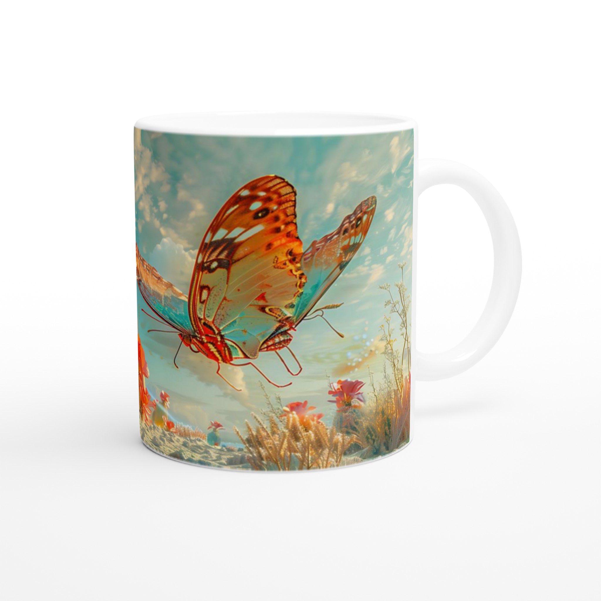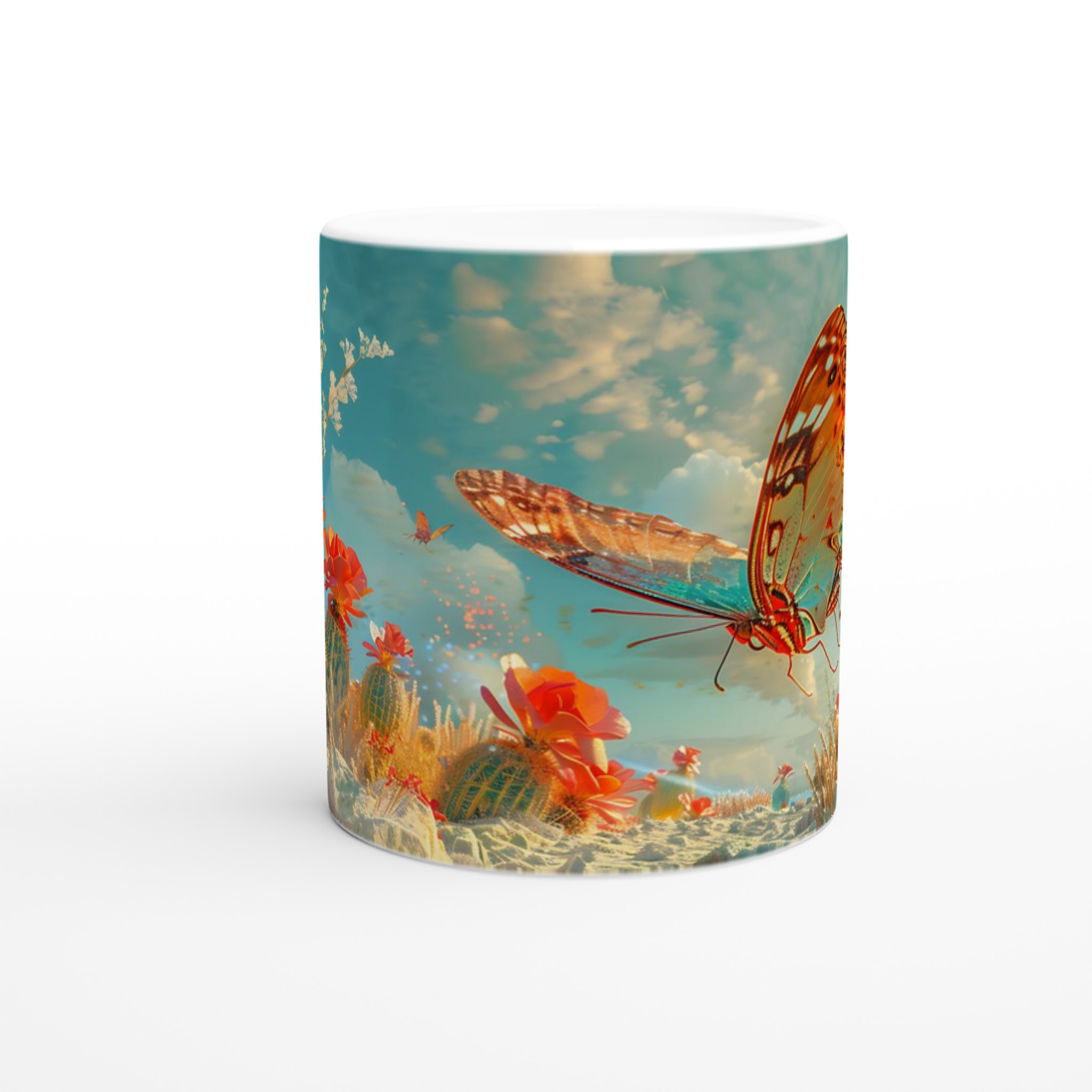Vakna till liv med en touch av magi varje morgon! Denna charmiga keramiska mugg fångar den eteriska skönheten hos fjärilar som svävar över en förtrollad ökenoas, med levande korallblommor och en himmel i turkos och guld. Den levande, drömlika designen är perfekt för den som uppskattar konst och vill lägga till en gnista av förundran i sin dagliga rutin. Låt denna mugg inspirera dig att flyga fritt, precis som fjärilarna på den!