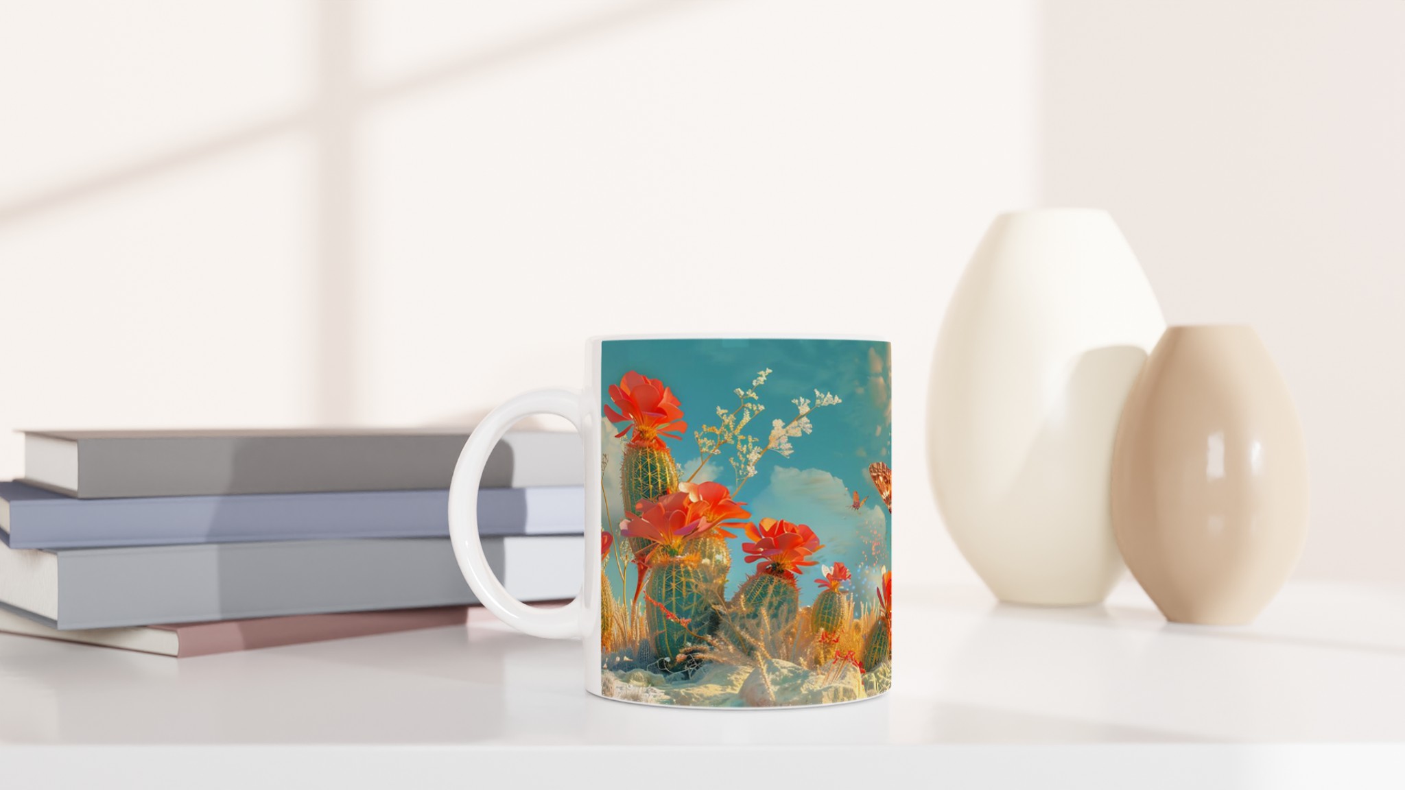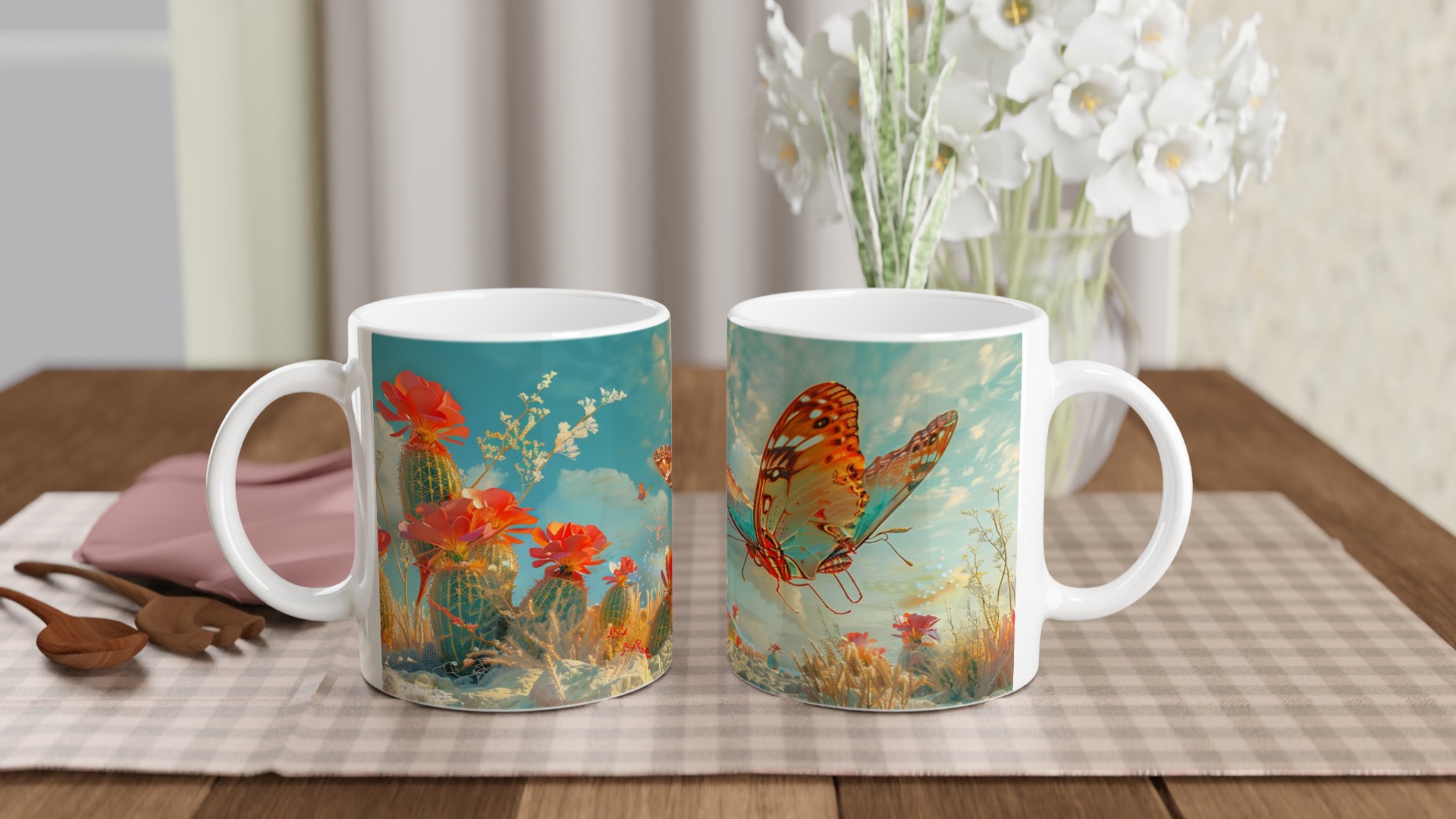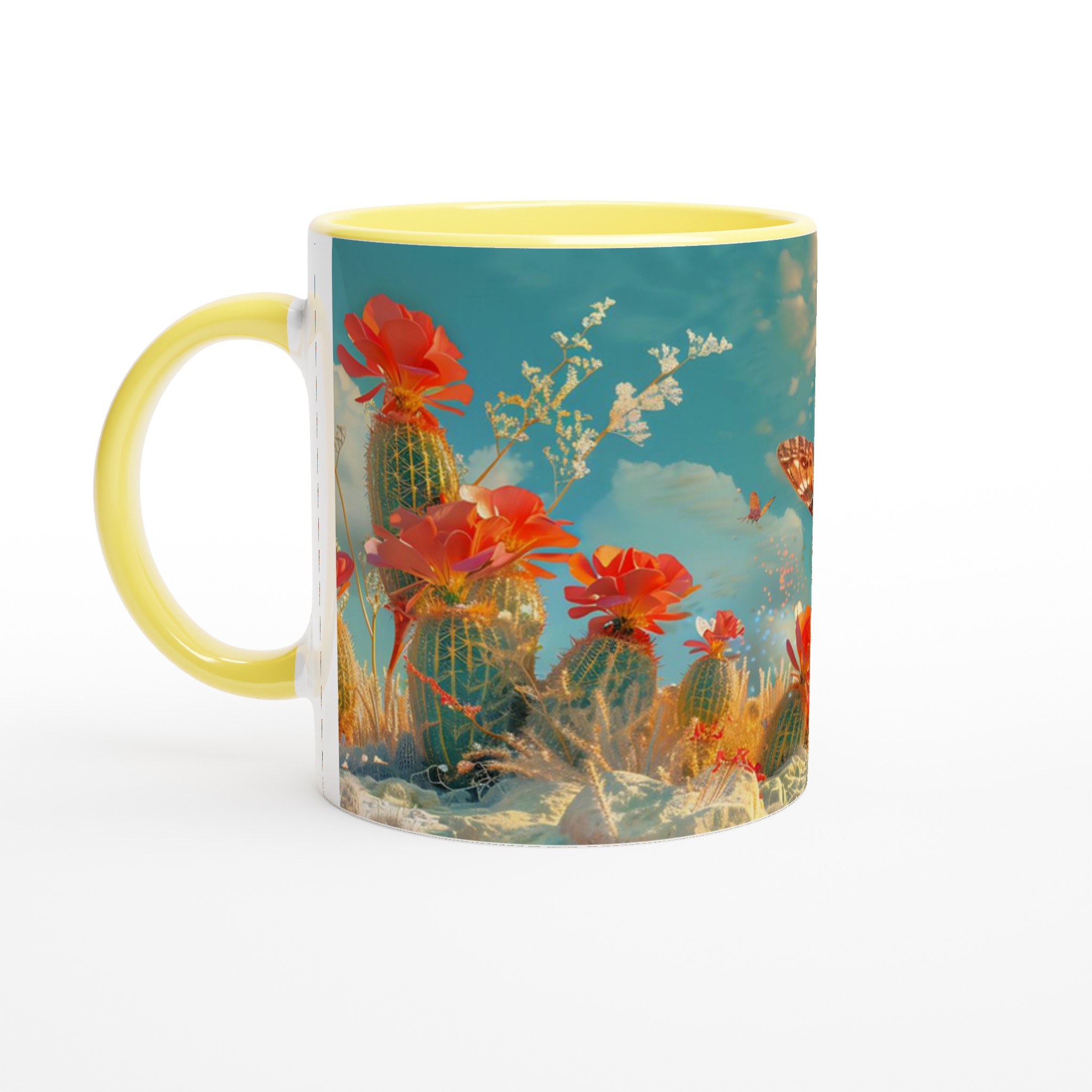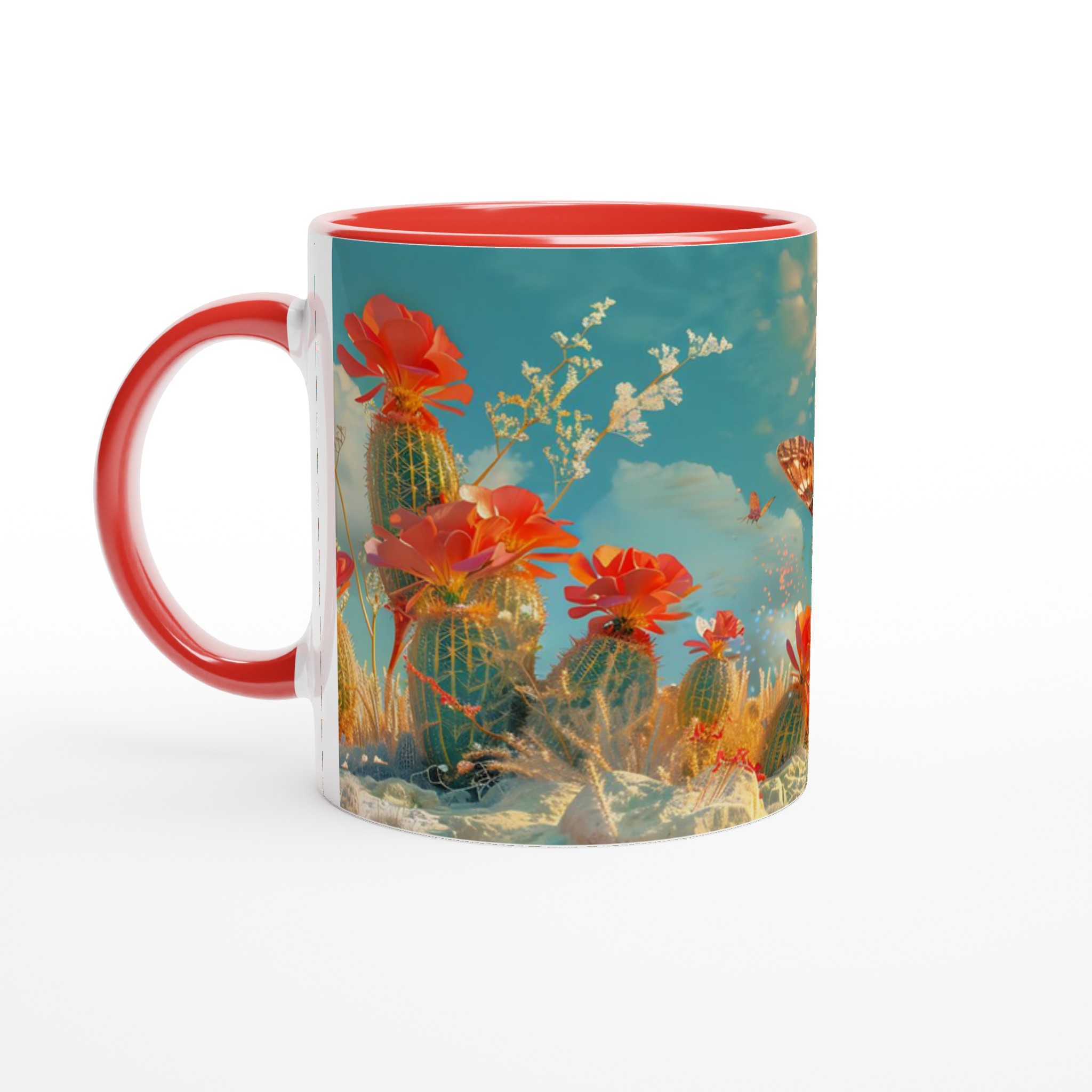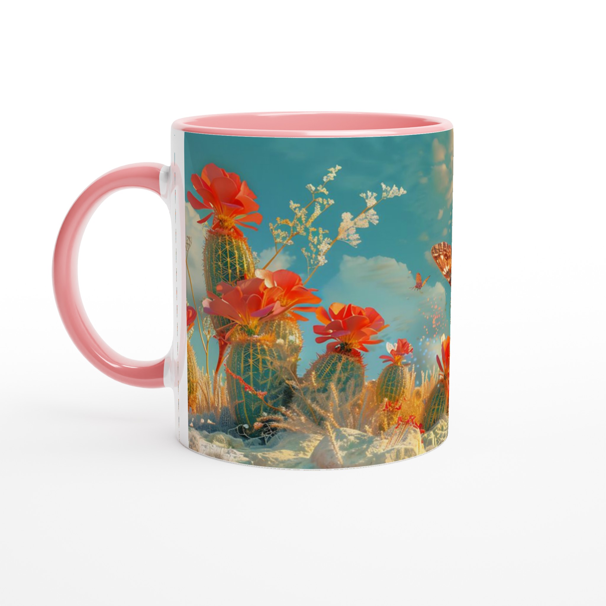 Vakna till liv med en touch av magi varje morgon! Denna charmiga keramiska mugg fångar den eteriska skönheten hos fjärilar som svävar över en förtrollad ökenoas, med levande korallblommor och en himmel i turkos och guld. Den levande, drömlika designen är perfekt för den som uppskattar konst och vill lägga till en gnista av förundran i sin dagliga rutin. Låt denna mugg inspirera dig att flyga fritt, precis som fjärilarna på den!