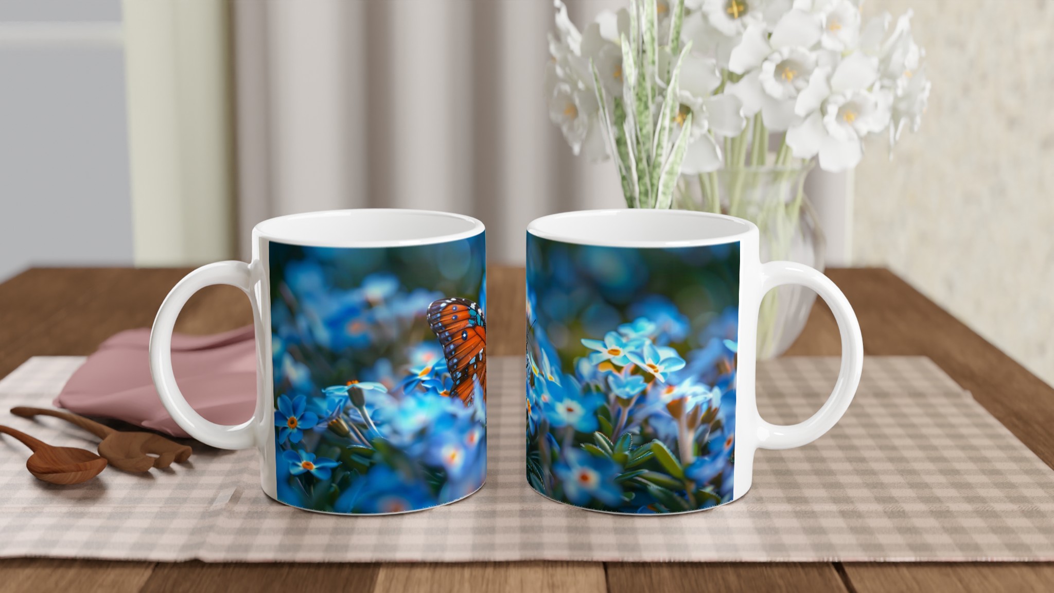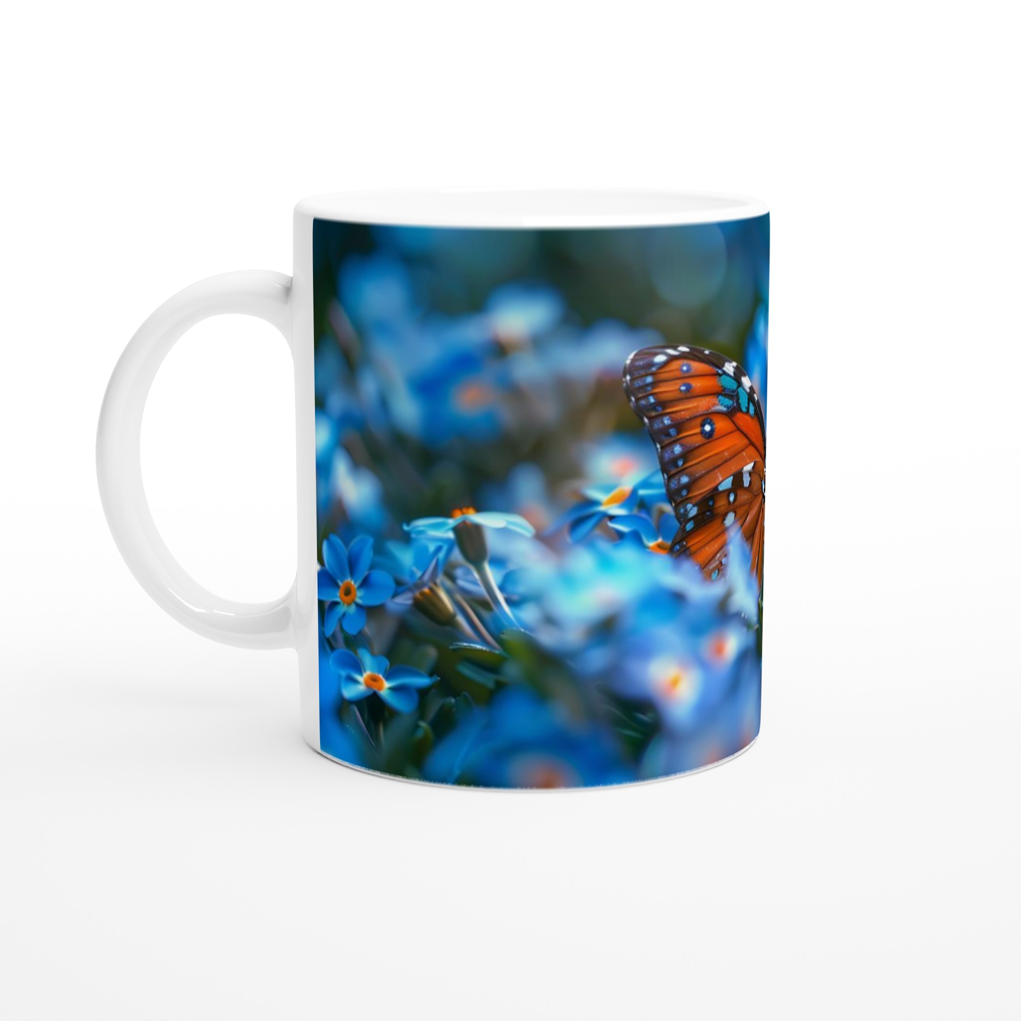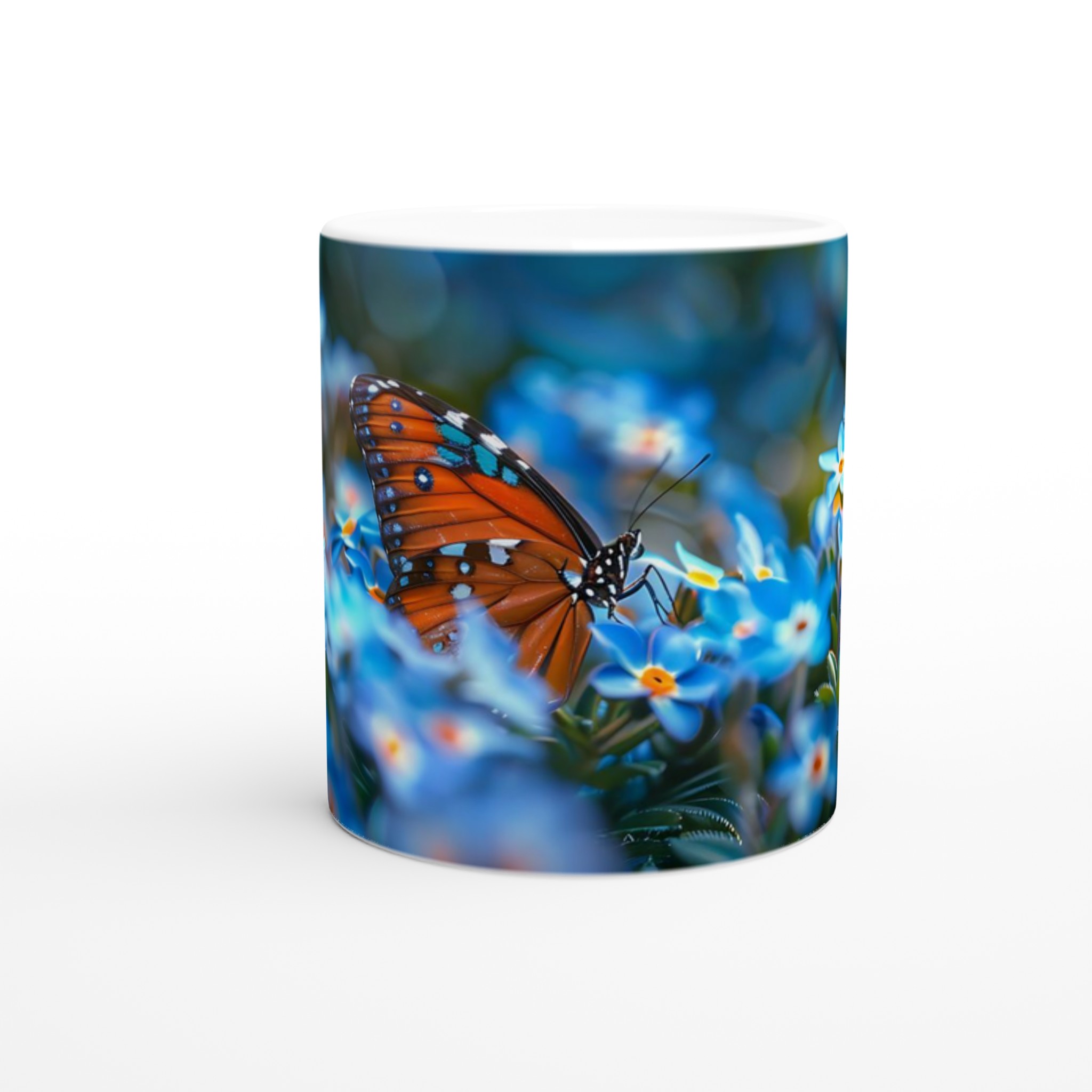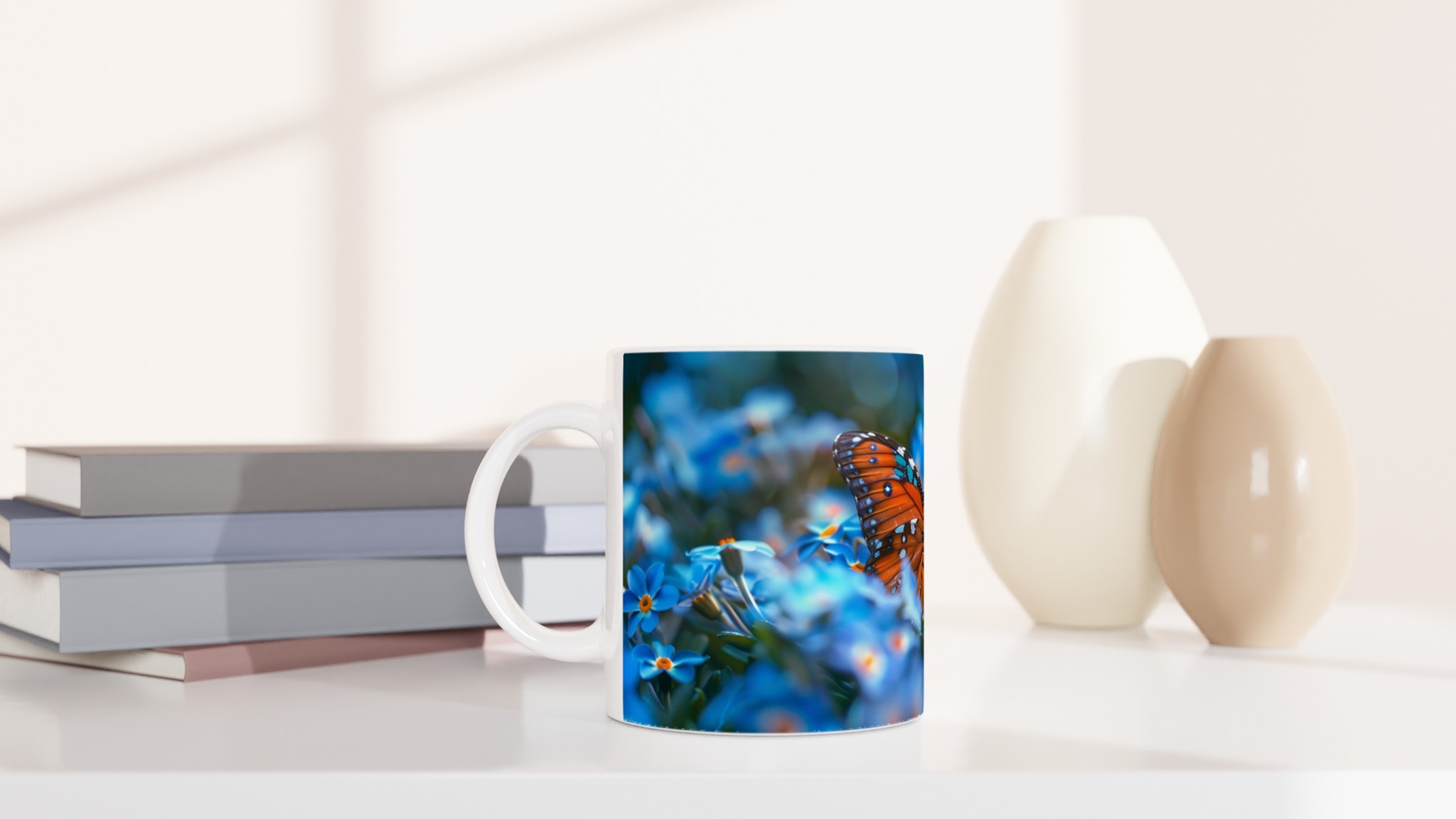 Låt dig förtrollas varje gång du tar en klunk! Den här stilrena keramiska muggen, med sitt drömska motiv av en orange fjäril som vilar bland dimmigt blåa blommor, blir snabbt en vardagsfavorit. Perfekt för morgonkaffet, kvällens varma choklad eller när du bara vill njuta av en kopp te. Den blanka ytan gör att trycket framhävs med klara och levande färger, som håller sig fina även efter många turer i mikron och diskmaskinen.