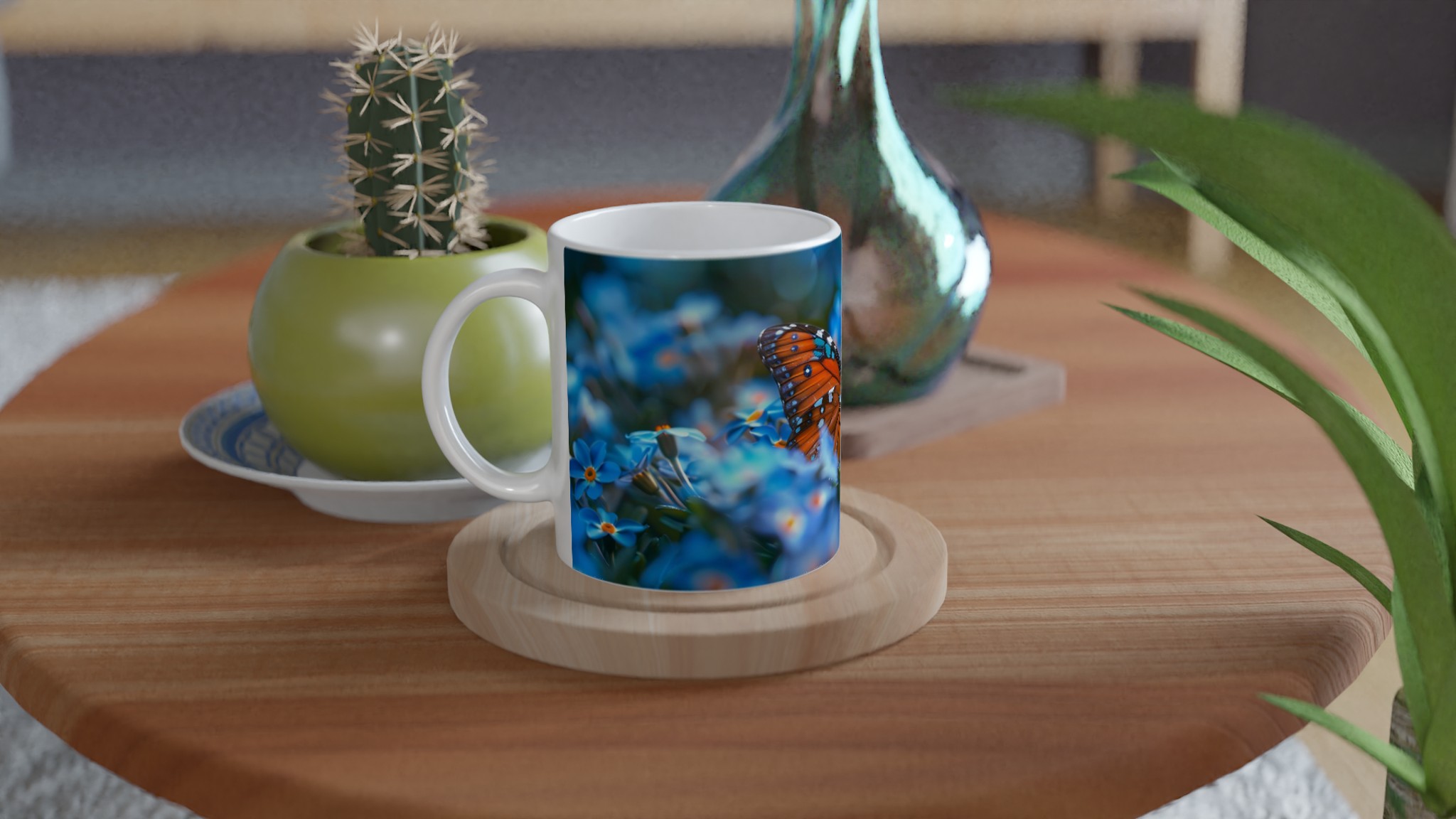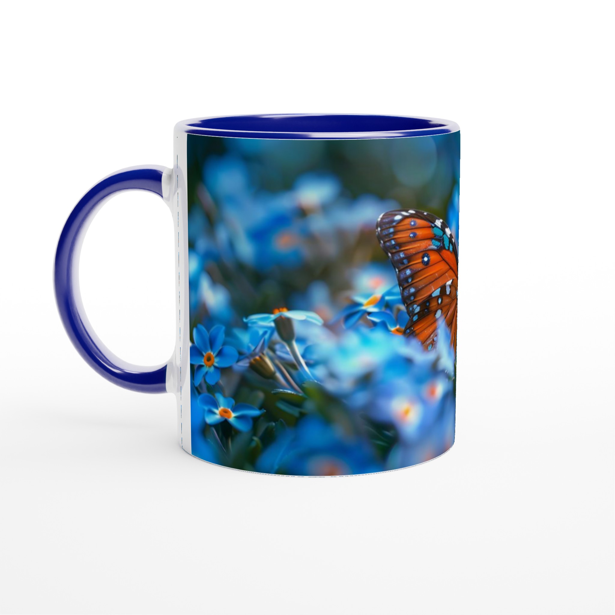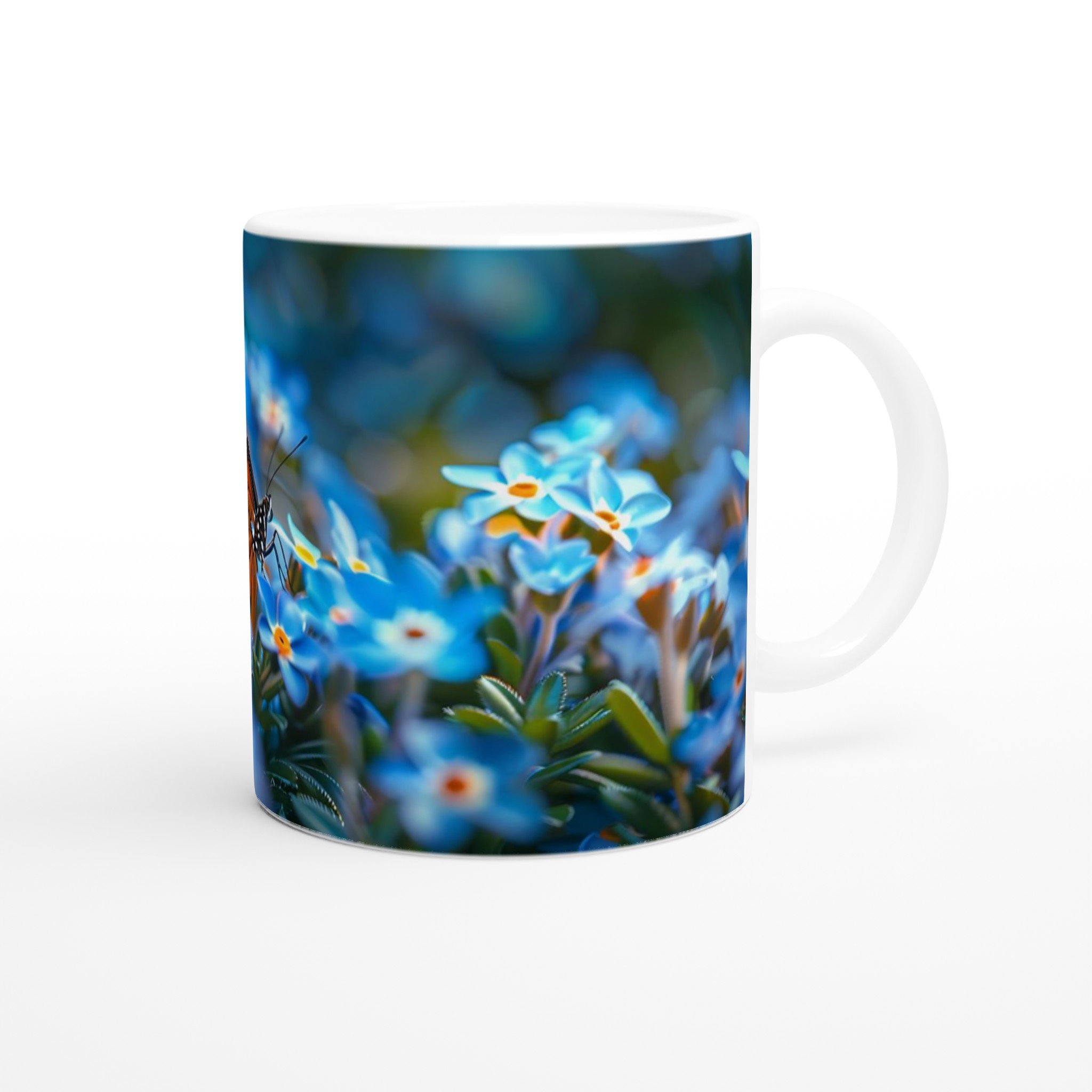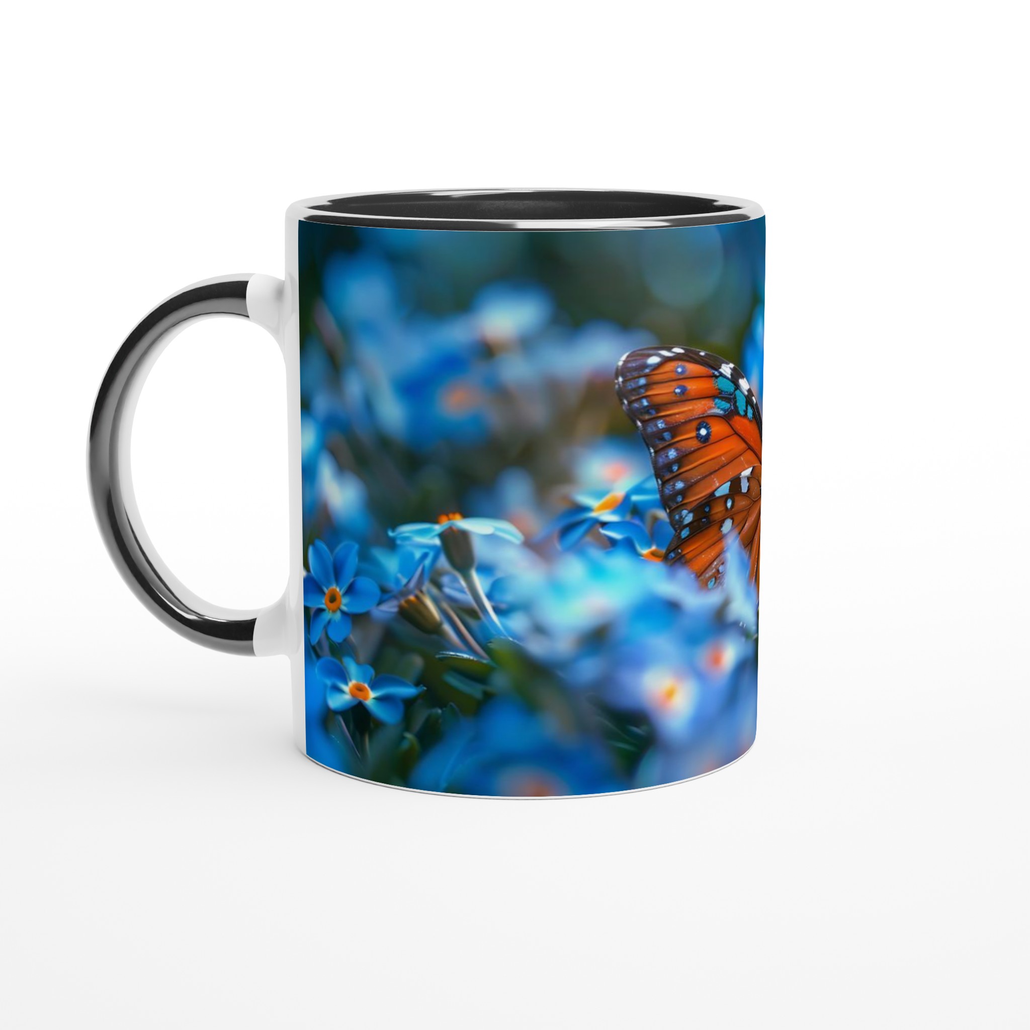 Låt dig förtrollas varje gång du tar en klunk! Den här stilrena keramiska muggen, med sitt drömska motiv av en orange fjäril som vilar bland dimmigt blåa blommor, blir snabbt en vardagsfavorit. Perfekt för morgonkaffet, kvällens varma choklad eller när du bara vill njuta av en kopp te. Den blanka ytan gör att trycket framhävs med klara och levande färger, som håller sig fina även efter många turer i mikron och diskmaskinen.