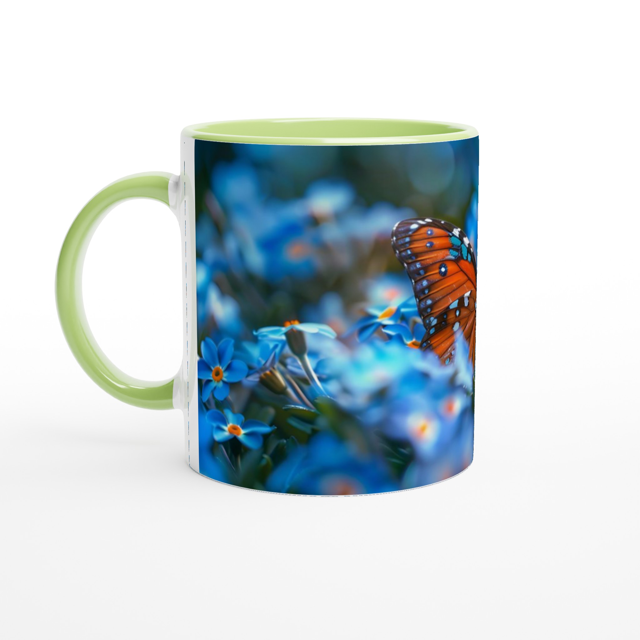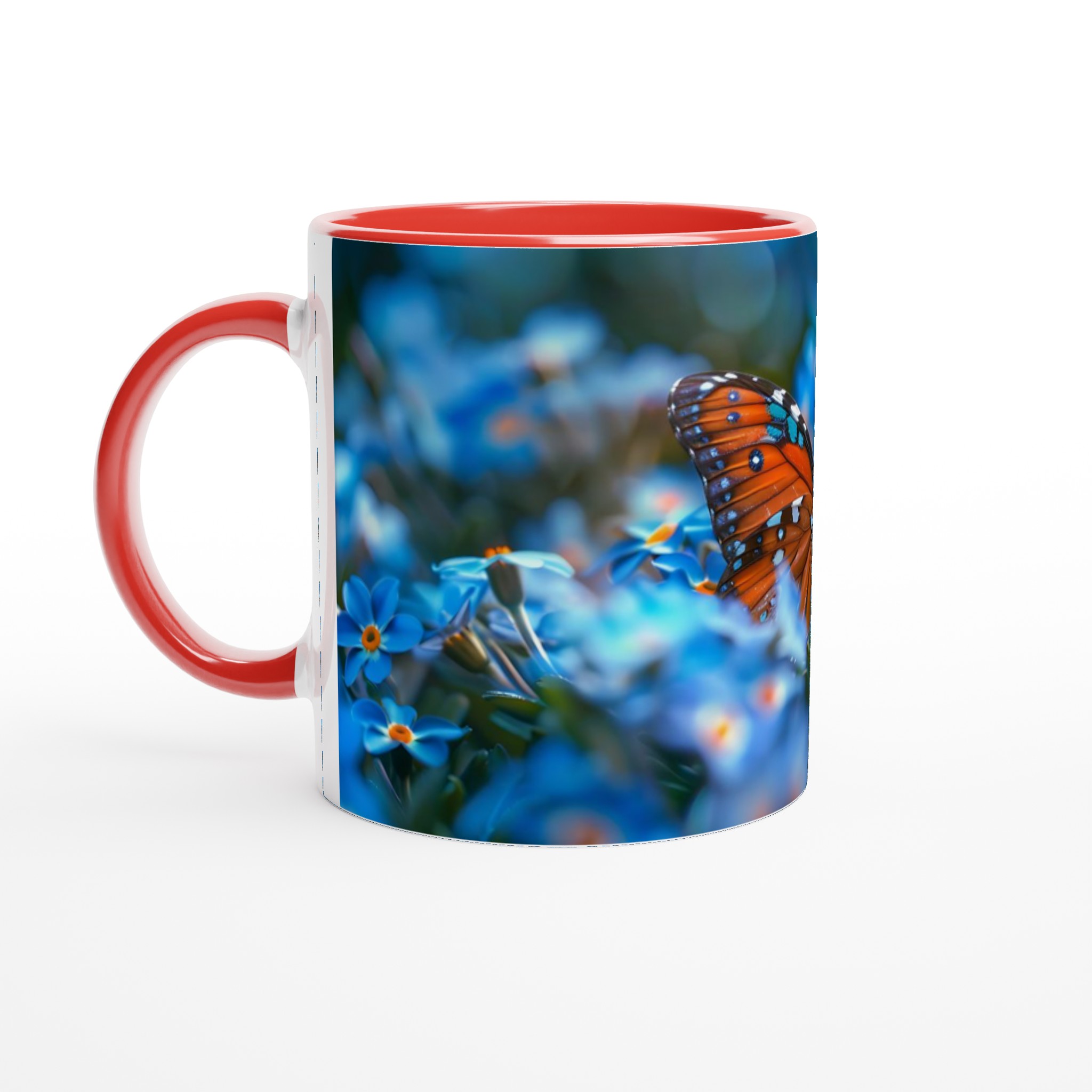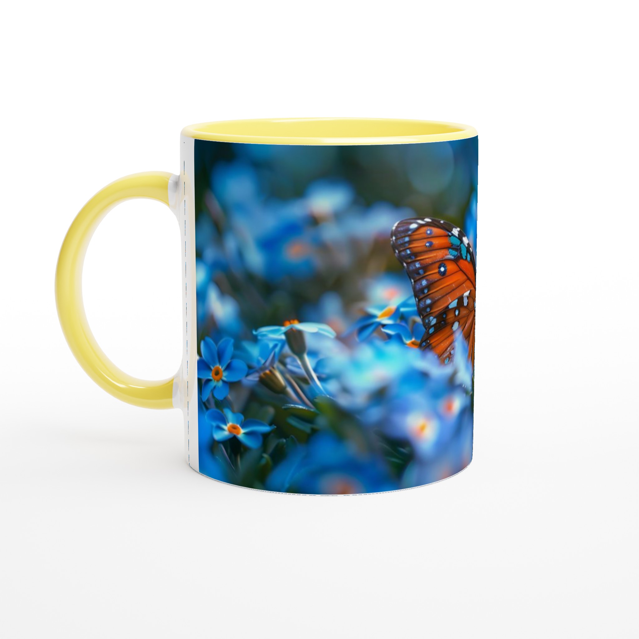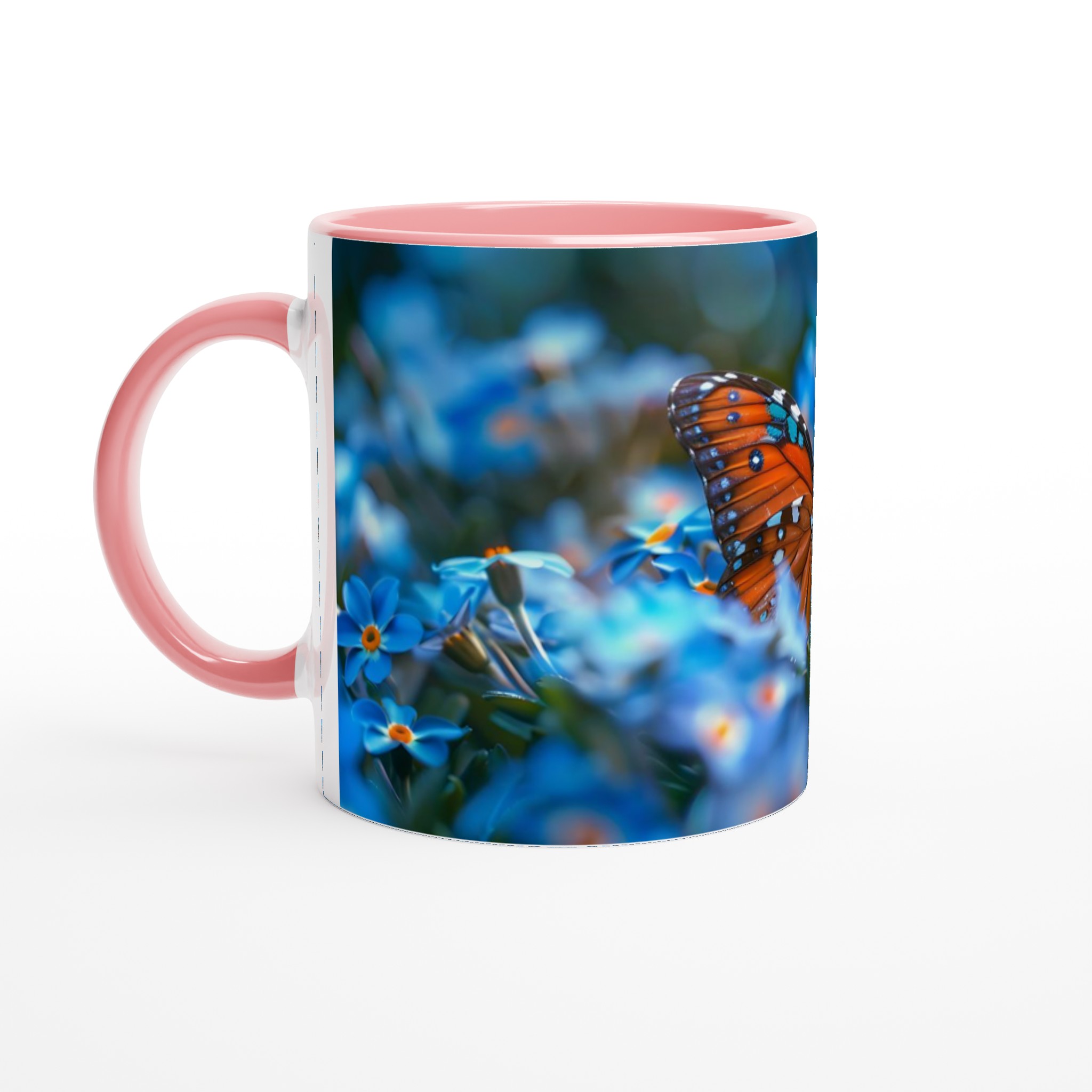 Låt dig förtrollas varje gång du tar en klunk! Den här stilrena keramiska muggen, med sitt drömska motiv av en orange fjäril som vilar bland dimmigt blåa blommor, blir snabbt en vardagsfavorit. Perfekt för morgonkaffet, kvällens varma choklad eller när du bara vill njuta av en kopp te. Den blanka ytan gör att trycket framhävs med klara och levande färger, som håller sig fina även efter många turer i mikron och diskmaskinen.