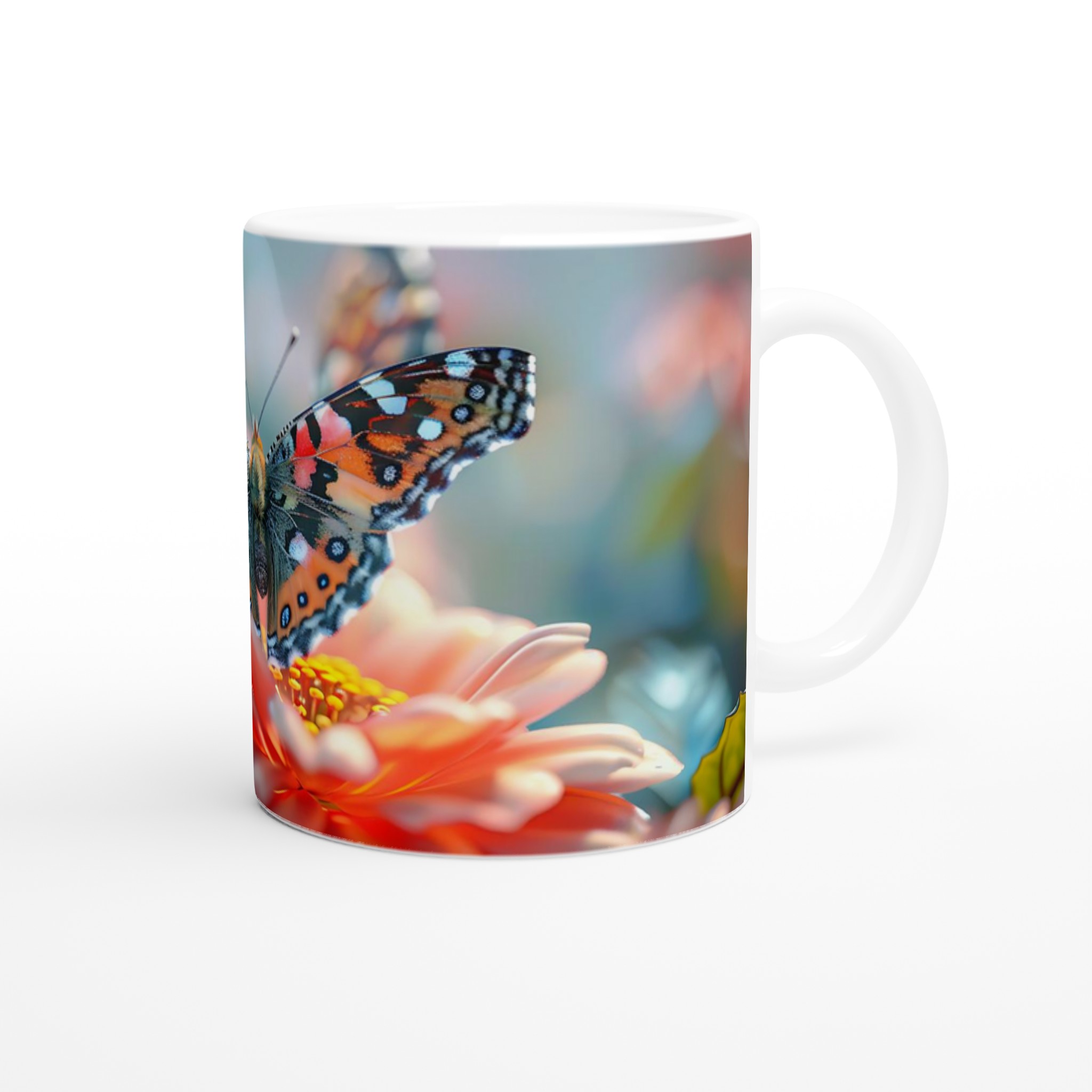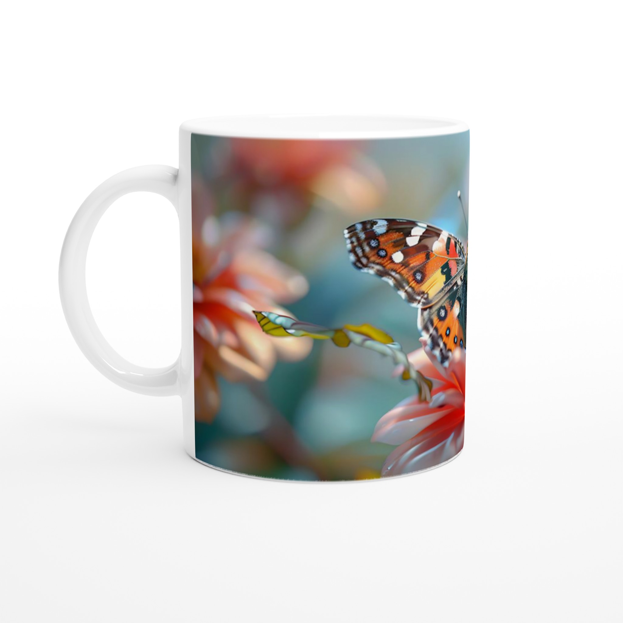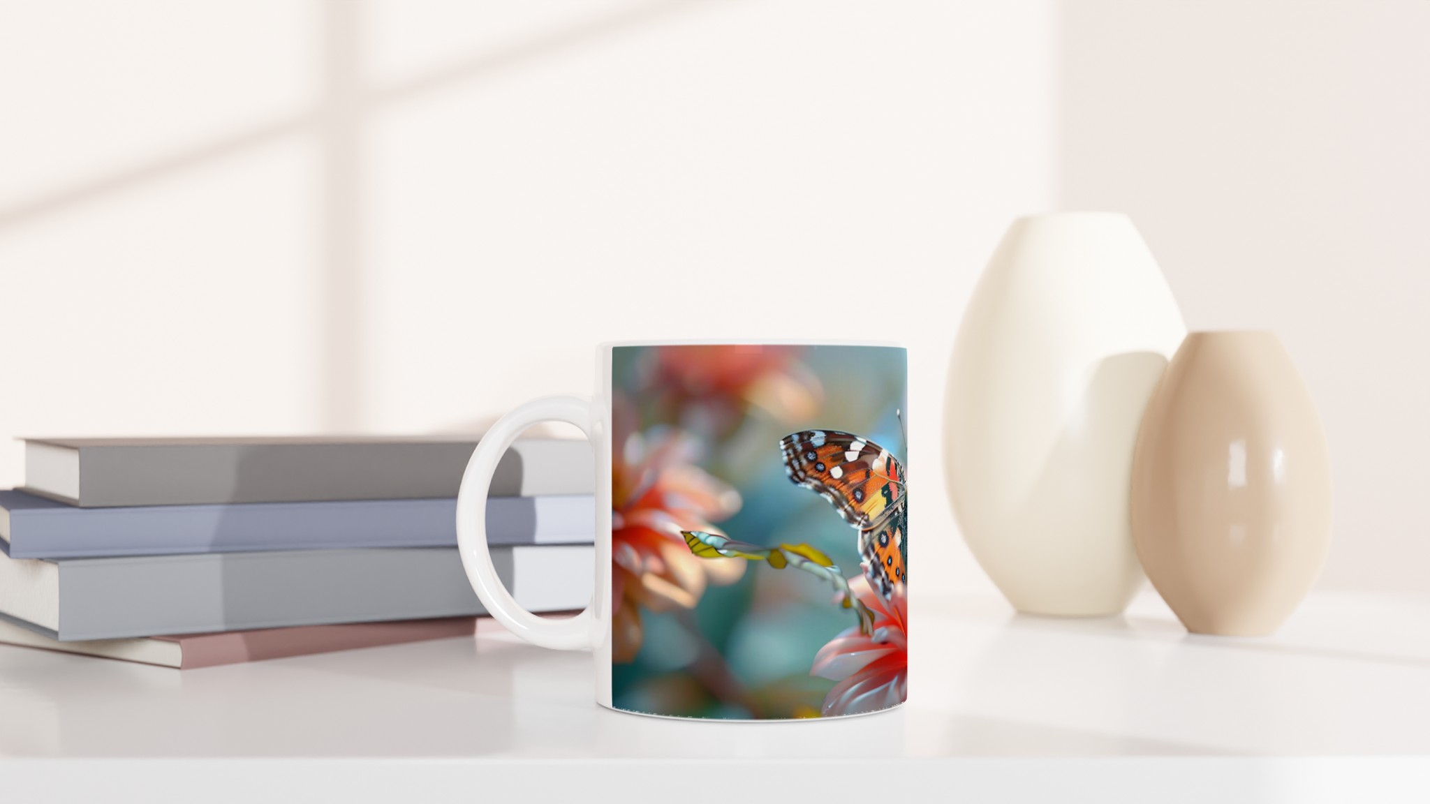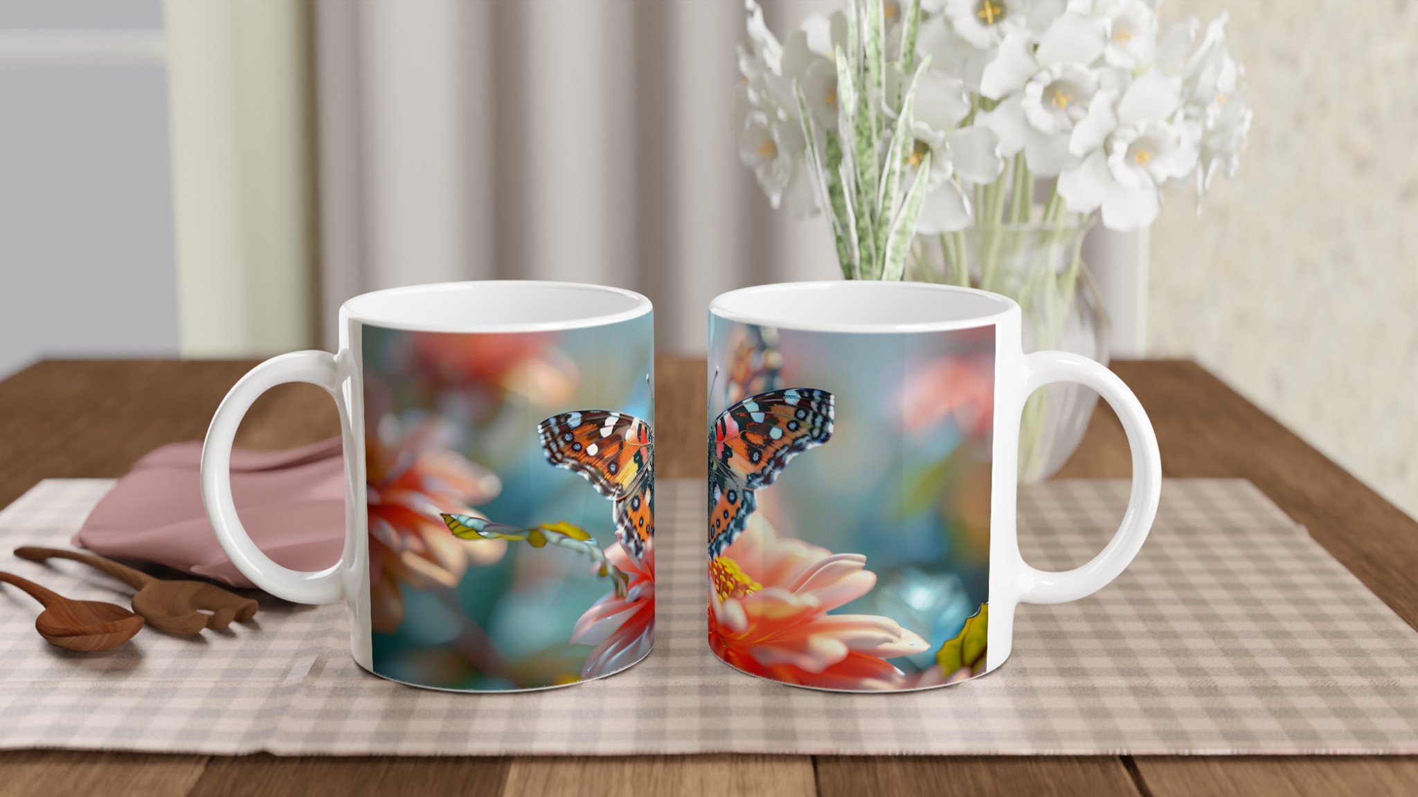 Vakna till skönheten med varje klunk ur denna Keramiska mugg. Inspirerad av fjärilens graciösa dans på blommorna, förvandlar denna mugg din fikastund till en lugn stund av naturglädje. Den här stilrena keramiska muggen blir snabbt en vardagsfavorit. Perfekt för morgonkaffet, kvällens varma choklad eller när du bara vill njuta av en kopp te. Den blanka vita ytan gör att trycken framhävs med klara och levande färger, som håller sig fina även efter många turer i mikron och diskmaskinen.