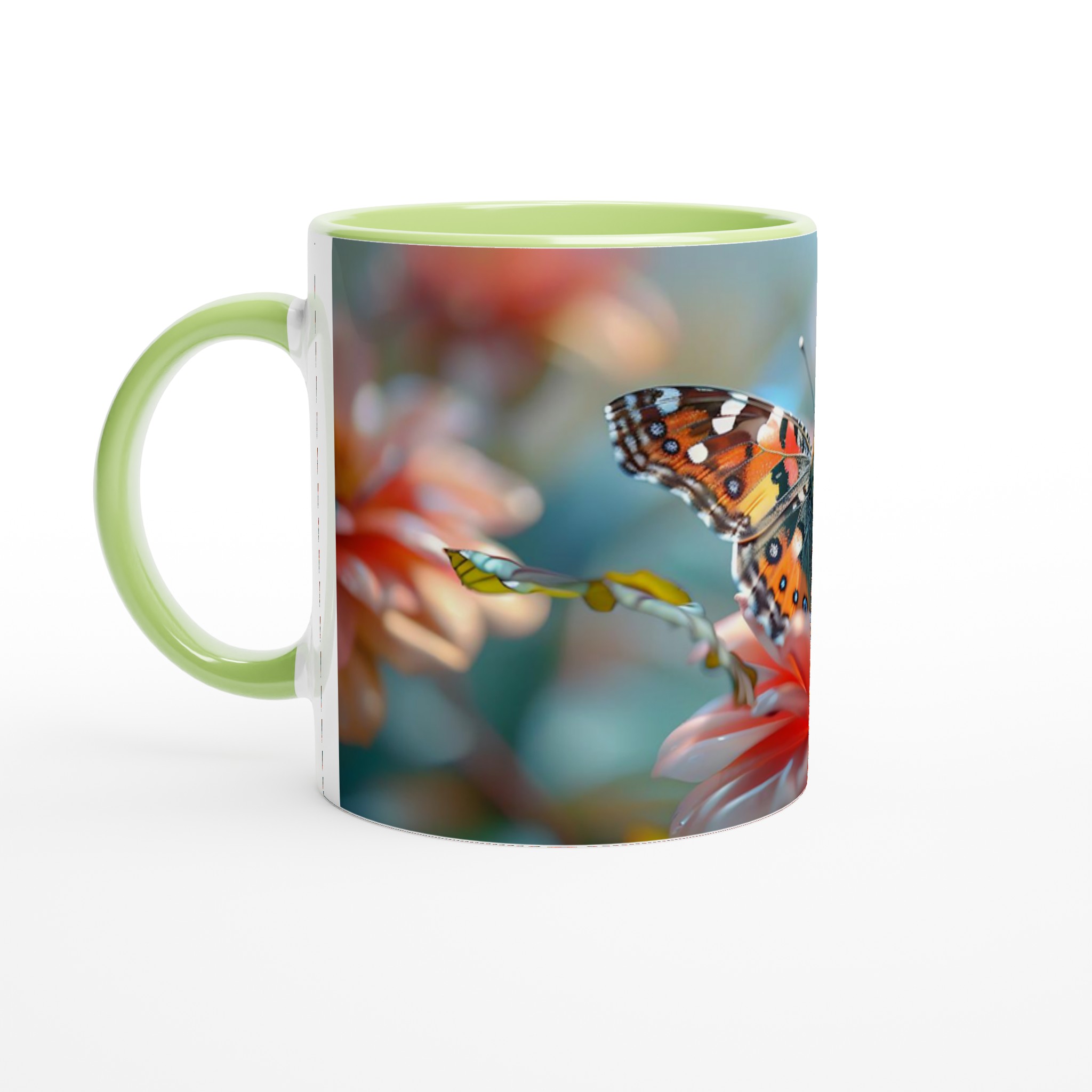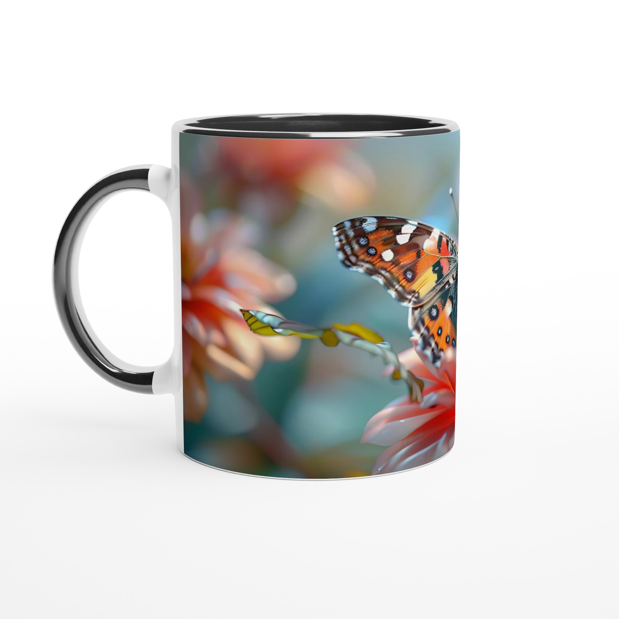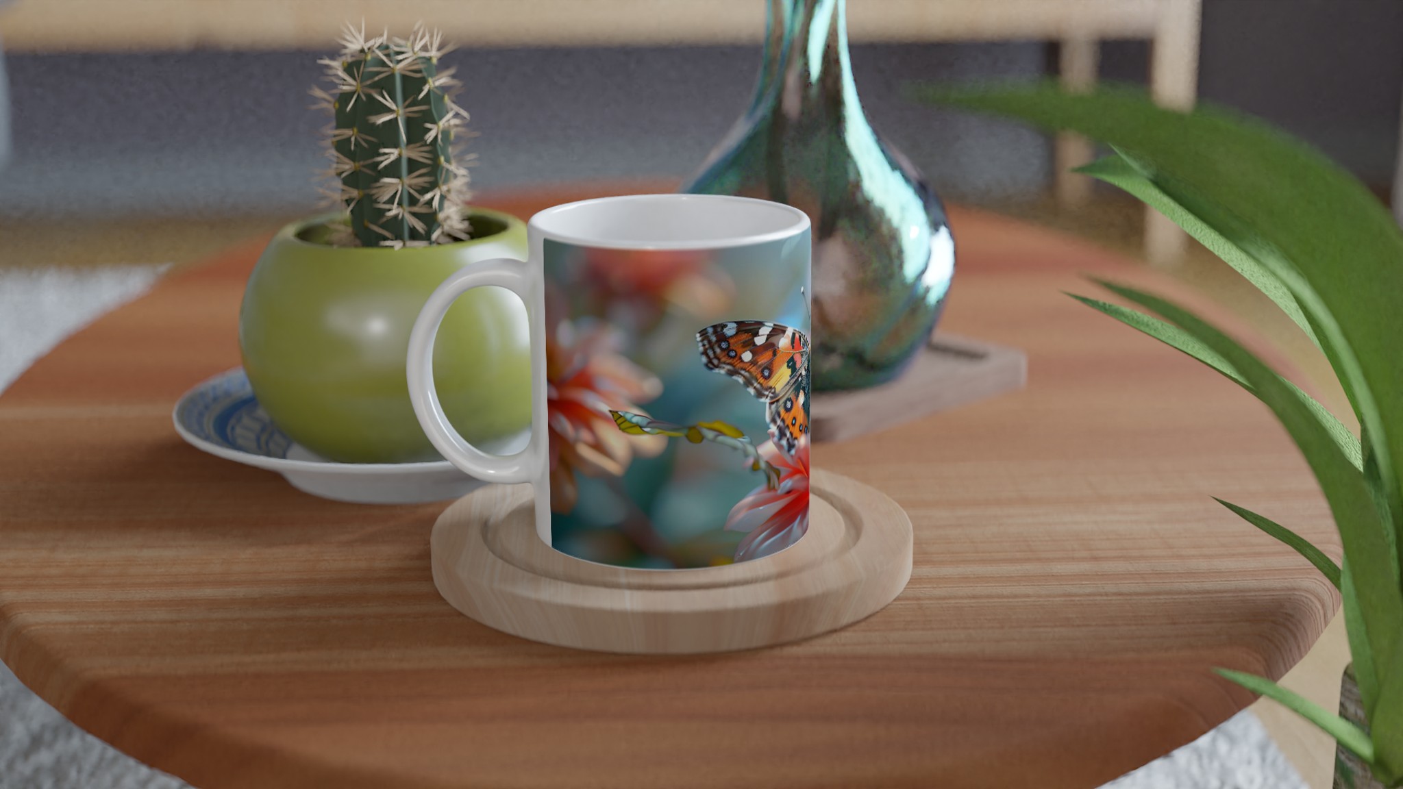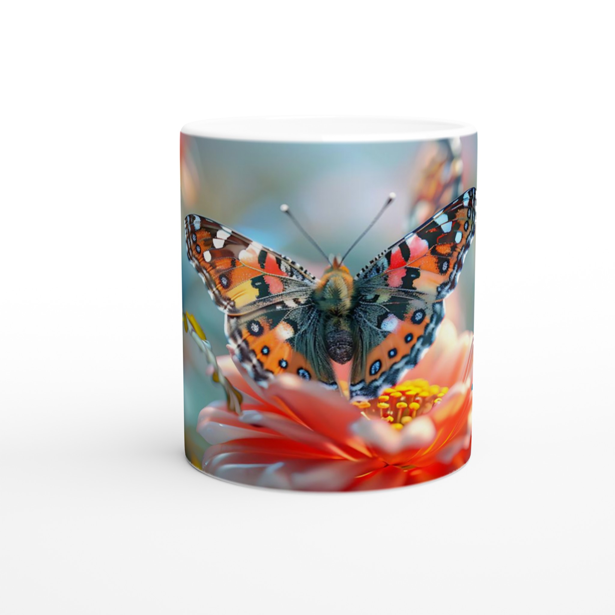 Vakna till skönheten med varje klunk ur denna Keramiska mugg. Inspirerad av fjärilens graciösa dans på blommorna, förvandlar denna mugg din fikastund till en lugn stund av naturglädje. Den här stilrena keramiska muggen blir snabbt en vardagsfavorit. Perfekt för morgonkaffet, kvällens varma choklad eller när du bara vill njuta av en kopp te. Den blanka vita ytan gör att trycken framhävs med klara och levande färger, som håller sig fina även efter många turer i mikron och diskmaskinen.