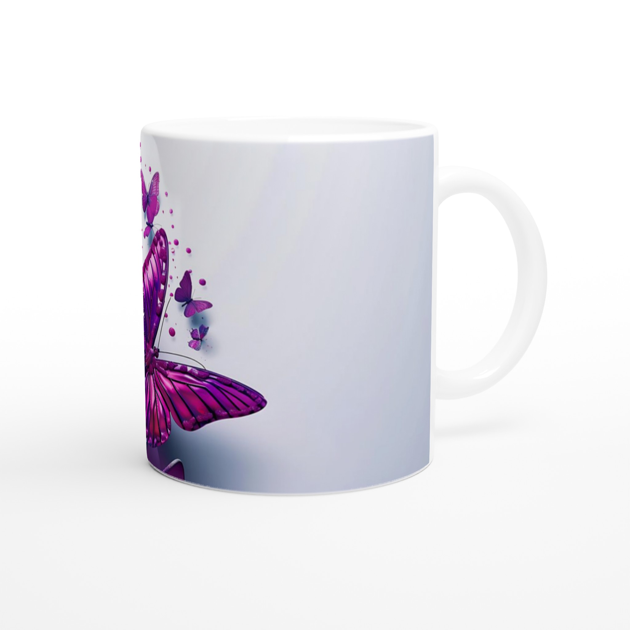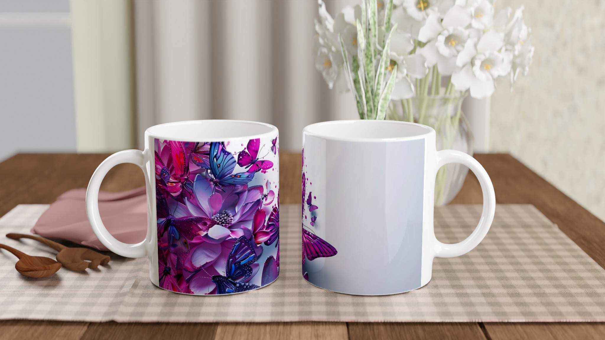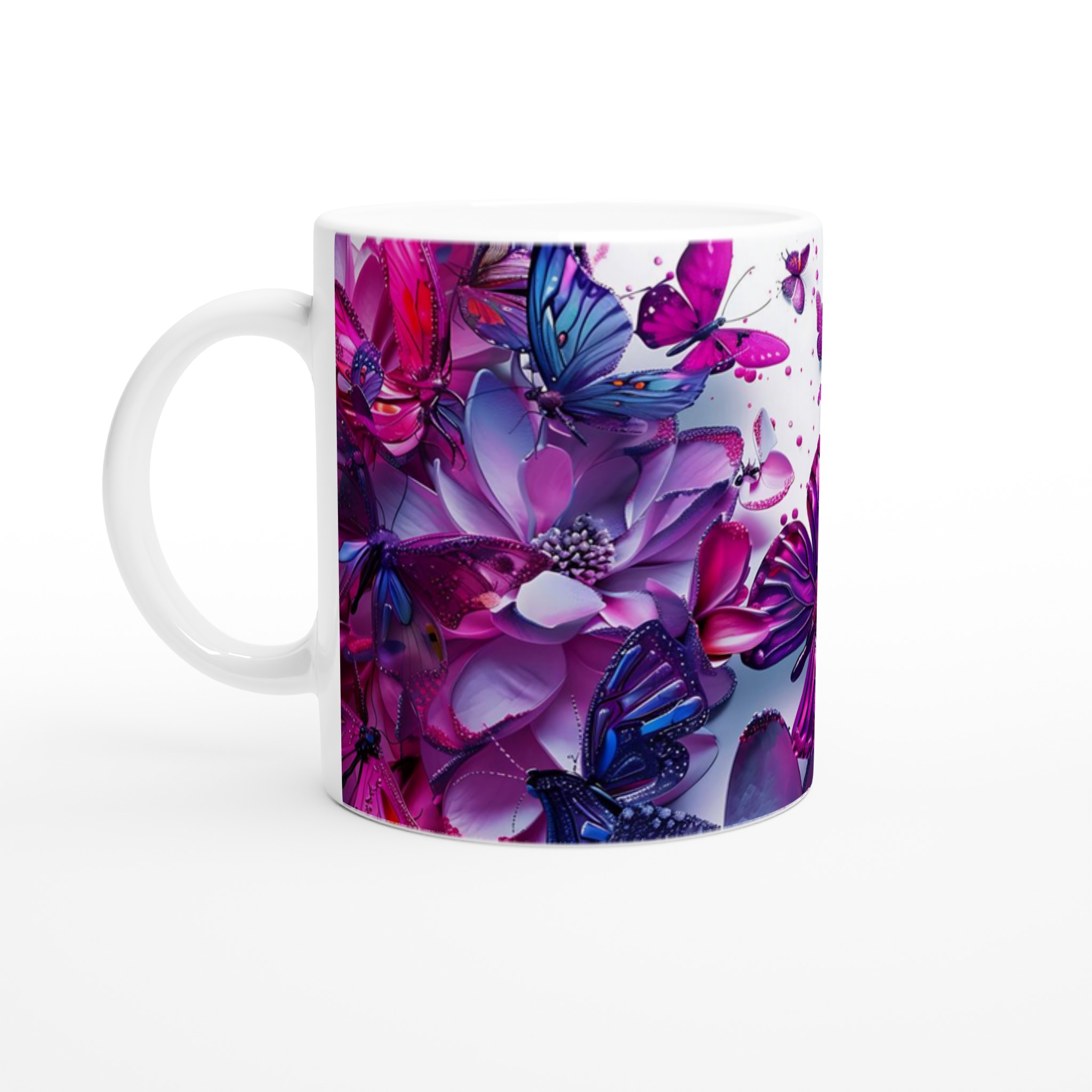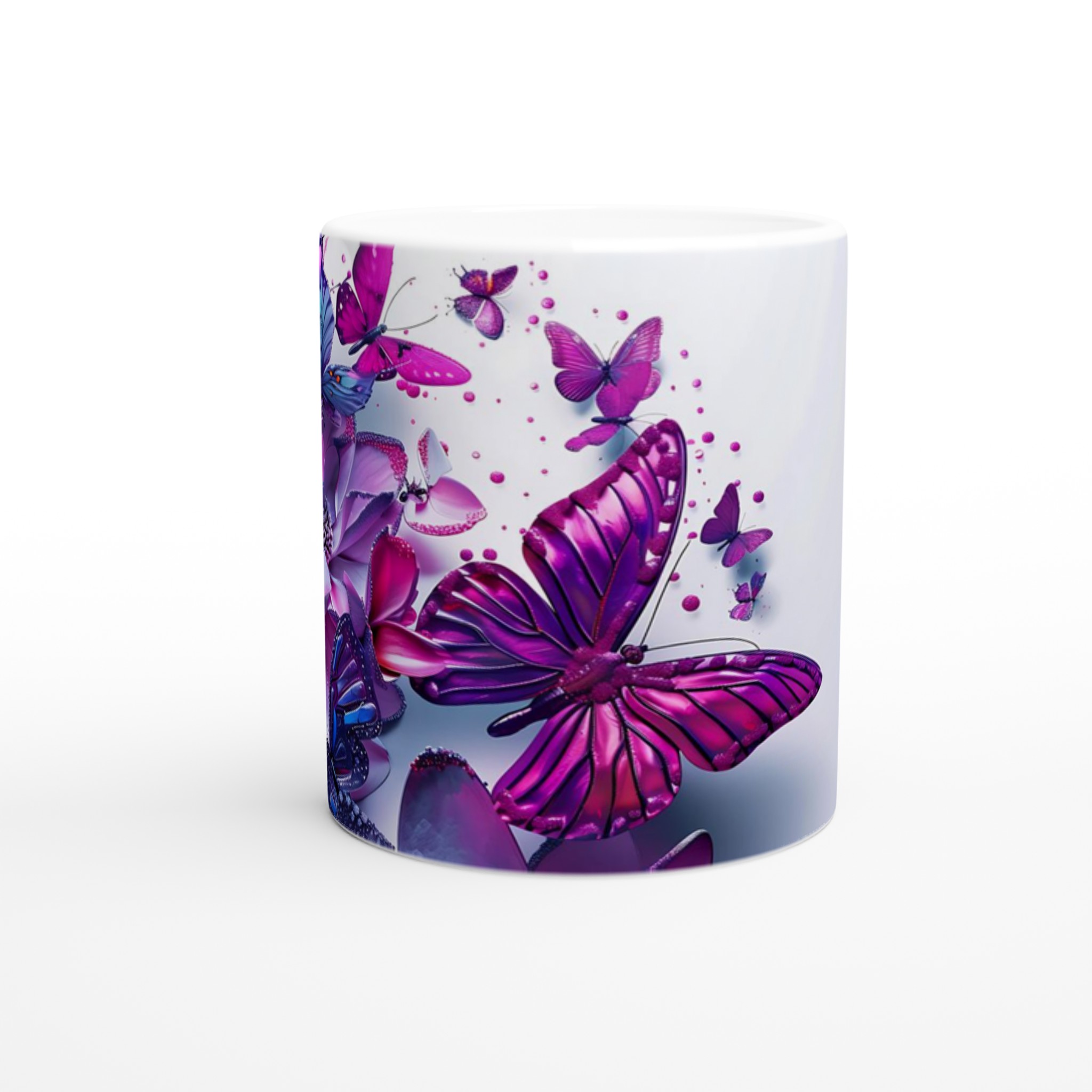 Låt din vardag blomstra med denna magiska keramiska mugg, prydd med en svärm av gnistrande fjärilar i levande nyanser av lila och rosa. Varje klunk blir en flykt till en förtrollad trädgård, perfekt för att liva upp morgonkaffet, kvällens mysiga te, eller när du bara vill addera en touch av lekfull elegans till din stund. Den blanka vita ytan låter designens klara och levande färger verkligen stråla, och oroa dig inte – skönheten består, även efter otaliga turer i mikron och diskmaskinen.