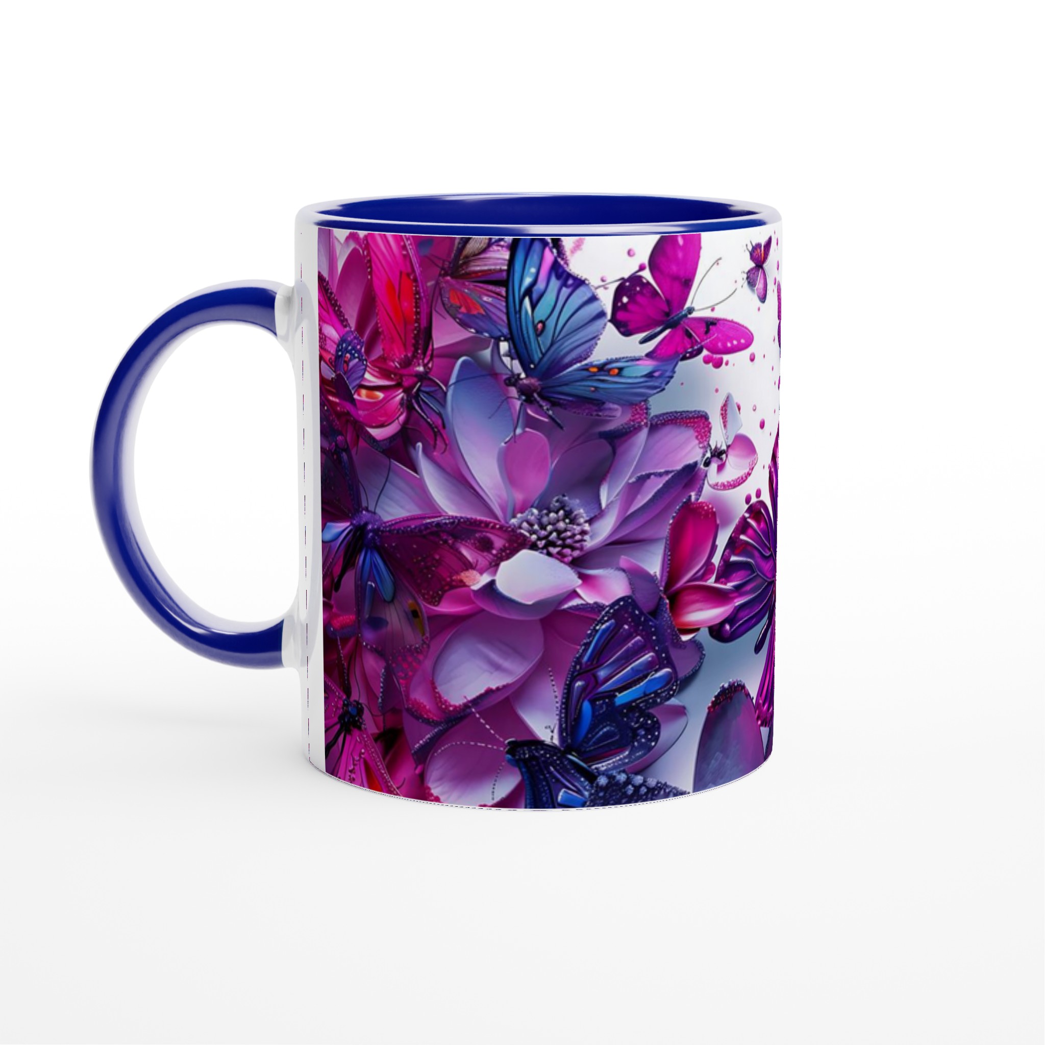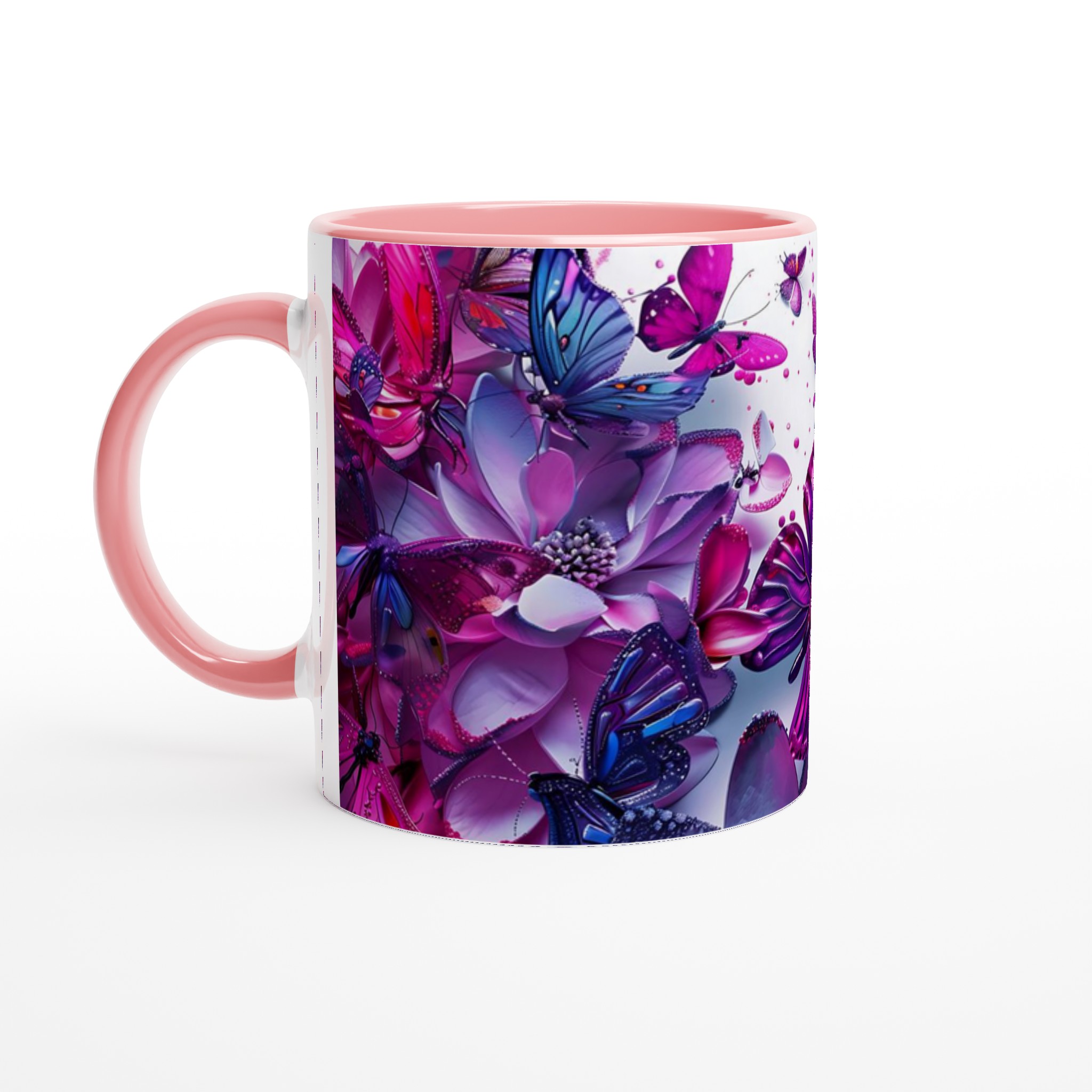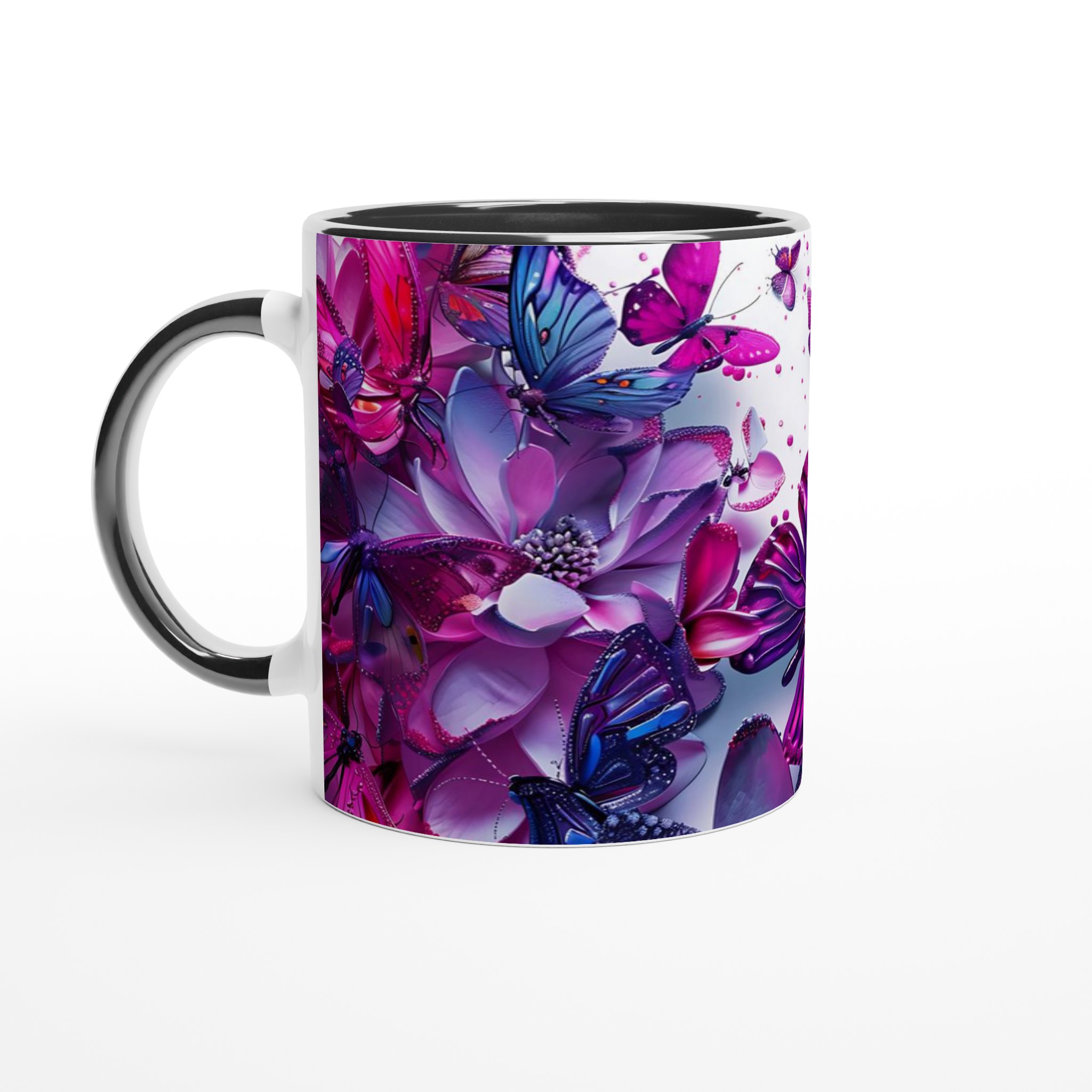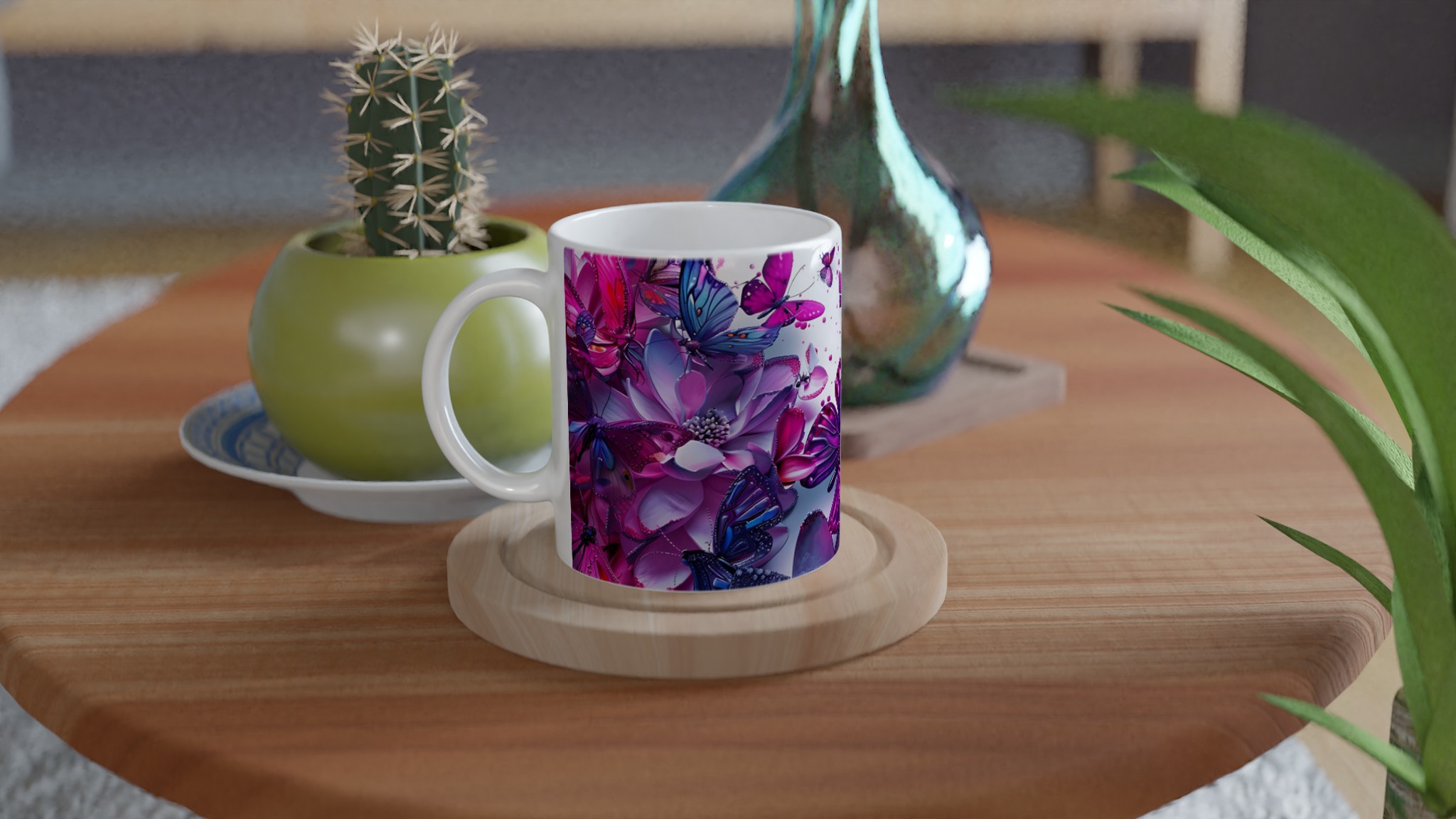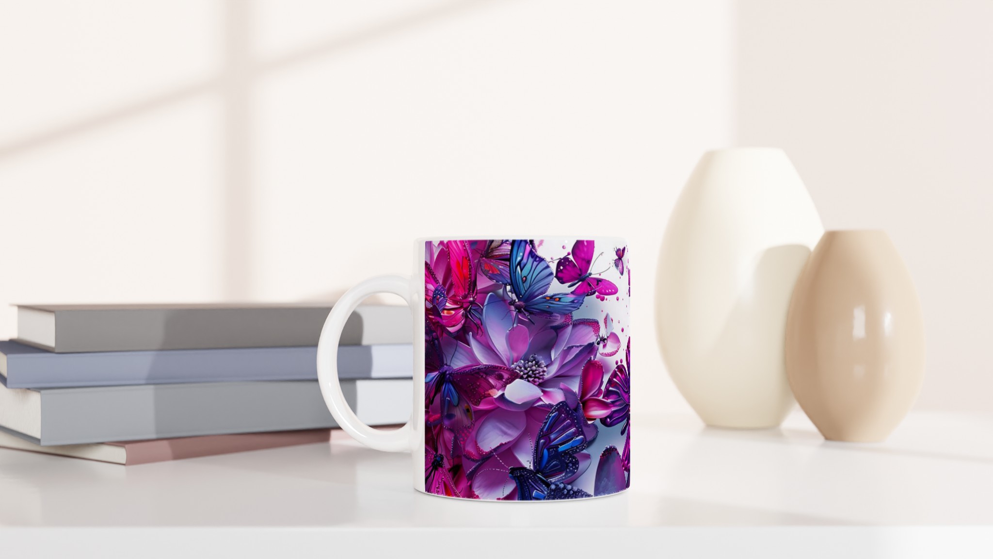 Låt din vardag blomstra med denna magiska keramiska mugg, prydd med en svärm av gnistrande fjärilar i levande nyanser av lila och rosa. Varje klunk blir en flykt till en förtrollad trädgård, perfekt för att liva upp morgonkaffet, kvällens mysiga te, eller när du bara vill addera en touch av lekfull elegans till din stund. Den blanka vita ytan låter designens klara och levande färger verkligen stråla, och oroa dig inte – skönheten består, även efter otaliga turer i mikron och diskmaskinen.
