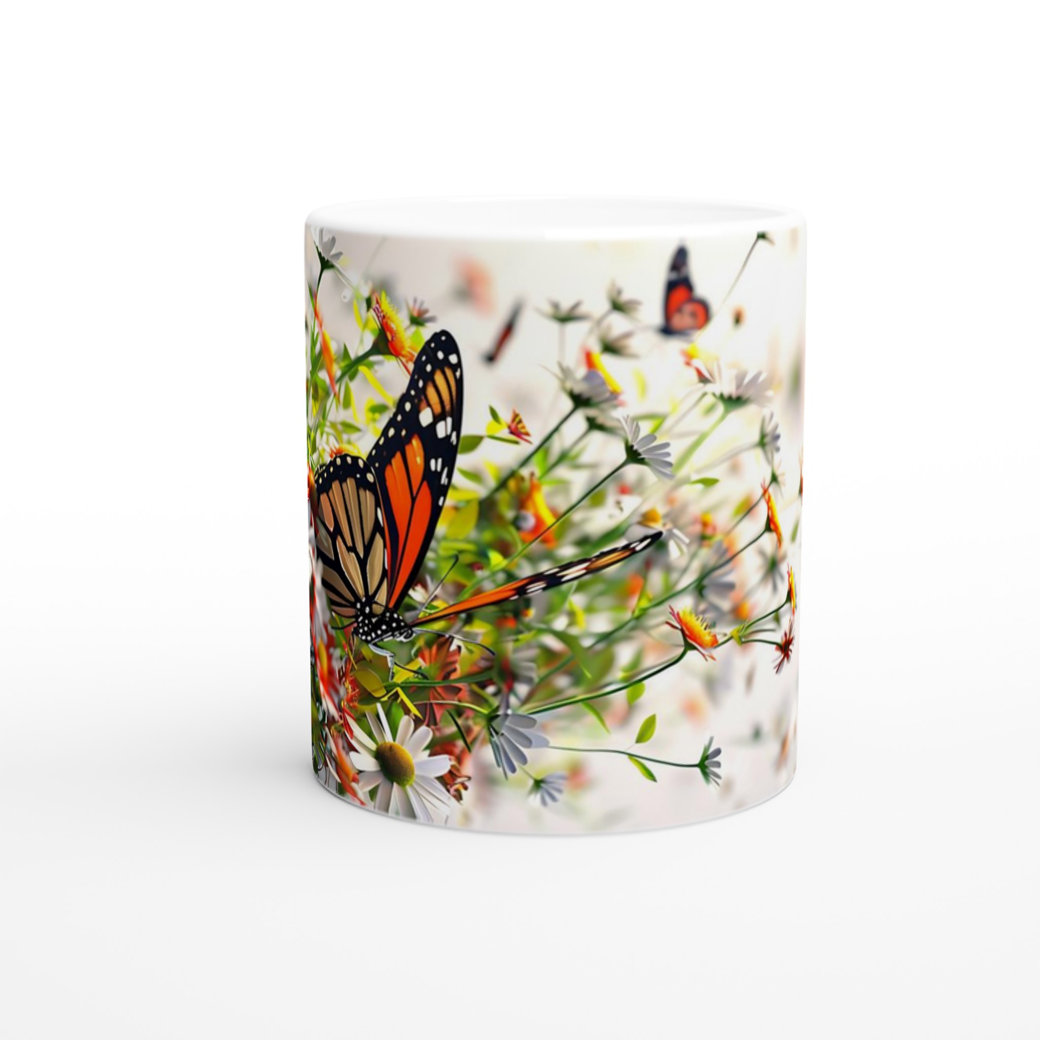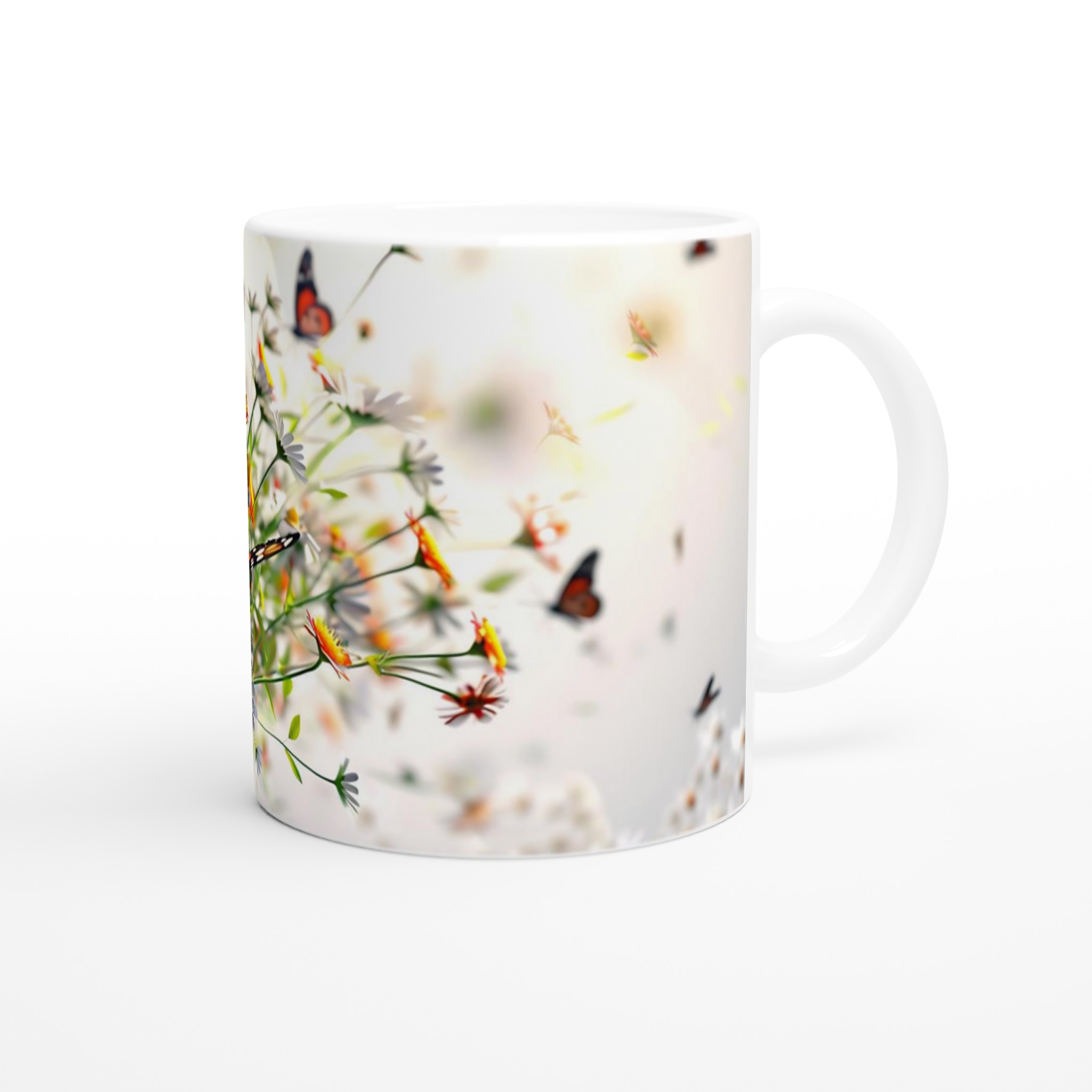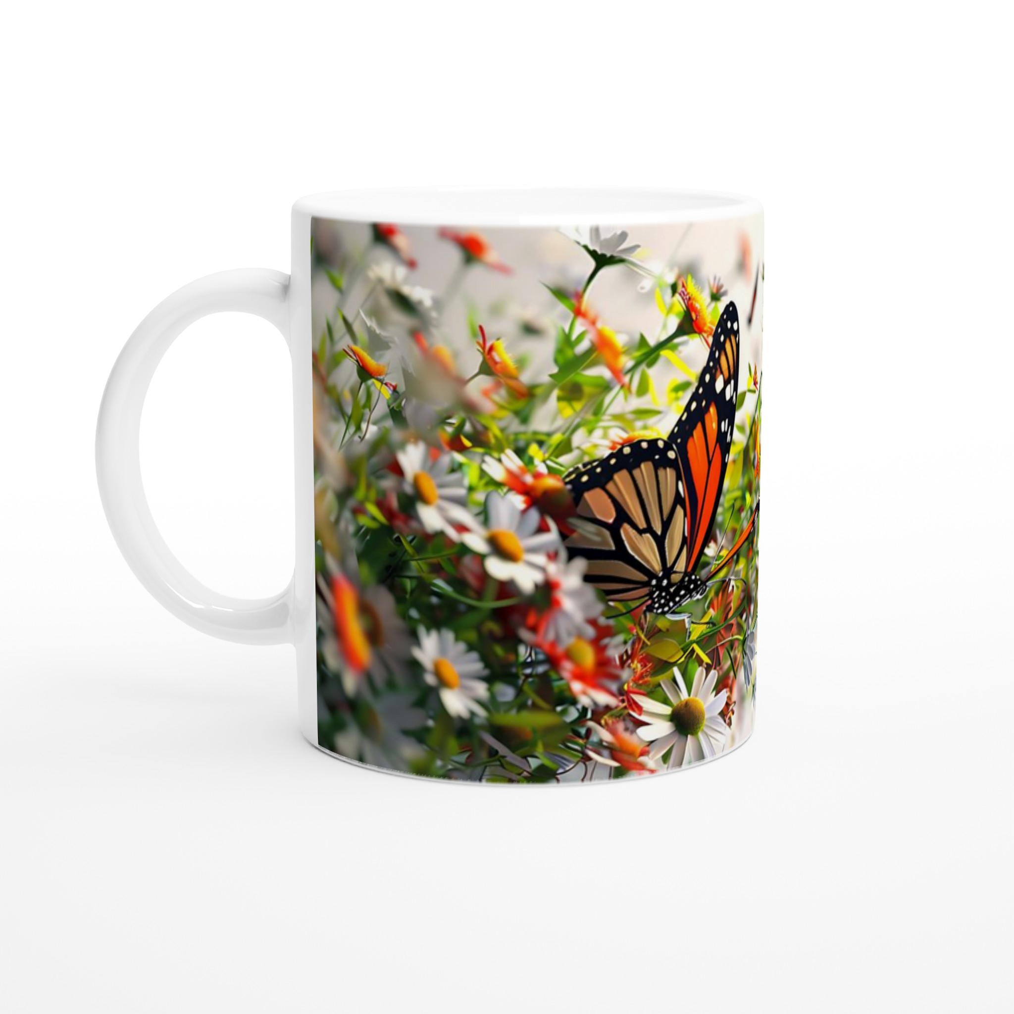 Låt dig svepas bort till en blomstrande äng varje gång du tar en klunk med vår ”Fjärilsdröm” keramiska mugg. Med ett levande motiv av majestätiska fjärilar som dansar bland delikata blommor, förvandlar denna mugg varje fikastund till en liten flykt. Den stilrena keramiska muggen blir snabbt en vardagsfavorit. Perfekt för morgonkaffet, kvällens varma choklad eller när du bara vill njuta av en kopp te. Den blanka ytan gör att trycken framhävs med klara och levande färger, som håller sig fina även efter många turer i mikron och diskmaskinen.