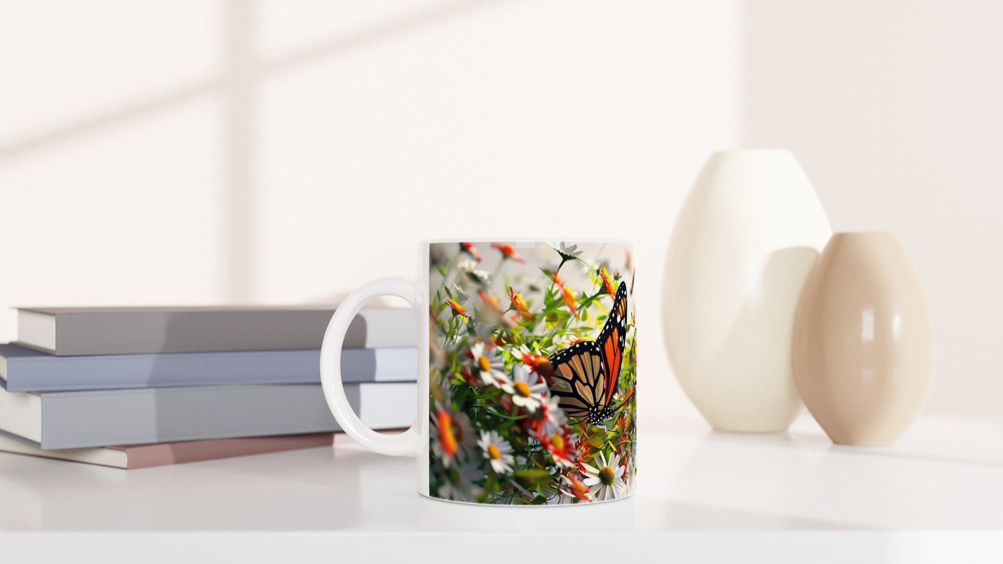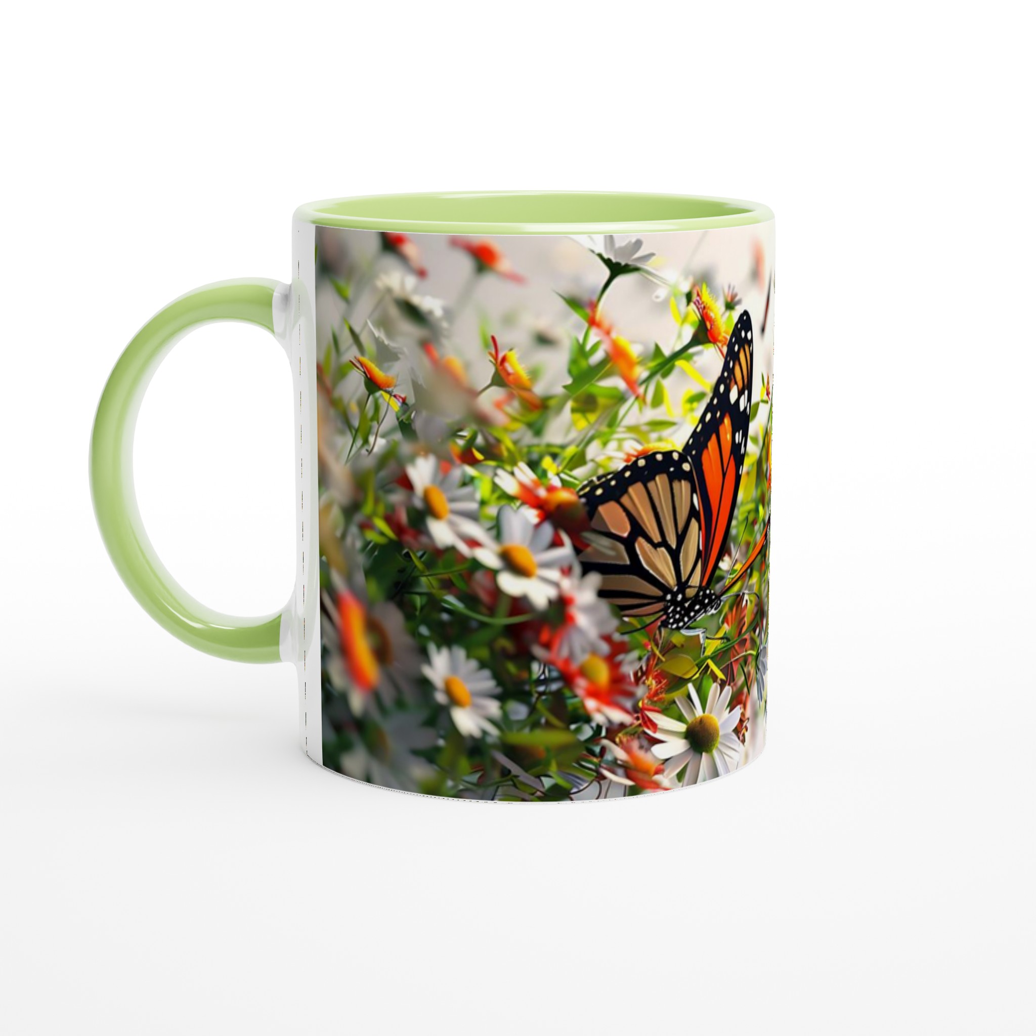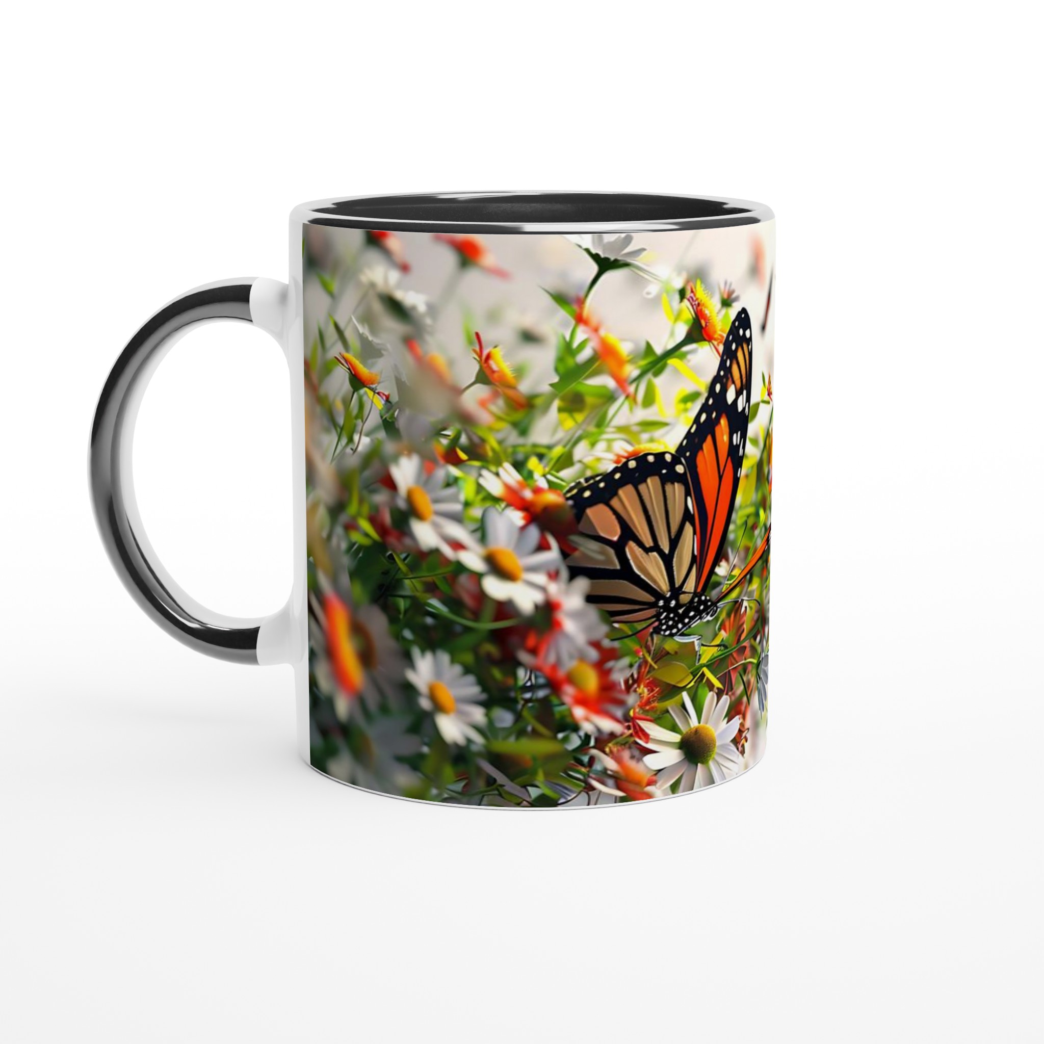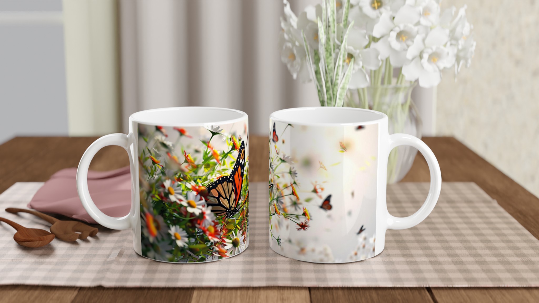 Låt dig svepas bort till en blomstrande äng varje gång du tar en klunk med vår ”Fjärilsdröm” keramiska mugg. Med ett levande motiv av majestätiska fjärilar som dansar bland delikata blommor, förvandlar denna mugg varje fikastund till en liten flykt. Den stilrena keramiska muggen blir snabbt en vardagsfavorit. Perfekt för morgonkaffet, kvällens varma choklad eller när du bara vill njuta av en kopp te. Den blanka ytan gör att trycken framhävs med klara och levande färger, som håller sig fina även efter många turer i mikron och diskmaskinen.