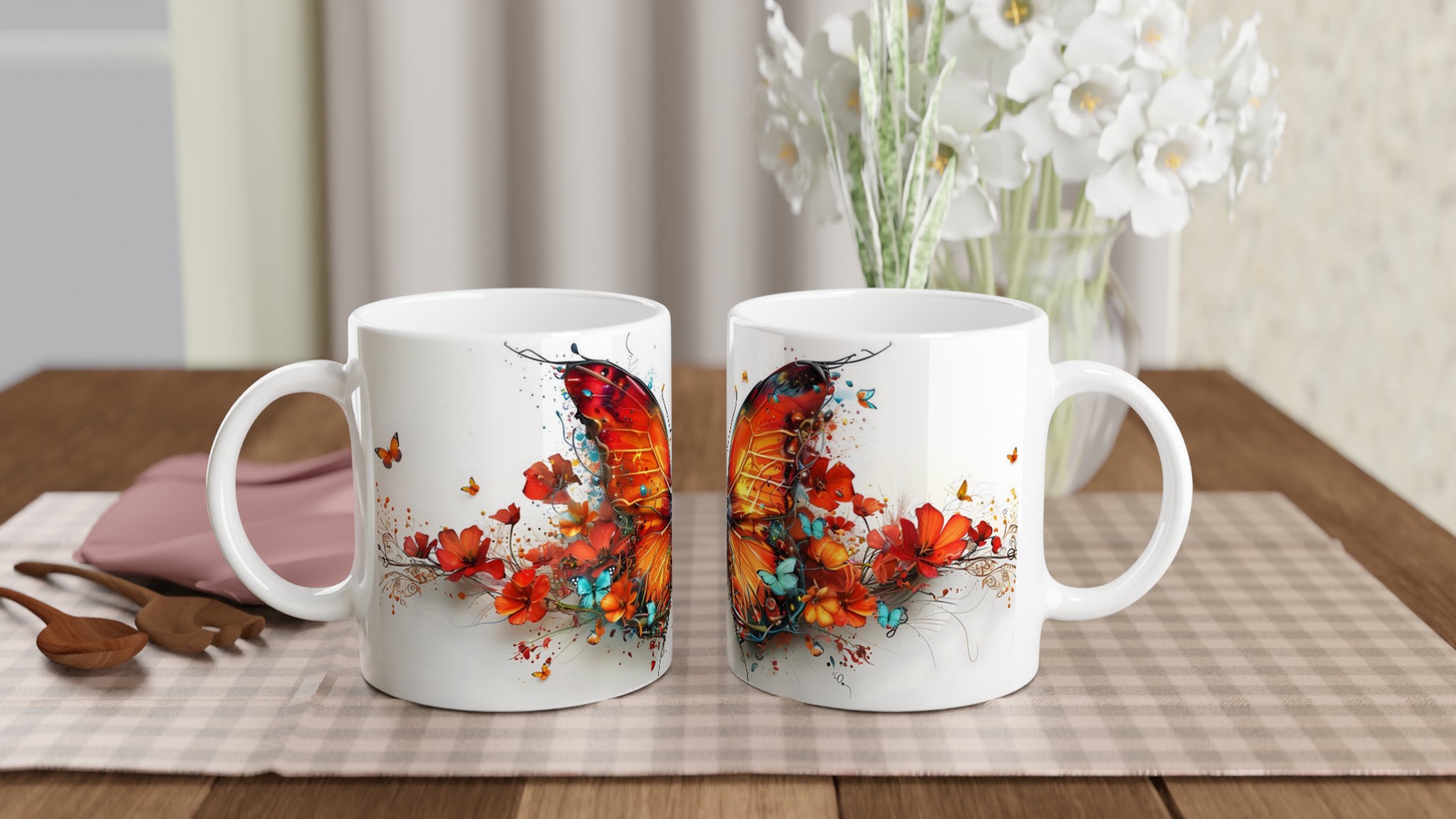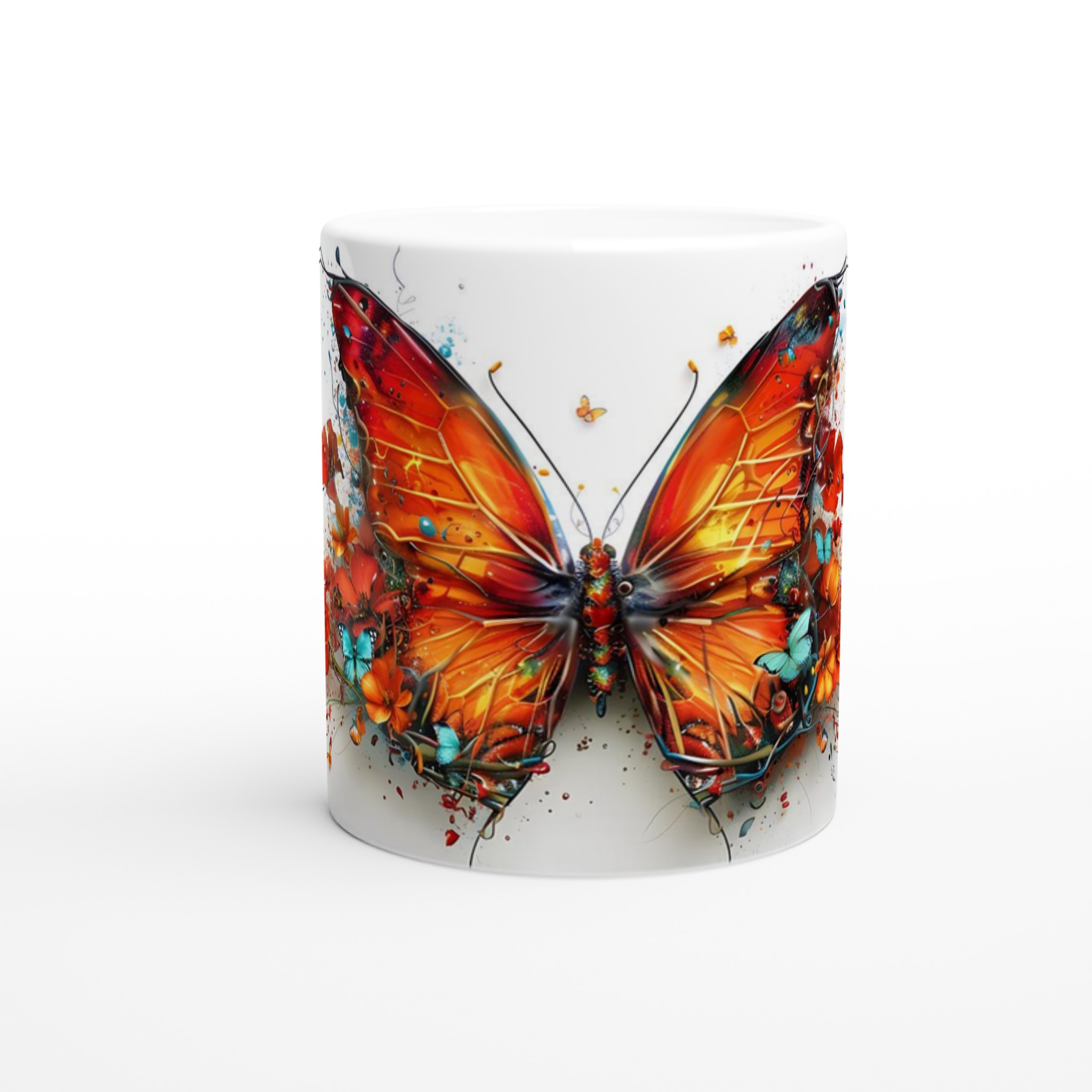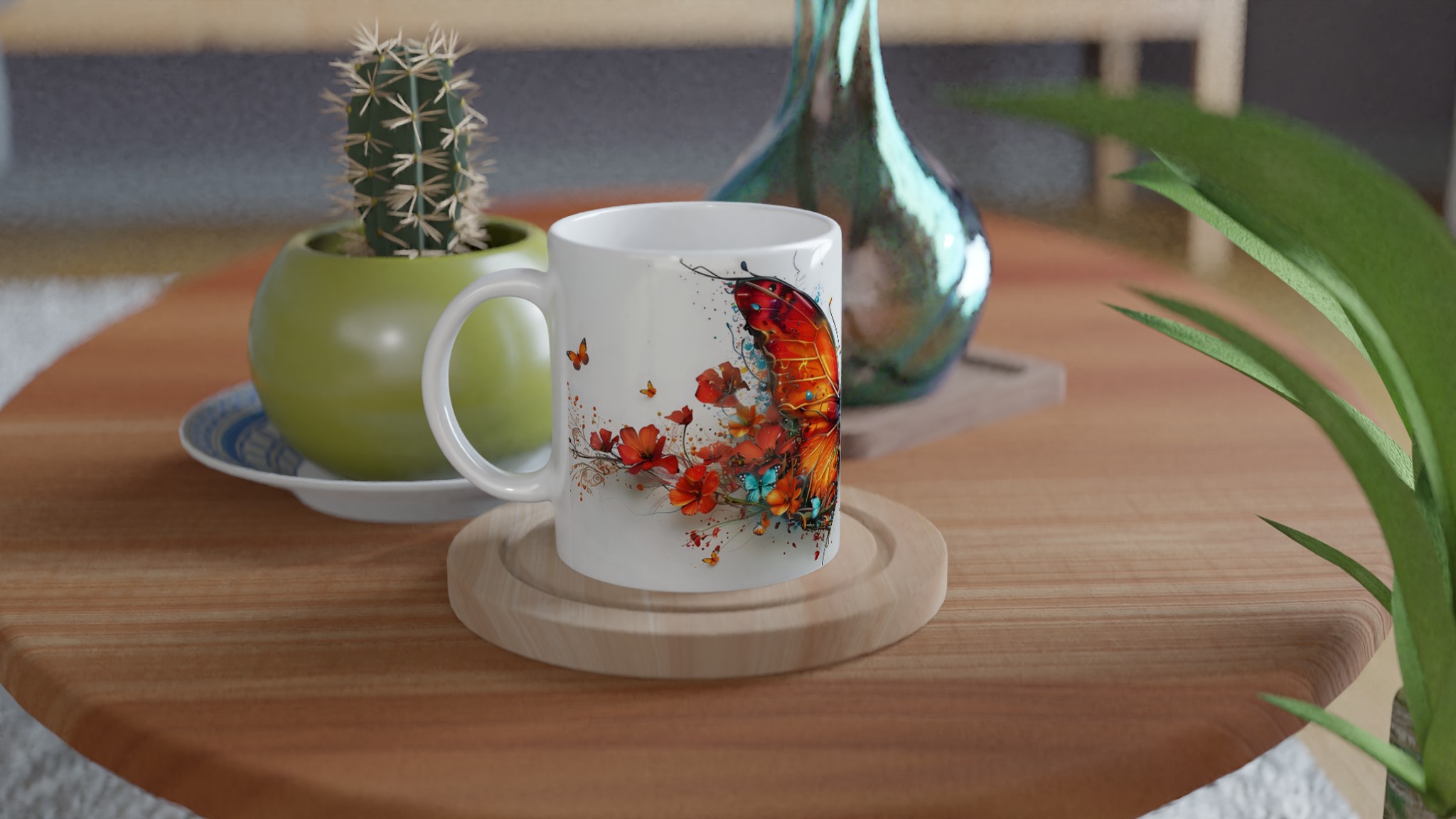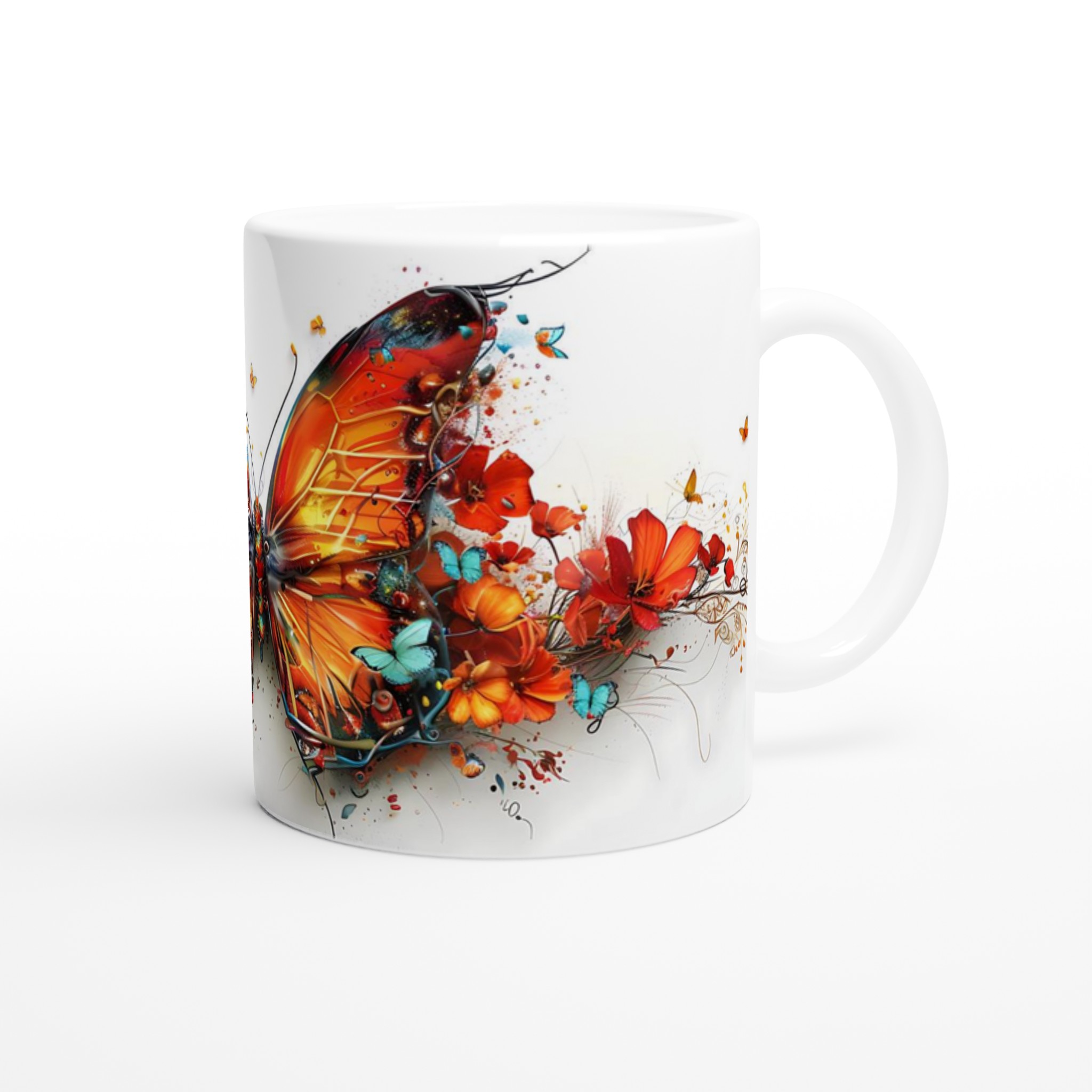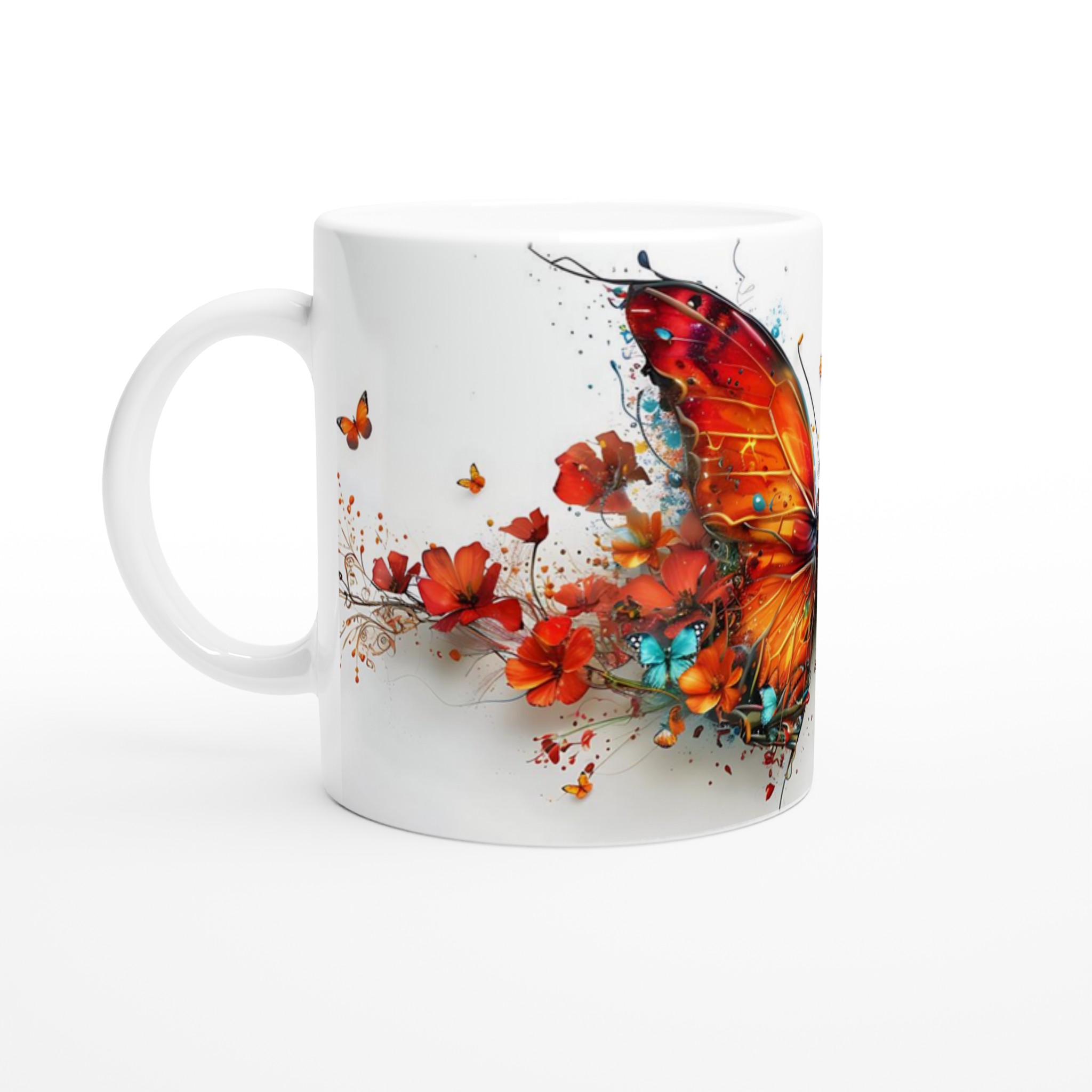 Låt din vardag blomstra med vår unika keramiska mugg, prydd med en levande och konstnärlig fjärilsdesign. Denna mugg är inte bara en behållare för din dryck; den är en hyllning till naturens skönhet och konstens frihet, perfekt för att förgylla varje morgon, eftermiddagsfika eller avkopplande kvällsstund. De rika, akvarellinspirerade färgerna med den majestätiska fjärilen och dess blomsterprakt framhävs briljant på den blanka ytan och behåller sin lyster genom otaliga användningar och tvättar.
